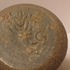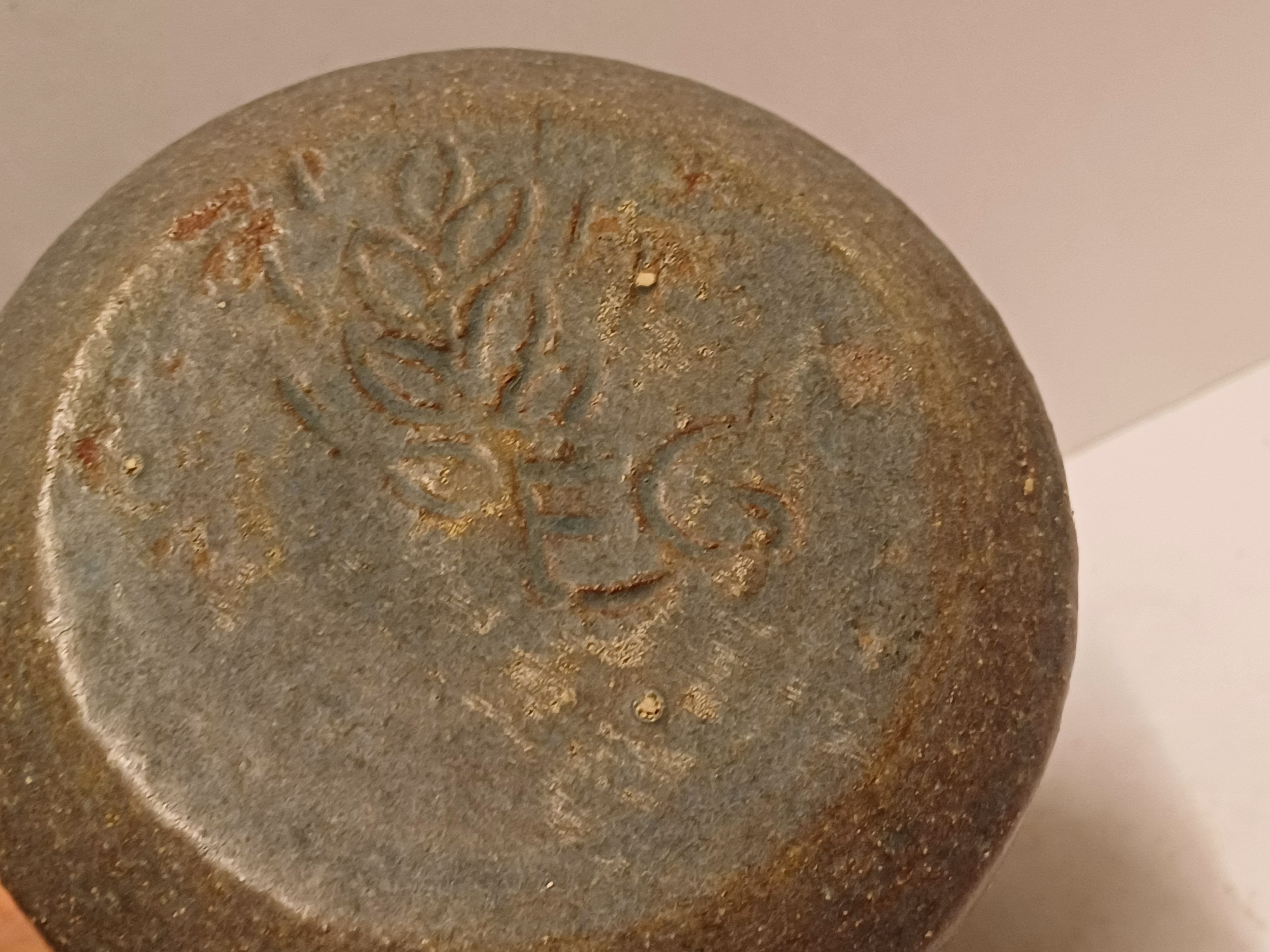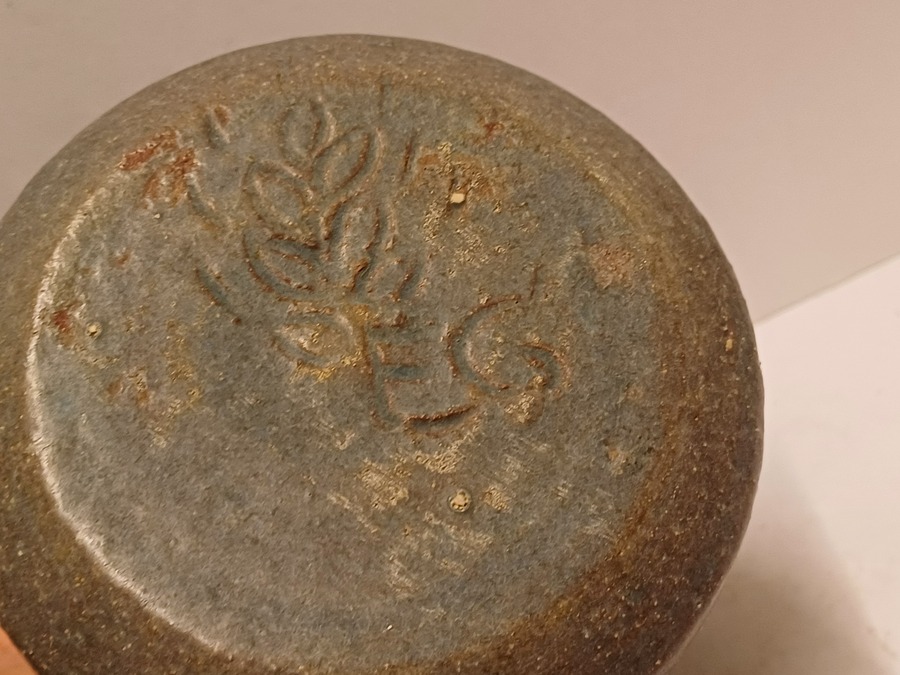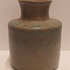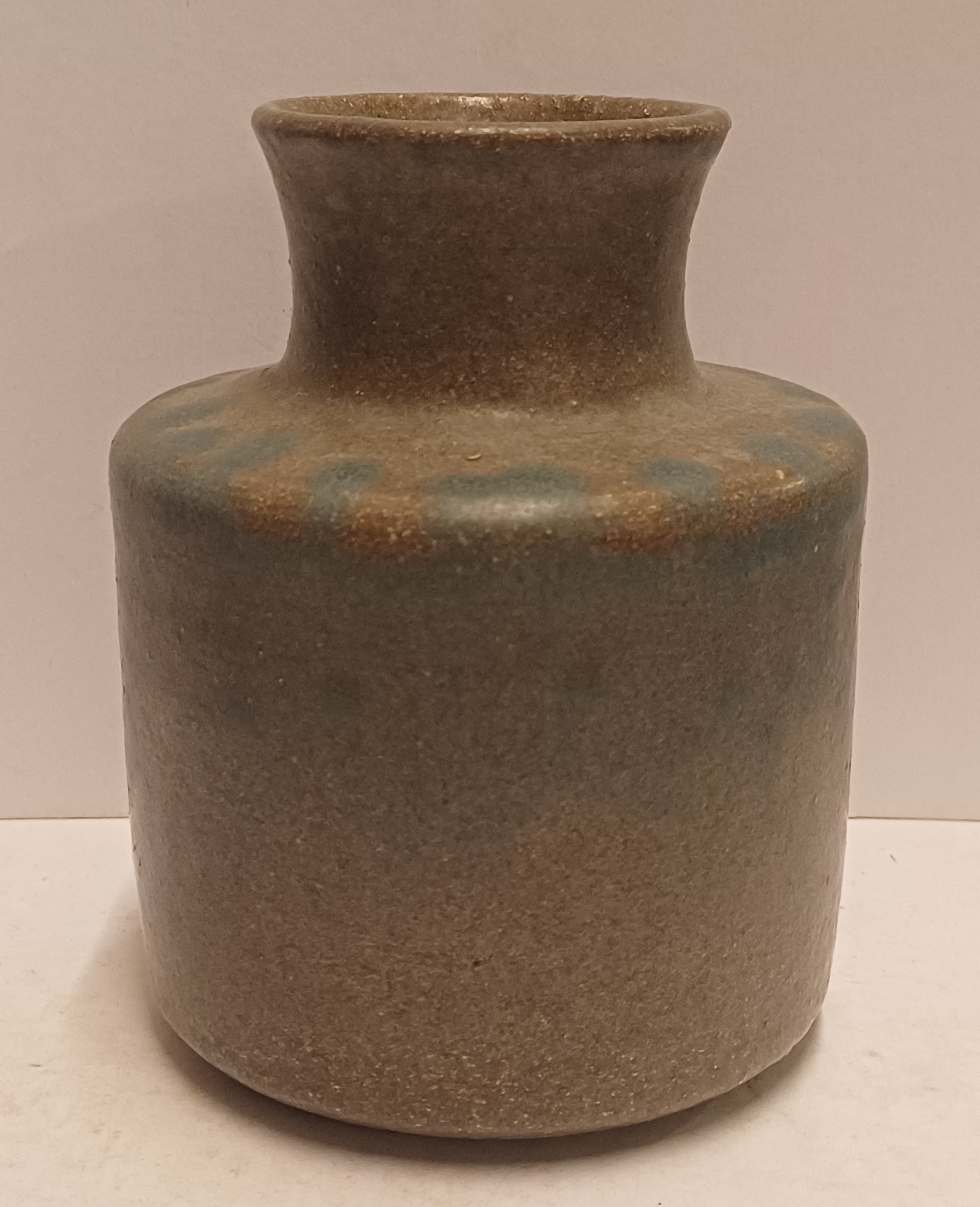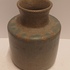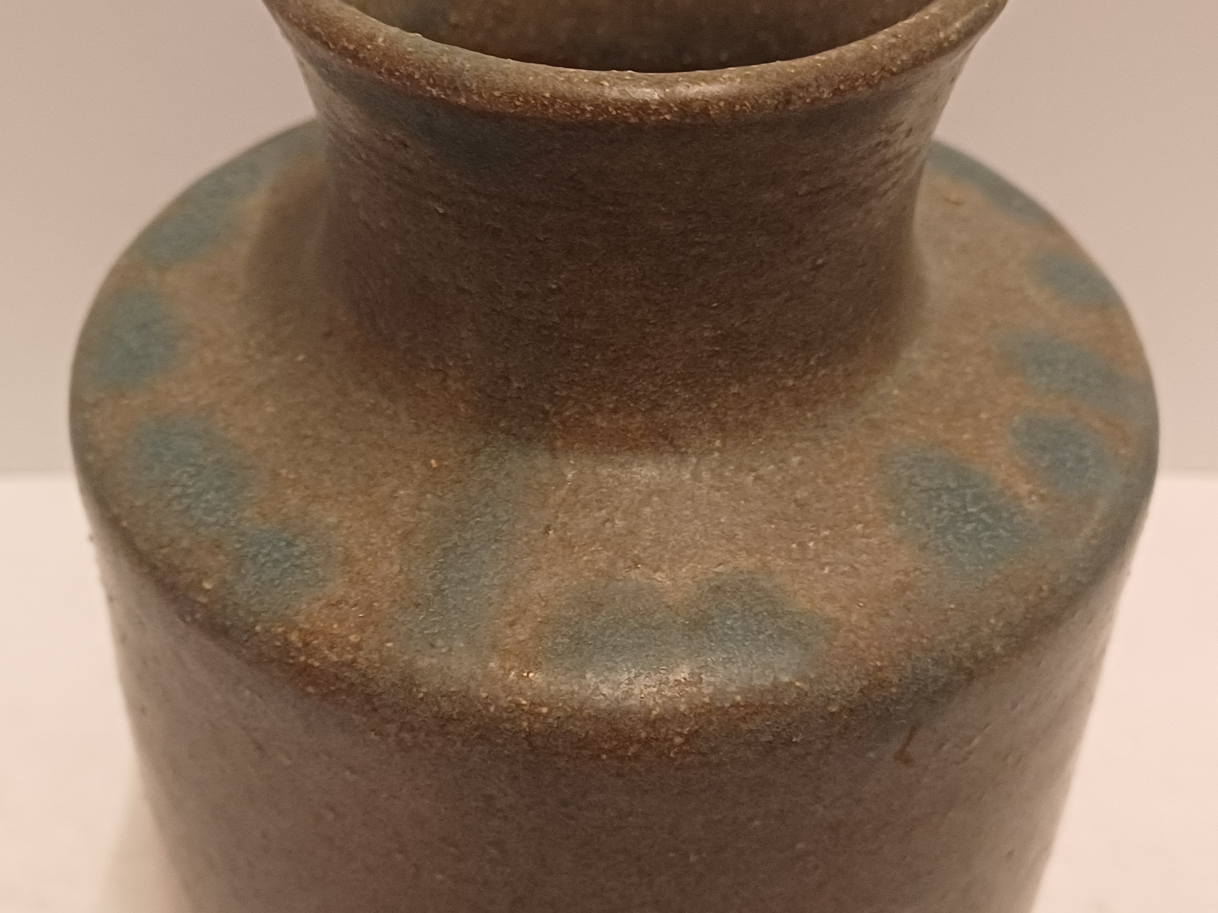 Handgedraaide aardewerken vaas met grijzs groene glazuur en op de schouders blauwe vlekjes. Onderzijde met signatuur