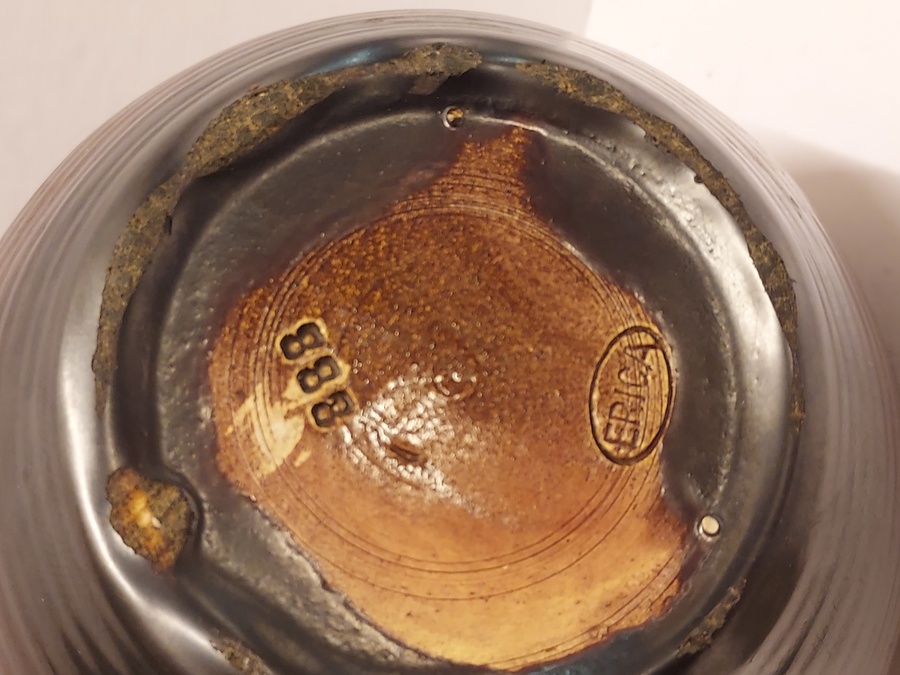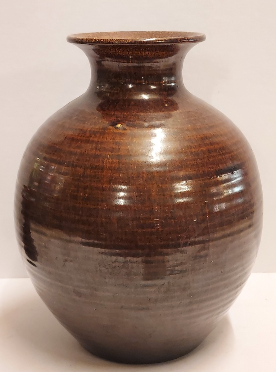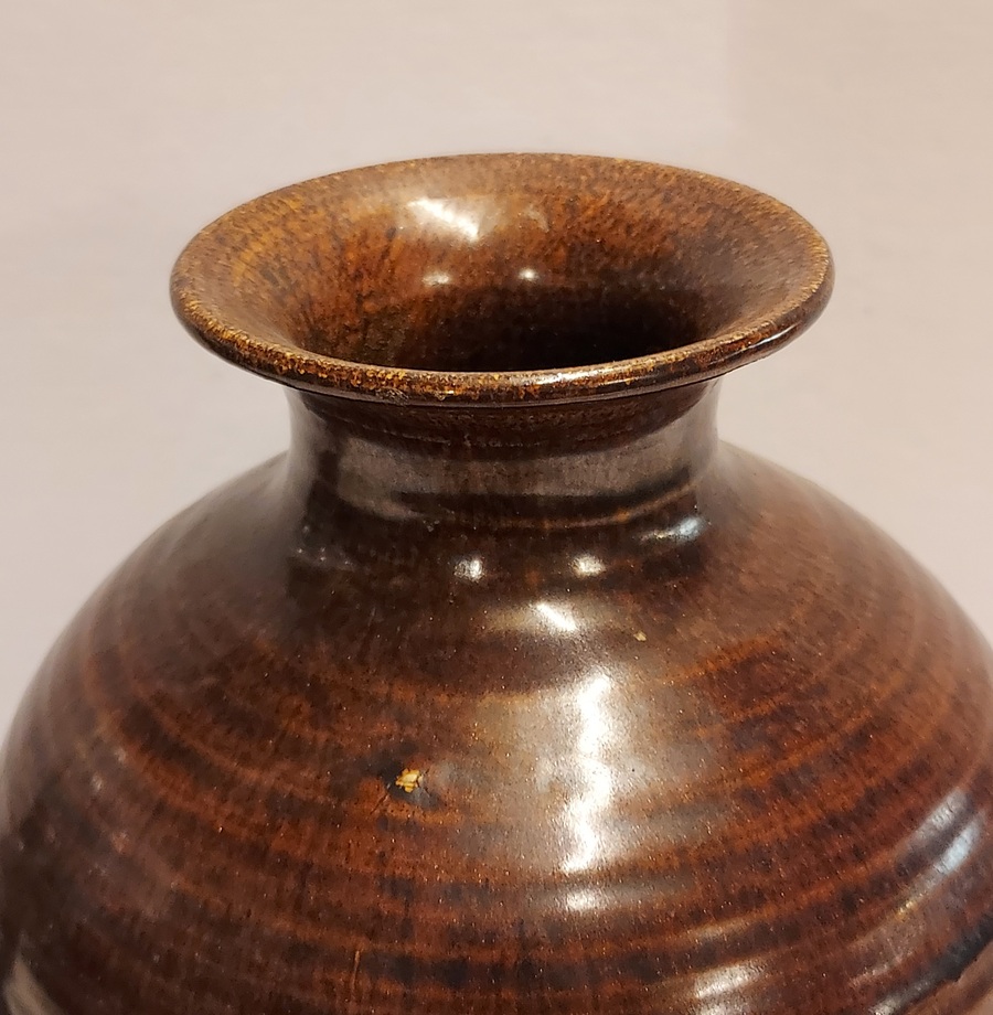 Vase en terre cuite avec glaçure brun métallique. Dessous avec marque de fabrique et numéro de modèle 888.