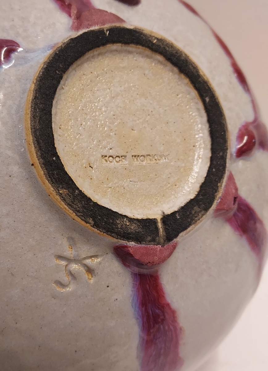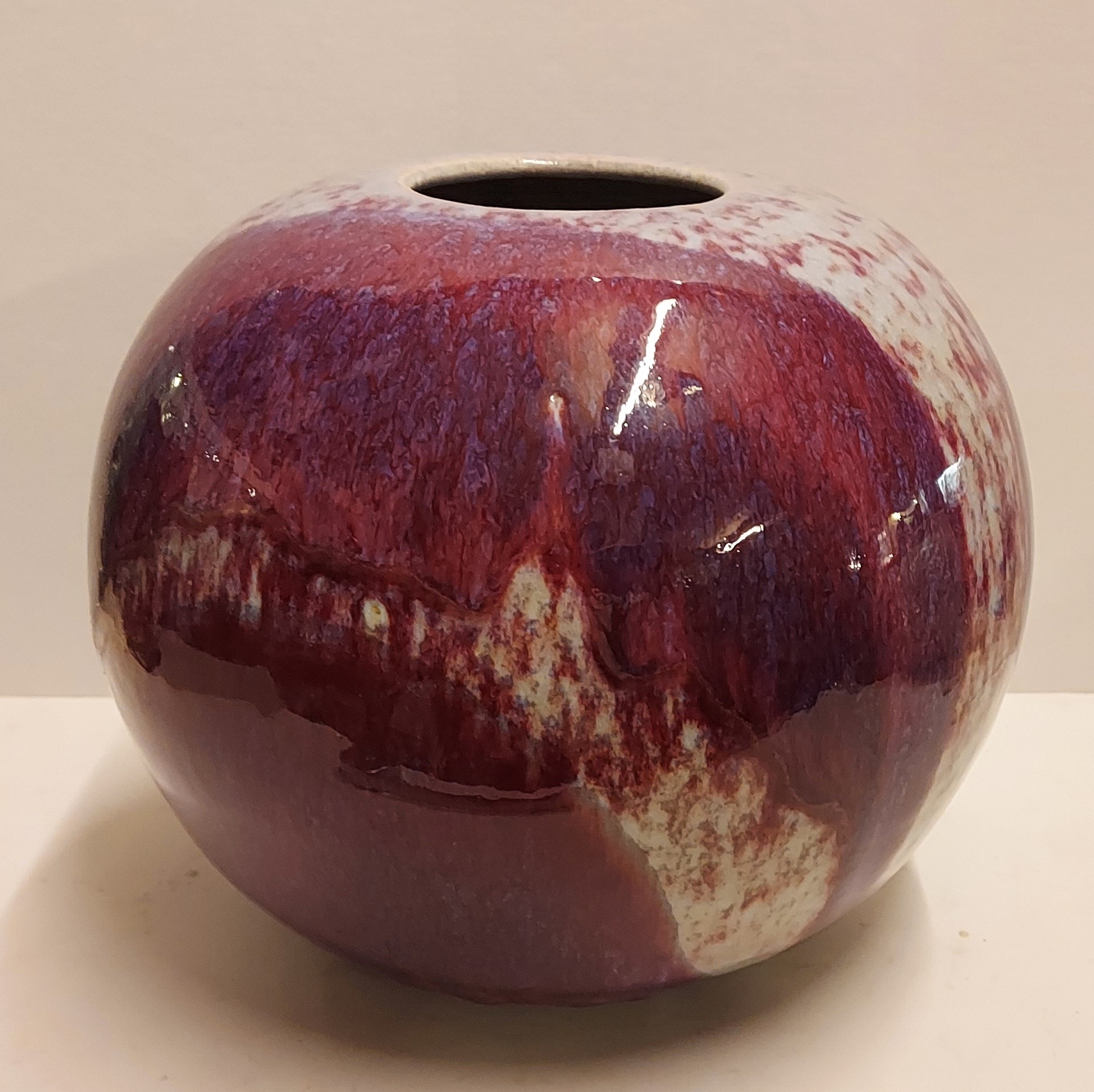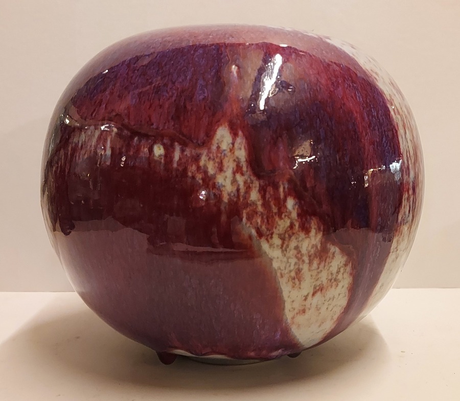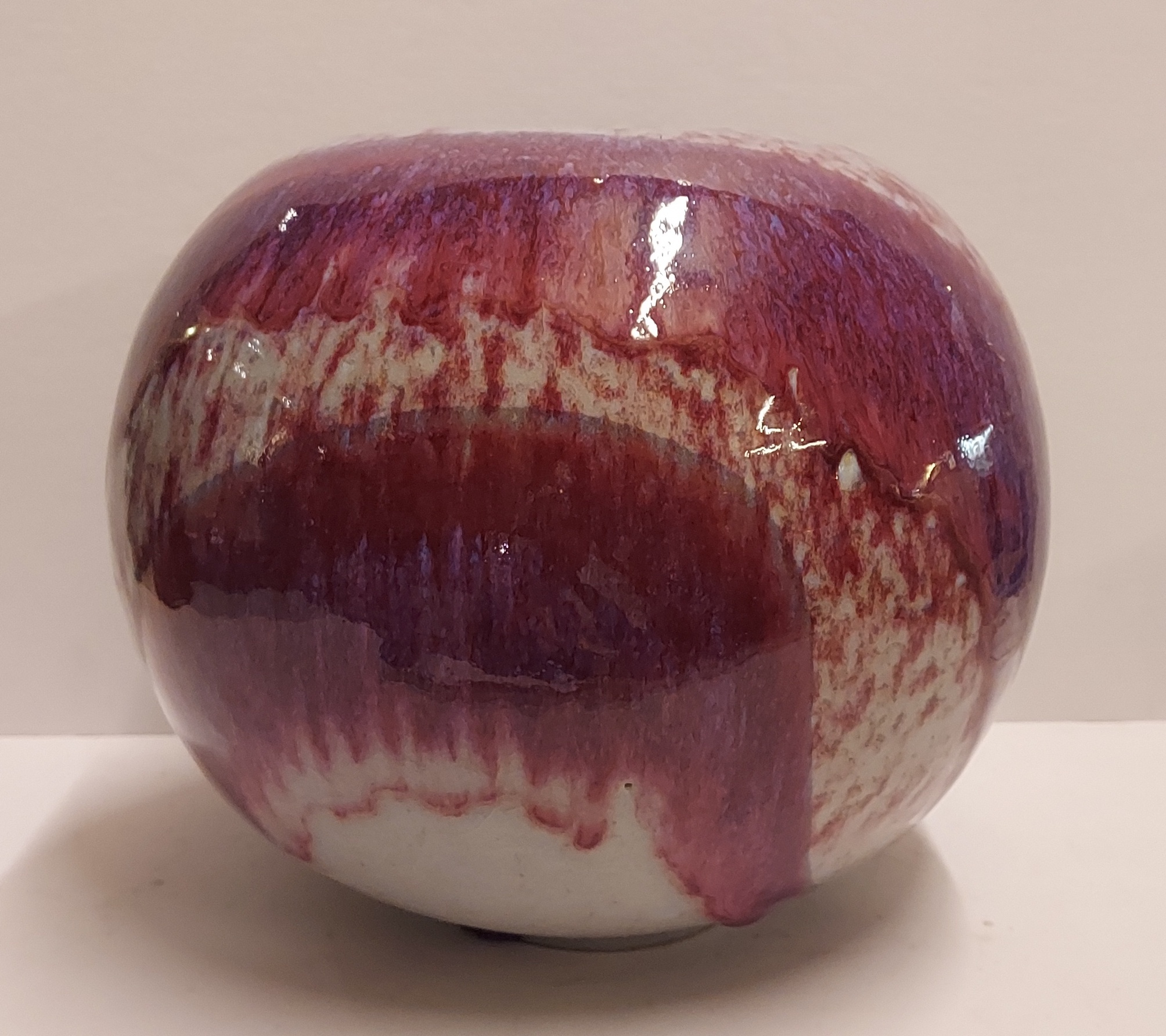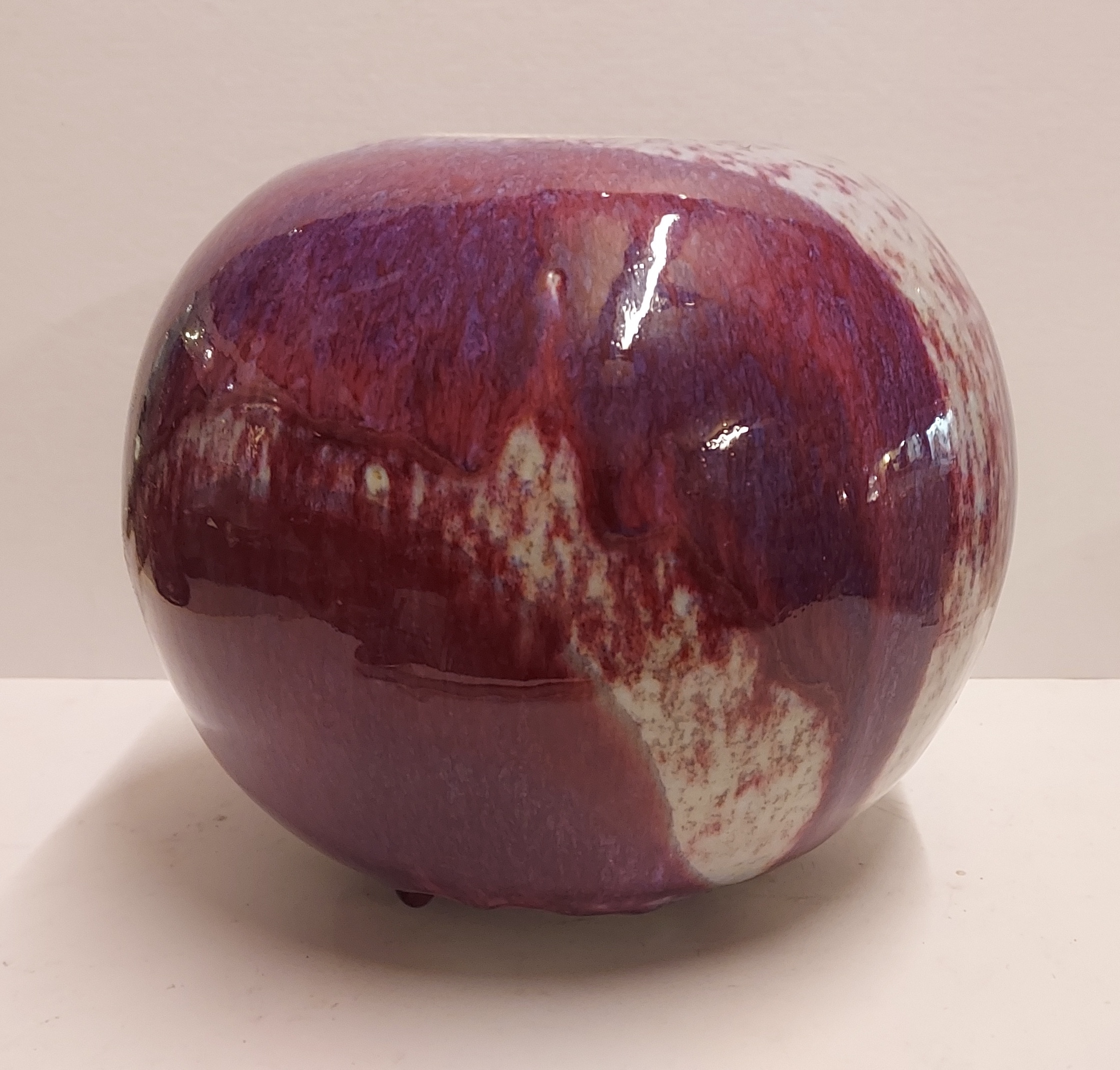 Vase bombé avec un glaçure coulante violette. Base avec marque estampillée.