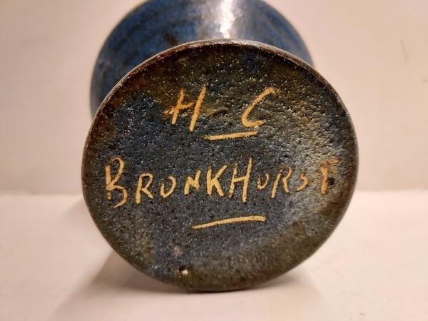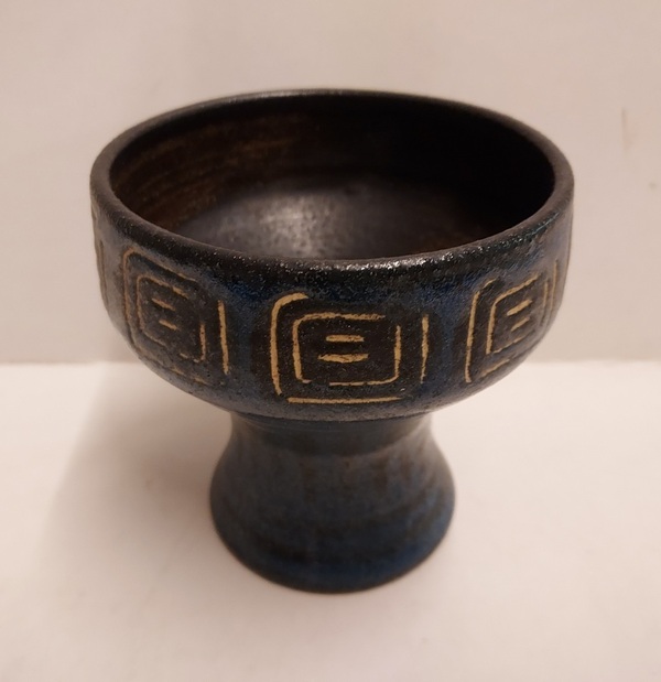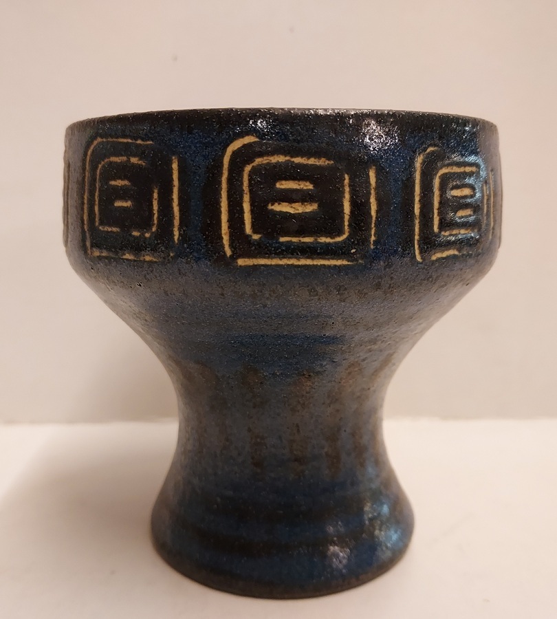 Vase en forme de coupe bleue avec décoration abstraite. Signé sur le dessous.