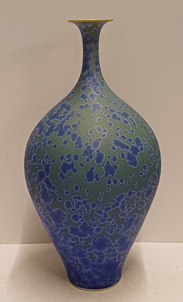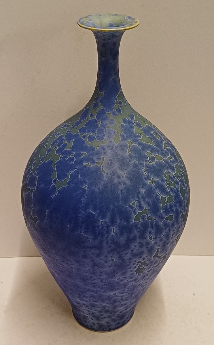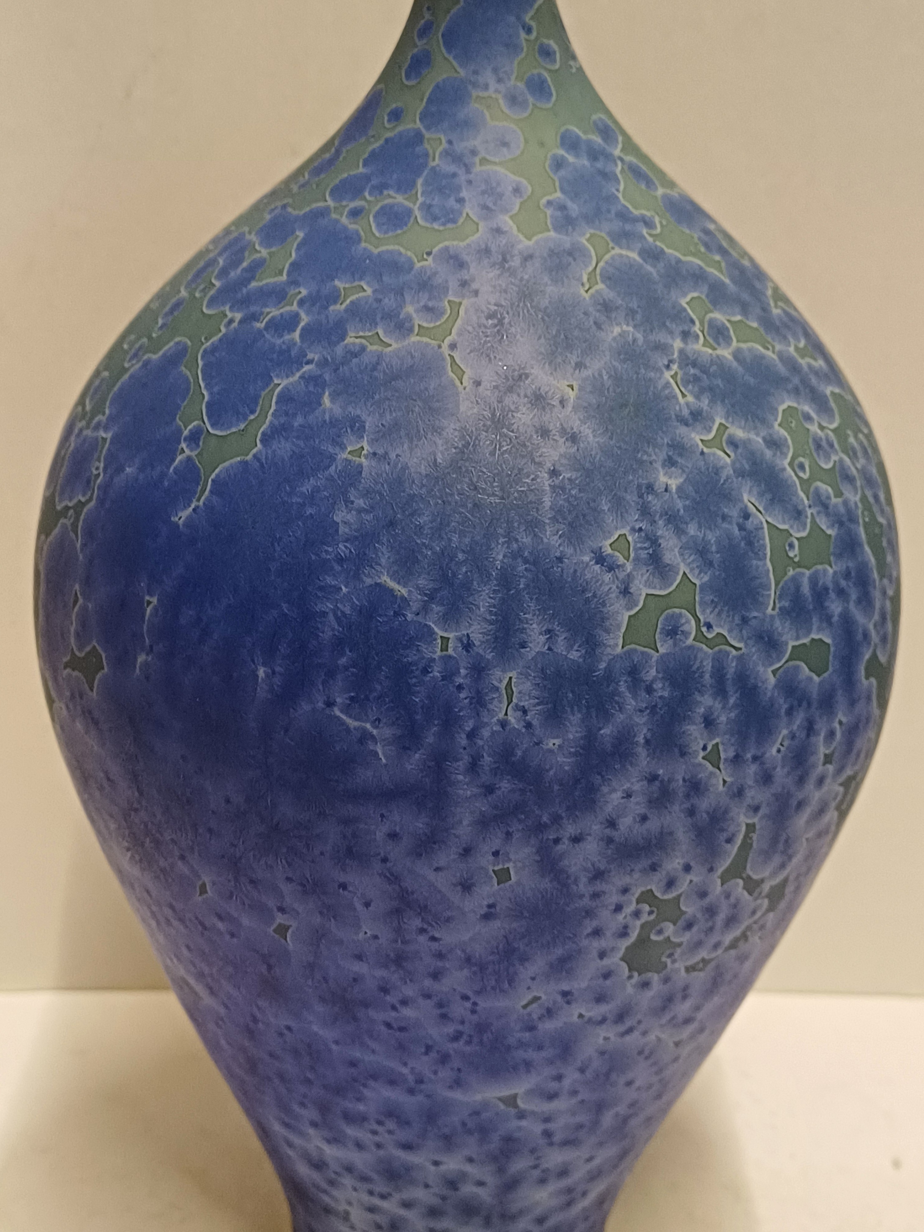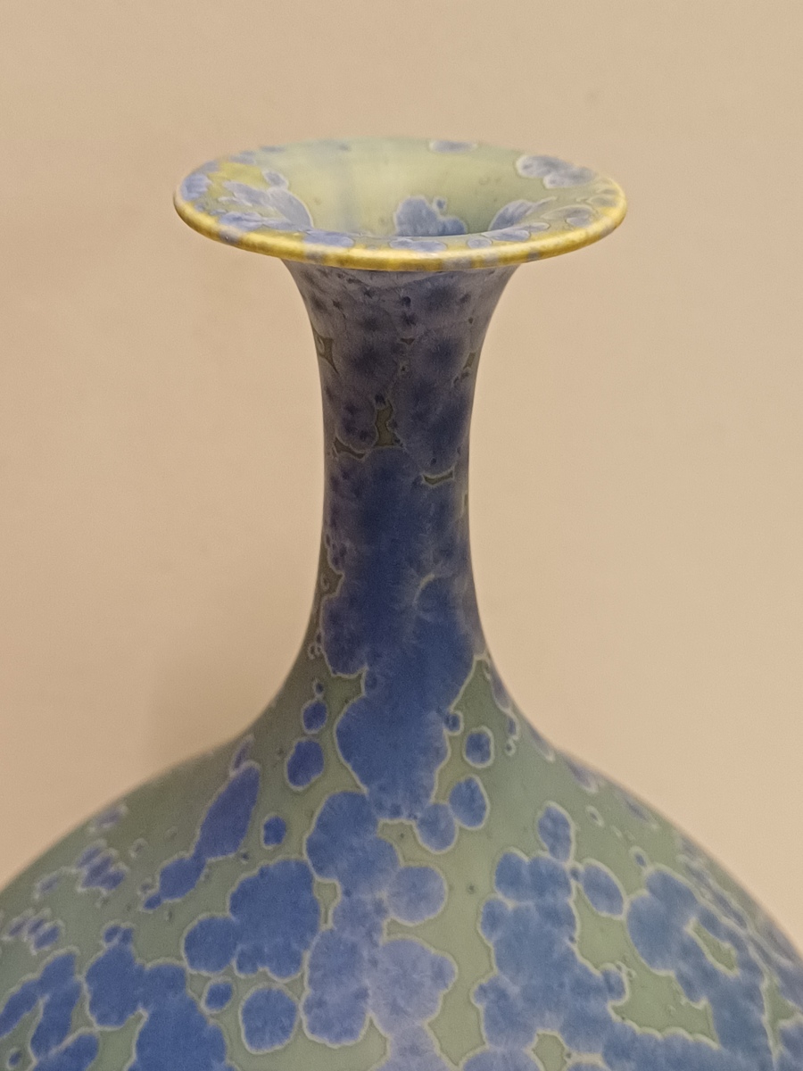 Forse porseleinen vaas met matte kristalglazuur in blauw tinten. Onderzijde gesigneerd