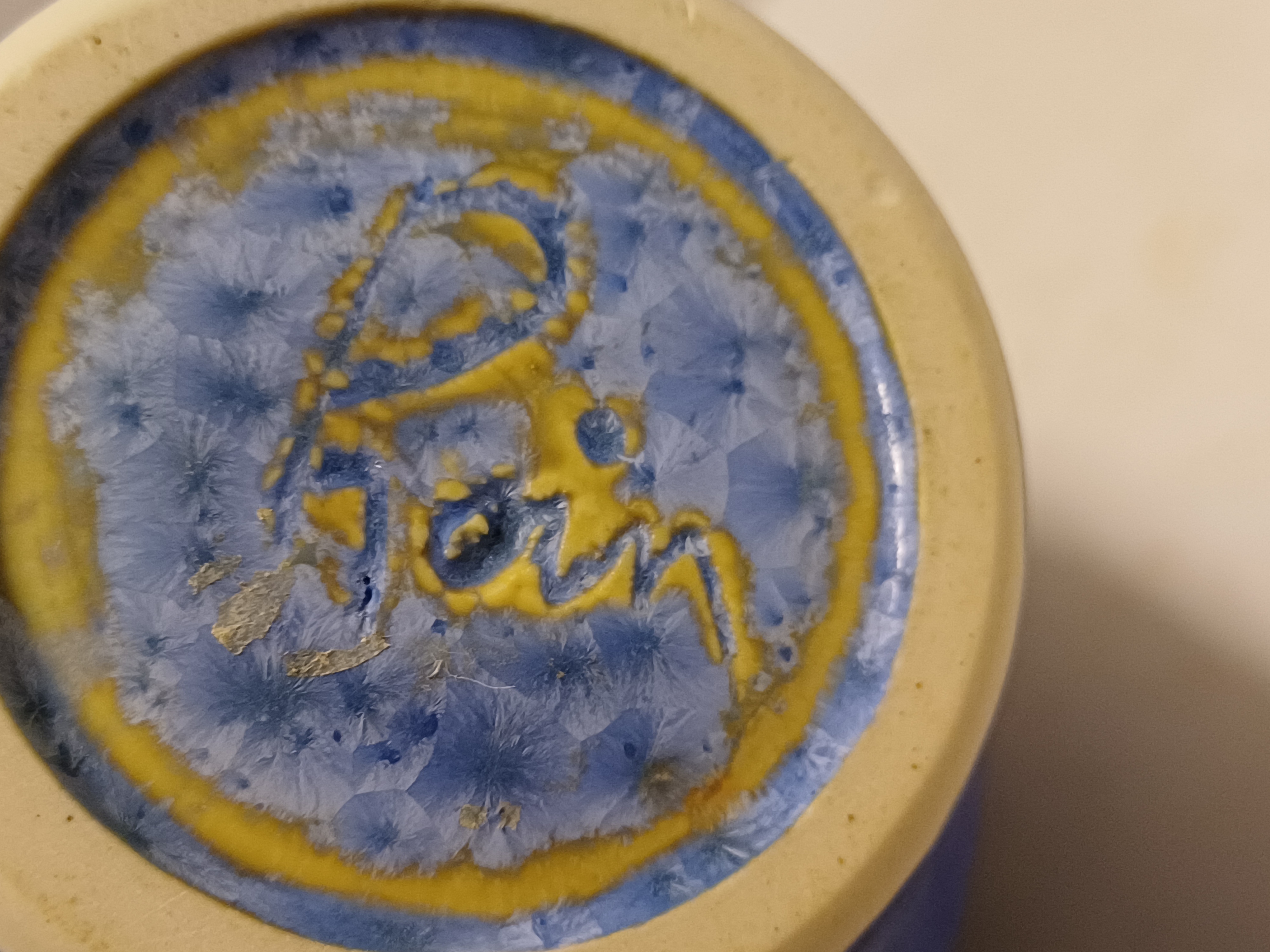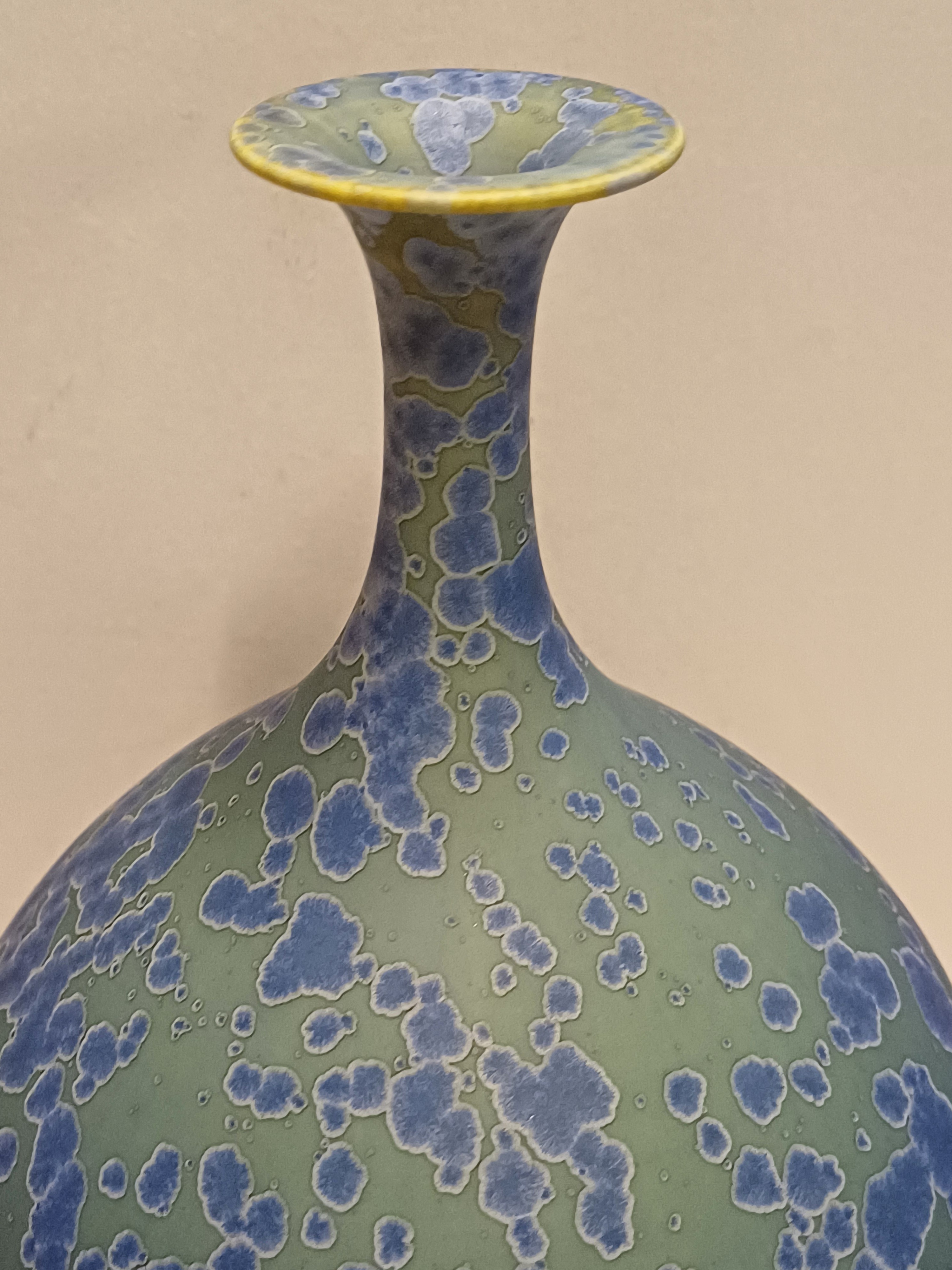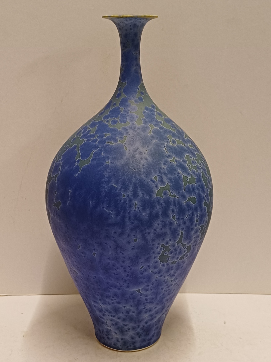Forse porseleinen vaas met matte kristalglazuur in blauw tinten. Onderzijde gesigneerd
