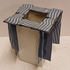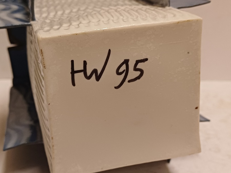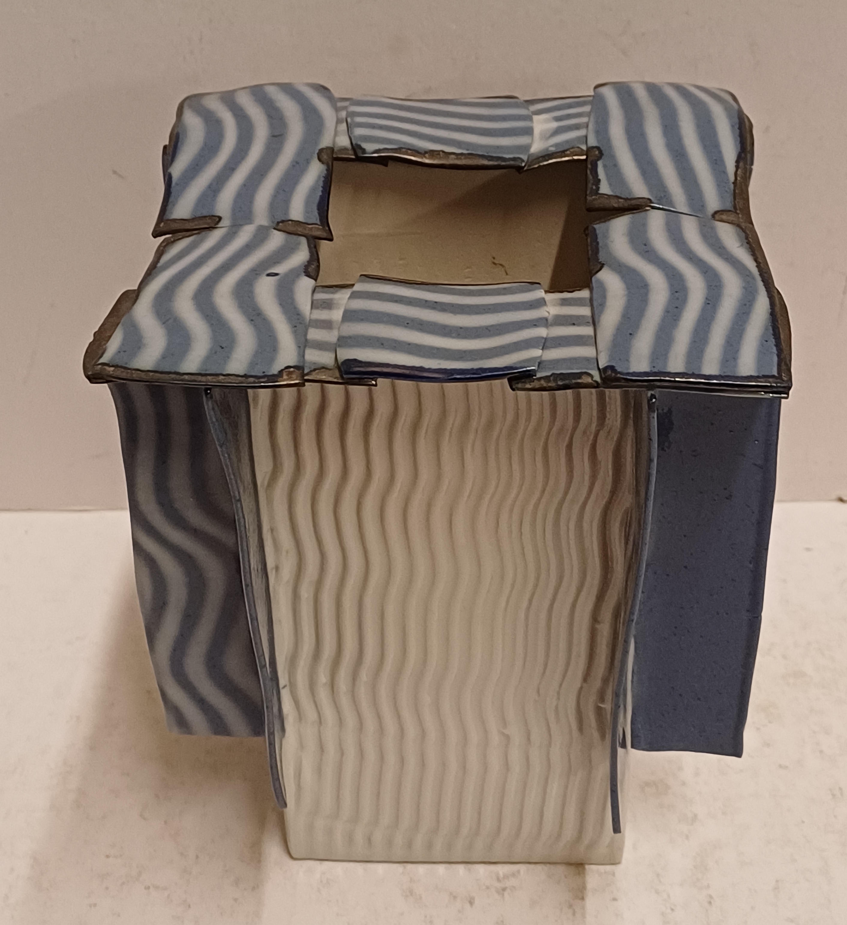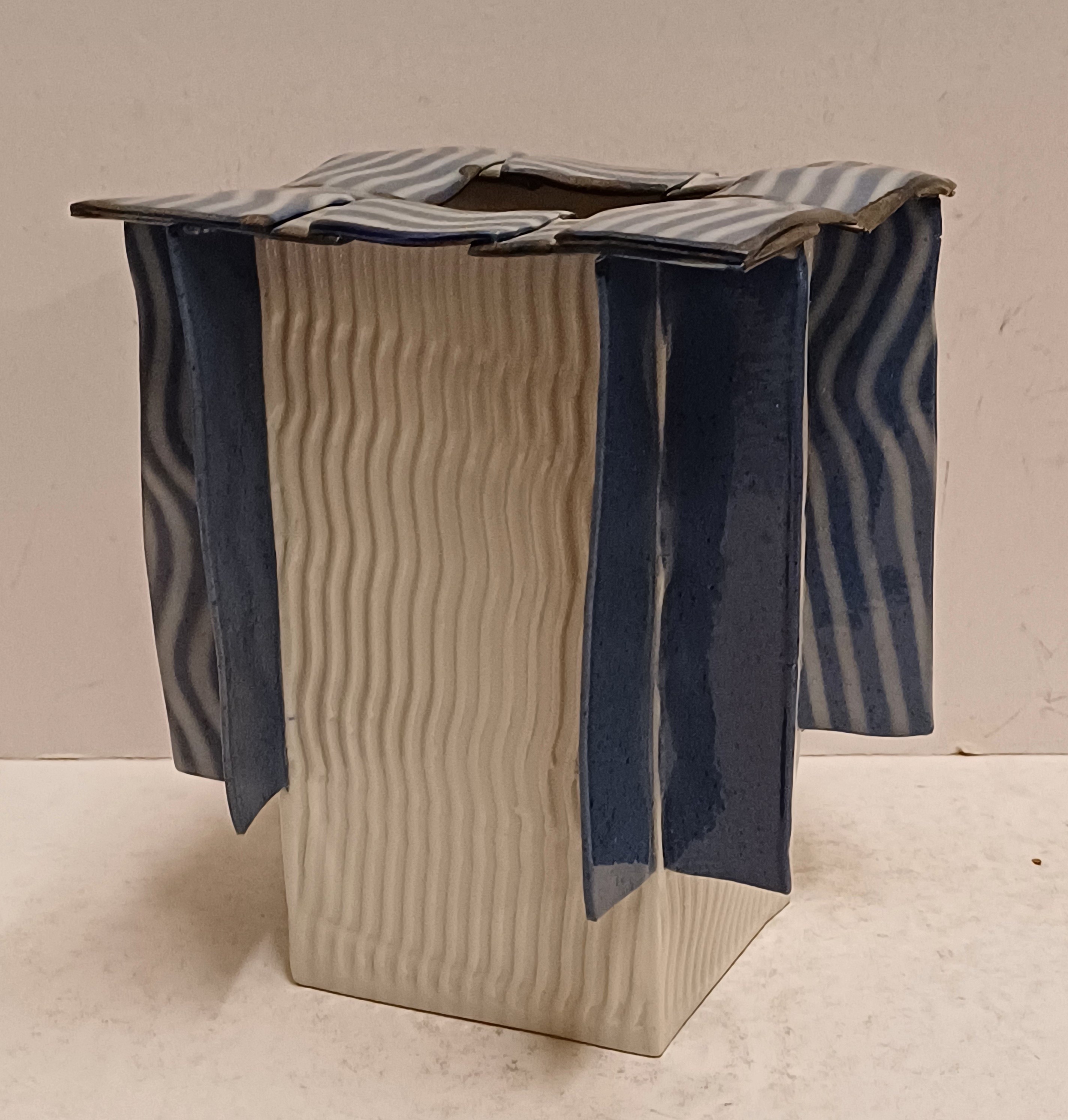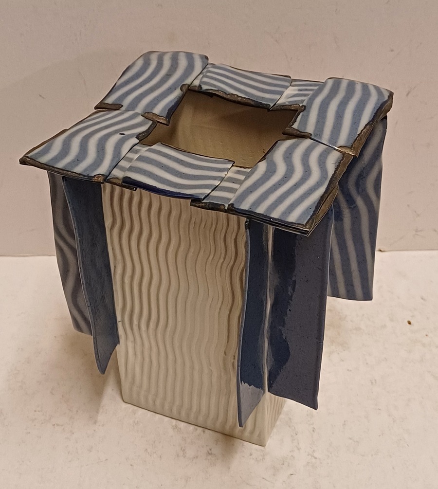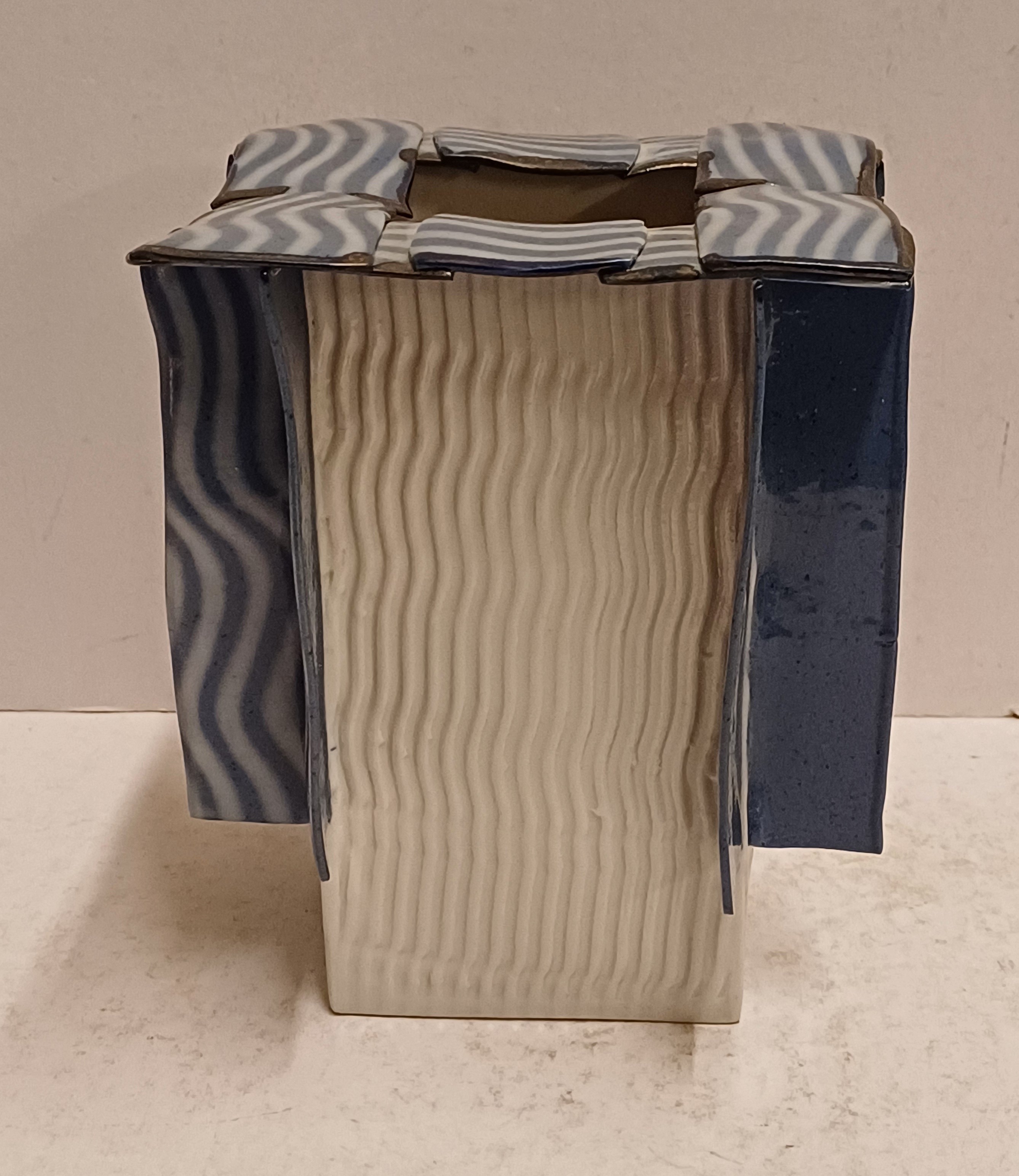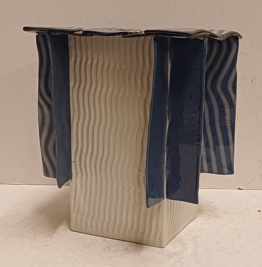 Vierkante uit platen opgebouwde vaas met aangezette banden op de zijkant en bovenrand. Onderzijde met signatuur en jaartal '95.