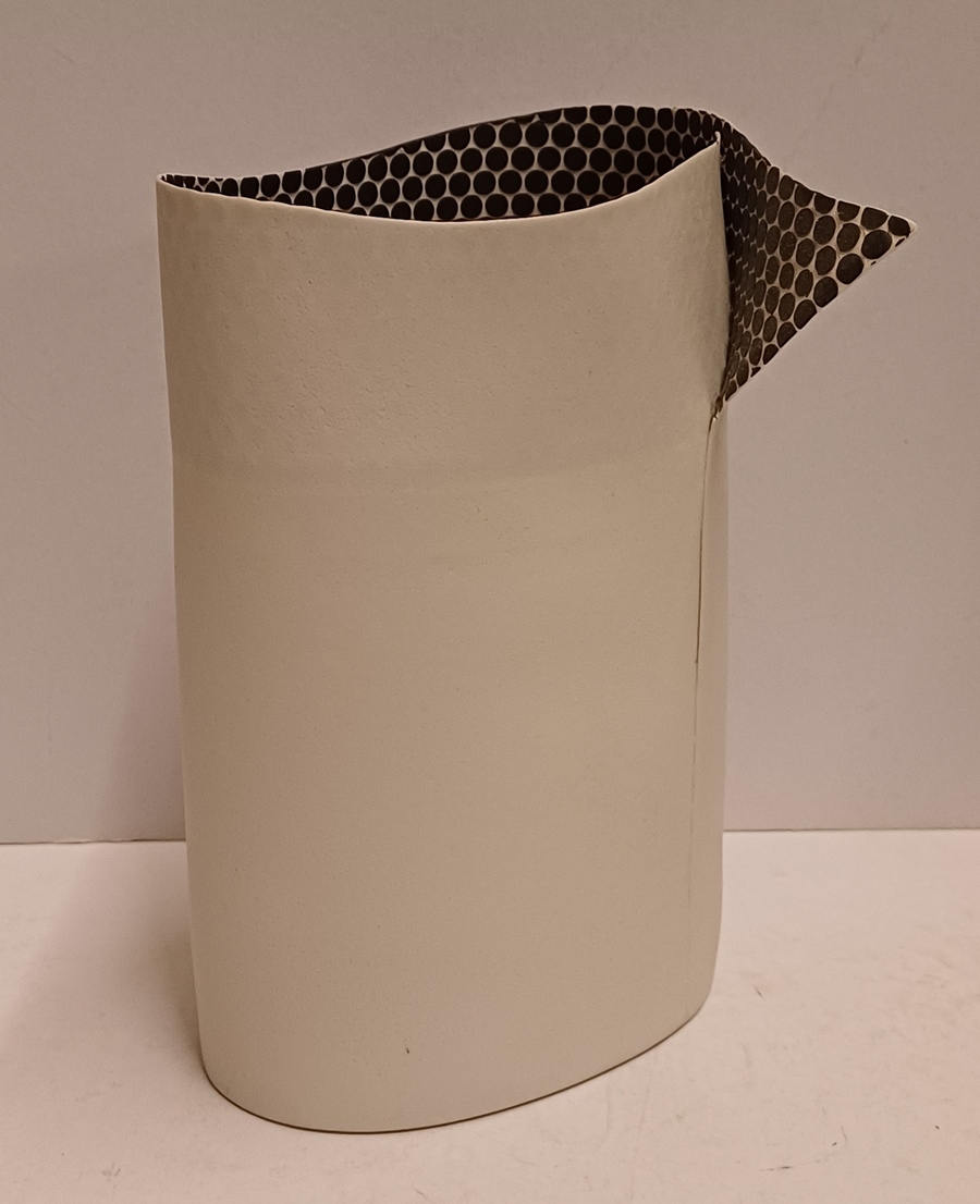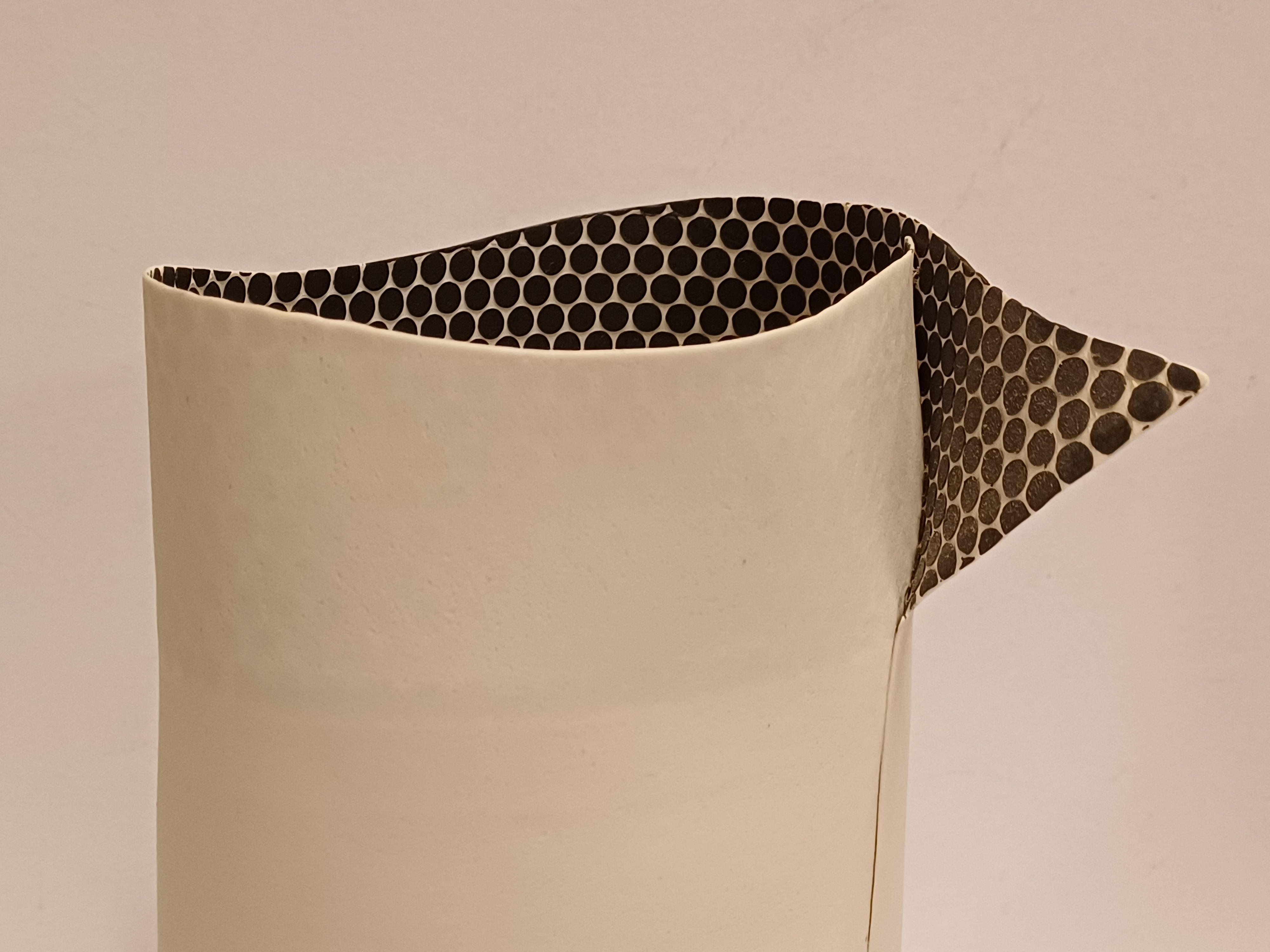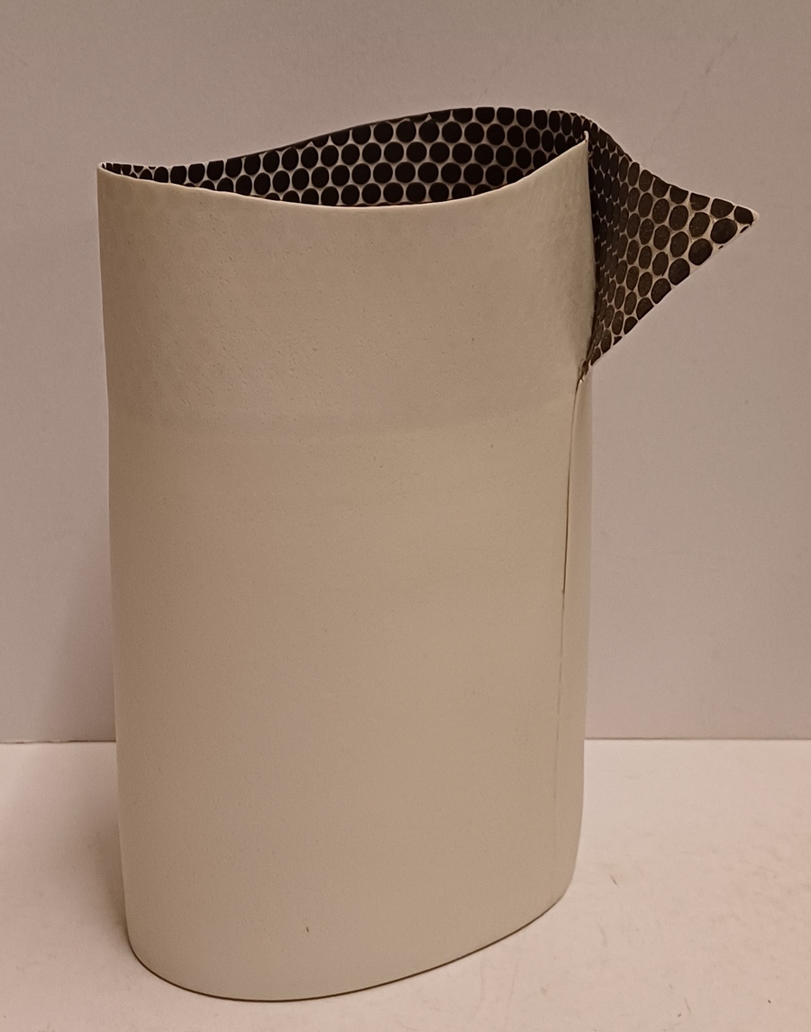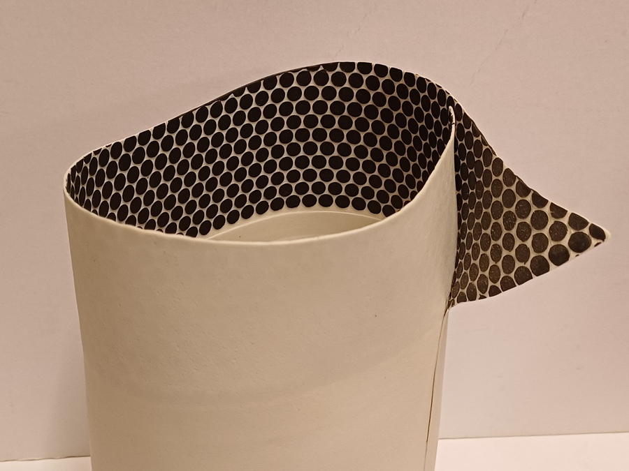 Dunne porseleinen vaas uit platen opgebouwd. de bovenste rand aan de binnenzijde met raster decor in zwart.