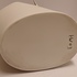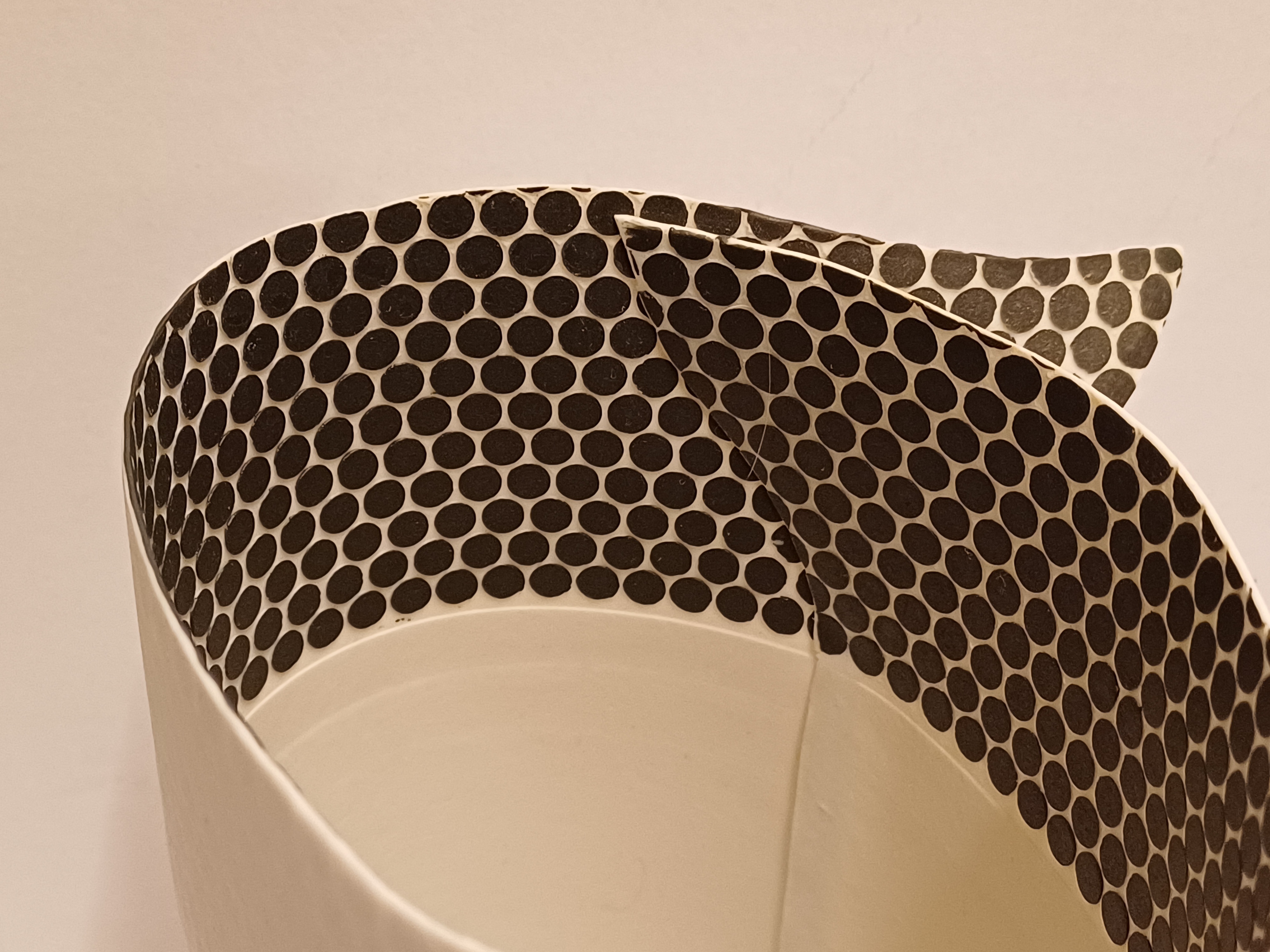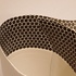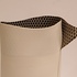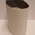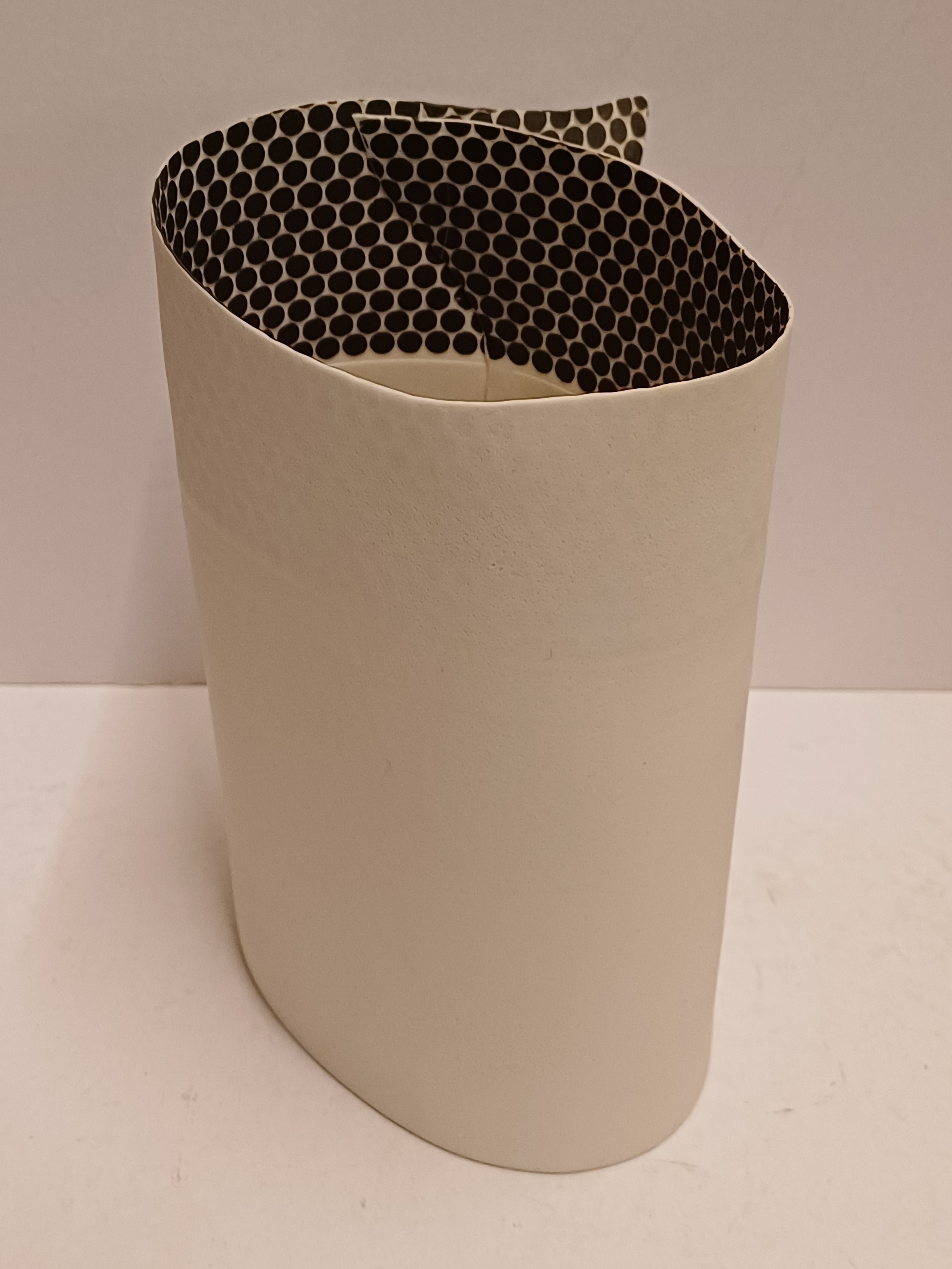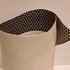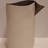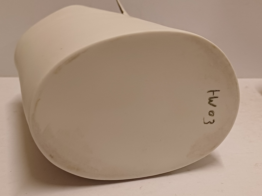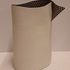 Dunne porseleinen vaas uit platen opgebouwd. de bovenste rand aan de binnenzijde met raster decor in zwart.