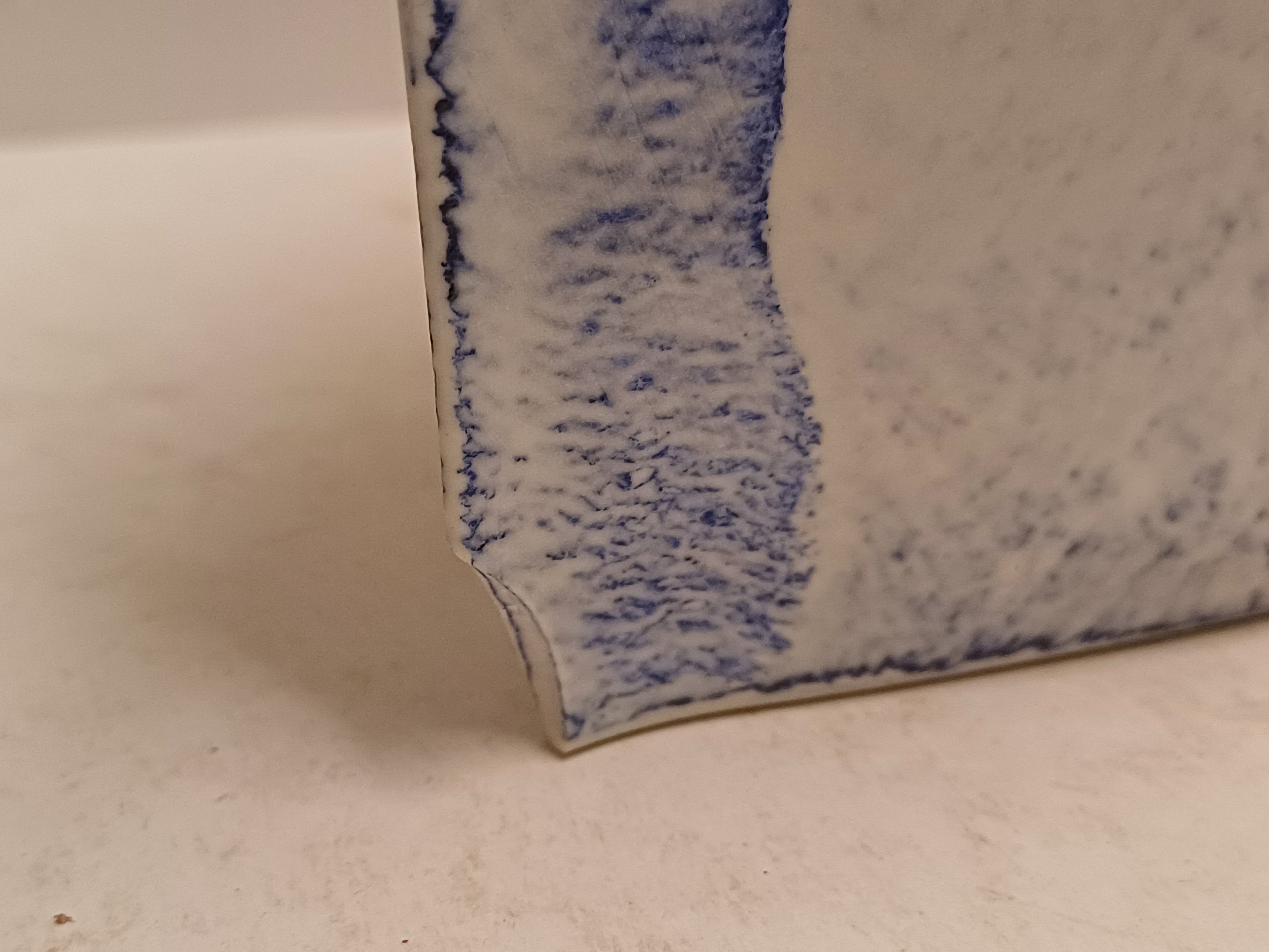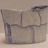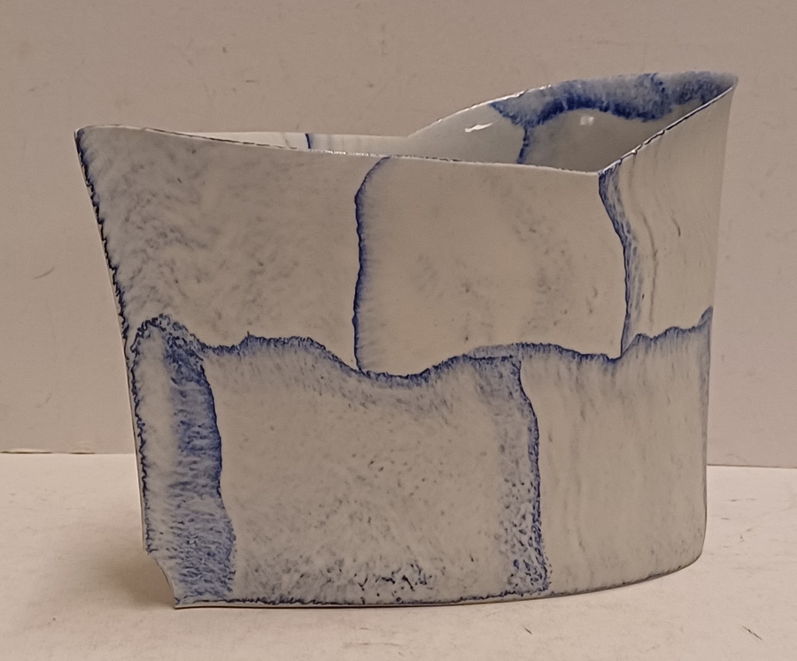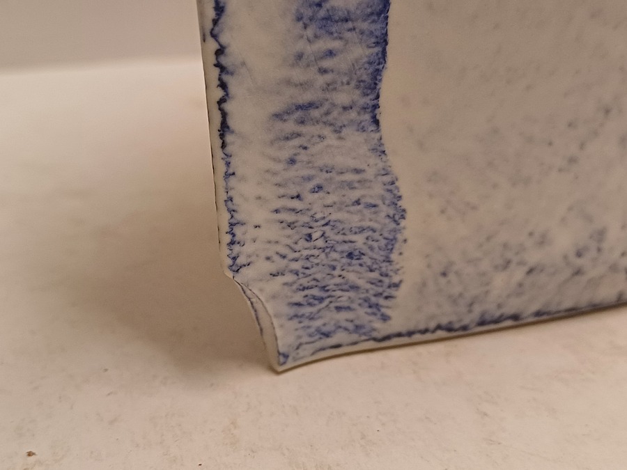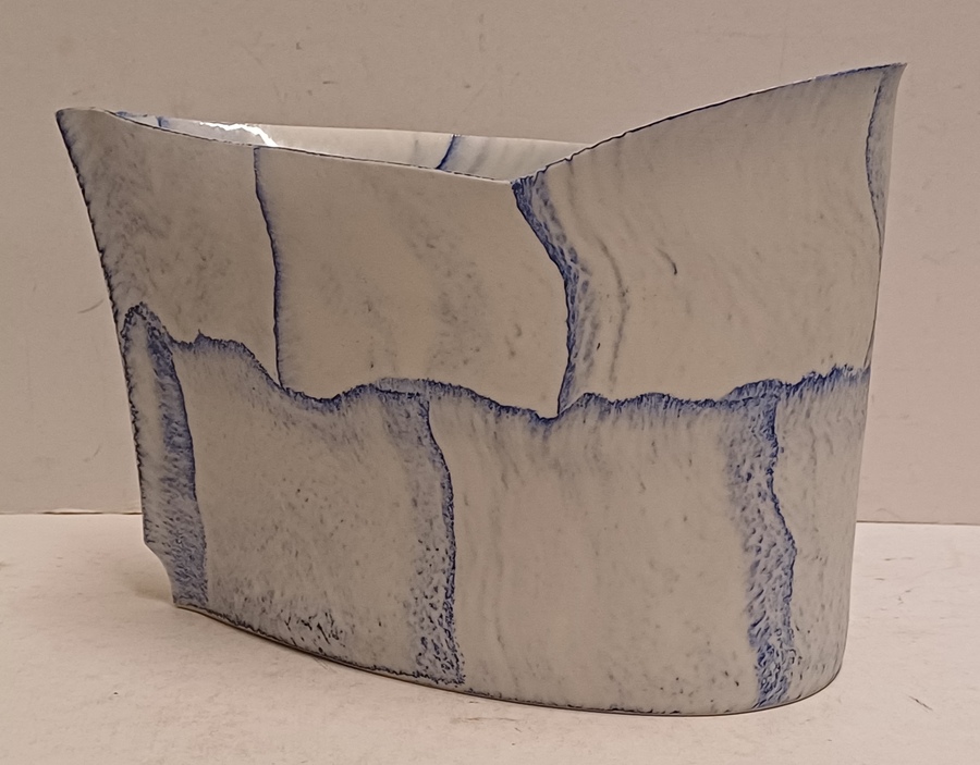 Uit platen opgebouwde vaas met blauwe vlak decoraties. Onderzijde gemerkt en gedateerd '03