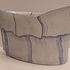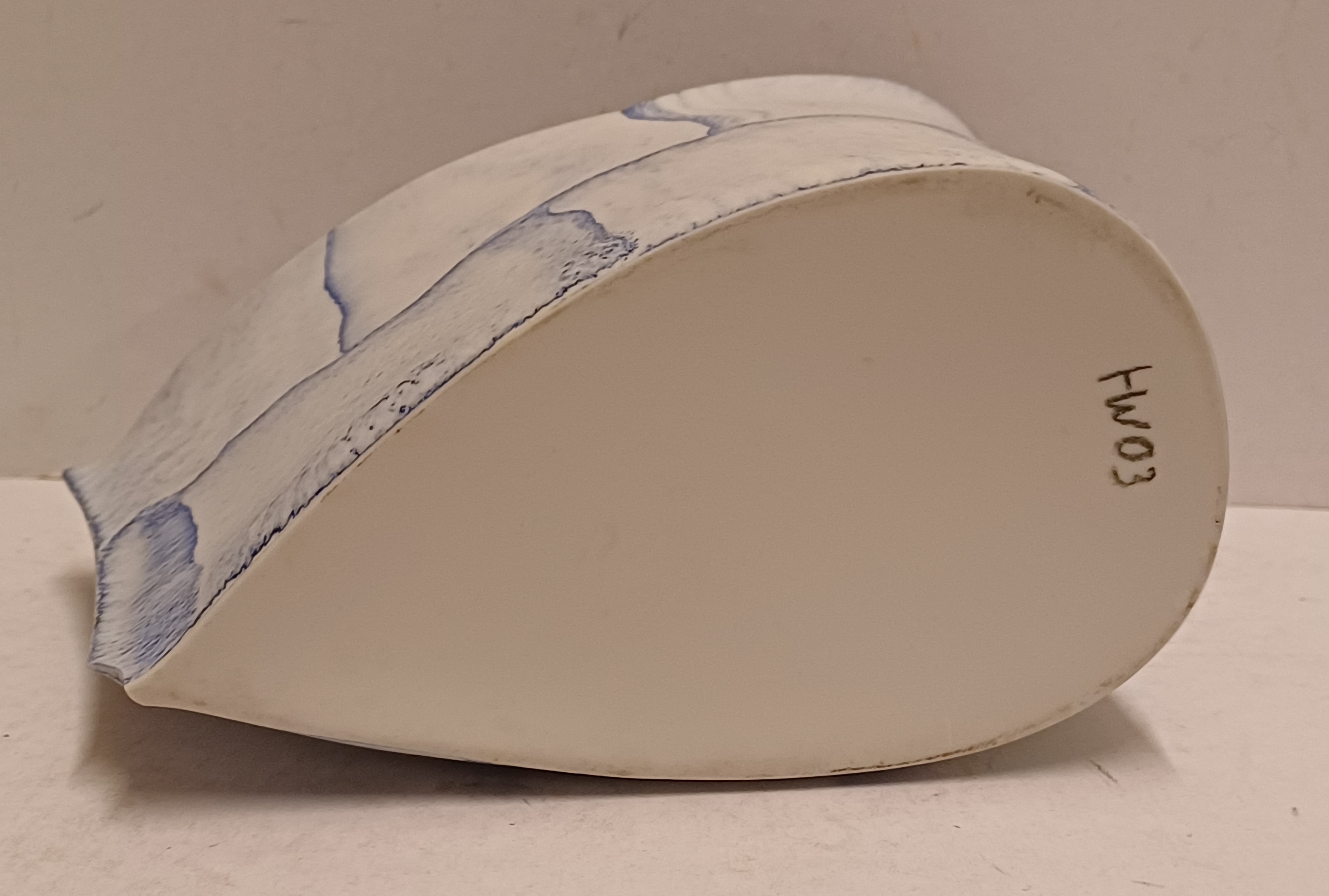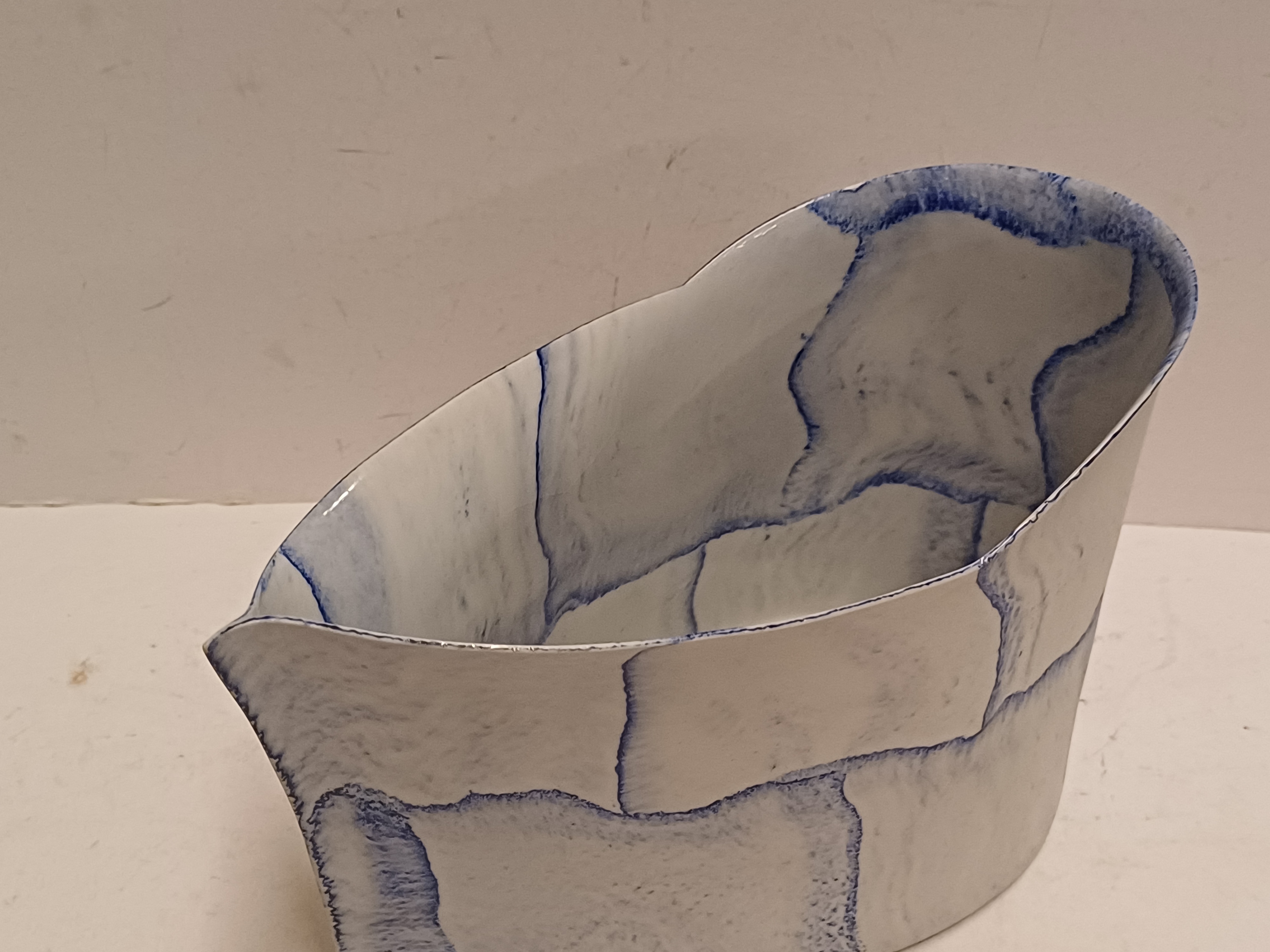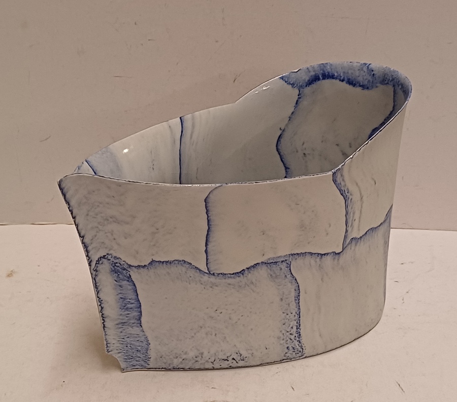 Uit platen opgebouwde vaas met blauwe vlak decoraties. Onderzijde gemerkt en gedateerd '03