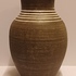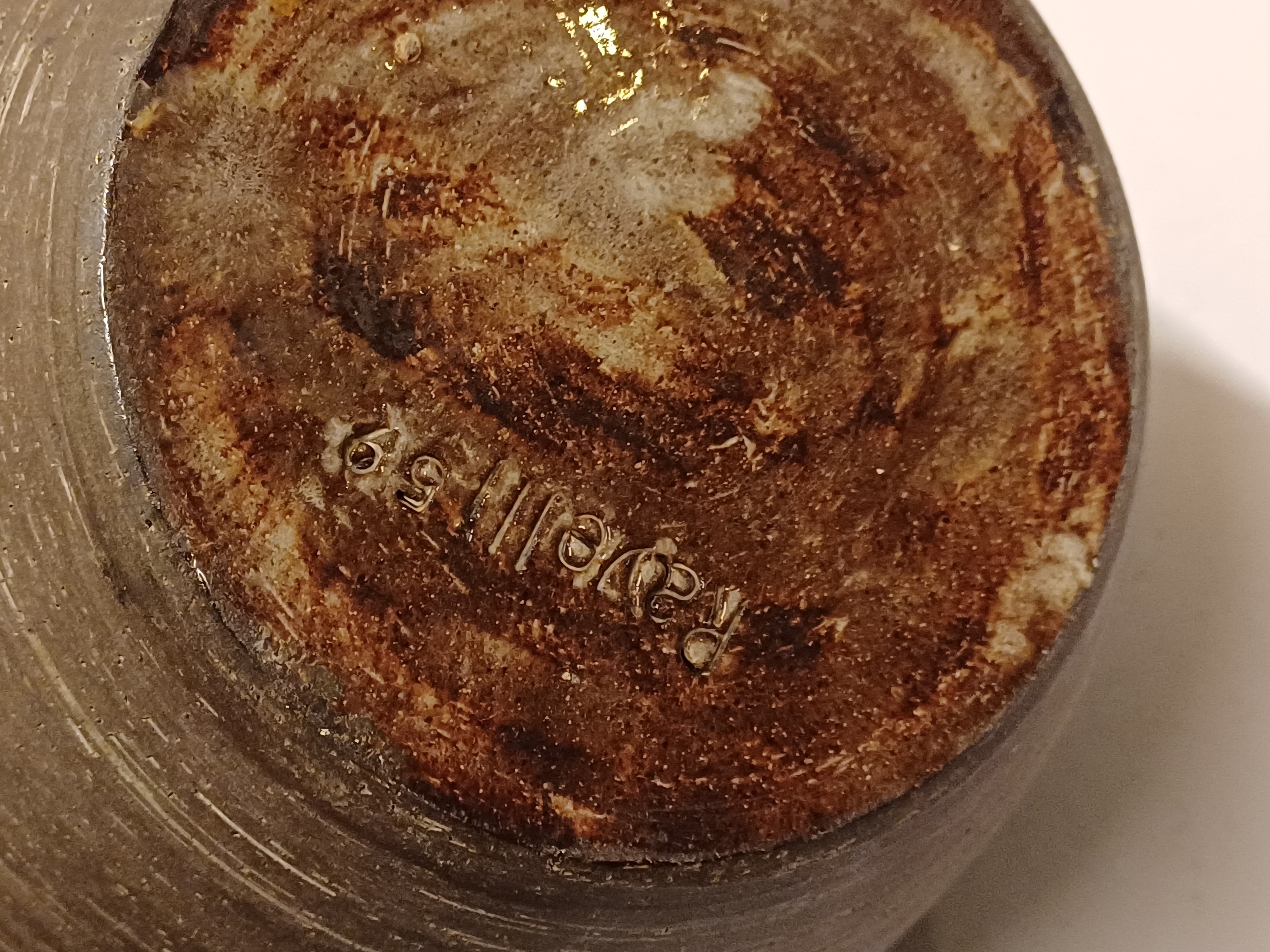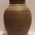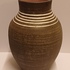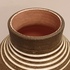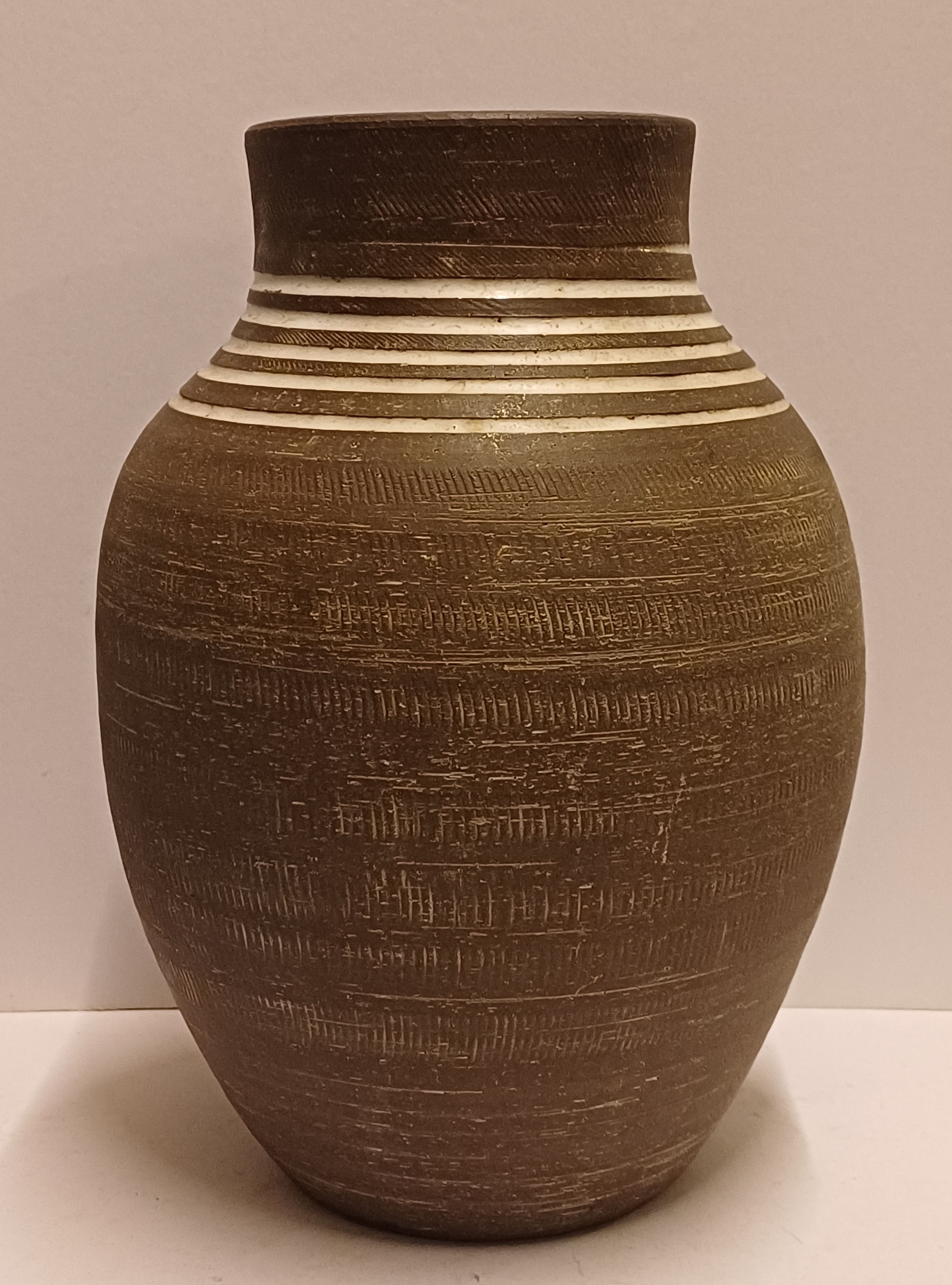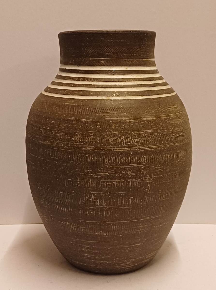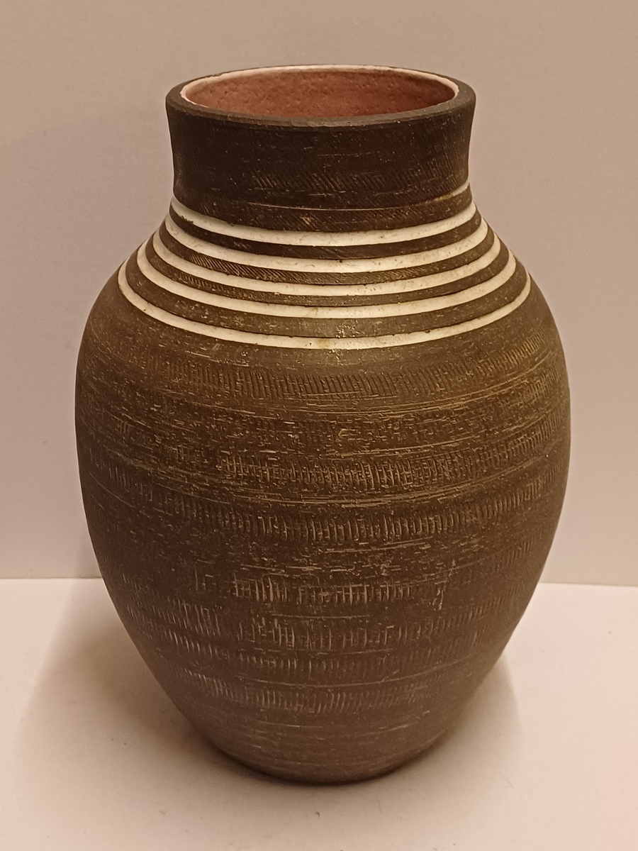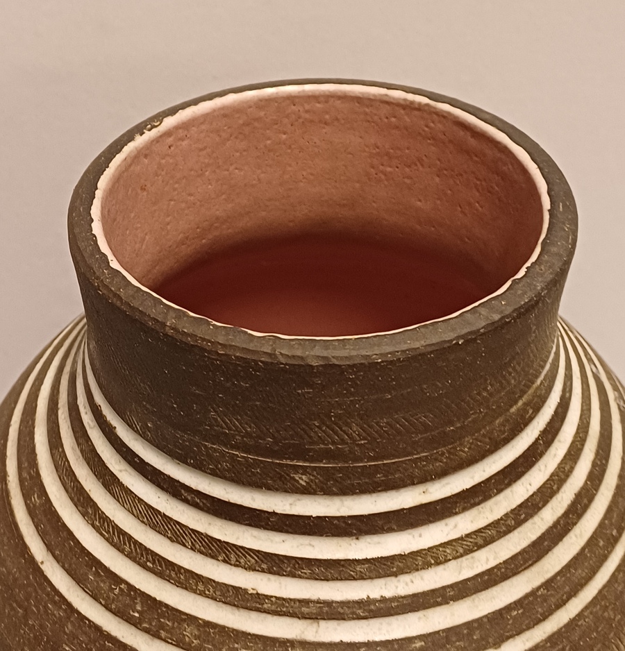 Groot formaat vaas met witte lijnen op bruine ondergrond De binnenzijde met roze glazuur. Onderzijde gesigneerd