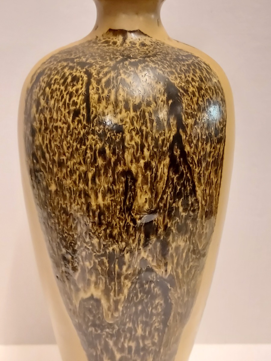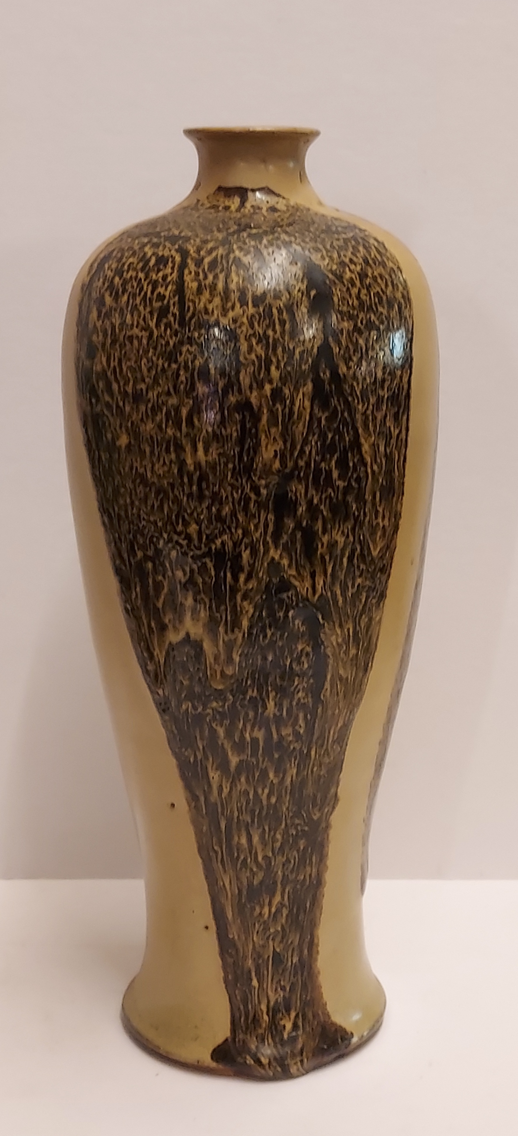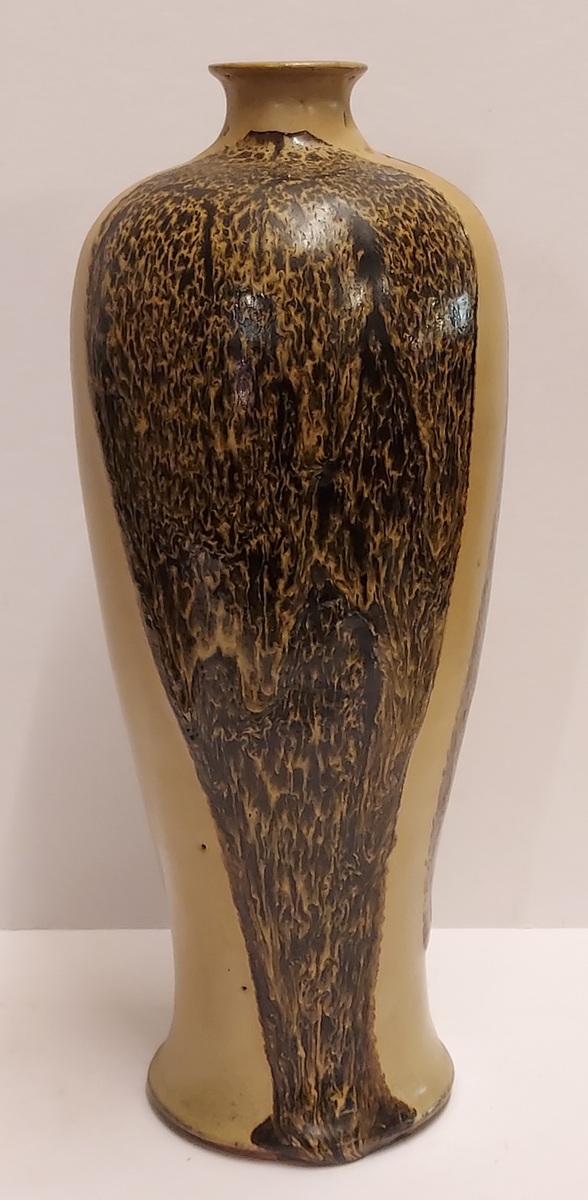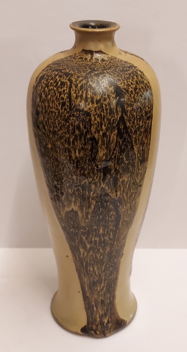 Vase en grès avec glaçure jaune et une tache brun-noir de chaque côté. Signé sur le dessous.