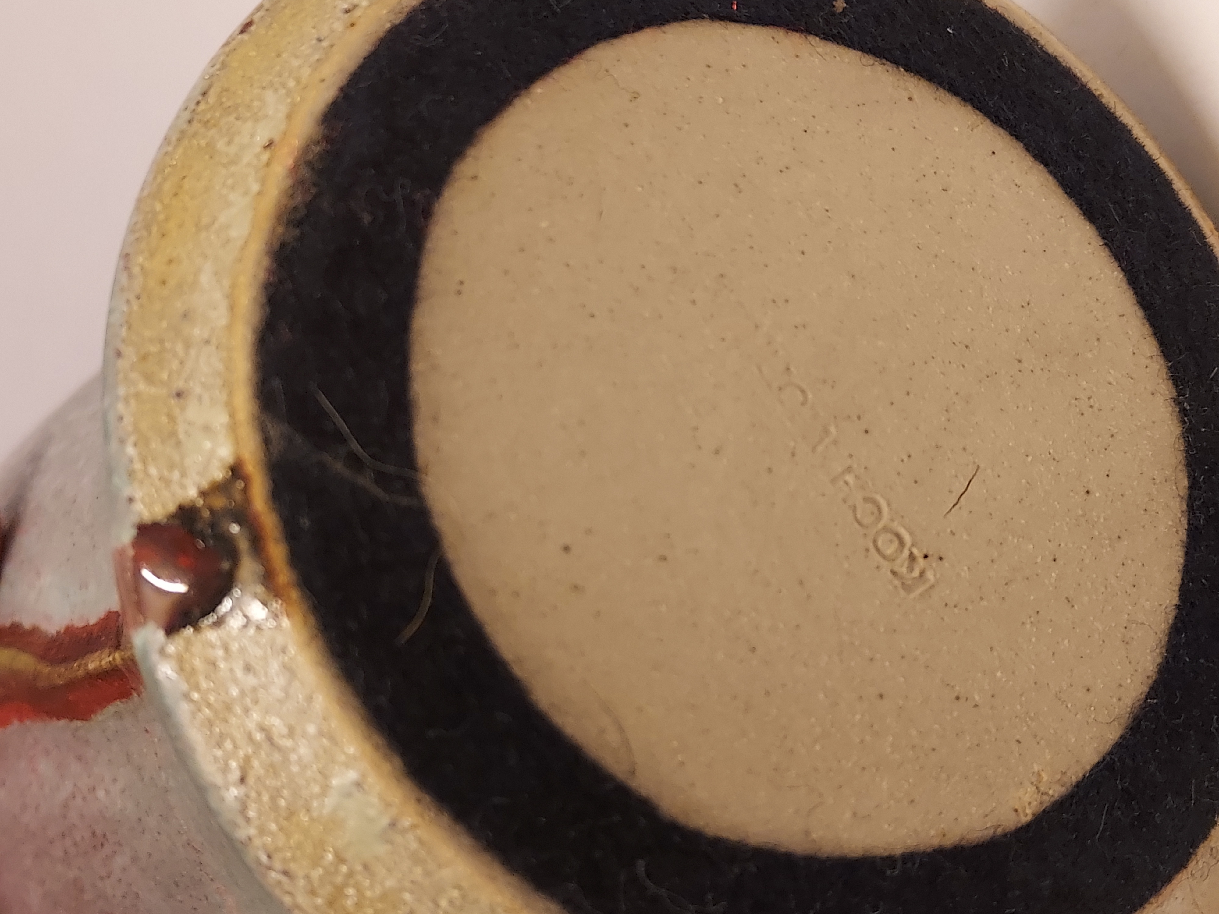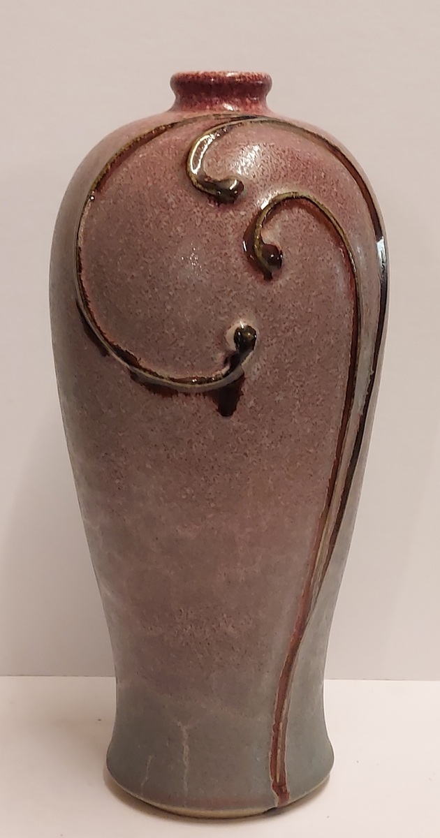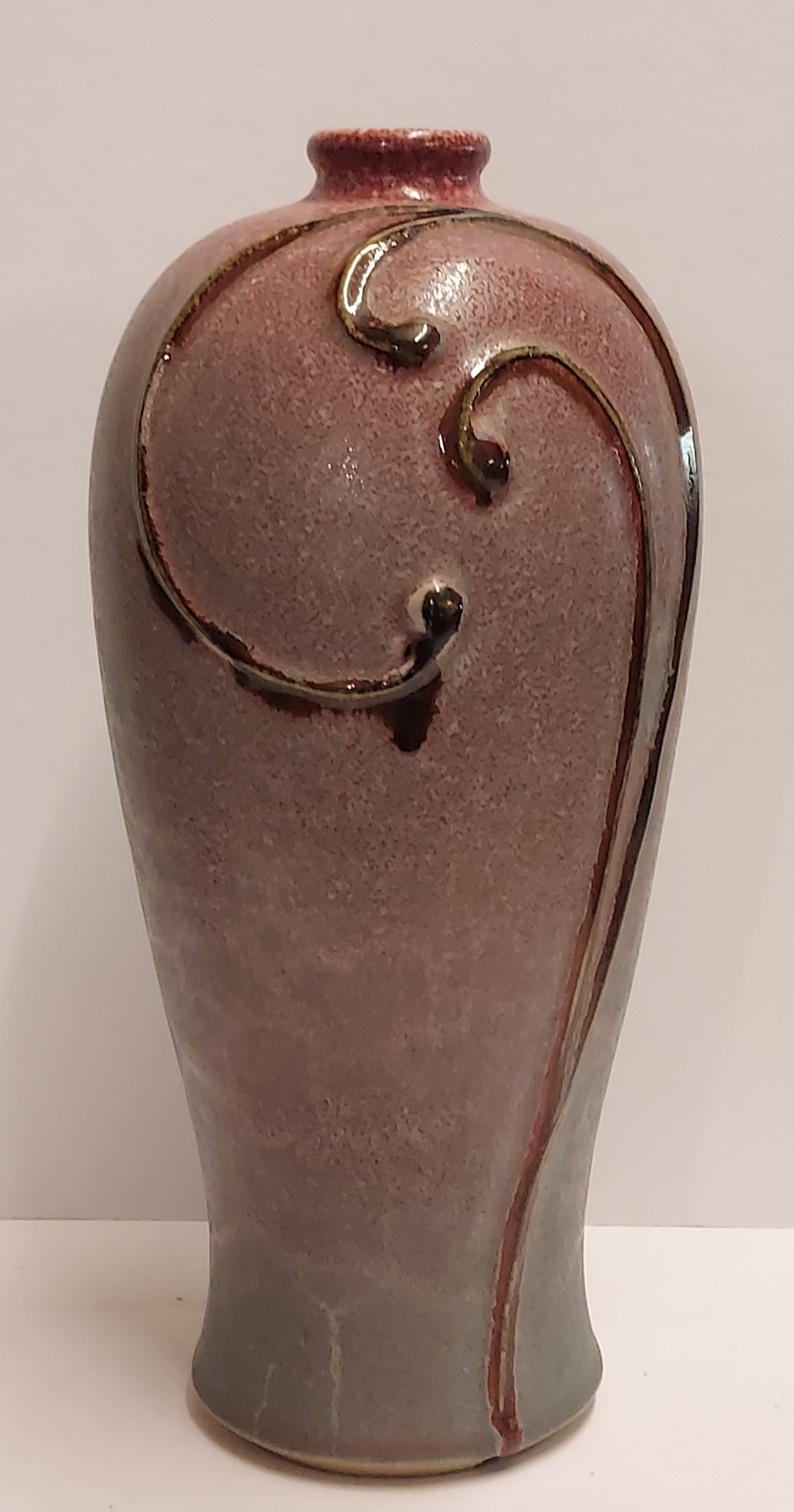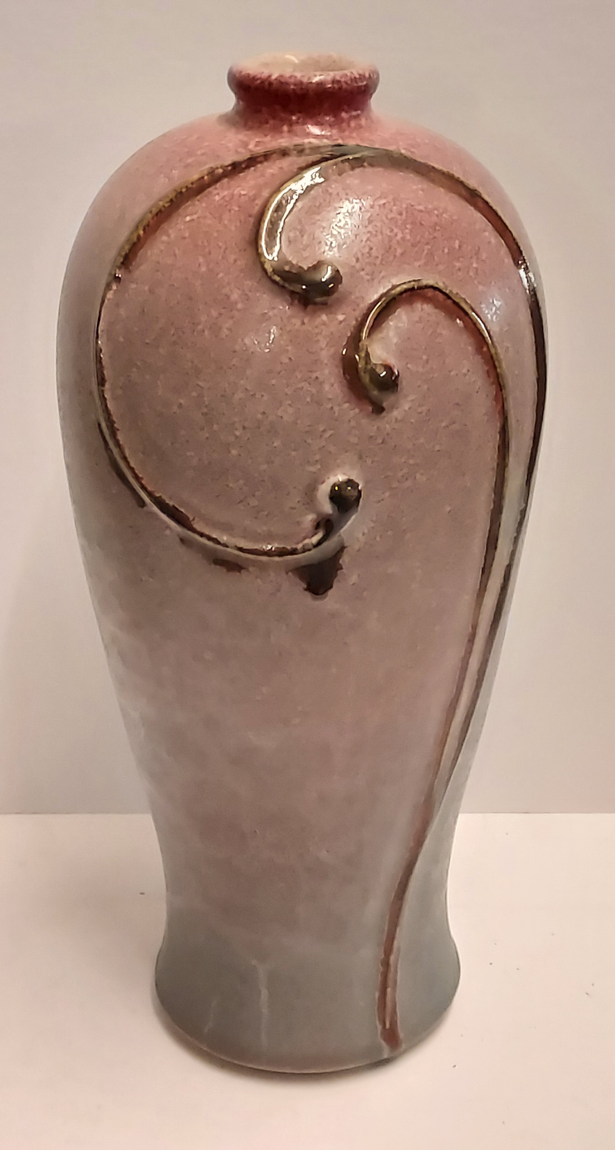 Vase en grès avec glaçure rose et motif appliqué en coup de fouet. Base marquée.