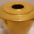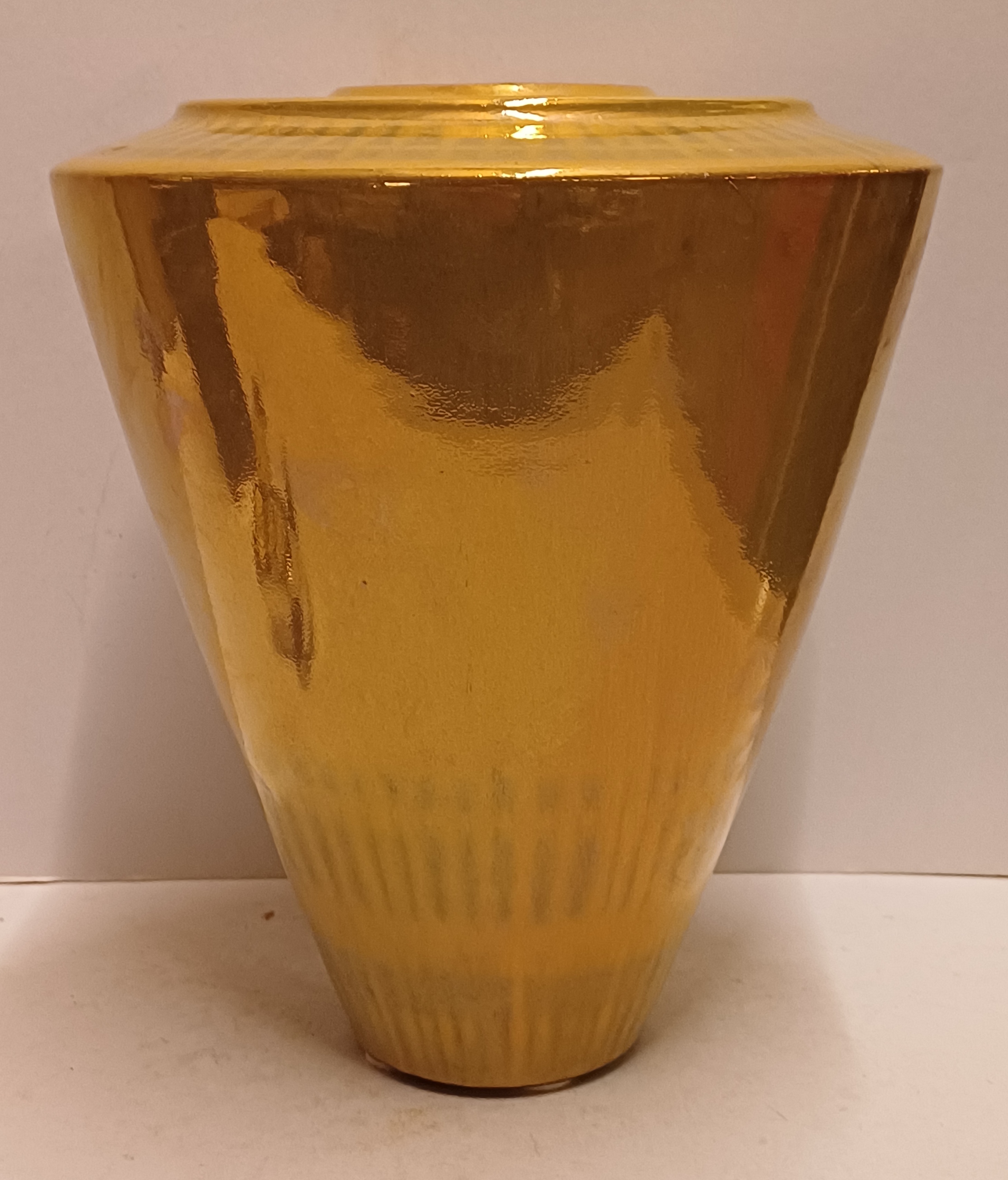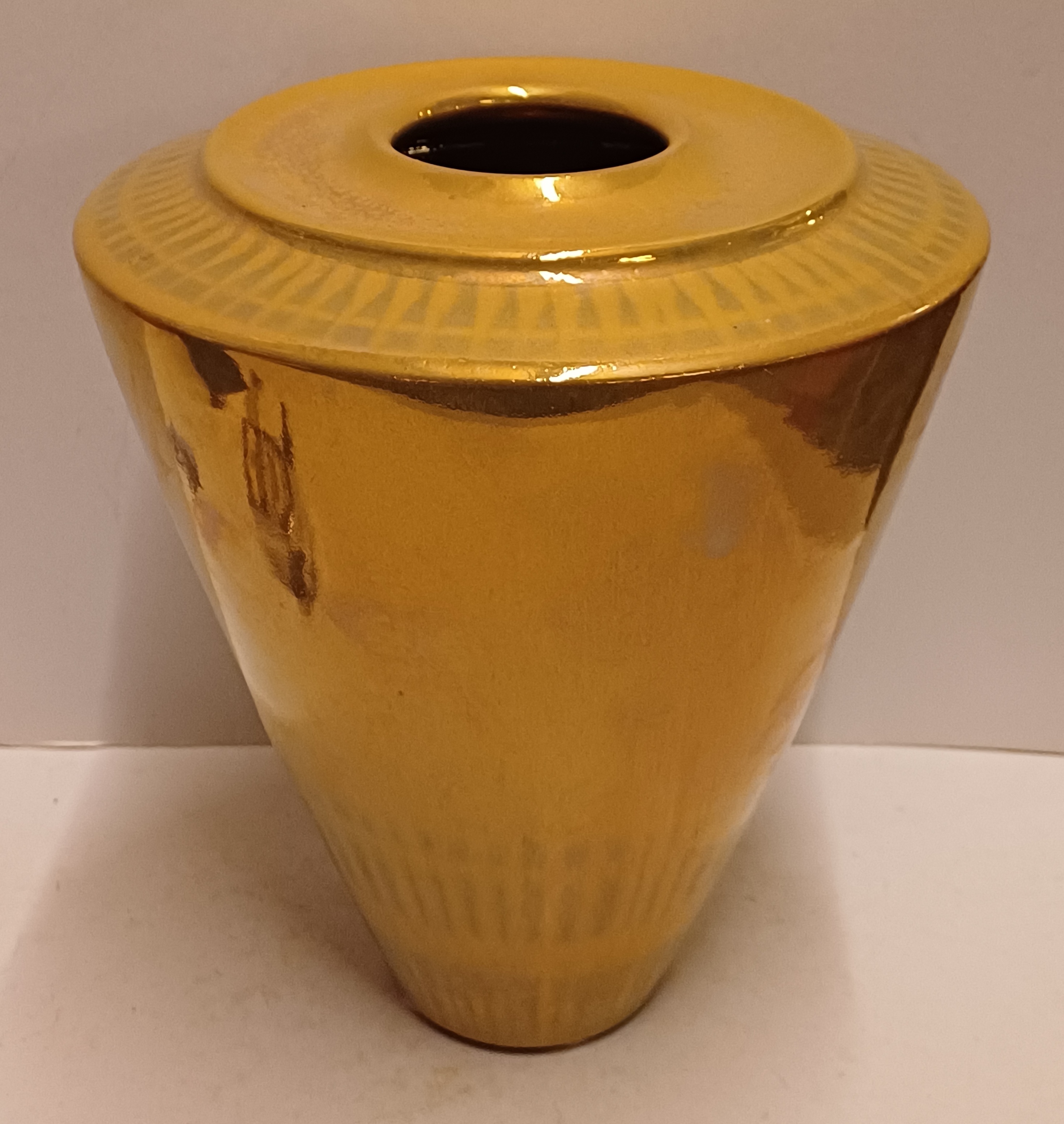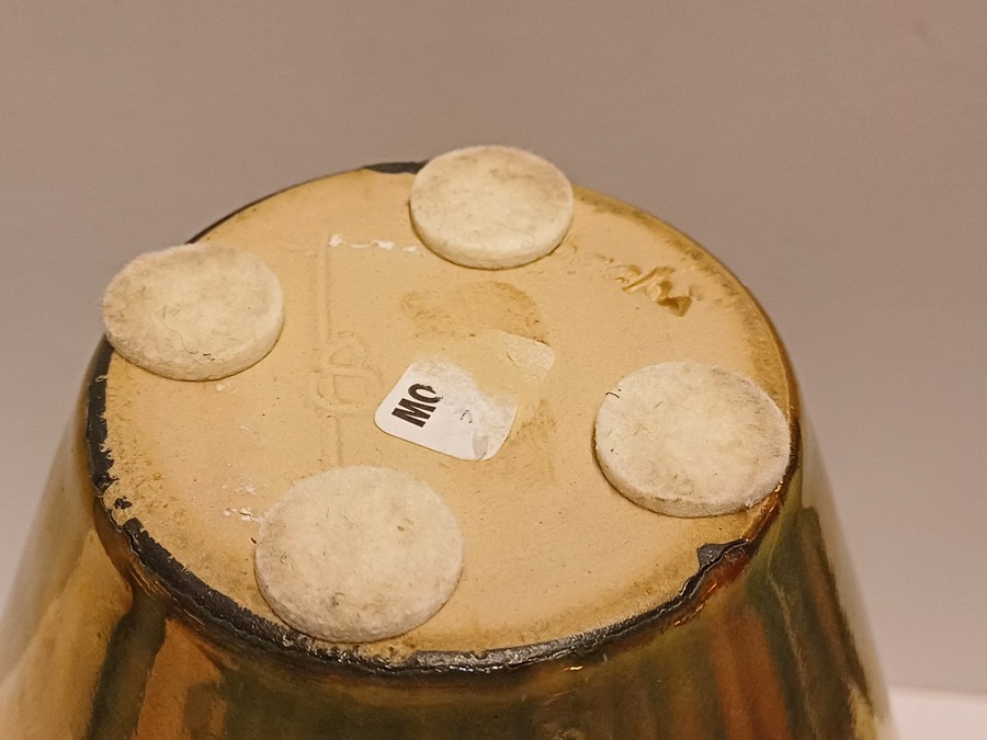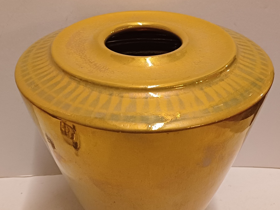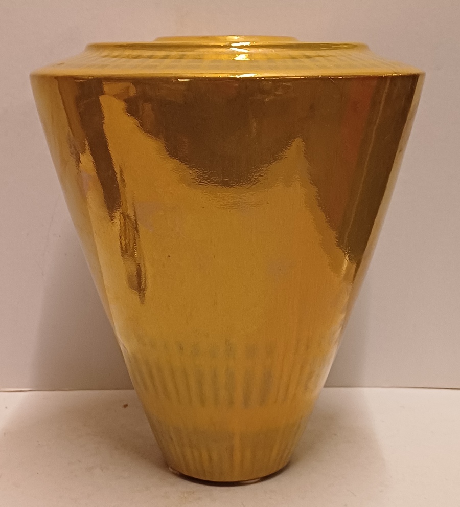 Aardewerken vaas met glanzende gouden glazuur. Onderzijde met fabrieksmerk en kunstenaars monogram.