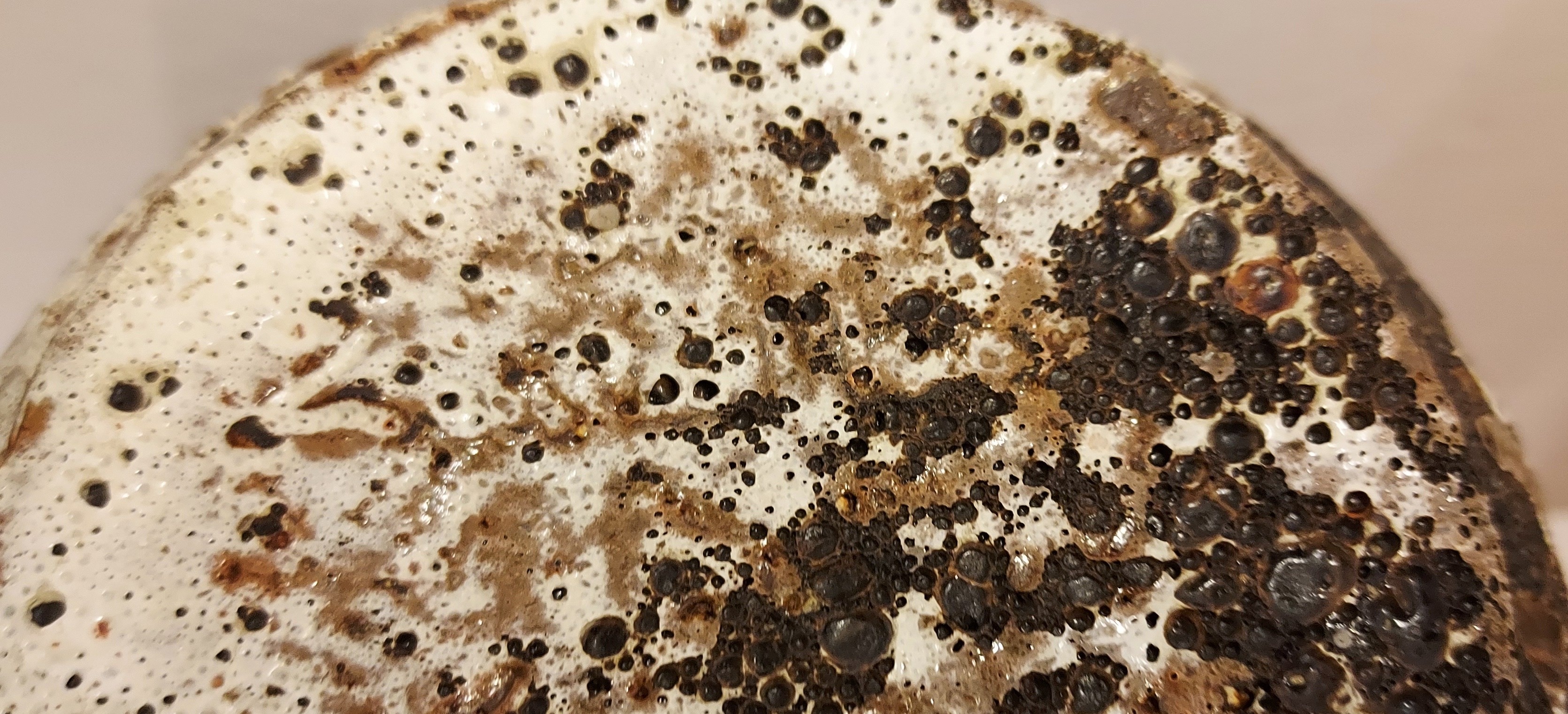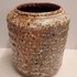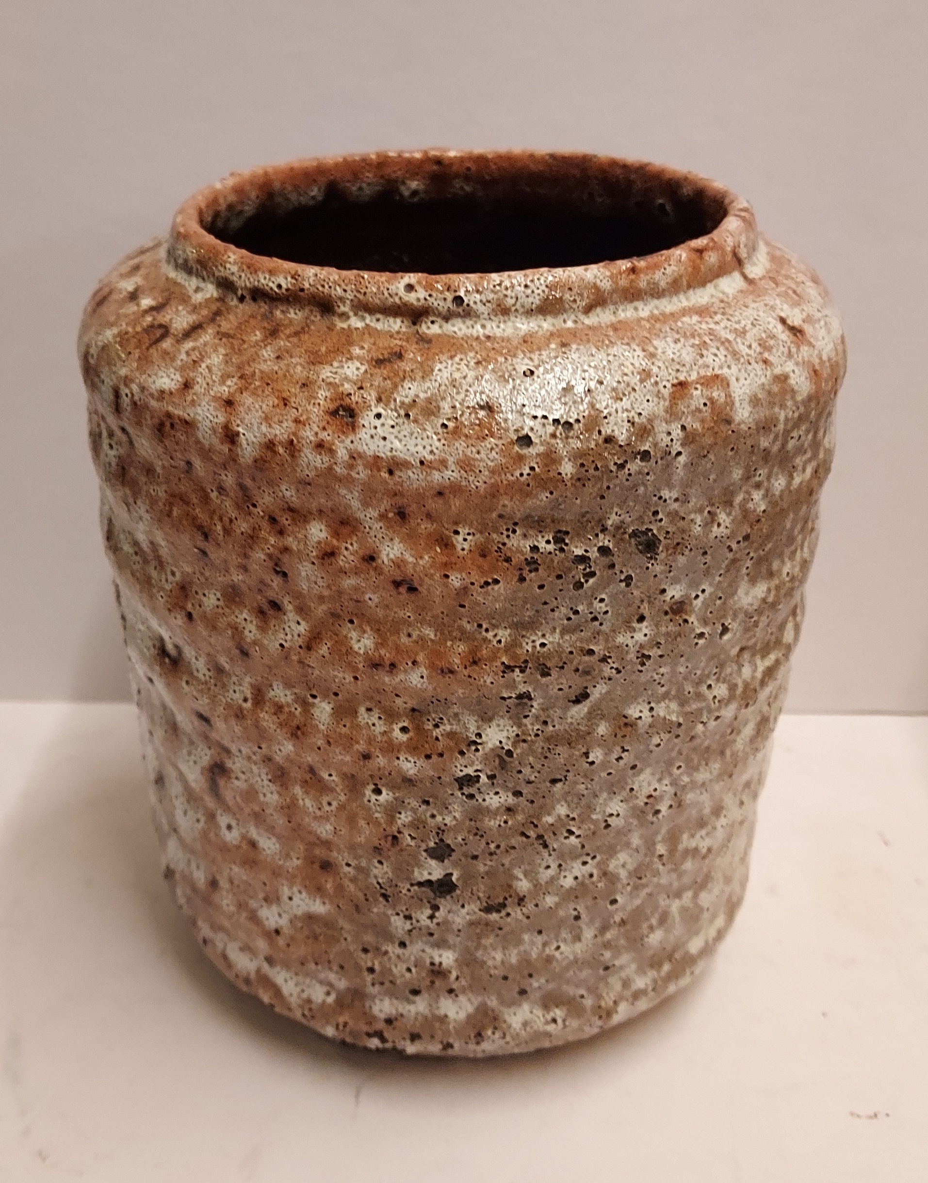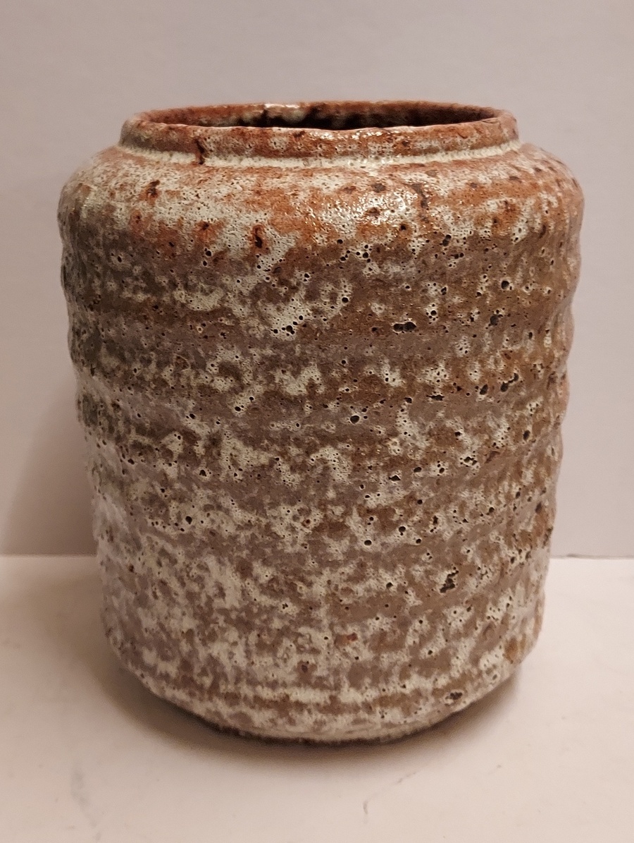 Vase cylindrique avec des côtes horizontales et un glaçure brun-gris mousseux. Marque peu claire sur le dessous.