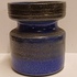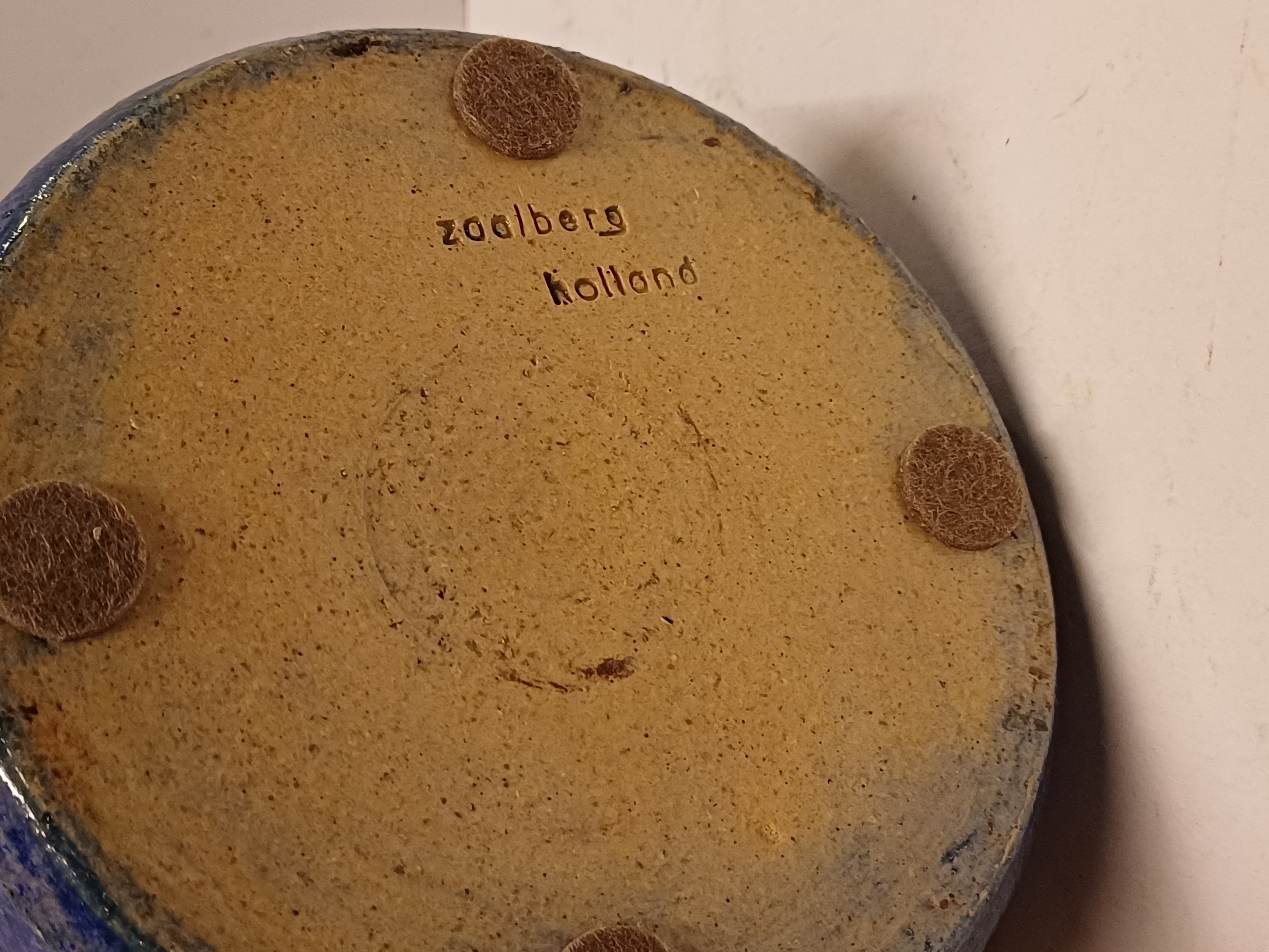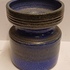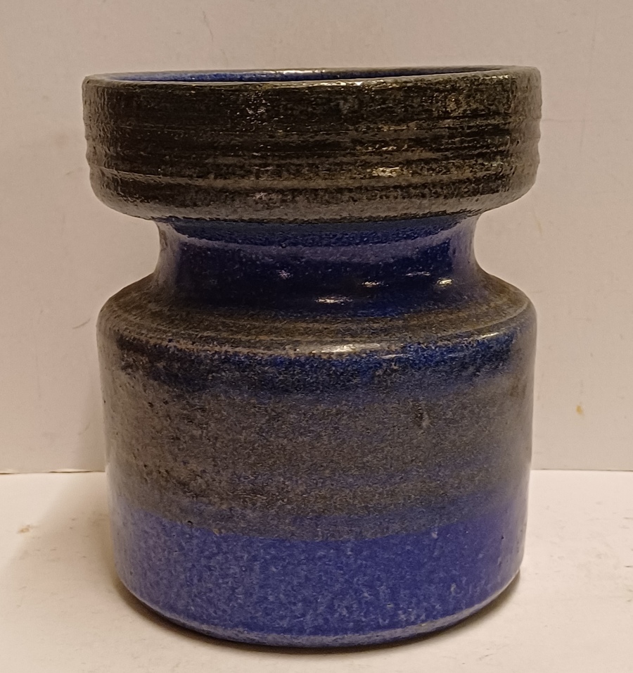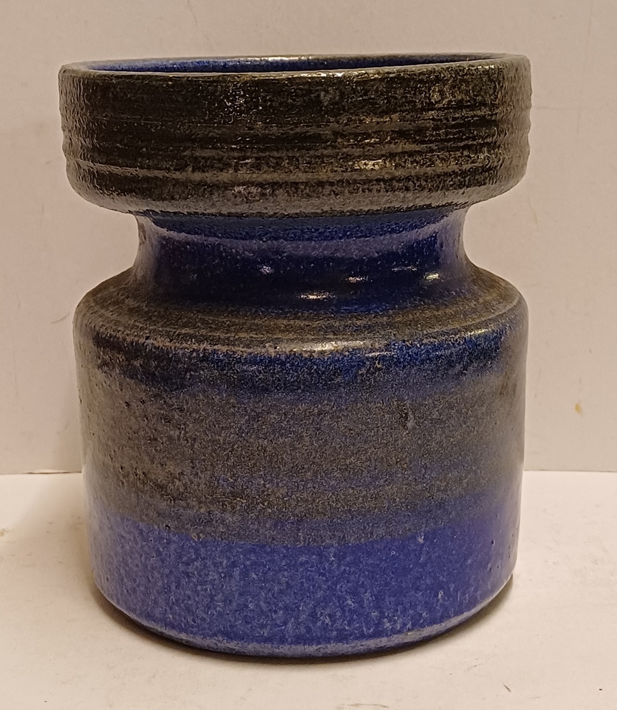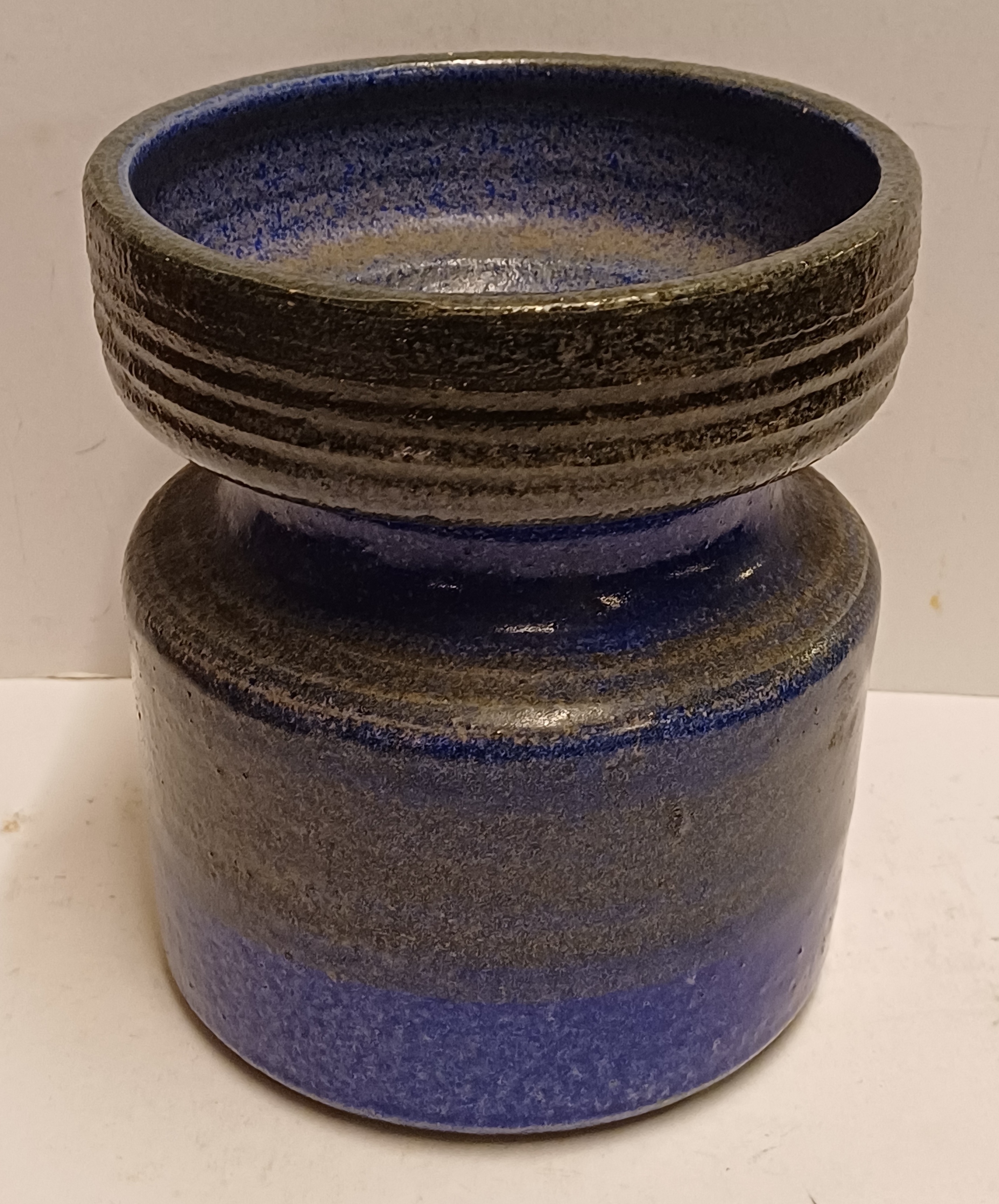 Cilindrische aardewerken vaas met insnoeringen blauwe glazuur met zwarte banen. Onderzijde gesigneerd.