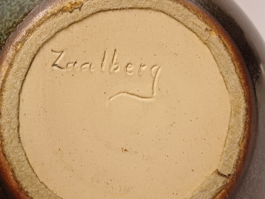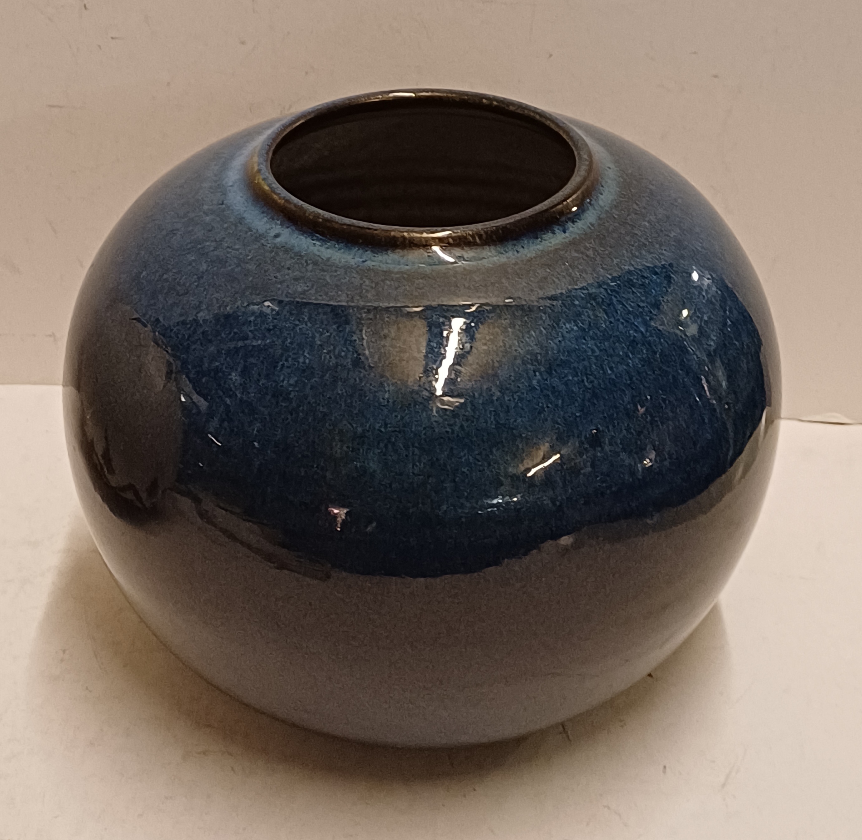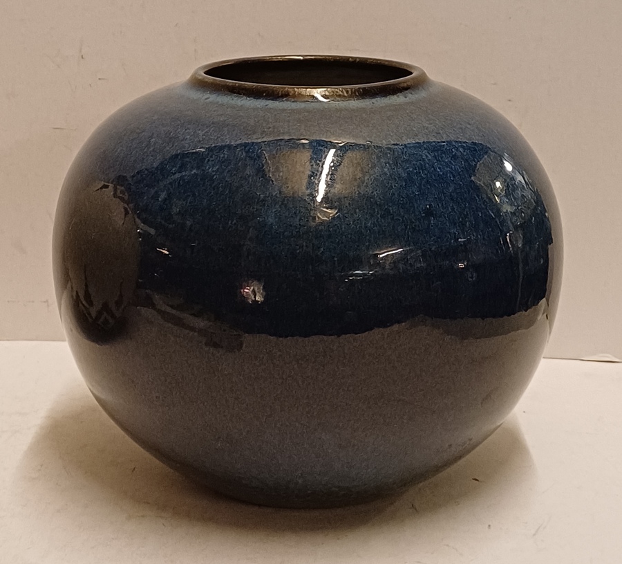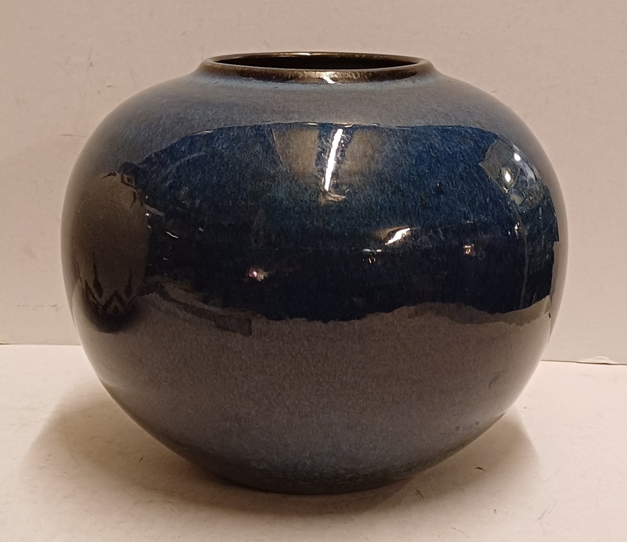 Bolle vaas met donker blauwe glazuur. Onderzijde gesigneerd.