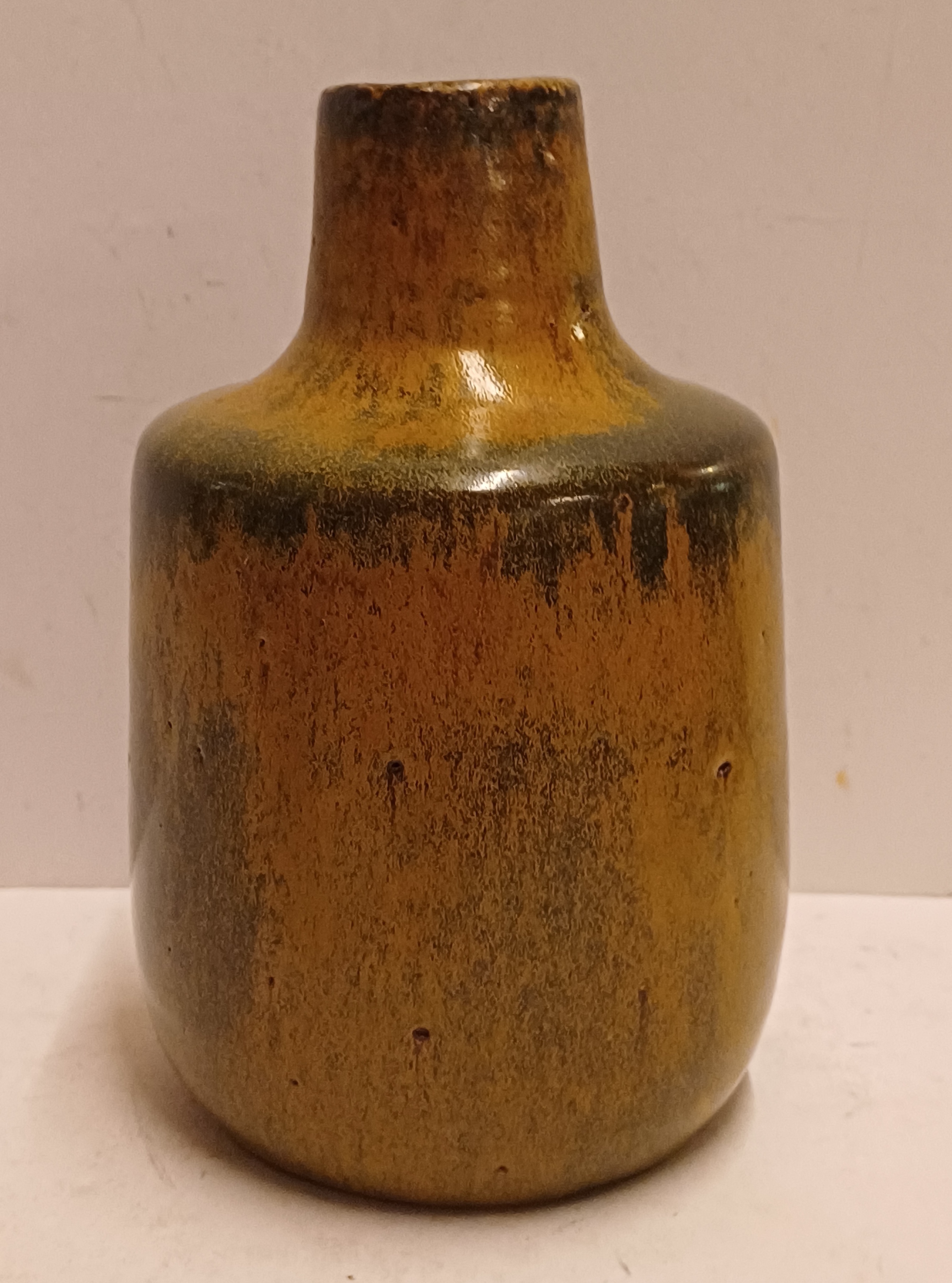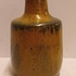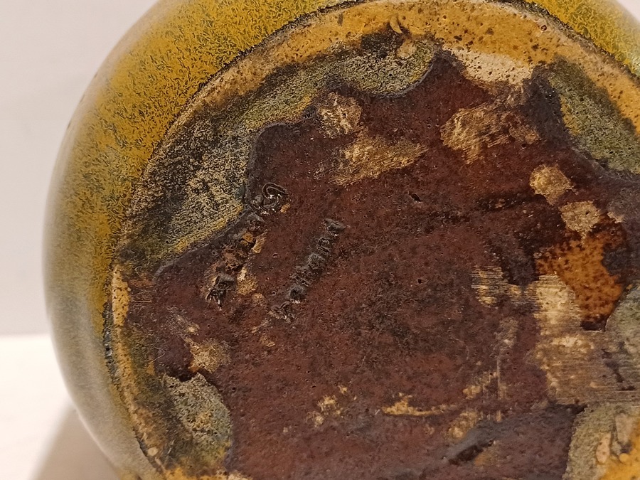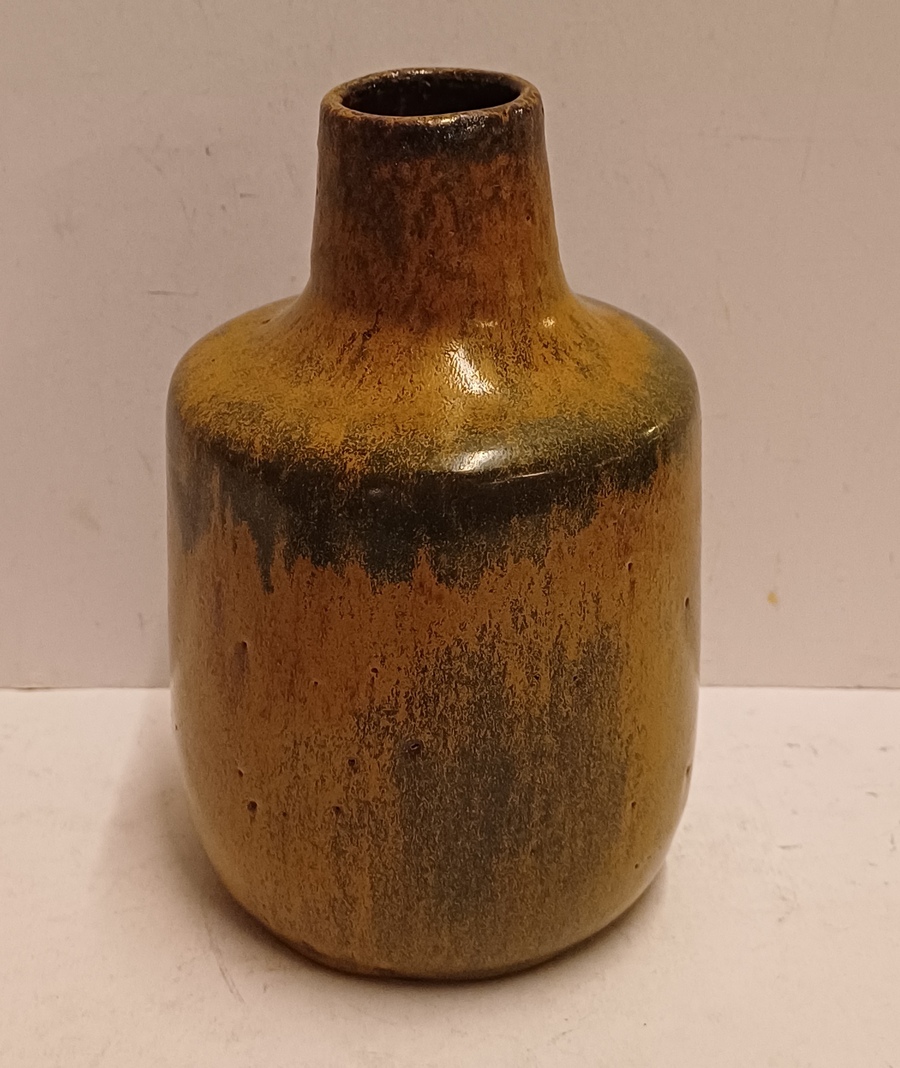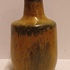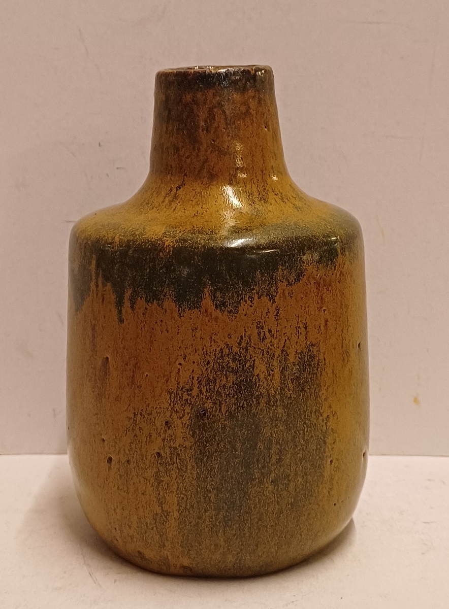 Aardewerken vaas met geel bruine glazuur. Onderzijde met fabrieksmerk.