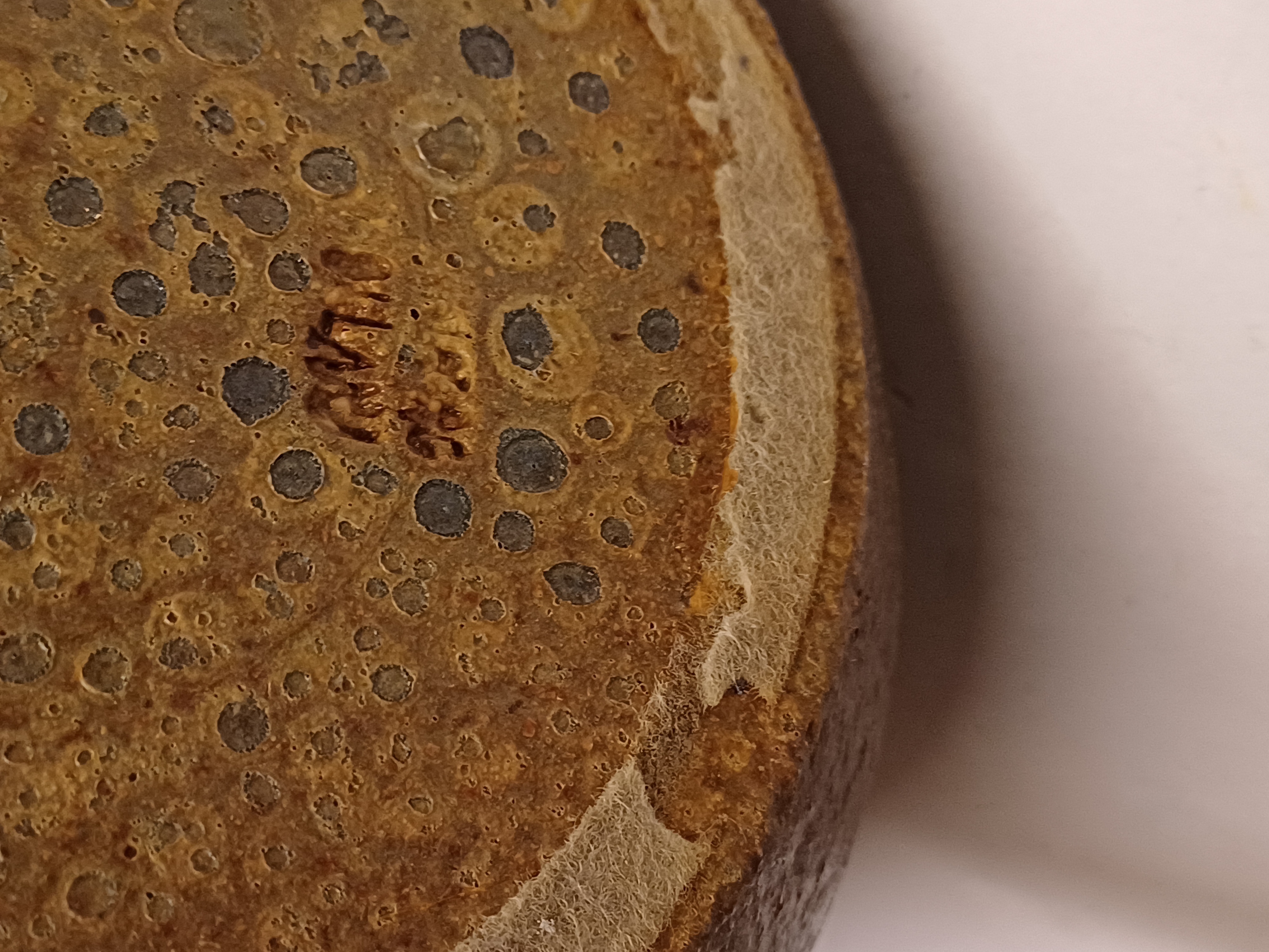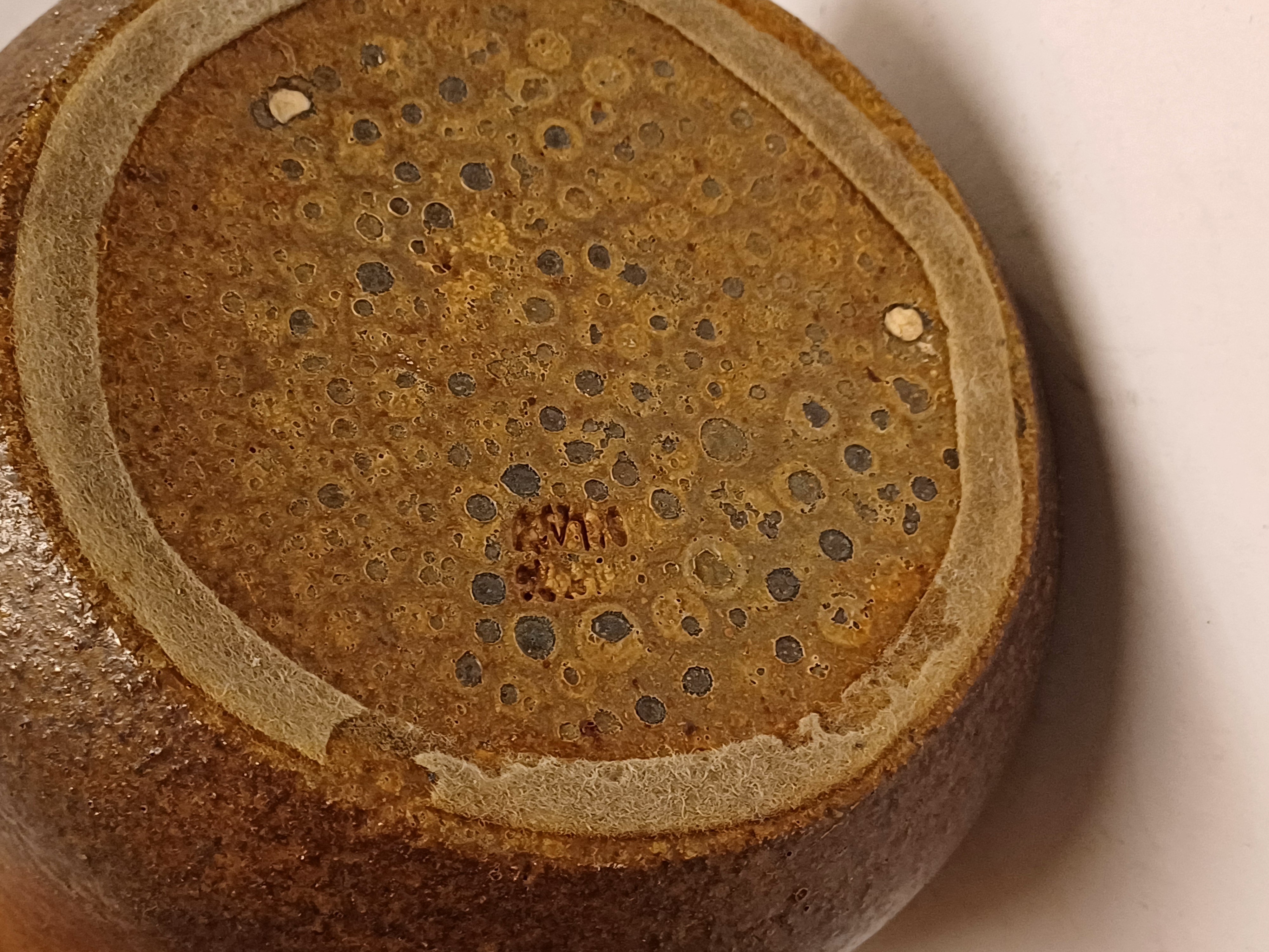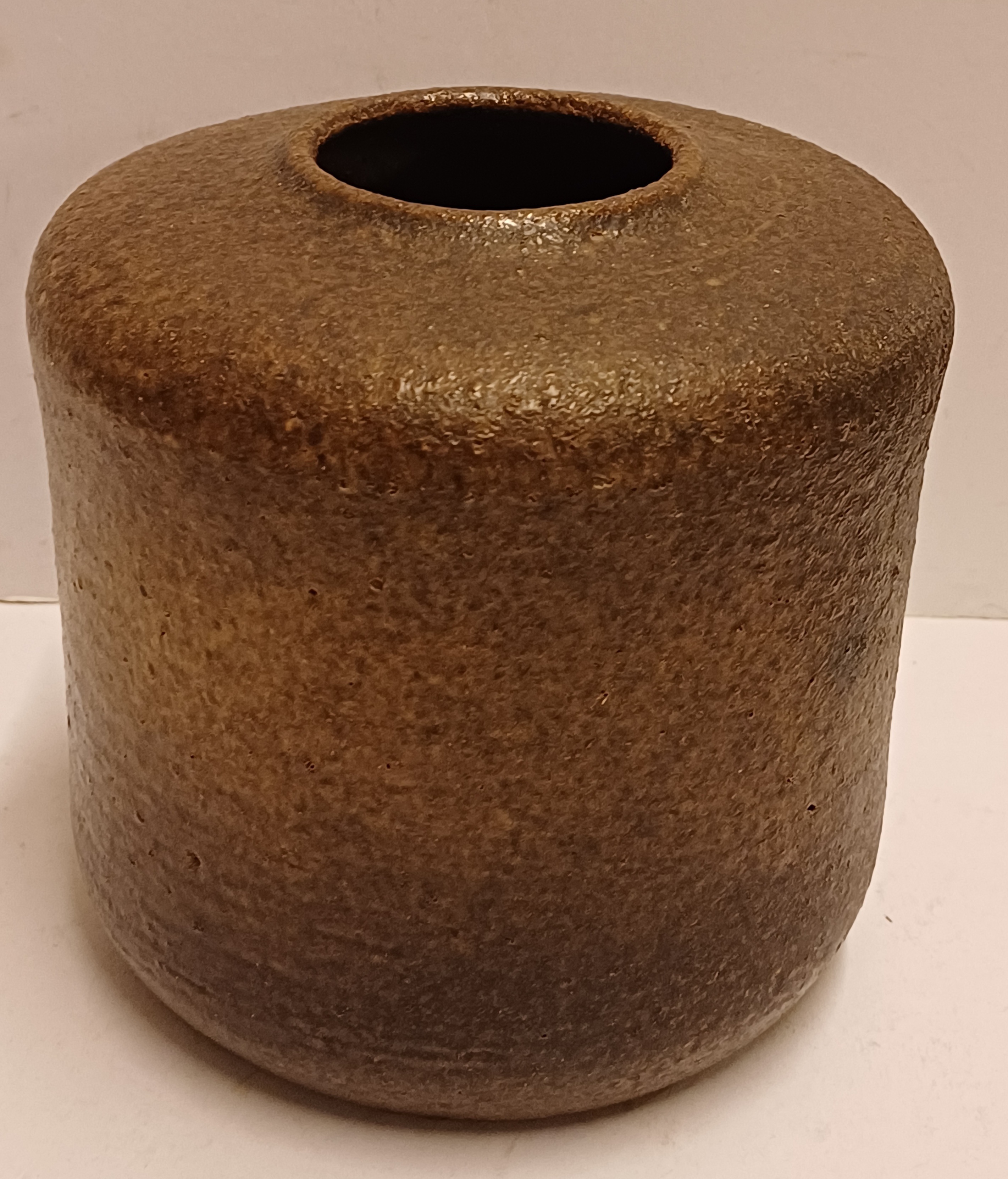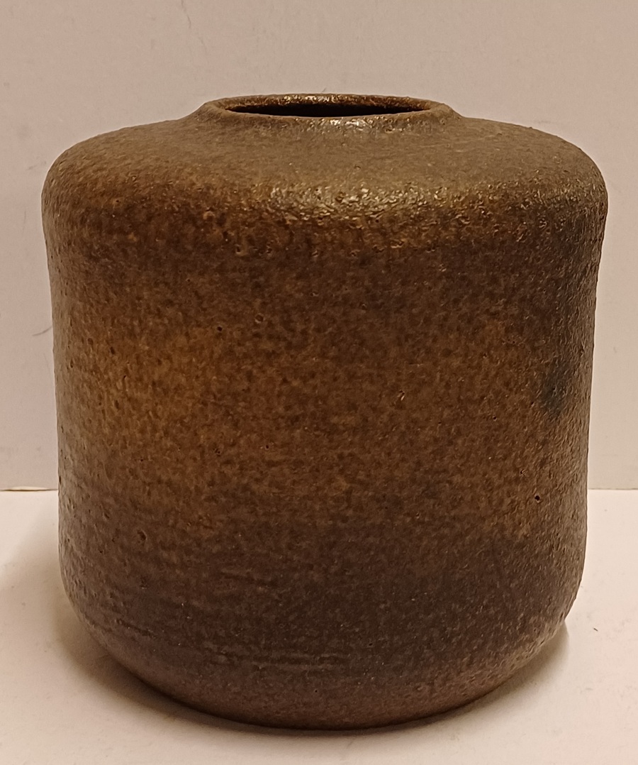 Vase cylindrique avec un glaçure rugueuse de couleur brun foncé. Base avec marque de fabrique.