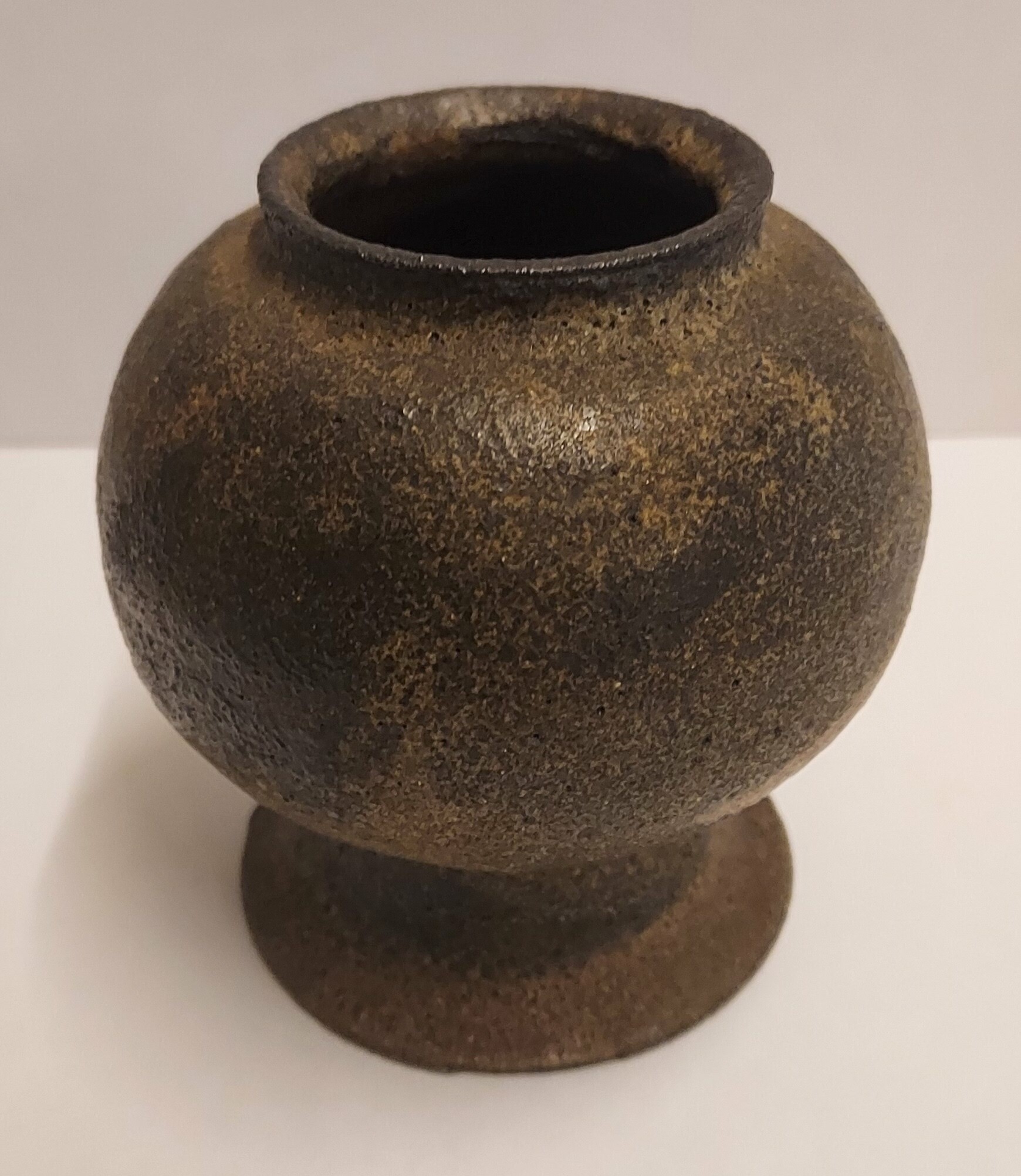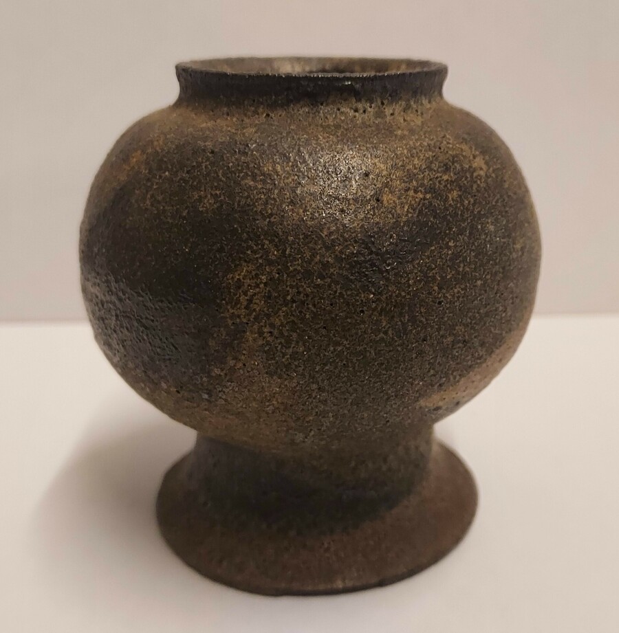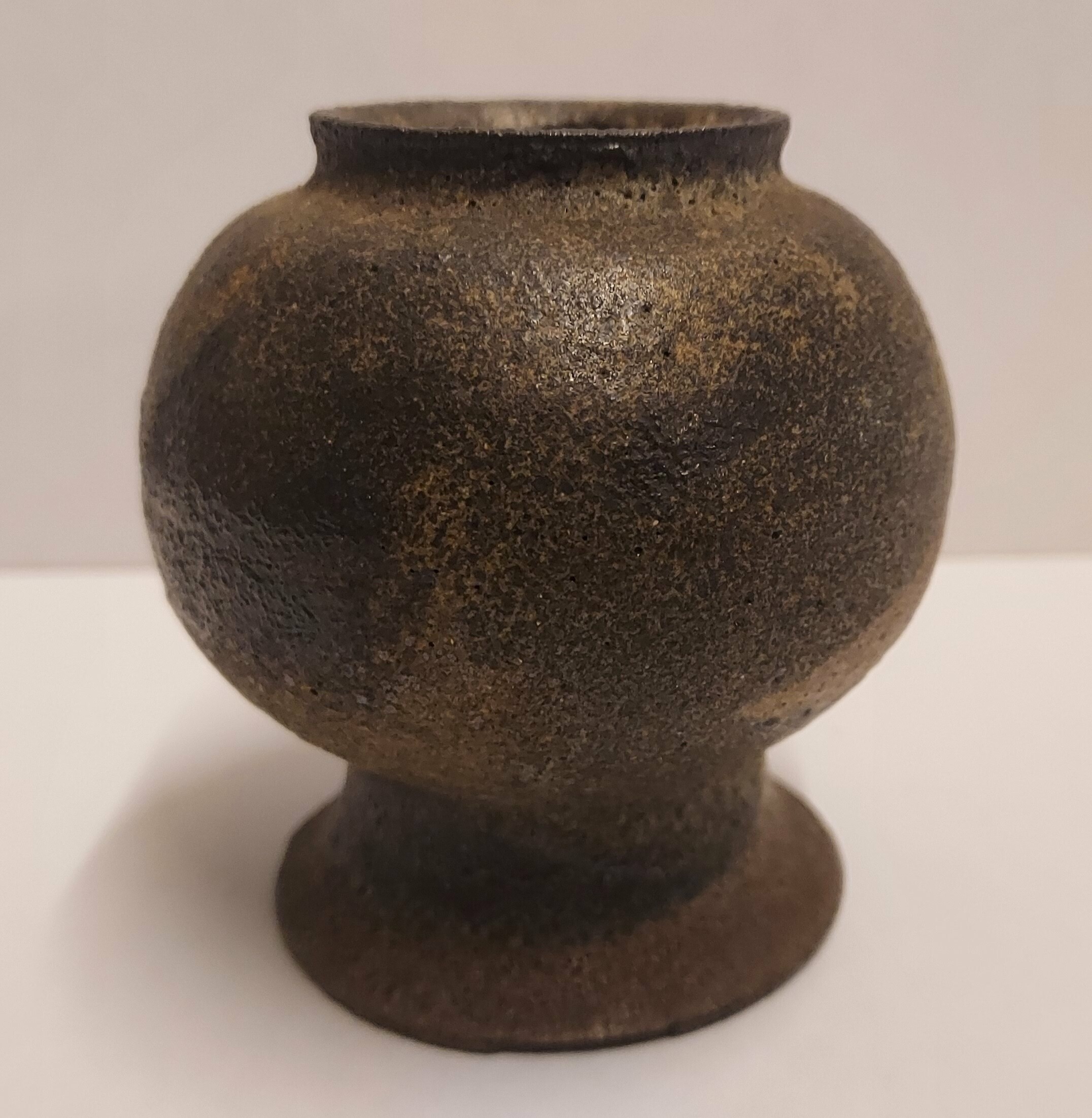 Pot en terre cuite tourné de forme sphérique avec glaçure foncée. Réalisé dans son propre atelier, gravé au revers J van Loon 60. Ex Collection J.W.N. van Agterbergh.