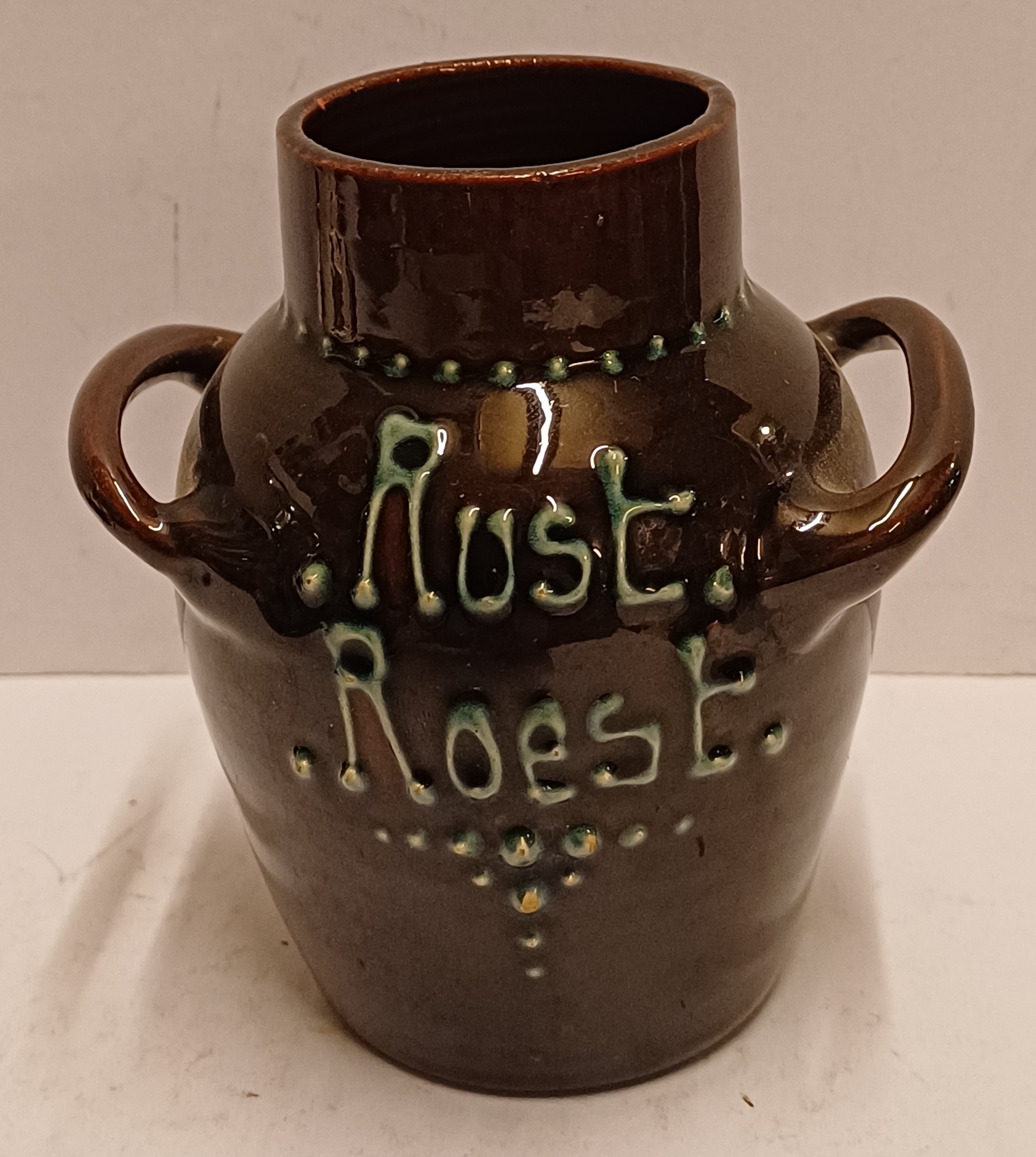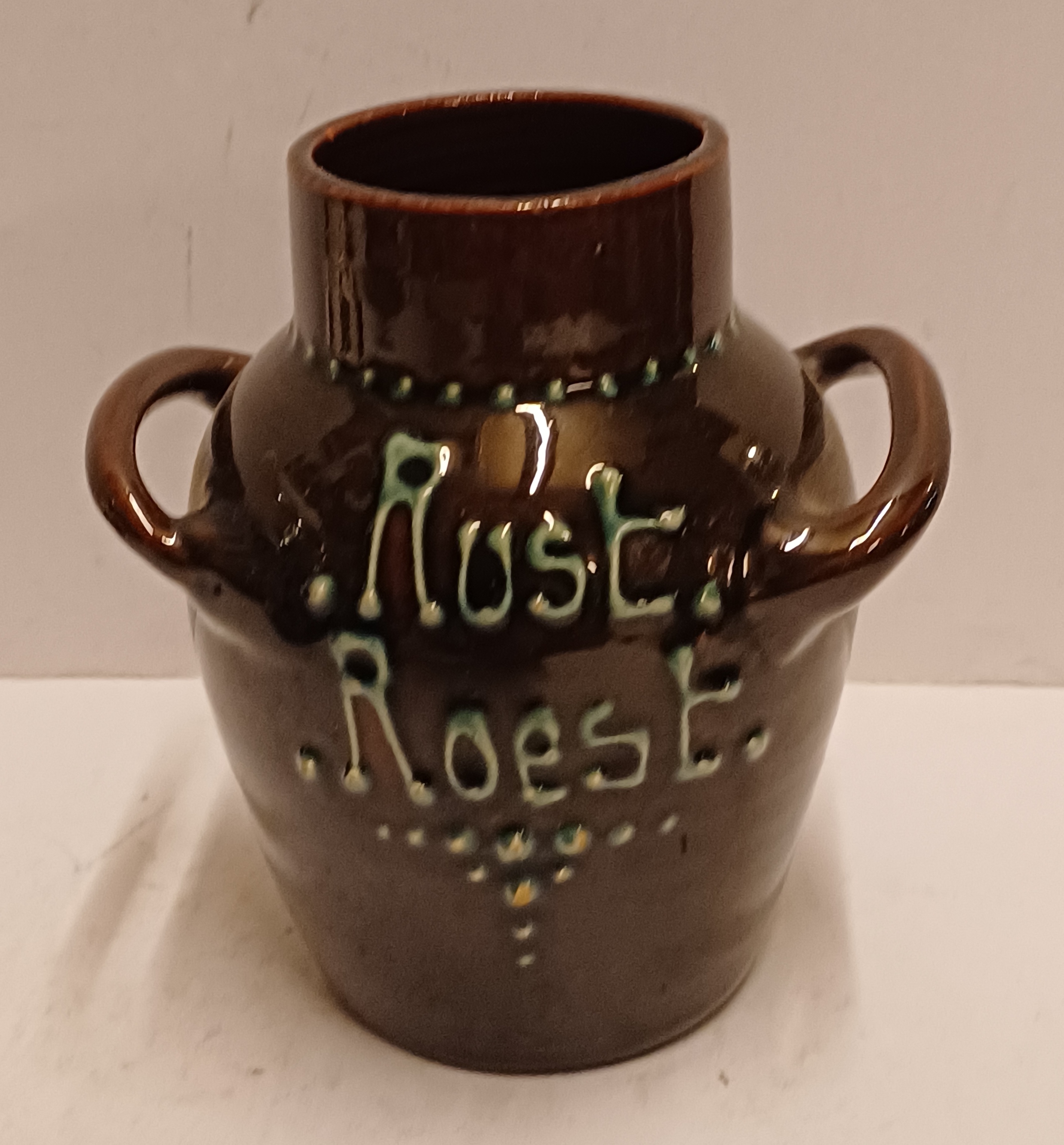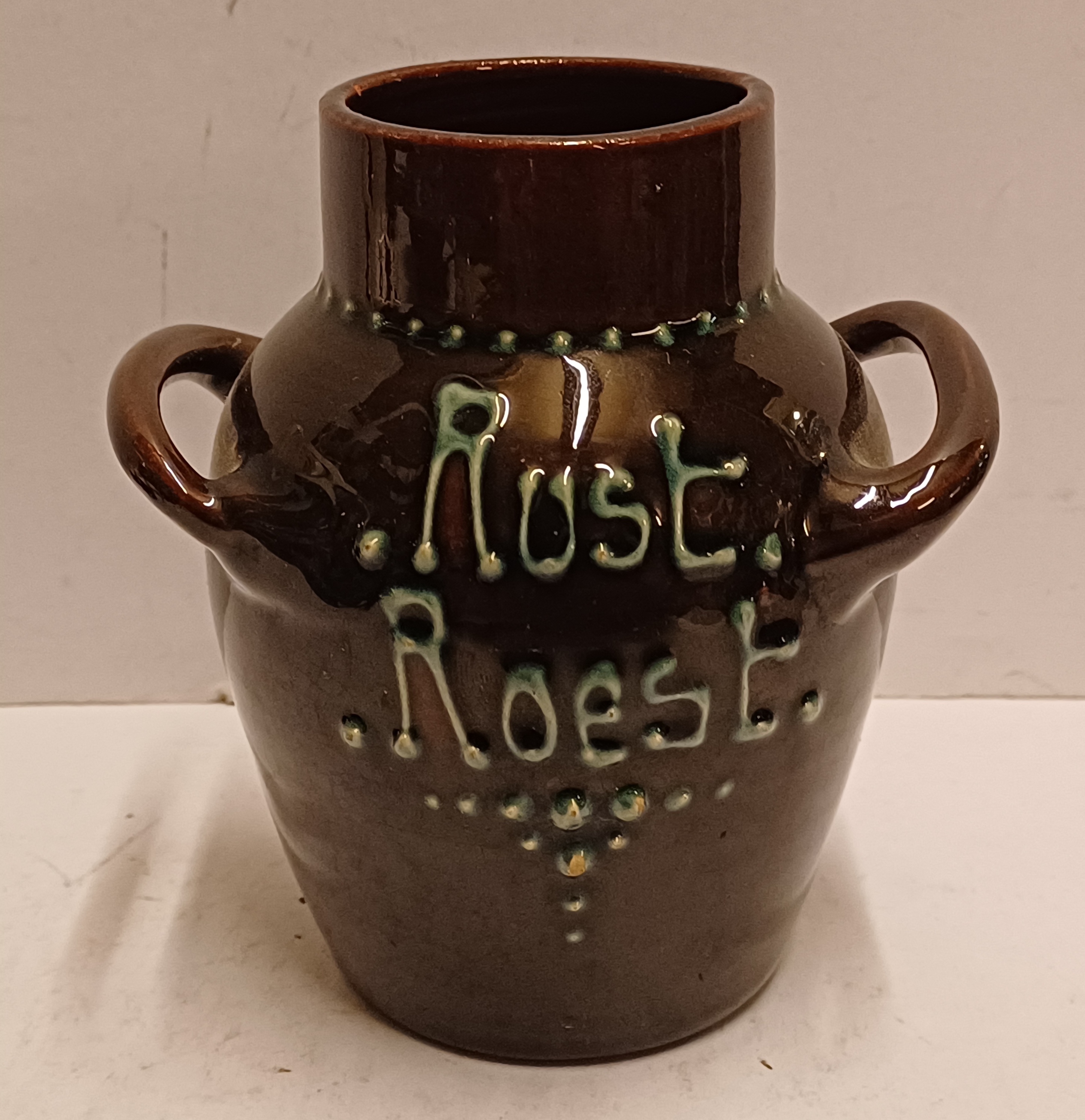 Vase en terre cuite avec deux anses, décoré à la barbotine et portant l'inscription "Rust roest". Non signé, probablement de Katwijk ou Brouwer.