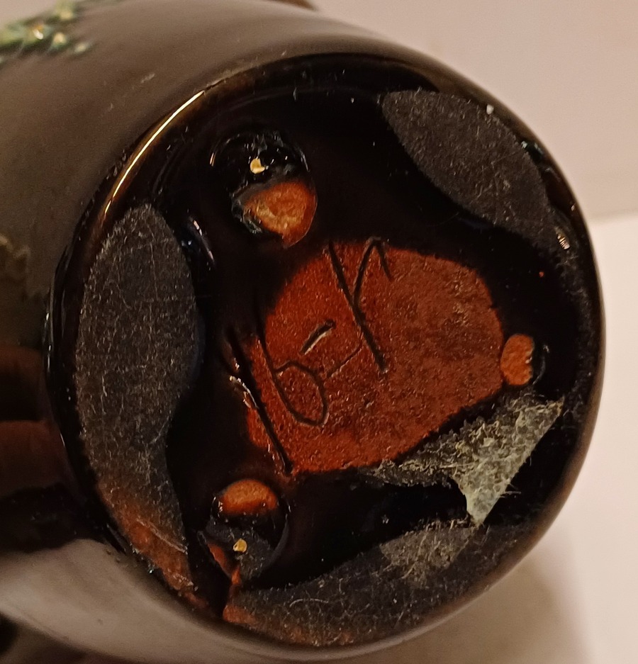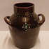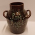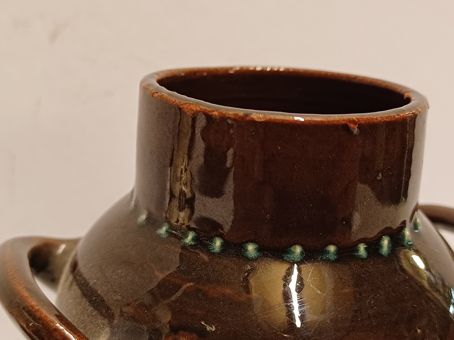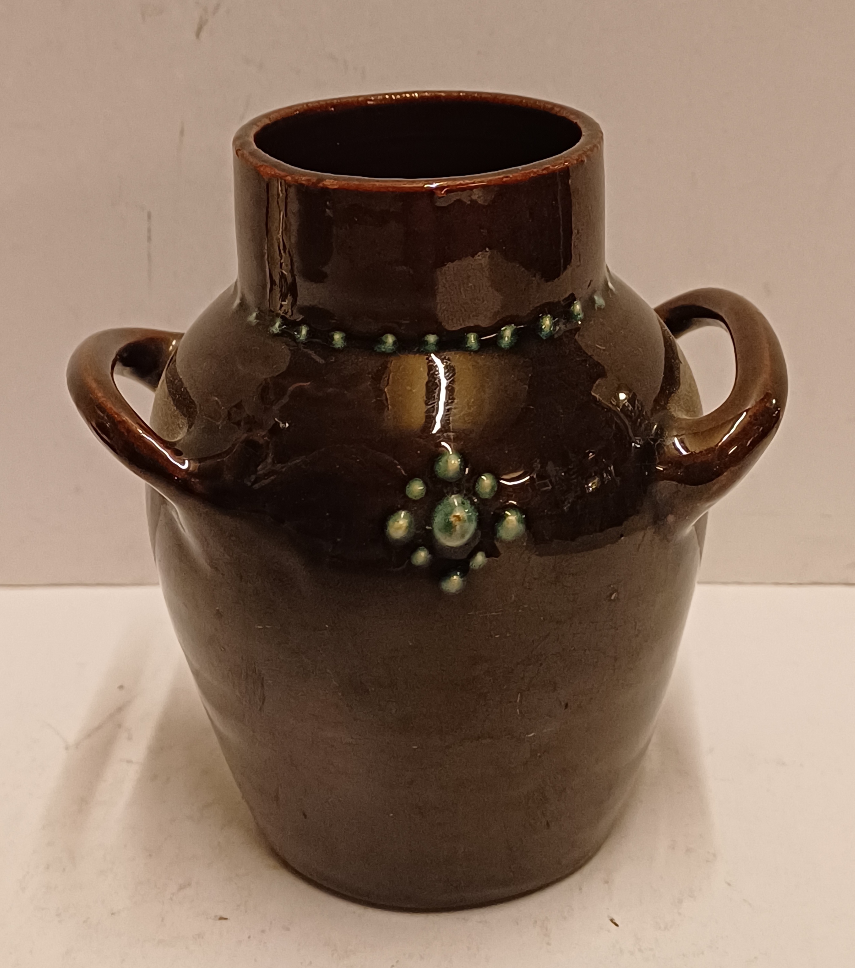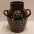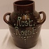 Vase en terre cuite avec deux anses, décoré à la barbotine et portant l'inscription "Rust roest". Non signé, probablement de Katwijk ou Brouwer.