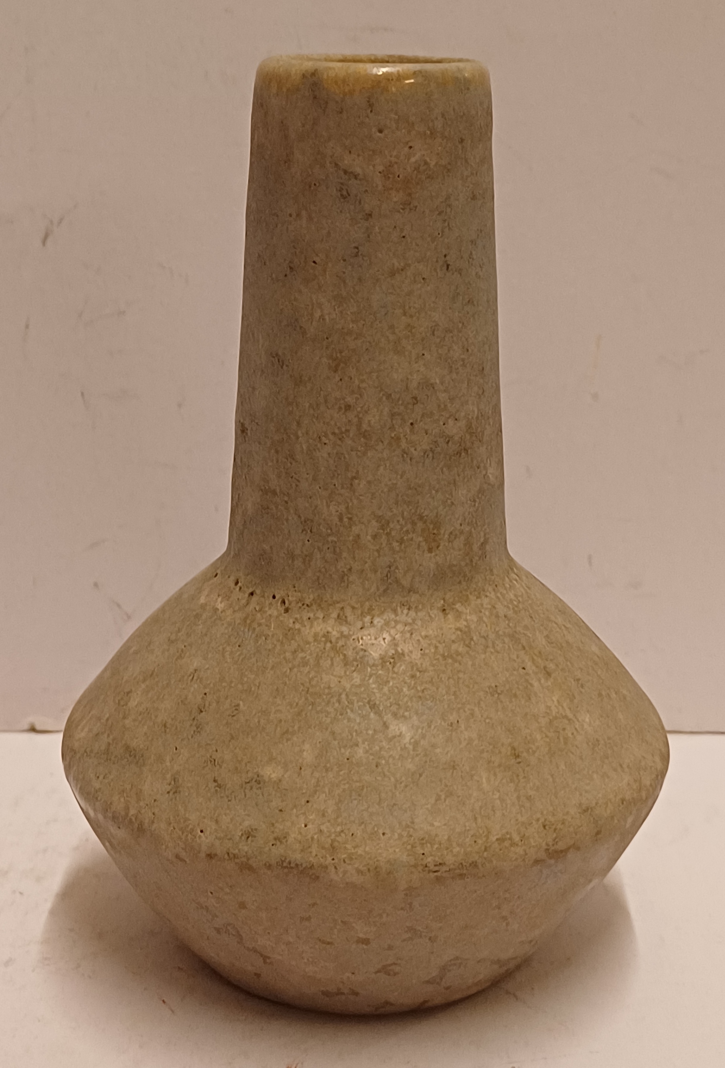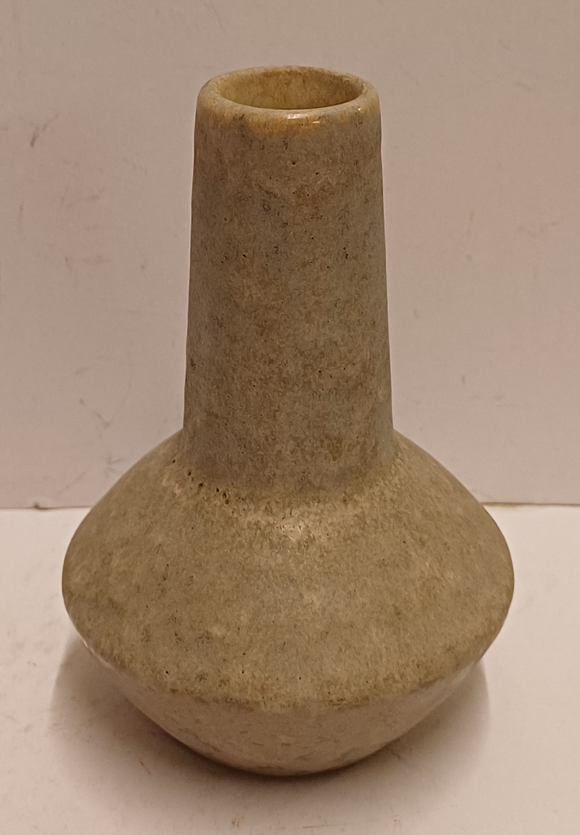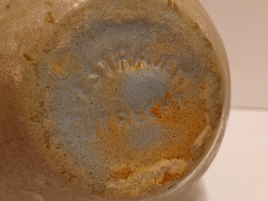 Aardewerken vaasje met grijzige glazuur. Onderzijde gestempeld merk.