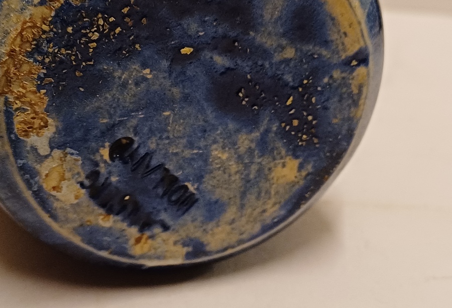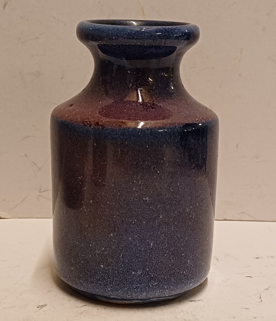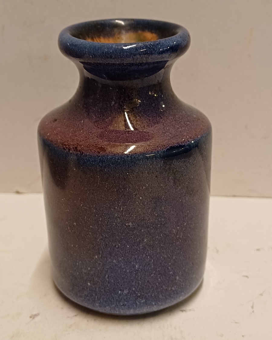 Klein vaasje met rood blauwe glazuur. Onderzijde gemerkt.