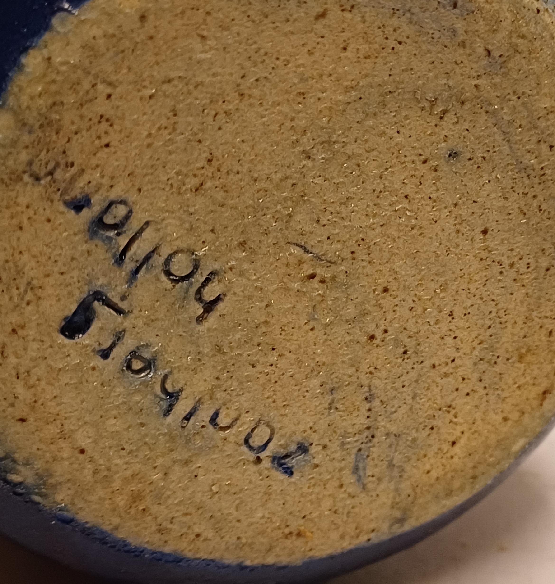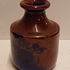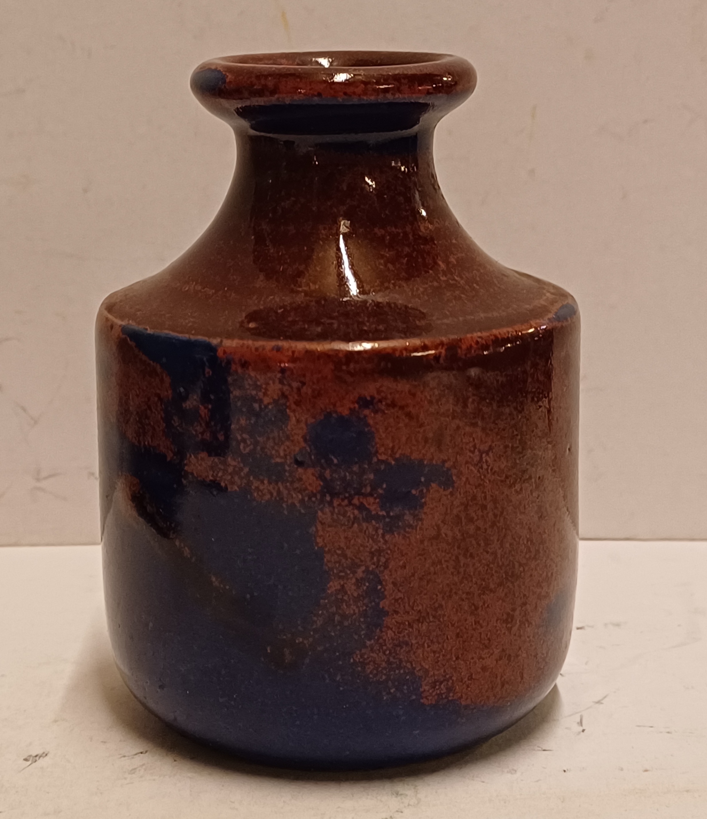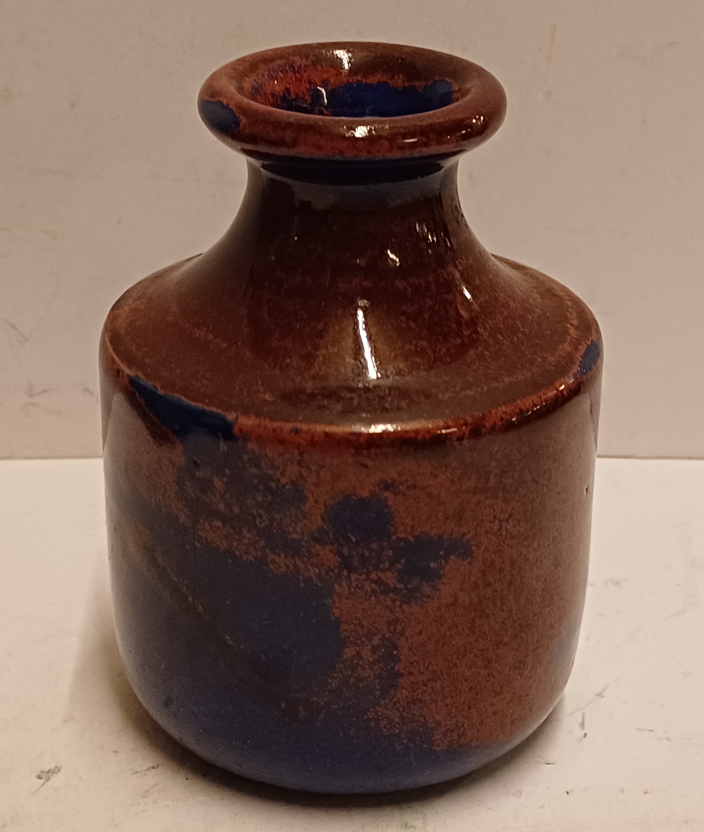 Klein vaasje met rood blauwe glazuur. Onderzijde gemerkt