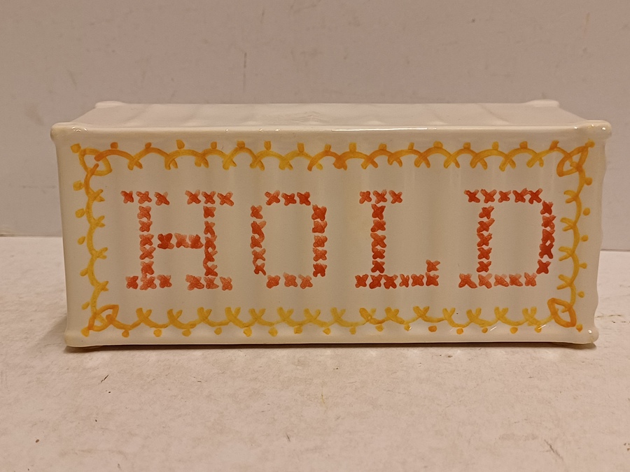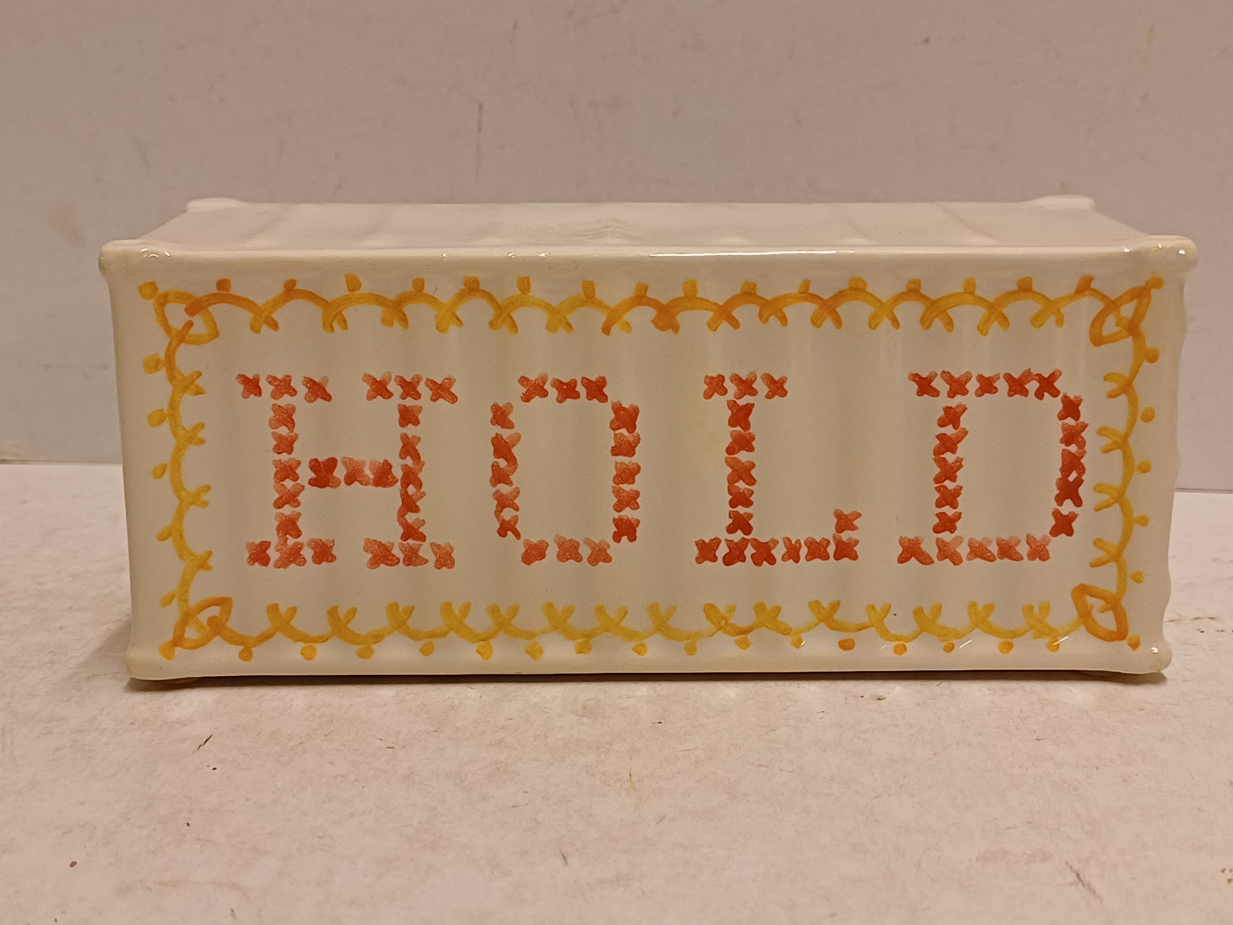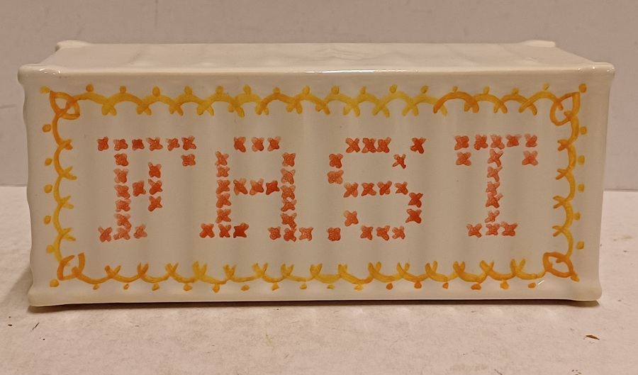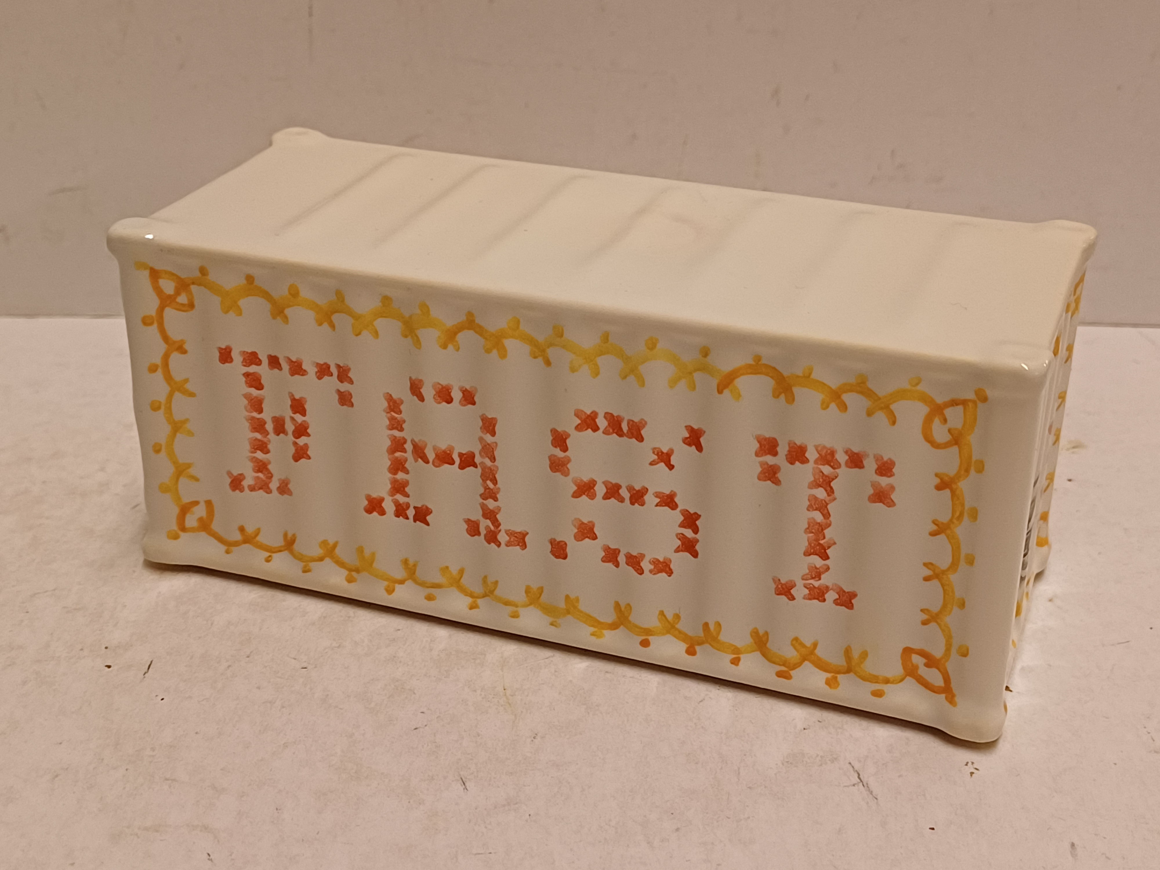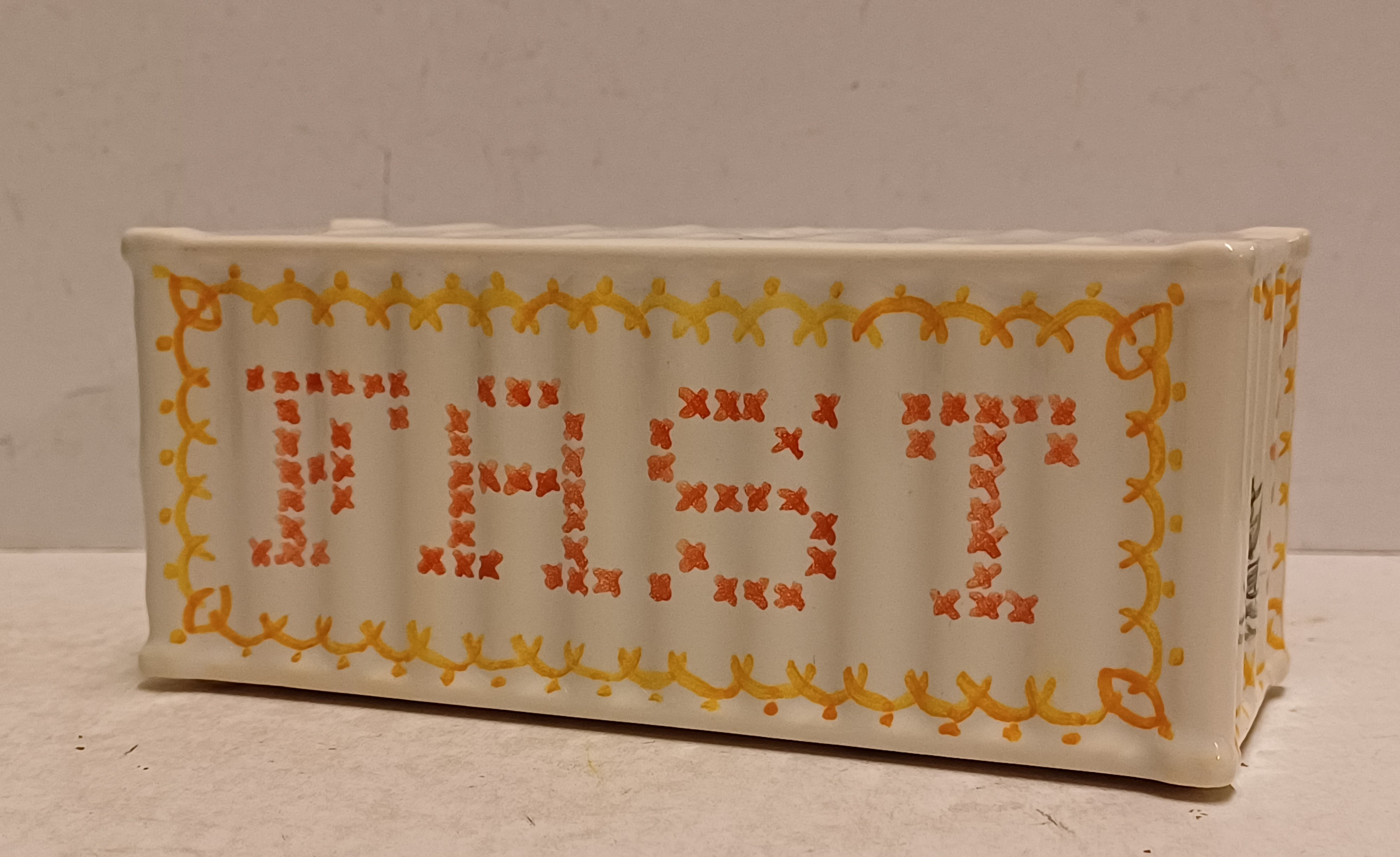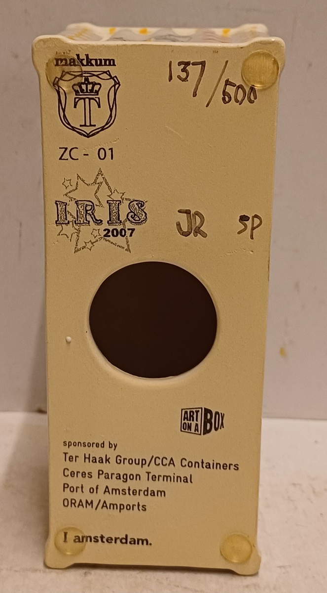 Aardewerken miniatuur van een zeecontainer, met decoratie naar ontwerp van Arno Coenen, vervaardigd tijdens het 'Art-on-a-Box' project van Haven Amsterdam. Uitvoering Makkum Tichelaar in opdracht van Ter Haak Group, CCA Containers Ceres Paragon Terminal Port of Amsterdam Oram Amports. Art on a Box Oplage 500 stuks dit is nr 137, uitvoering 2007.