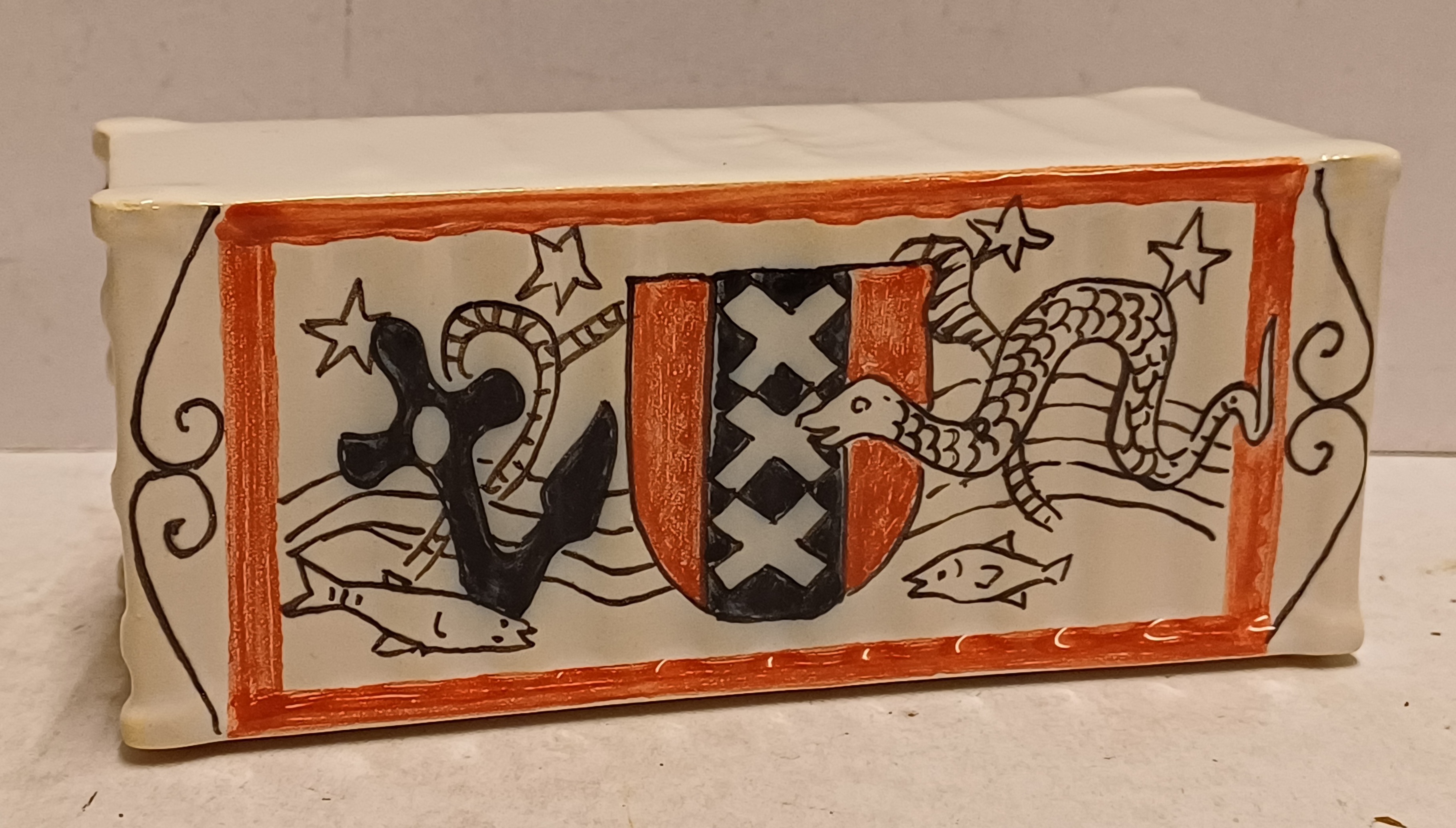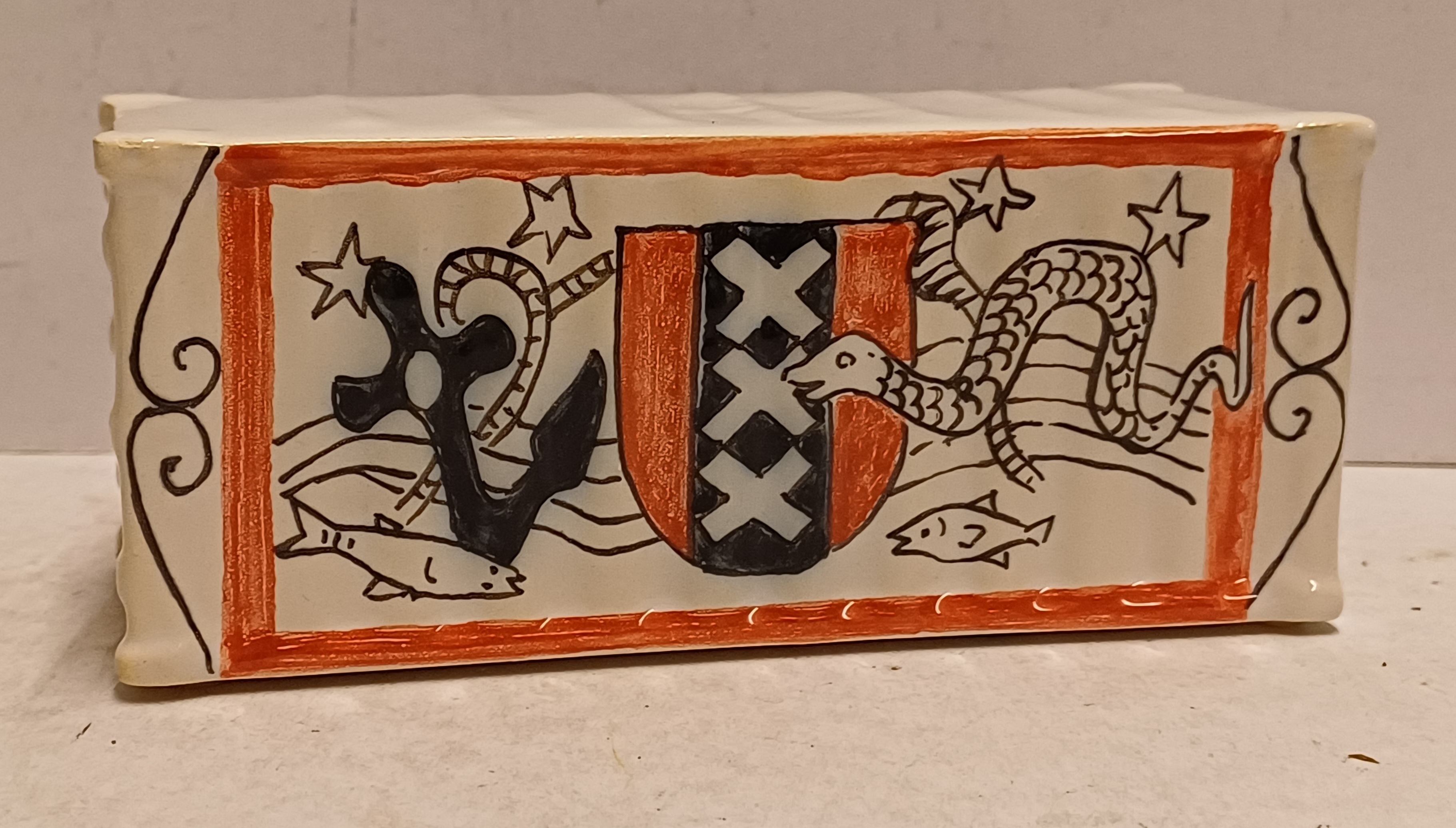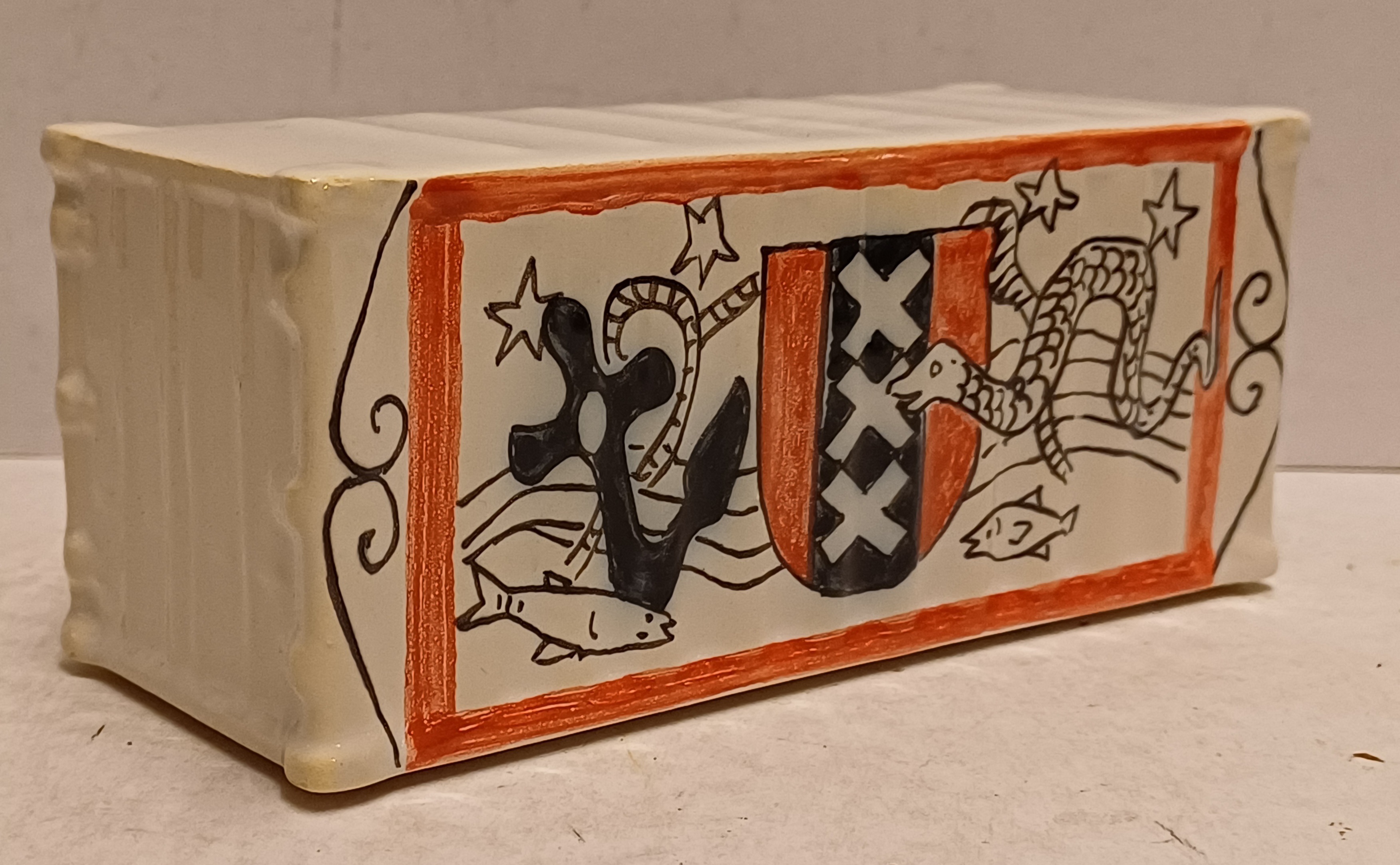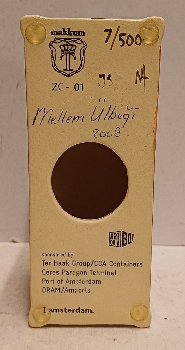 Aardewerken miniatuur van een zeecontainer, met decoratie naar ontwerp van Meltem Ulbegi, vervaardigd tijdens het 'Art-on-a-Box' project van Haven Amsterdam. Uitvoering Makkum Tichelaar in opdracht van Ter Haak Group, CCA Containers Ceres Paragon Terminal Port of Amsterdam Oram Amports. Art on a Box Oplage 500 stuks dit is nr 7, uitvoering 2008.