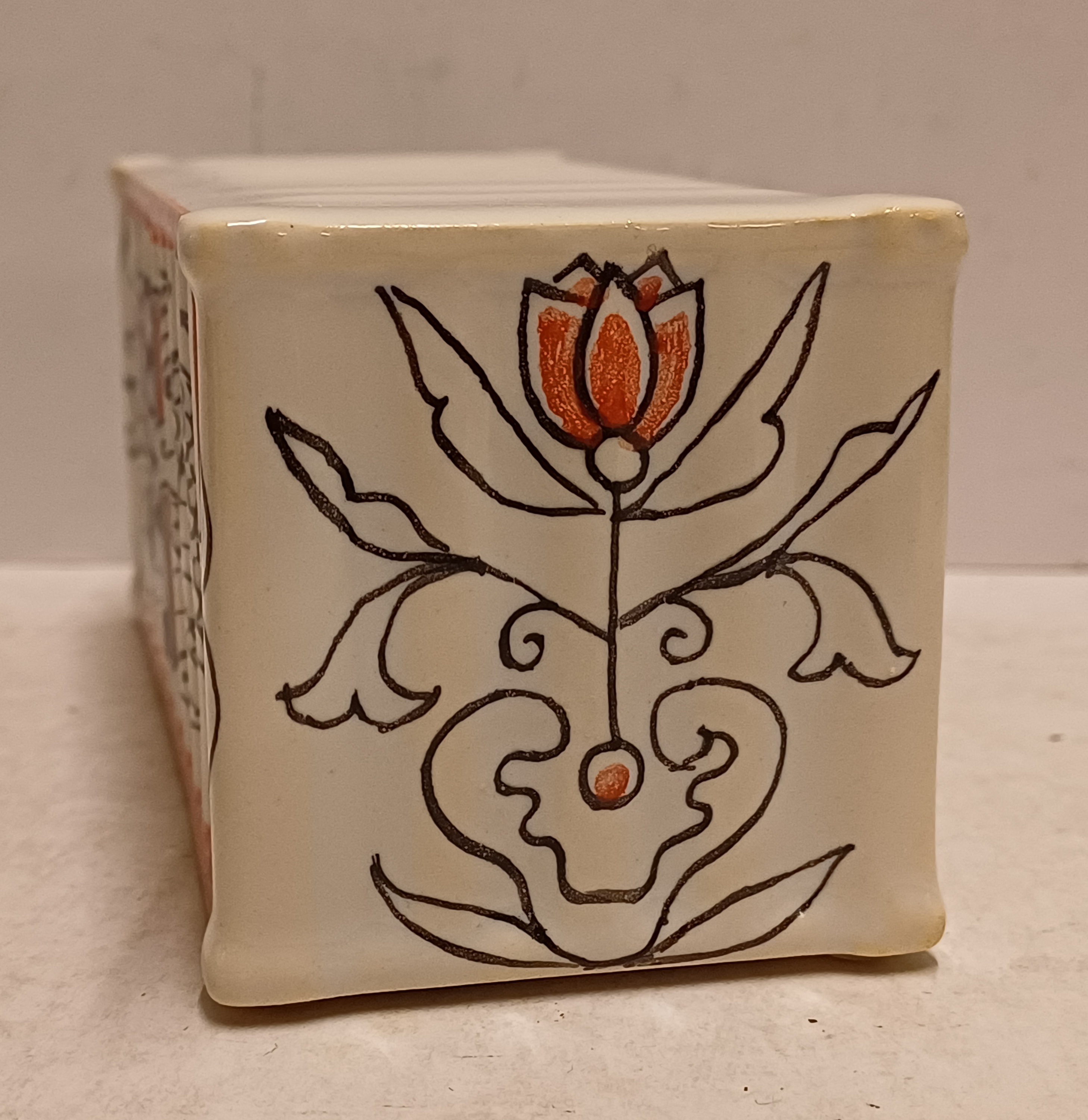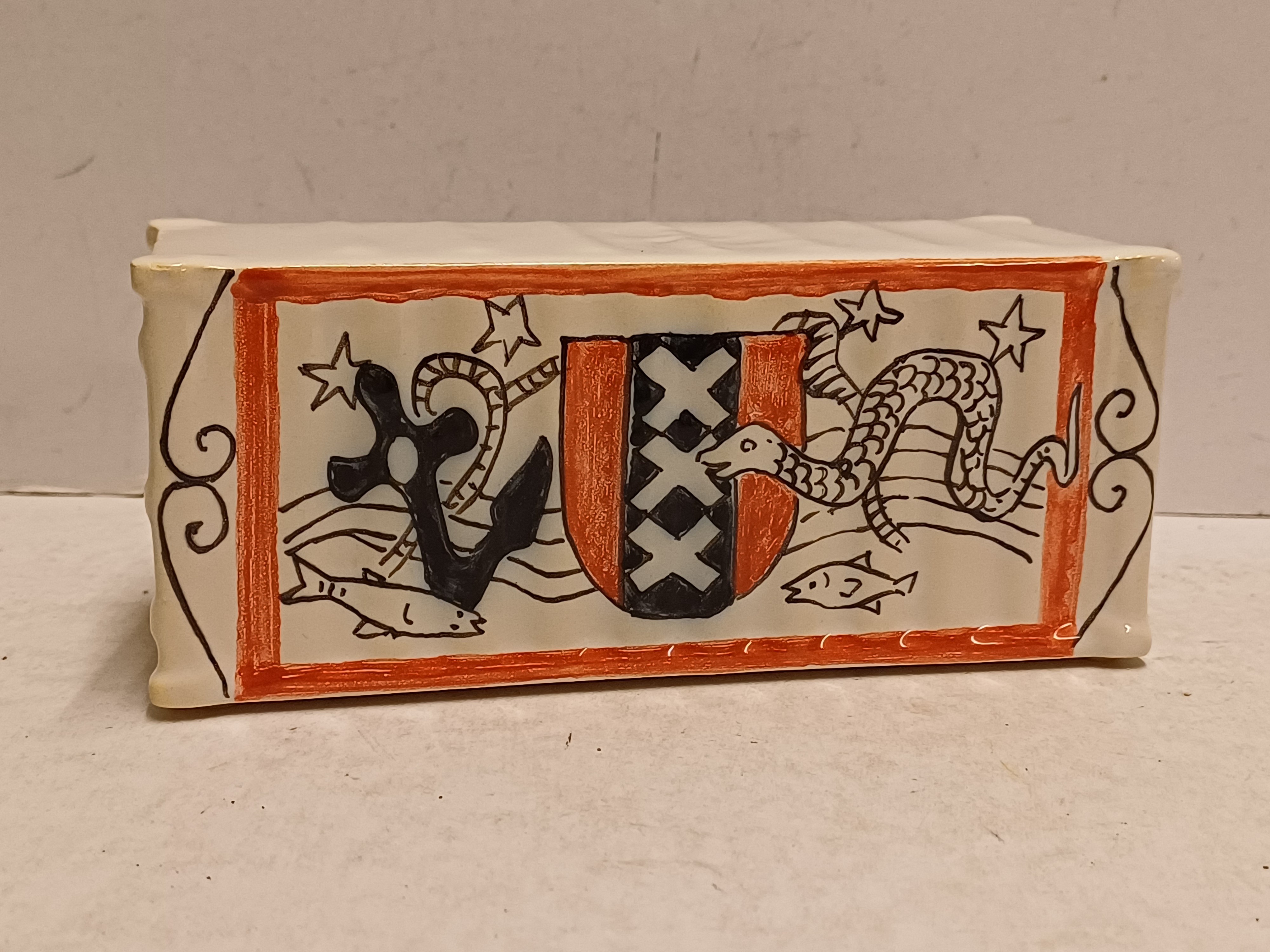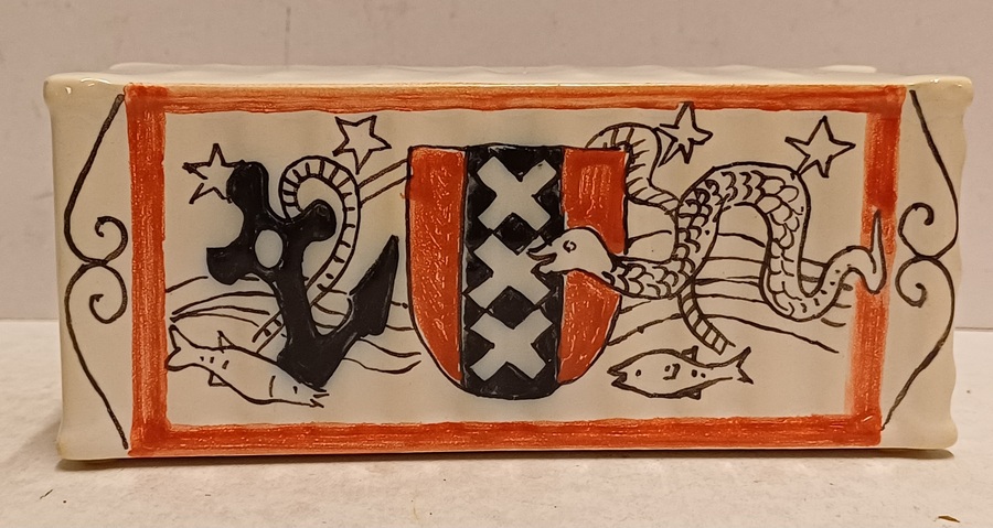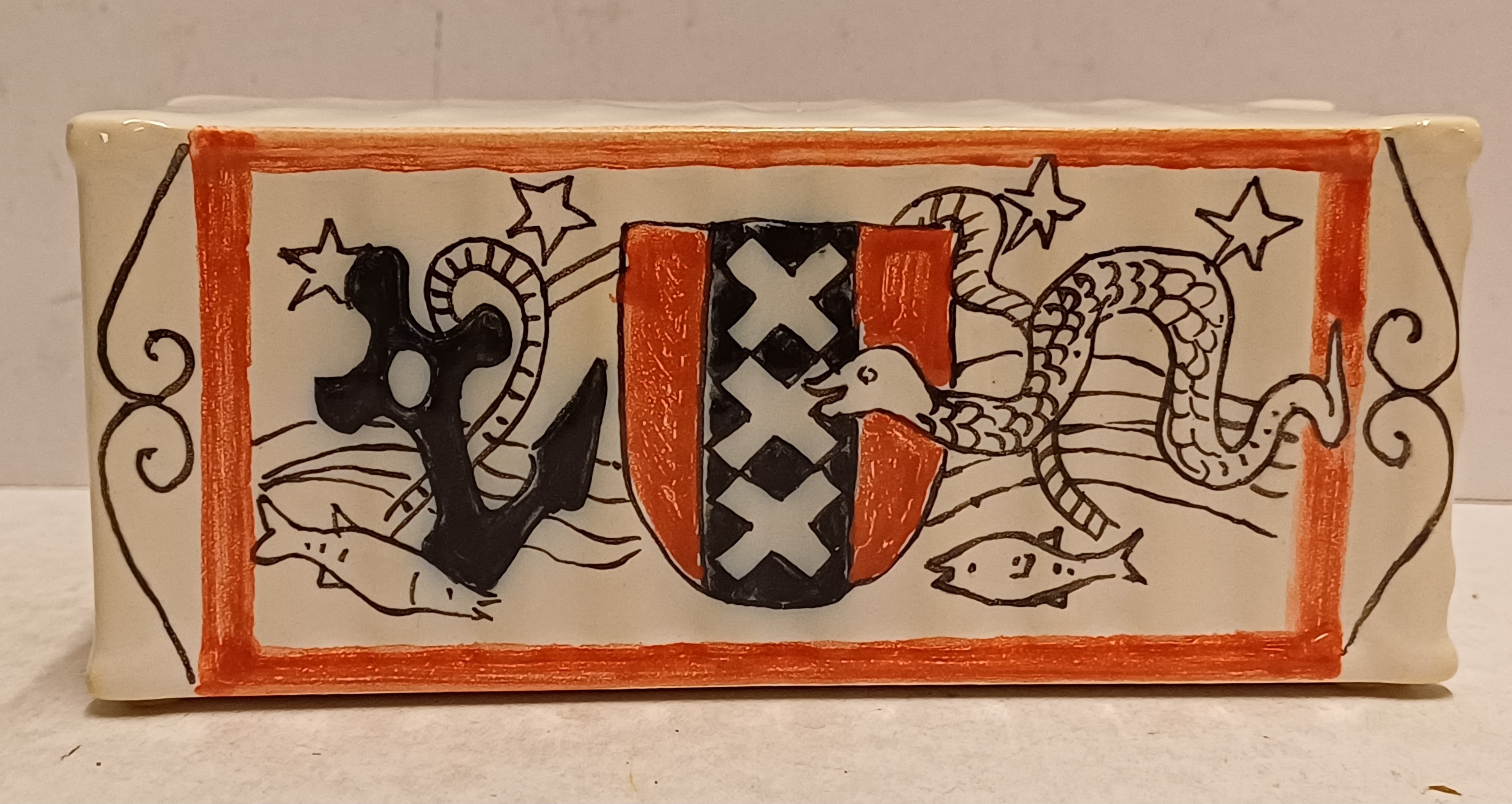 Aardewerken miniatuur van een zeecontainer, met decoratie naar ontwerp van Meltem Ulbegi, vervaardigd tijdens het 'Art-on-a-Box' project van Haven Amsterdam. Uitvoering Makkum Tichelaar in opdracht van Ter Haak Group, CCA Containers Ceres Paragon Terminal Port of Amsterdam Oram Amports. Art on a Box Oplage 500 stuks dit is nr 7, uitvoering 2008.