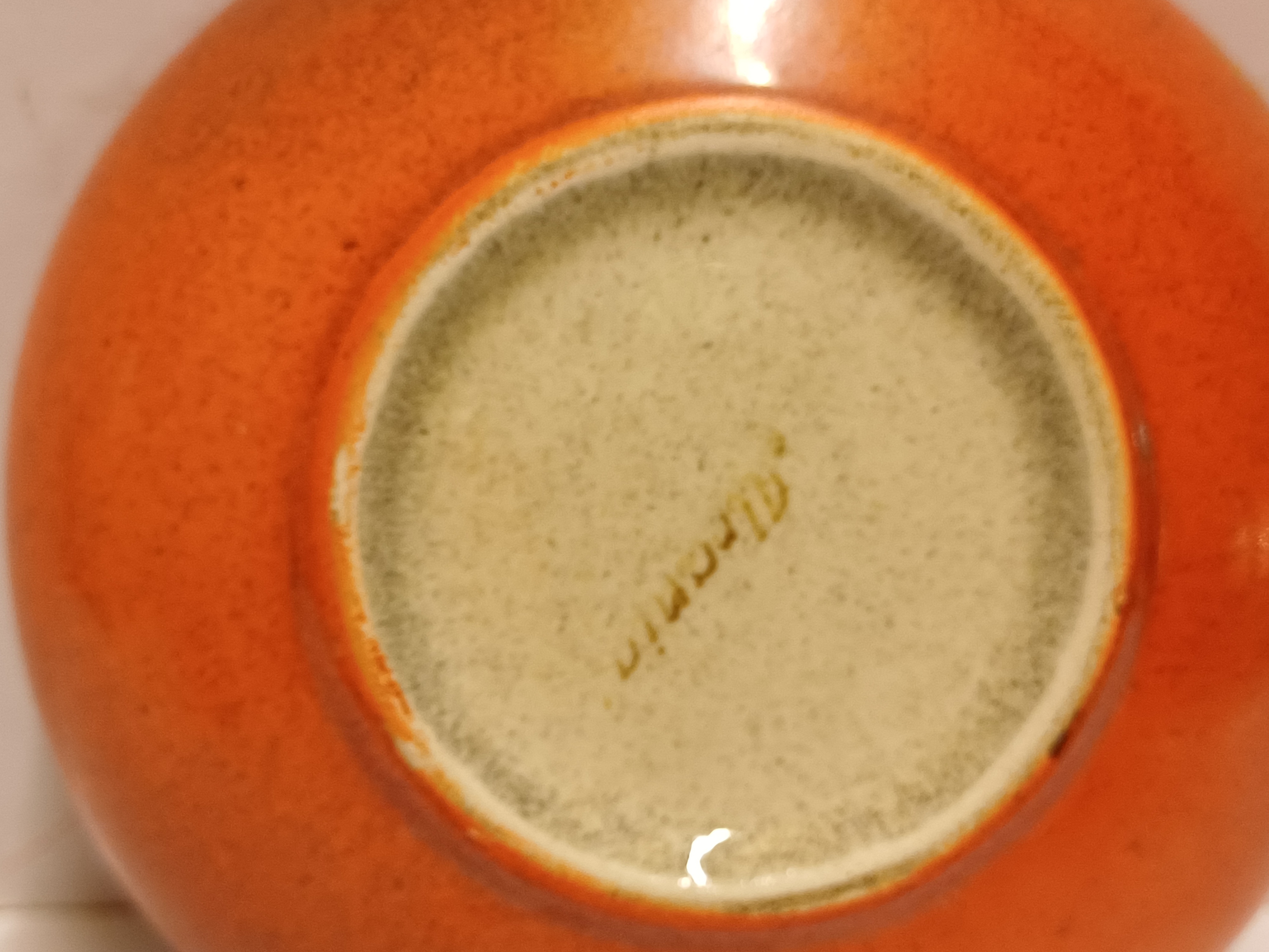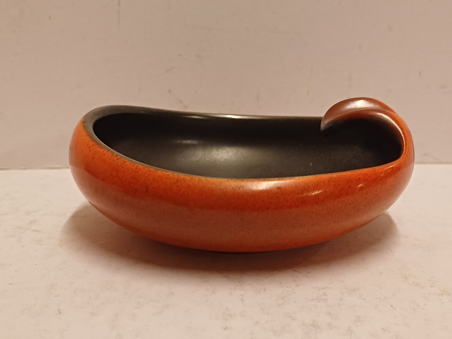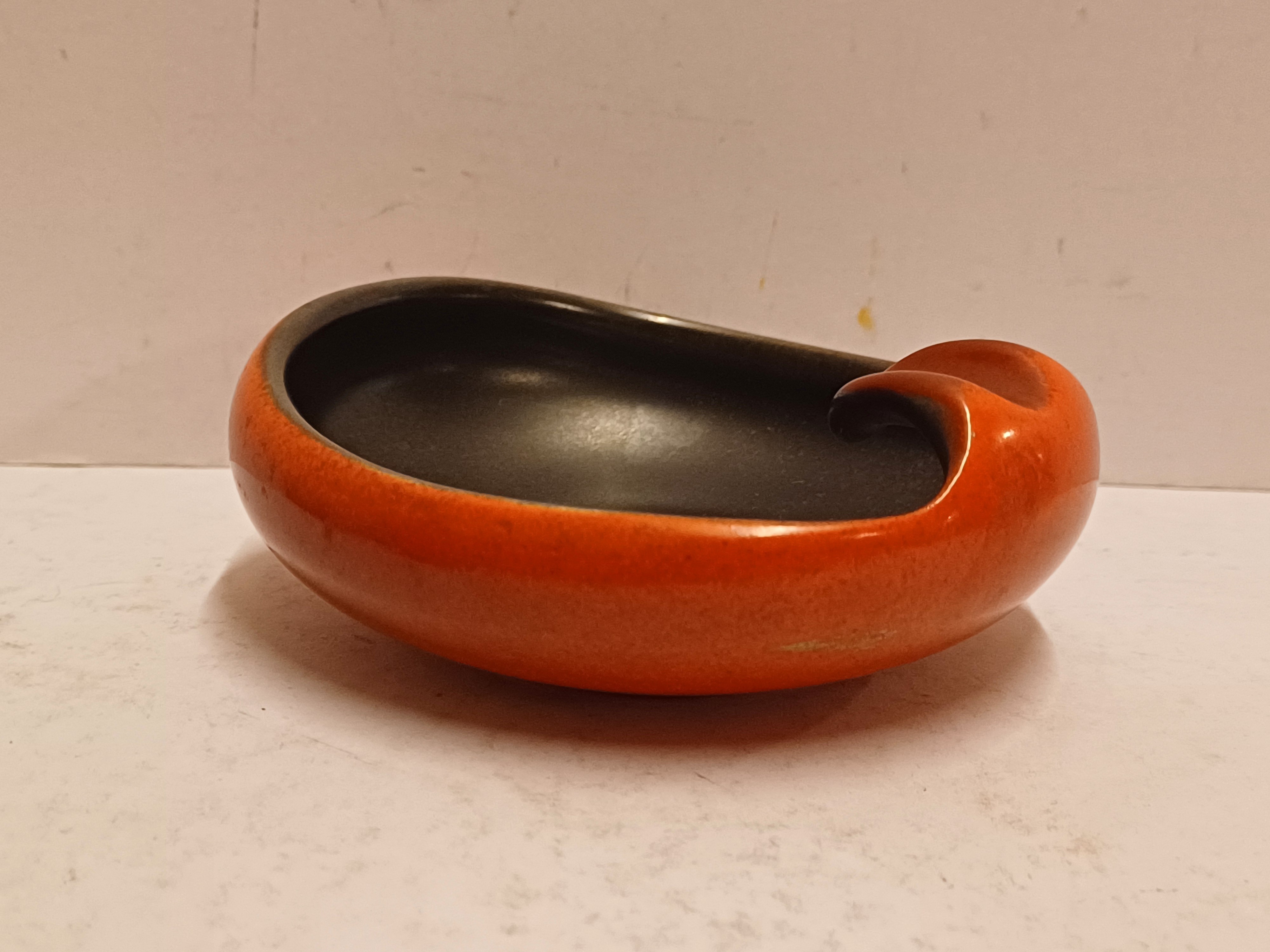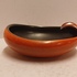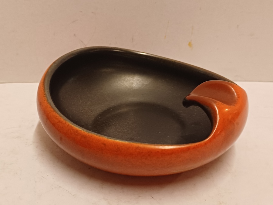 Asbak met rode spuitglazuur en zwarte binnenzijde. Decornaam Urania, onderzijde met fabrieksmerk
