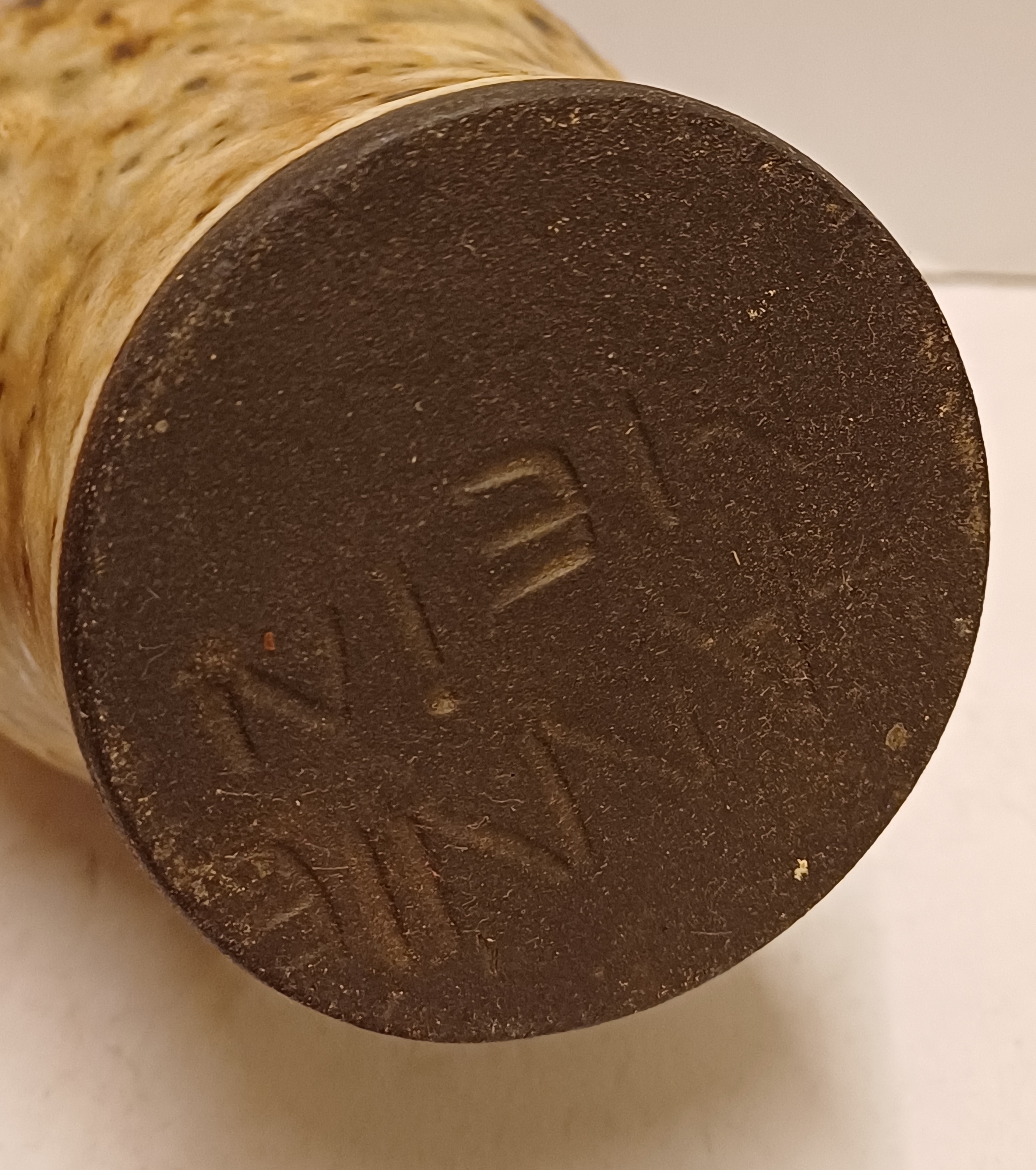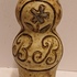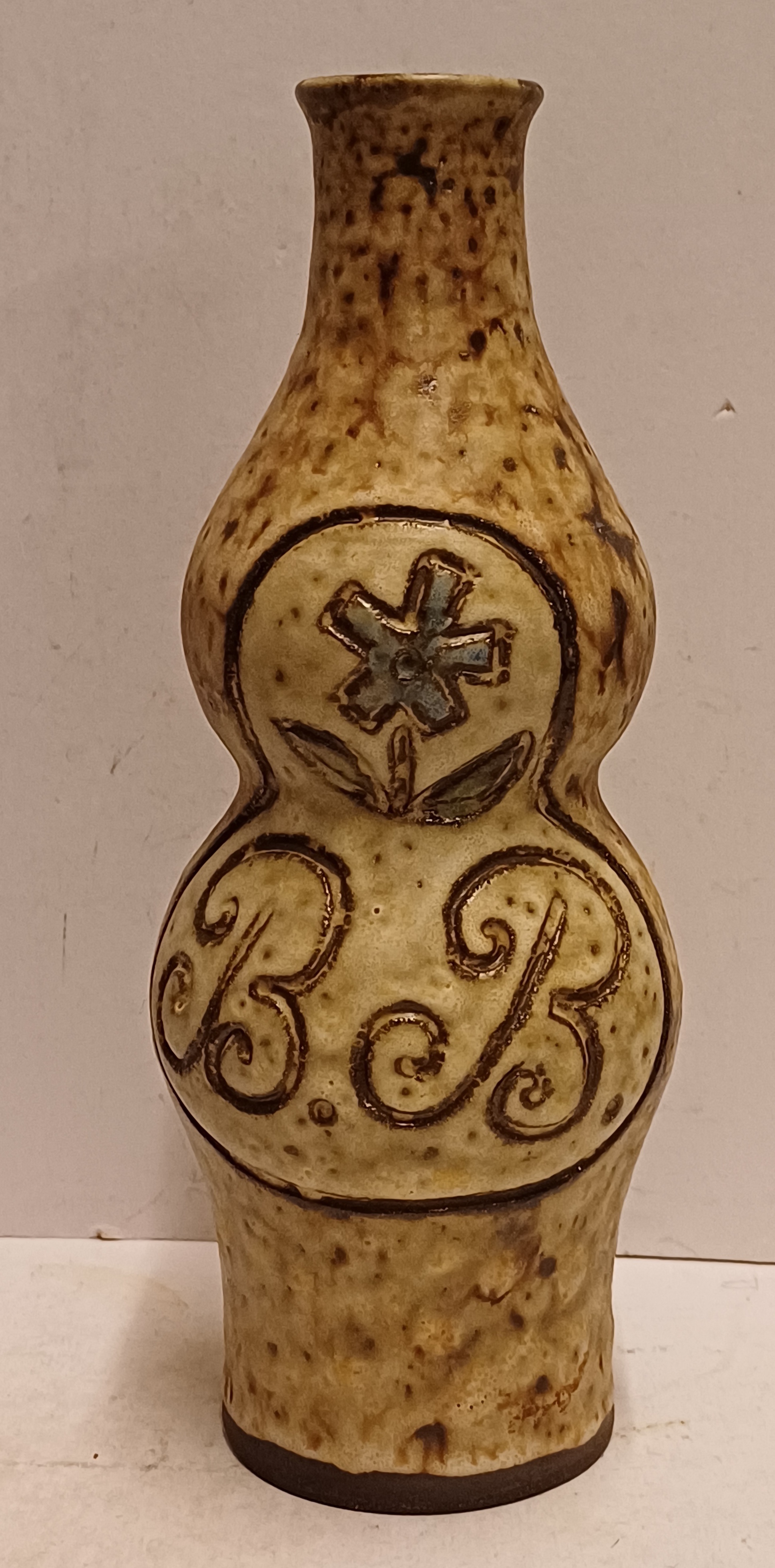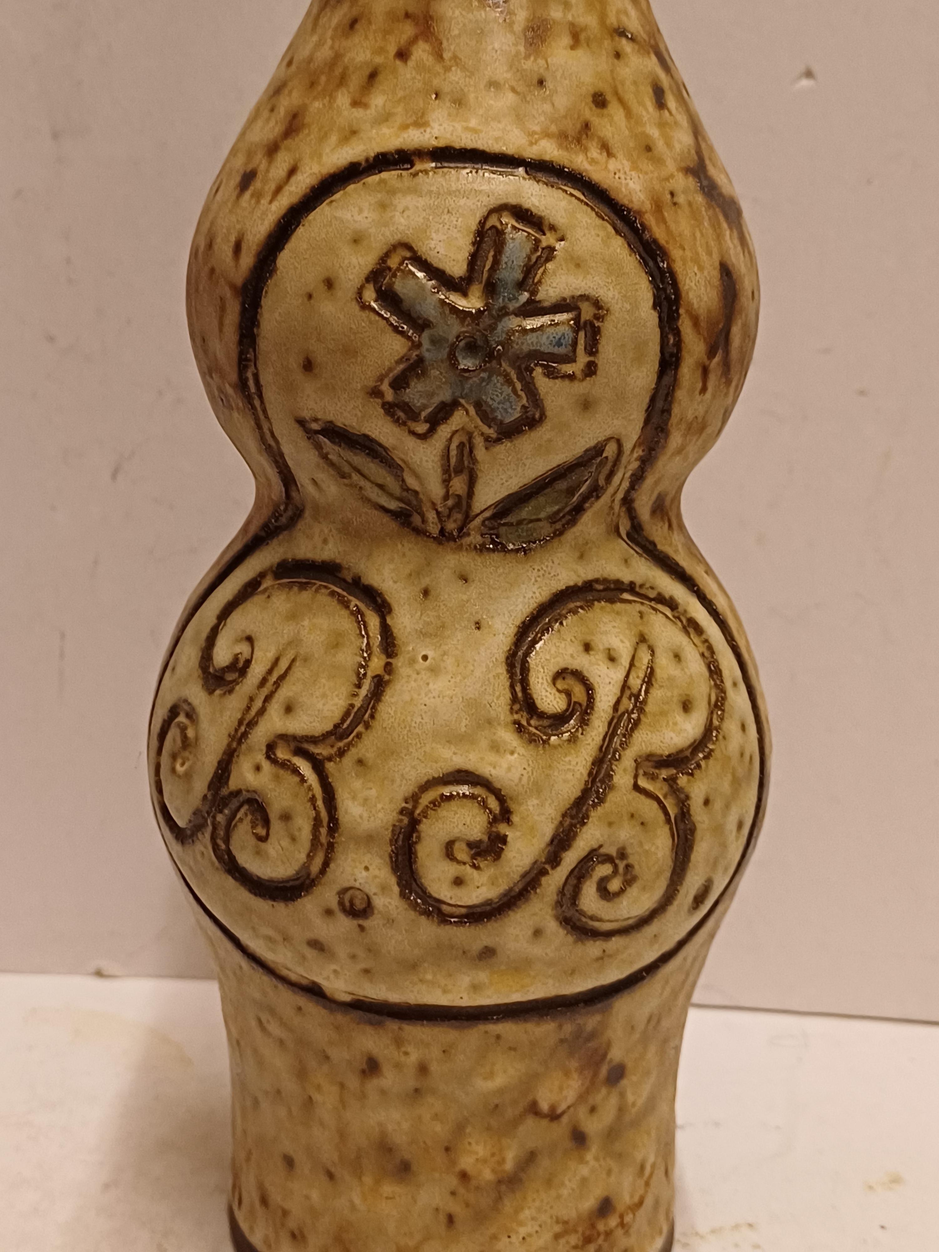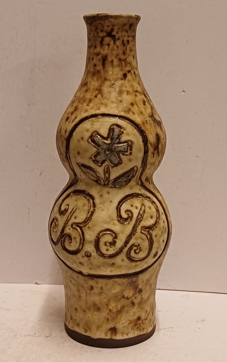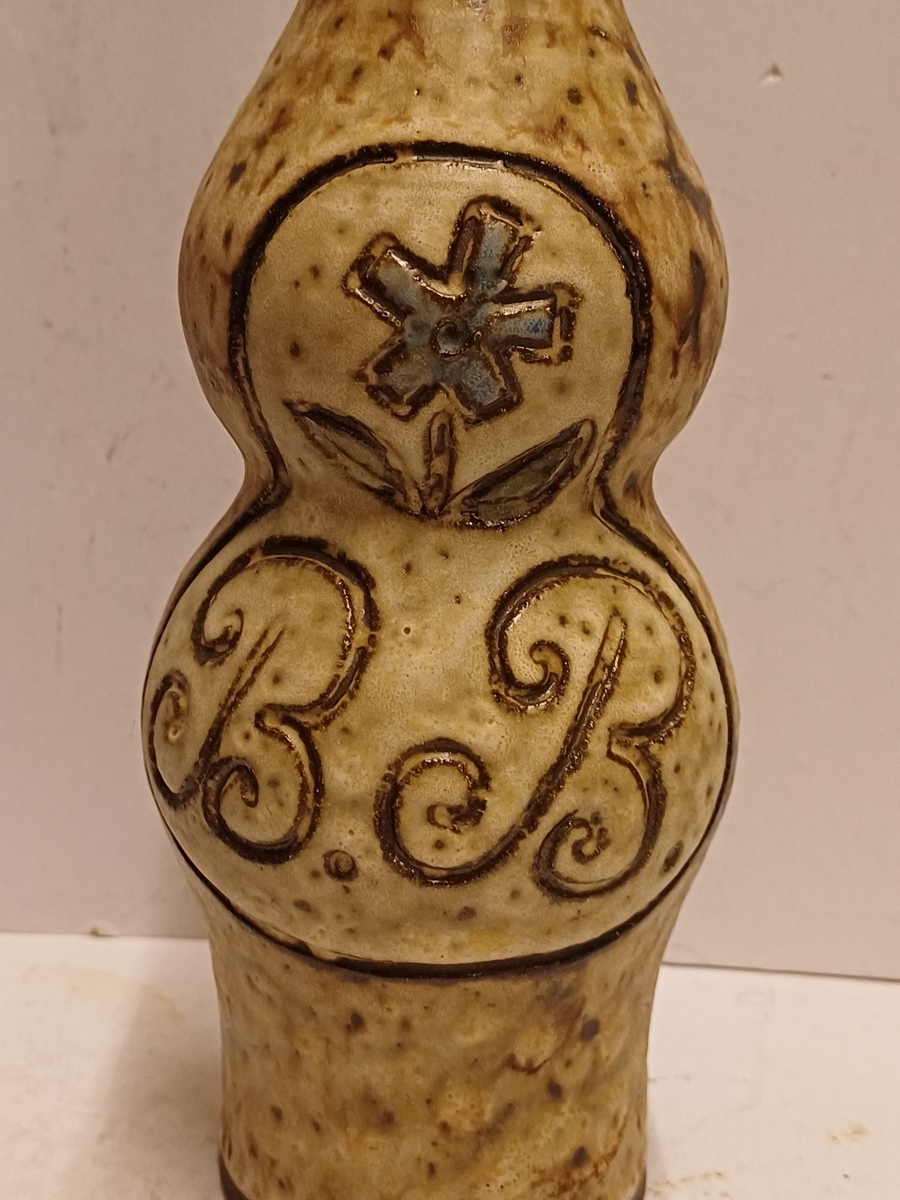 Aardewerken fles, met ingekraste decoratie van de letters BB met daarboven een bloem. Onderzijde gemerkt.