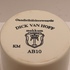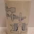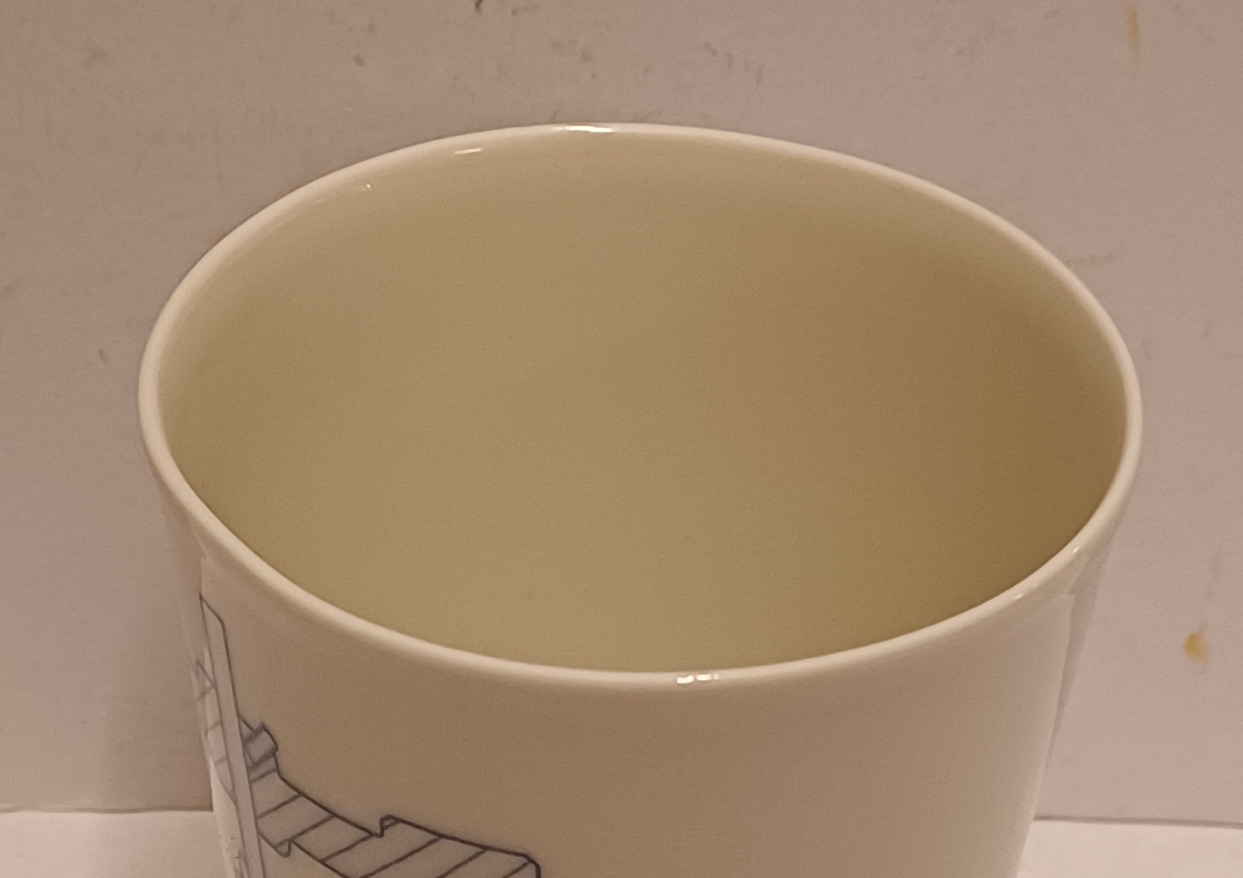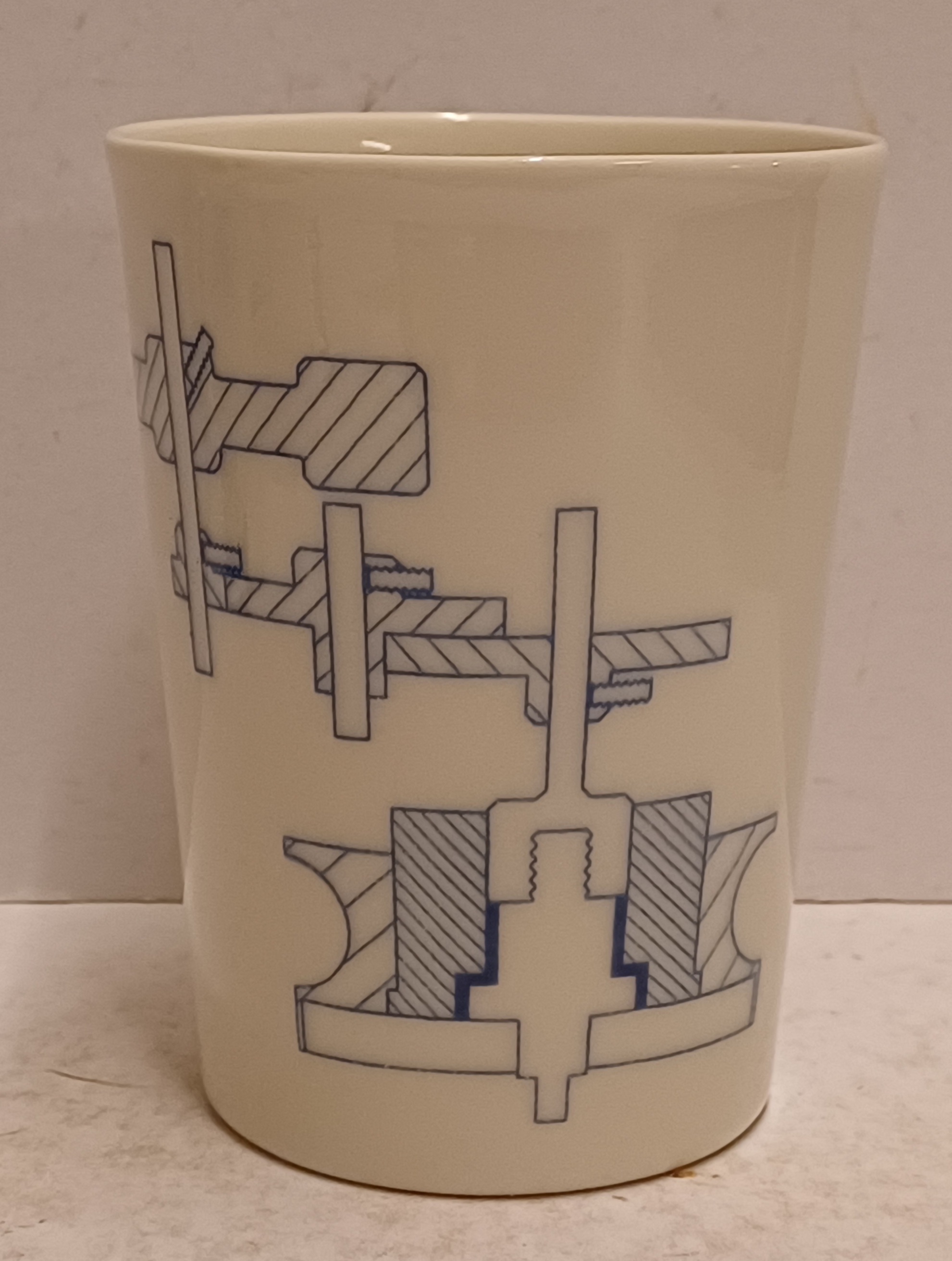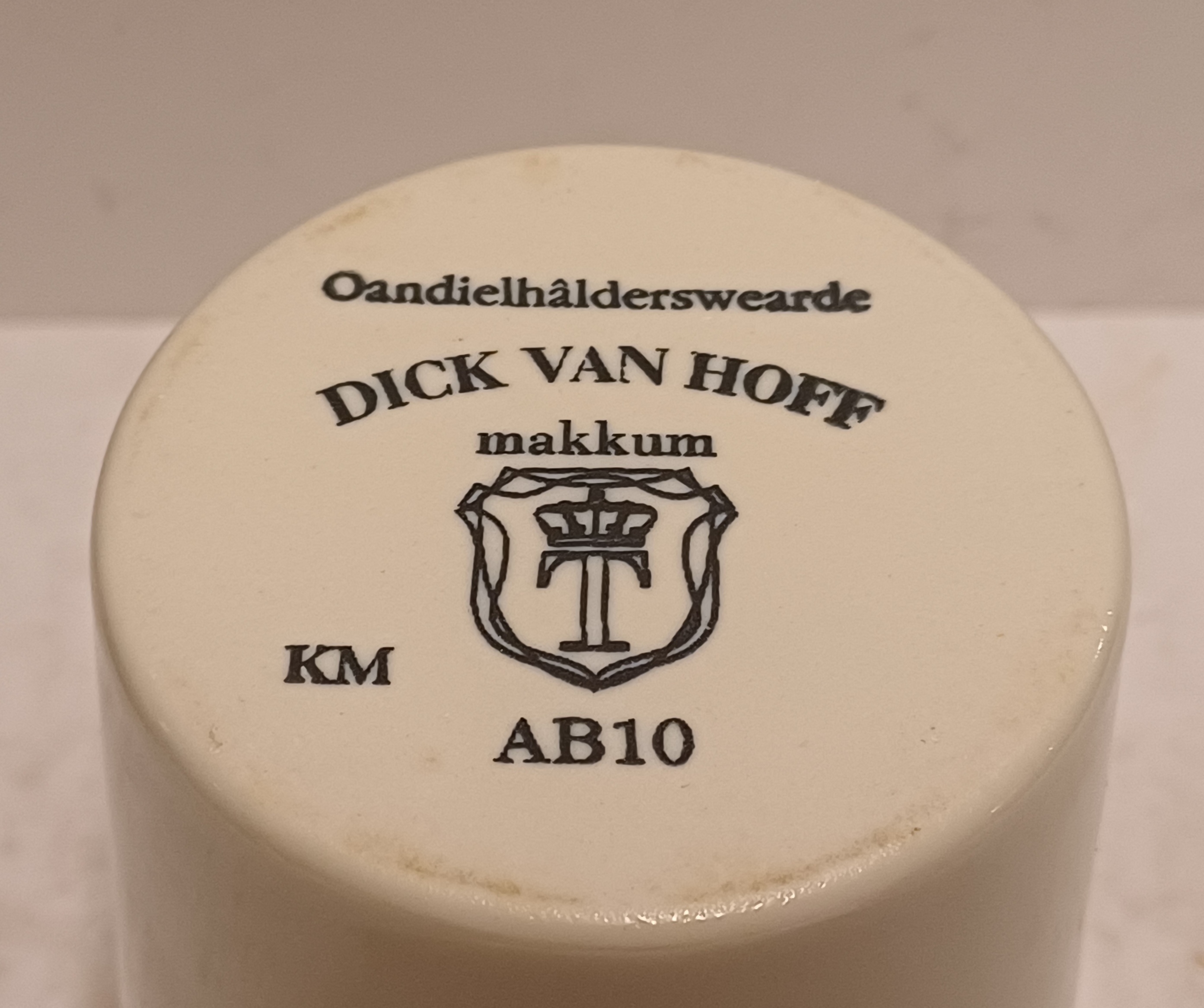 Gegoten aardewerken beker gemaakt voor de aandeelhouders van Makkum "Oandielhalderwearde". Met blauwe geschilderde decoratie van gereedschappen. Ontwerp Dick van Hoff . Onderzijde gemerkt.
