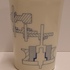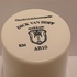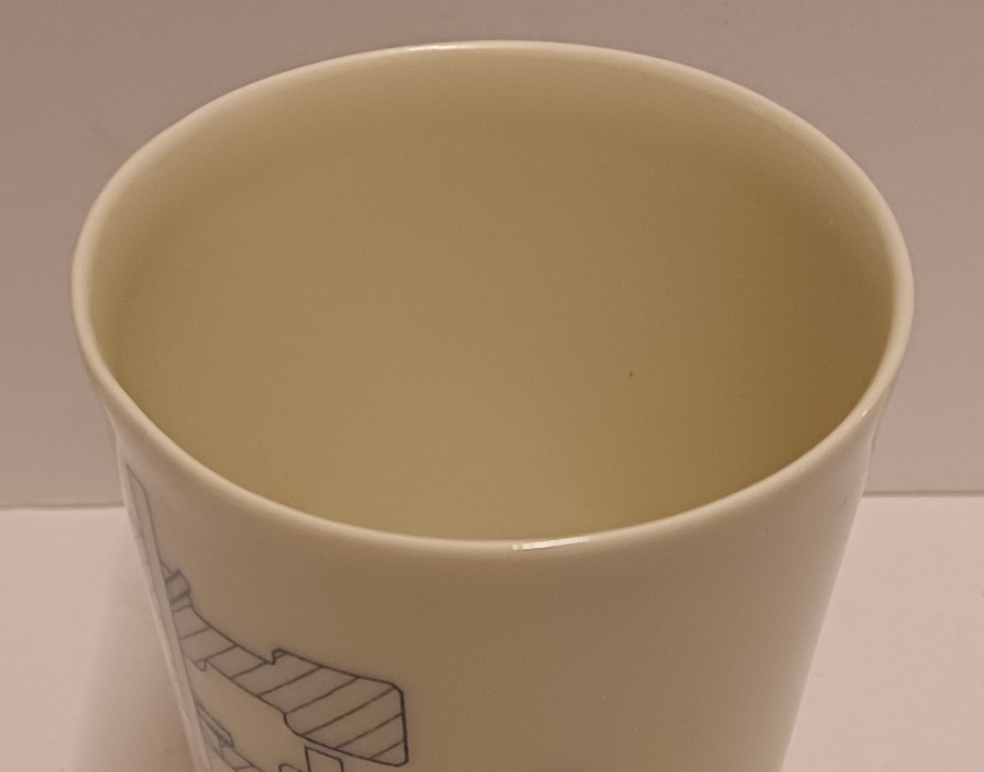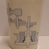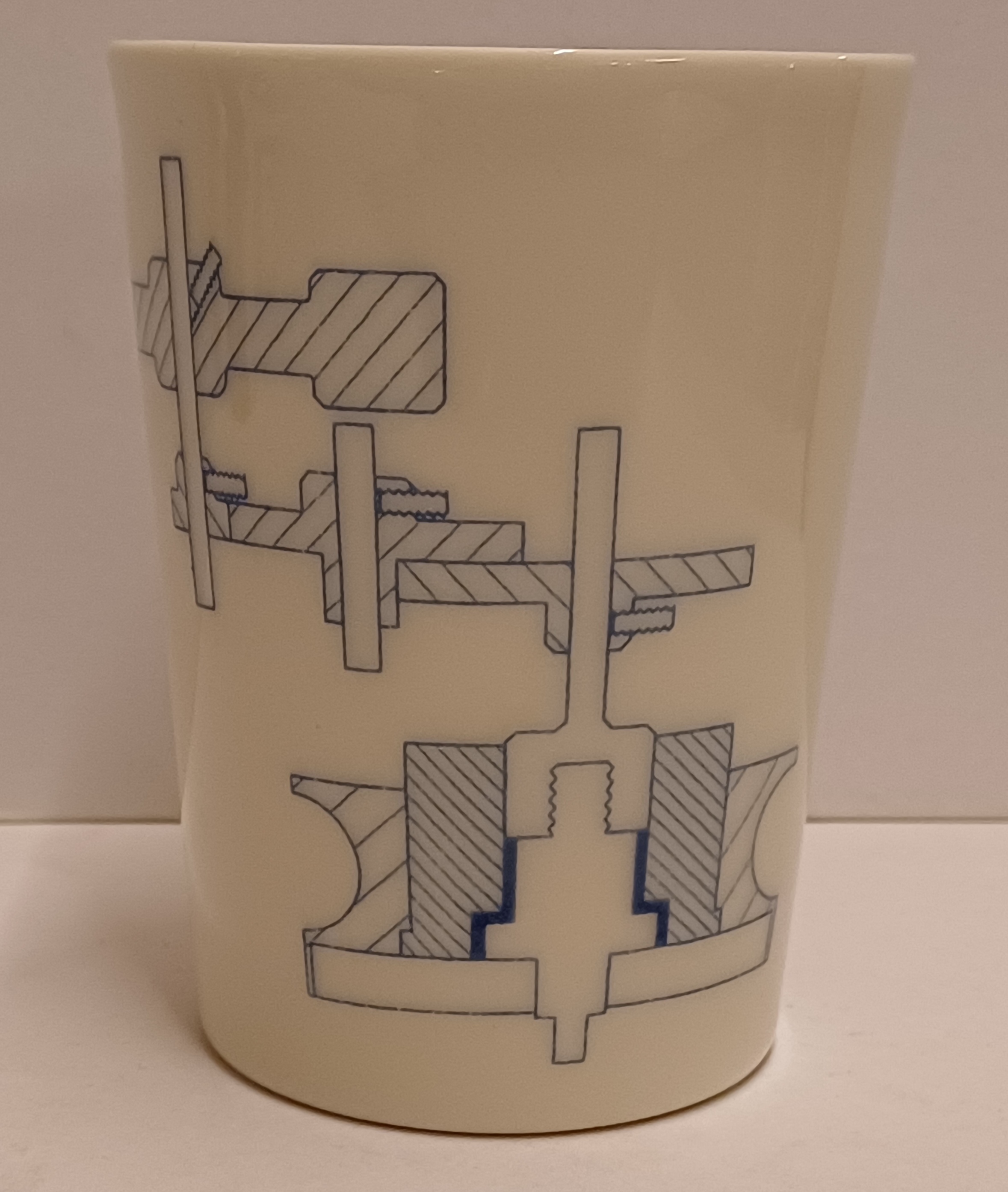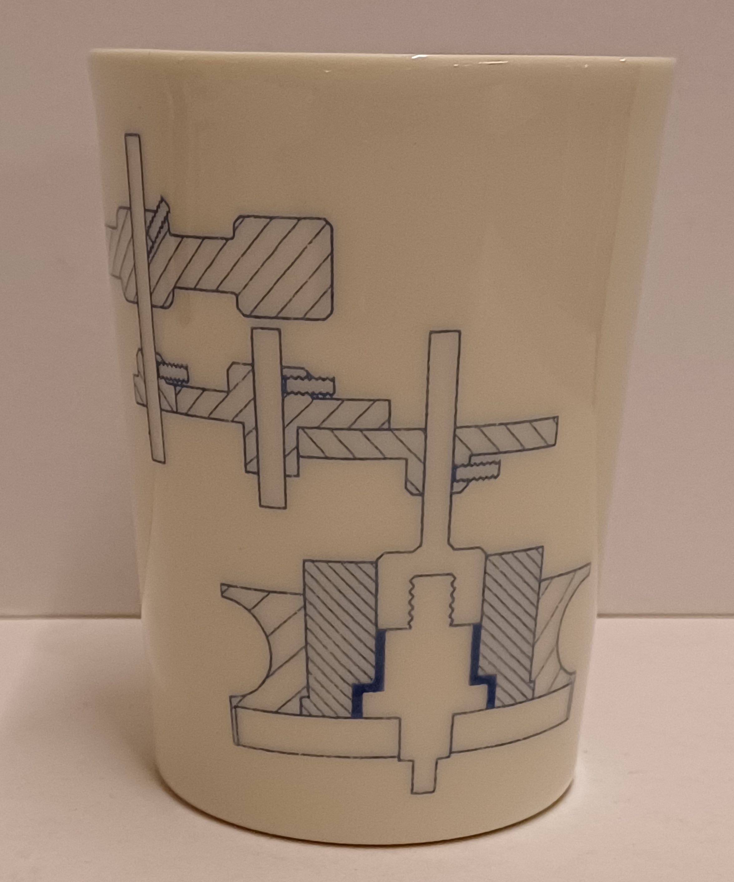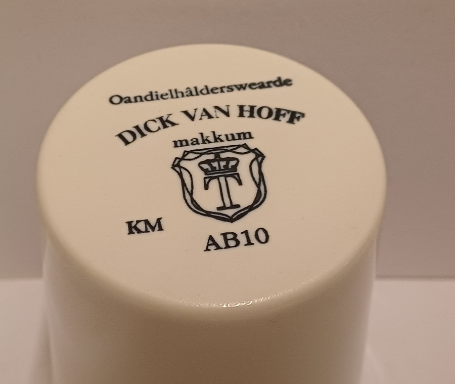 Gegoten aardewerken beker gemaakt voor de aandeelhouders van Makkum "Oandielhalderwearde". Met blauwe geschilderde decoratie van gereedschappen. Ontwerp Dick van Hoff . Onderzijde gemerkt.