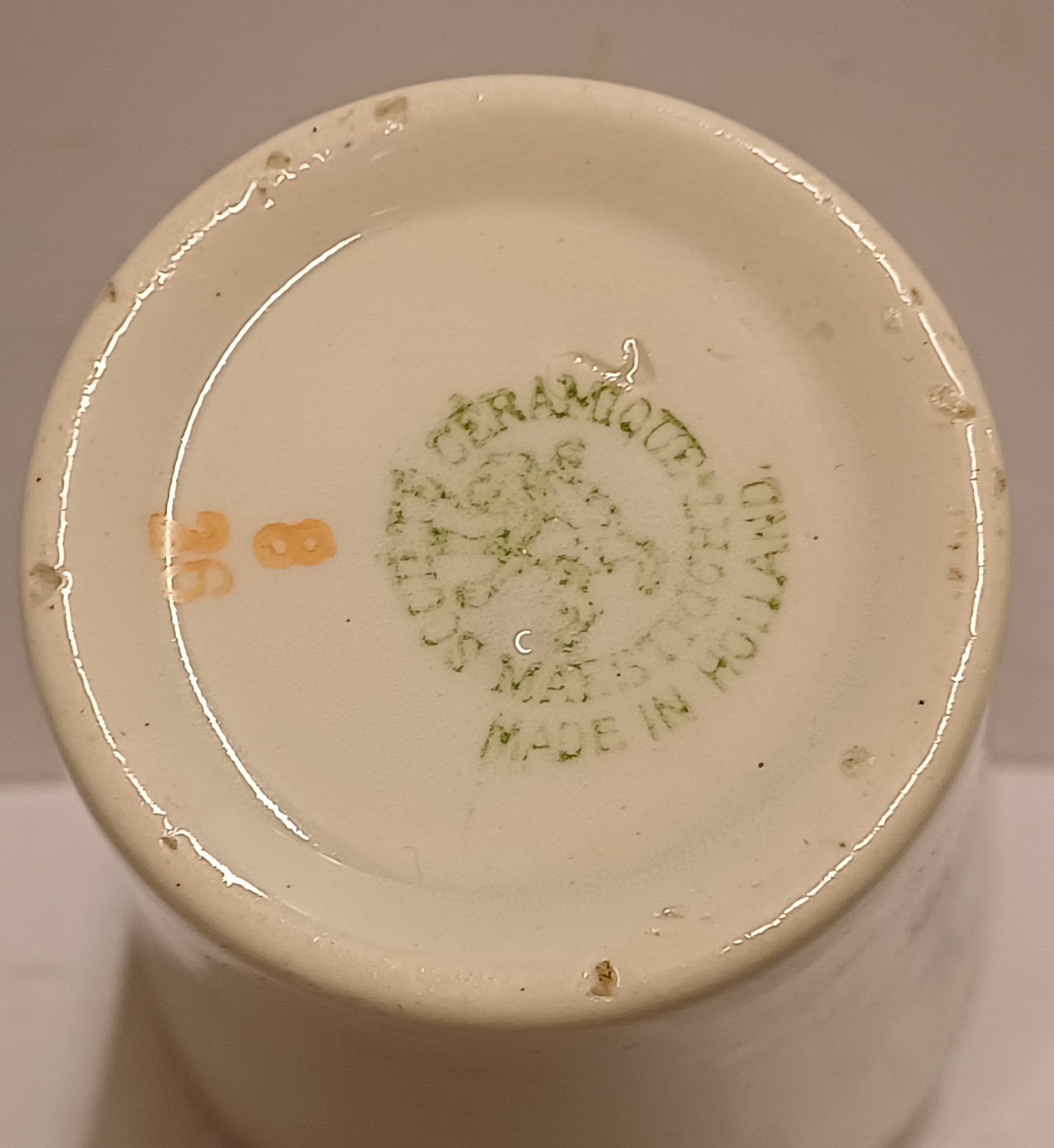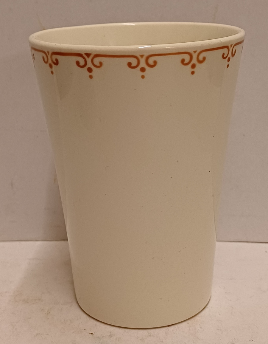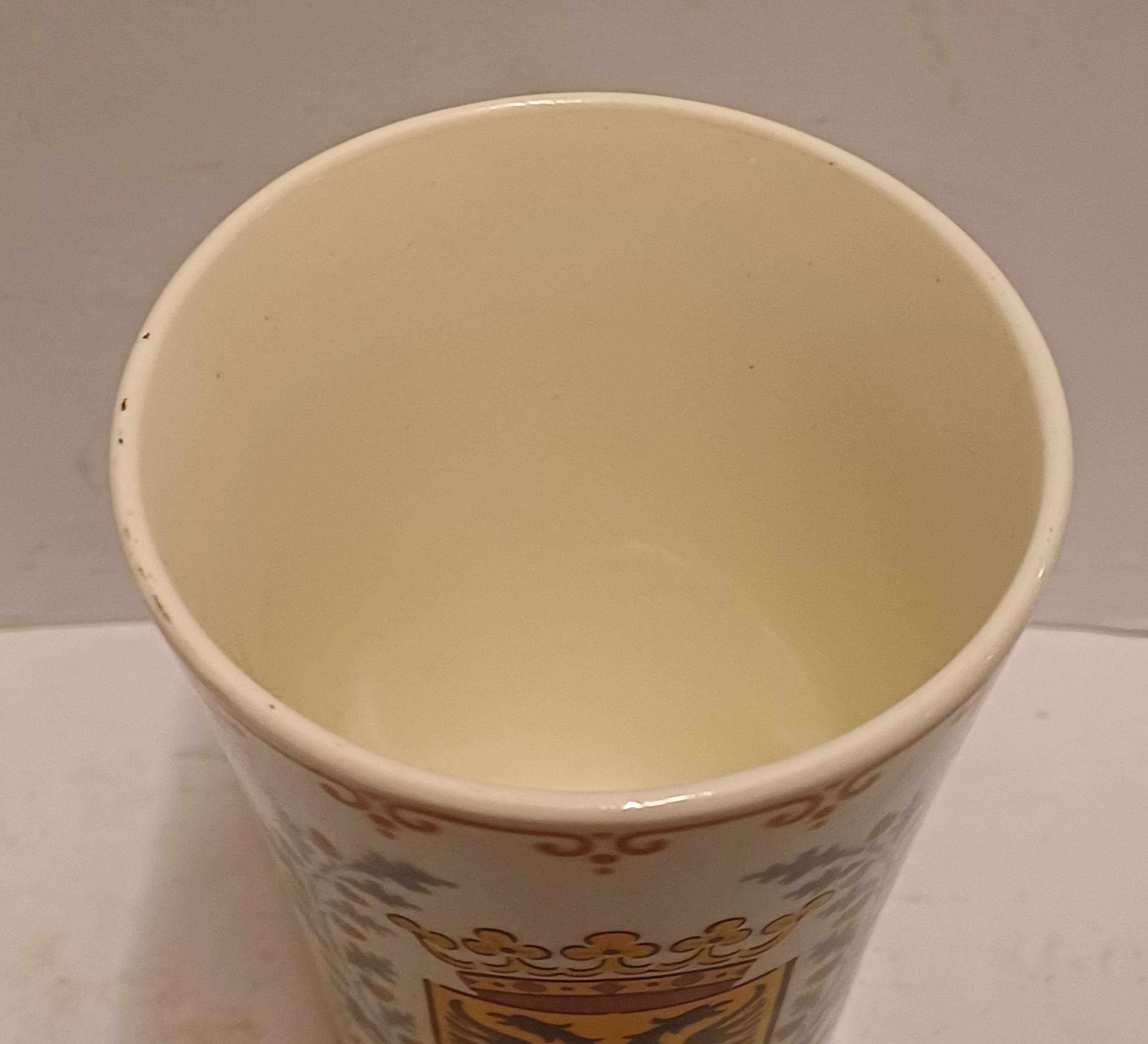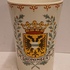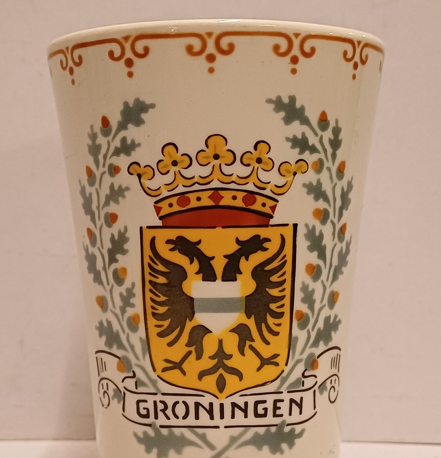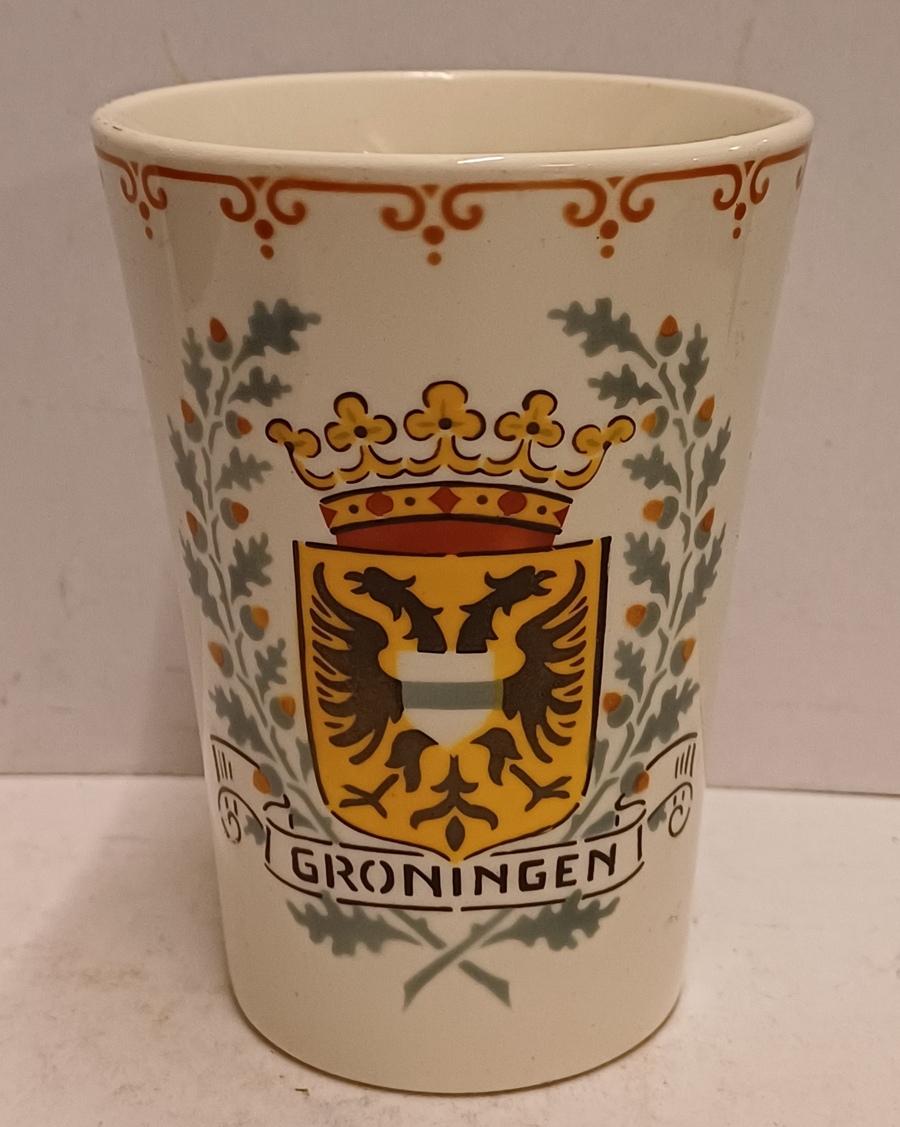 Aardwerken melkbeker met het wapen van de stad Groningen. Onderzijde met fabrieksmerk.