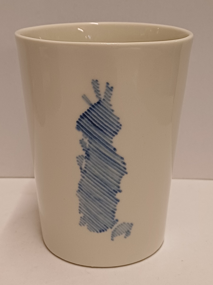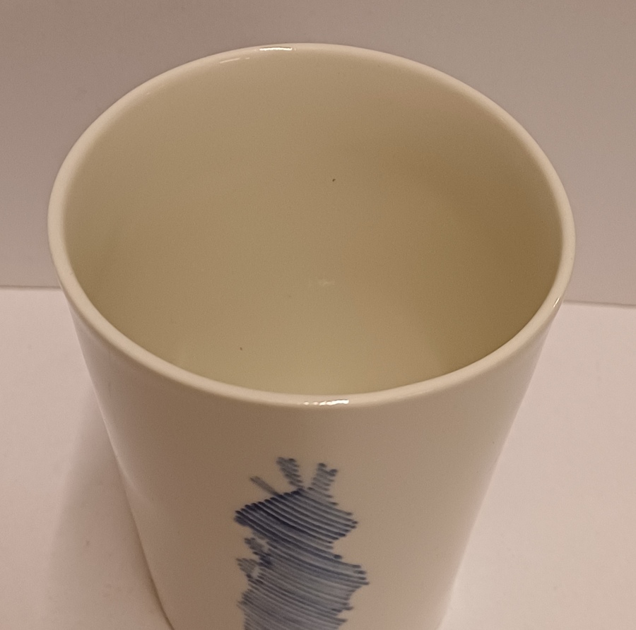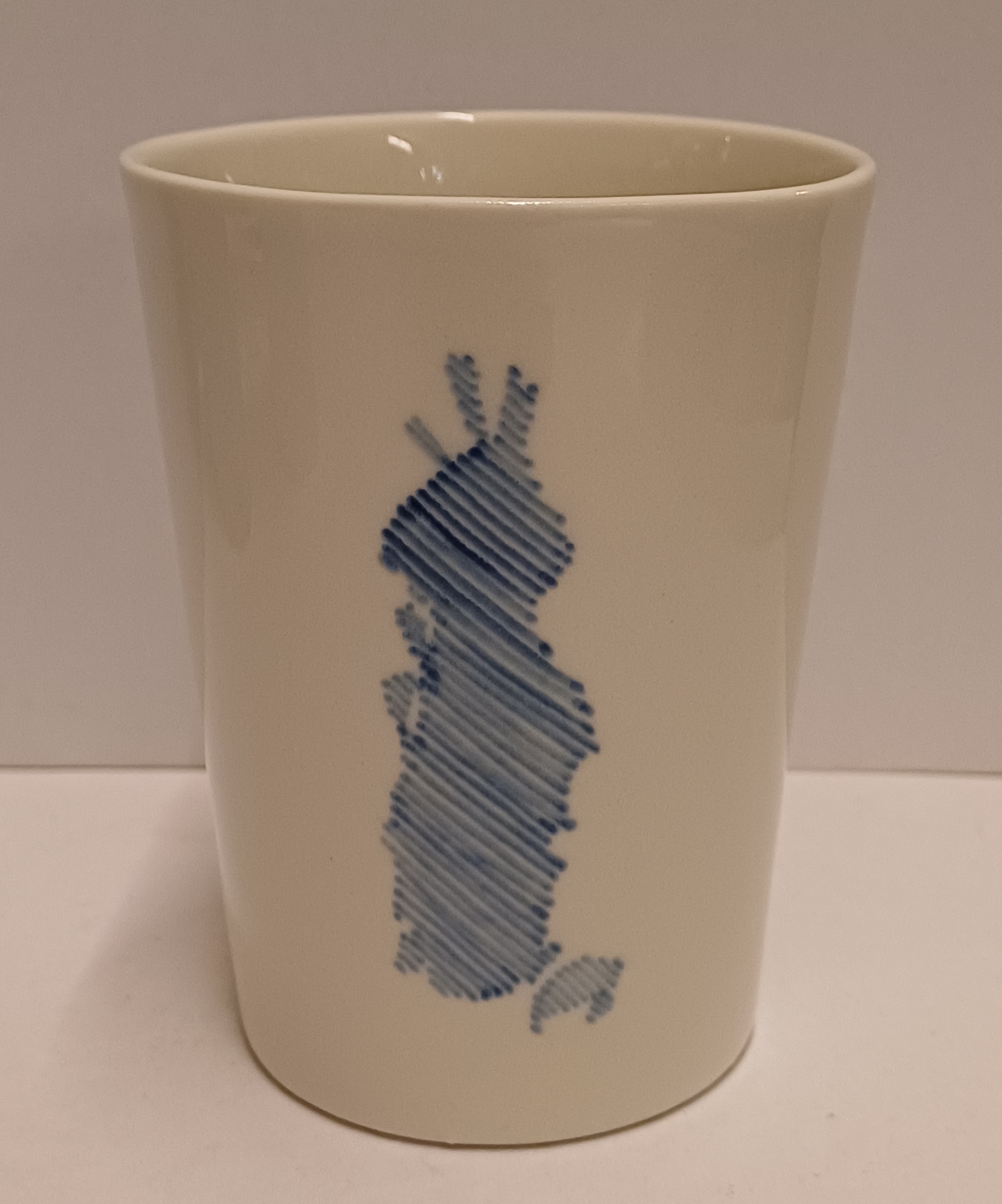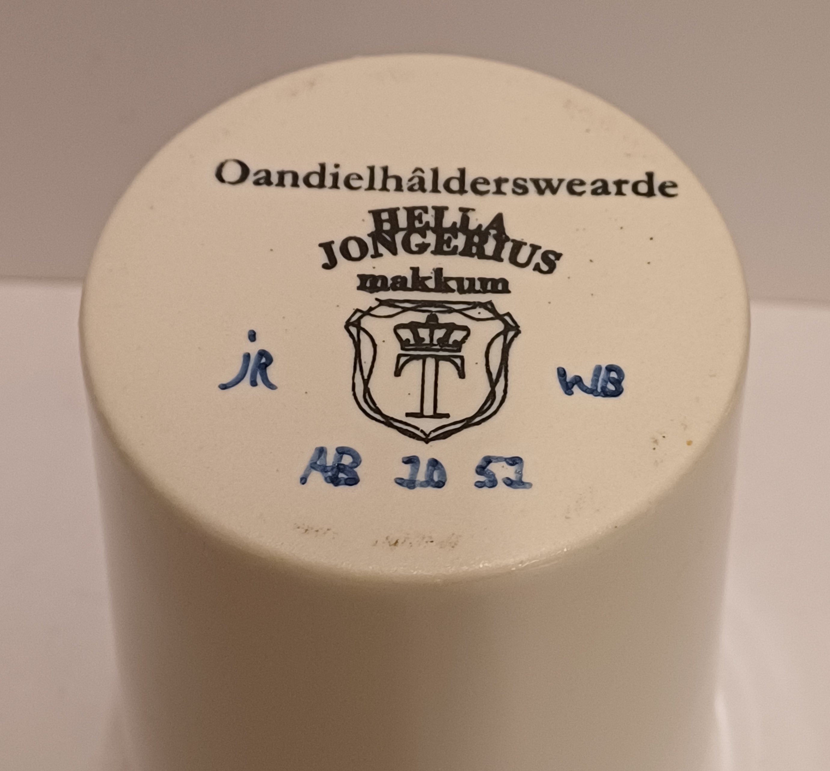 Gegoten aardewerken beker gemaakt voor de aandeelhouders van Makkum "Oandielhalderwearde". Met blauwe geschilderde decoratie. Ontwerp Hella Jongerius . Onderzijde gemerkt.