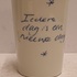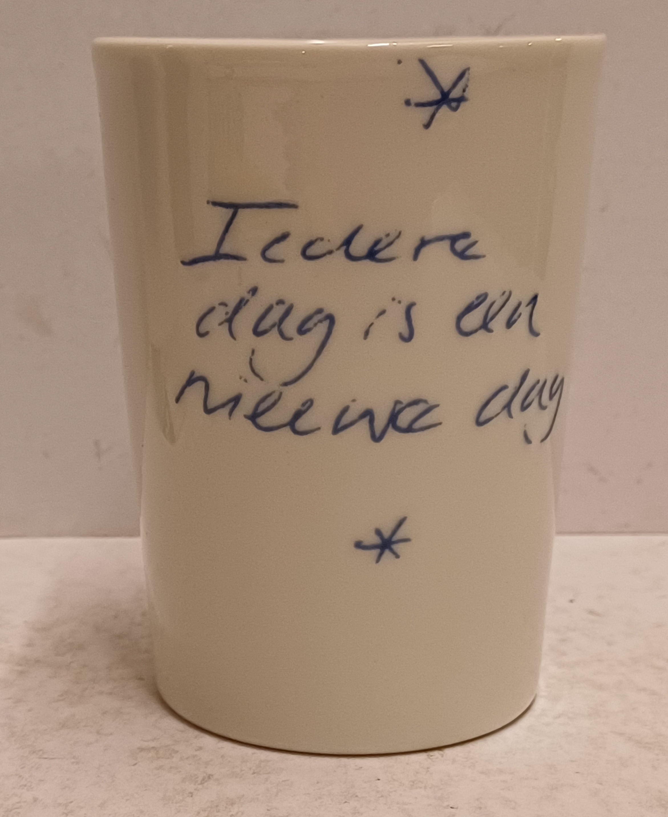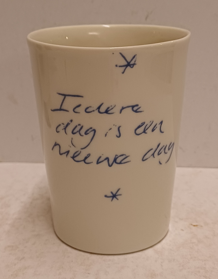 Gegoten aardewerken beker gemaakt voor de aandeelhouders van Makkum "Oandielhalderwearde". Met blauwe geschilderde decoratie van de tekst Iedere dag is een nieuwe dag. Ontwerp Irma Boom . Onderzijde gemerkt.