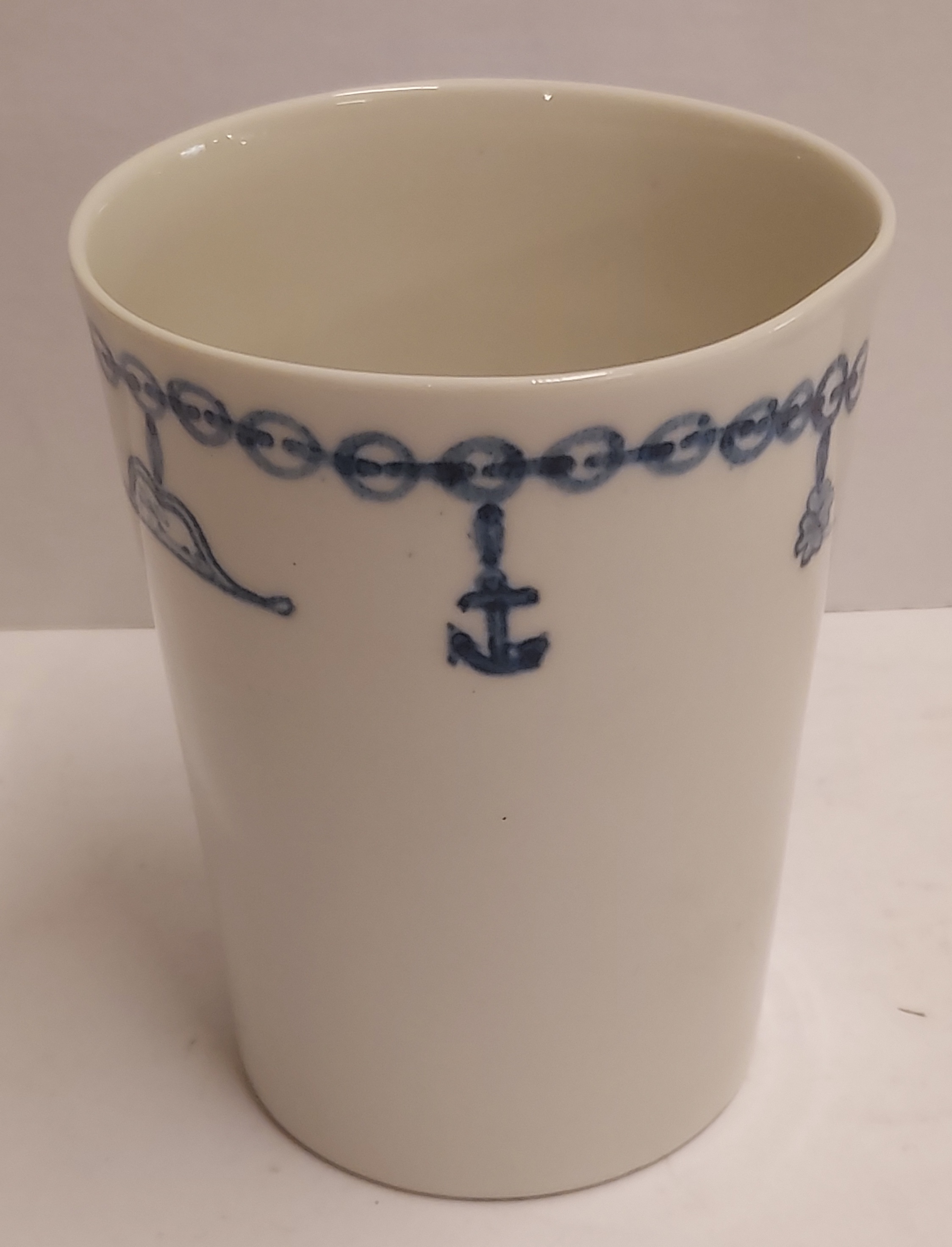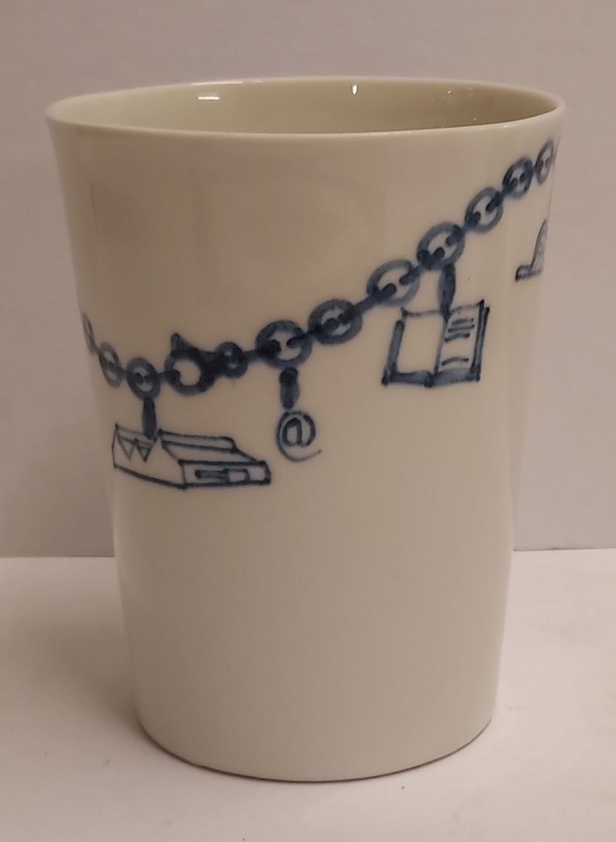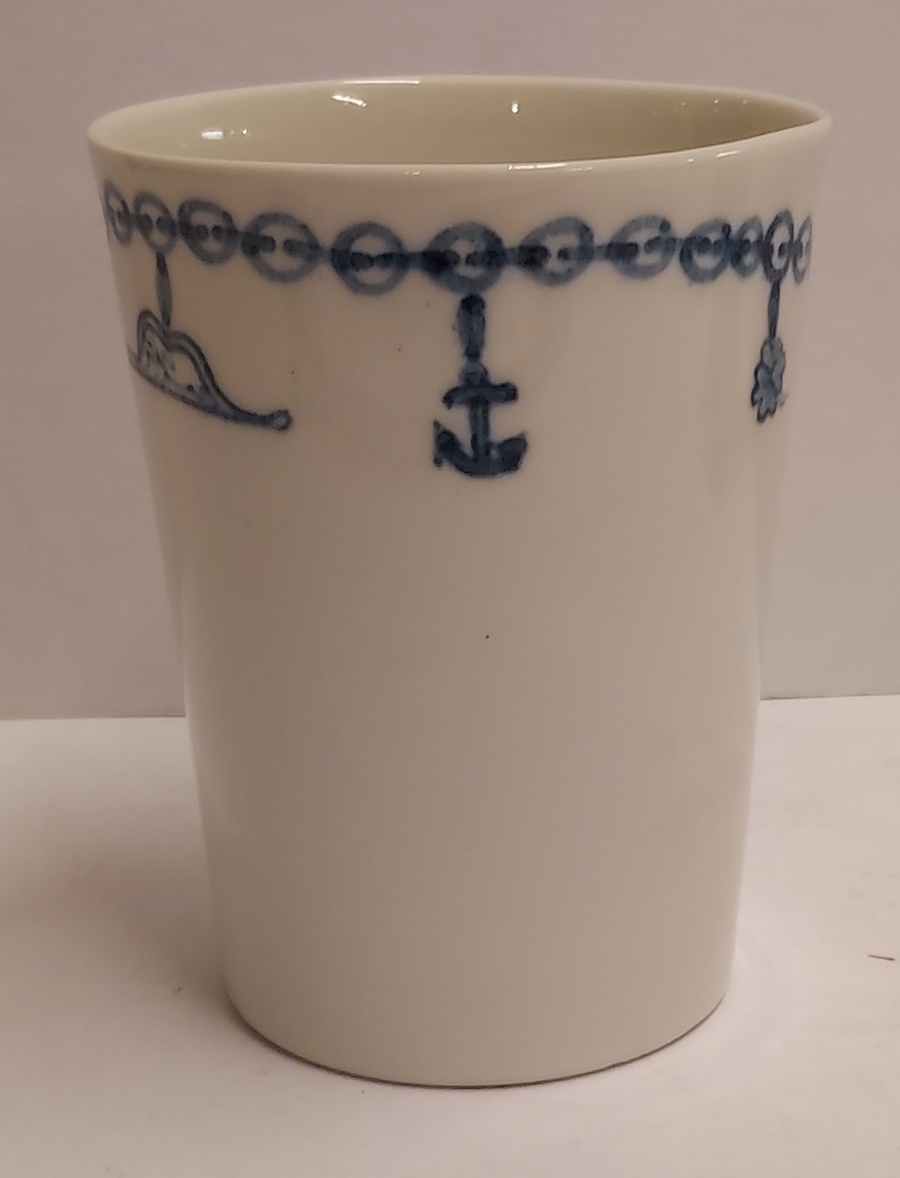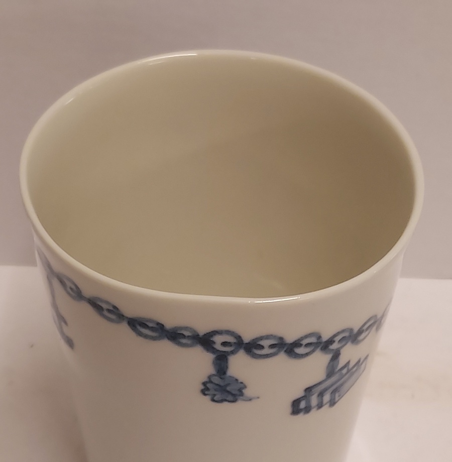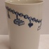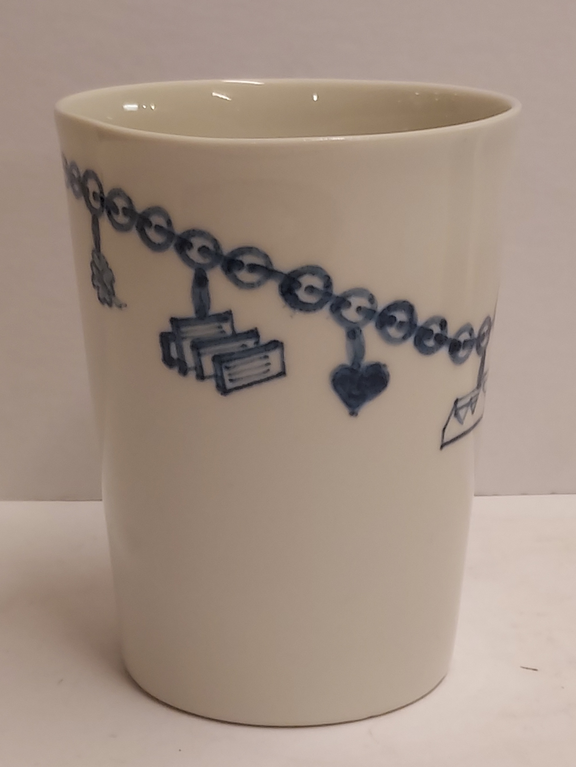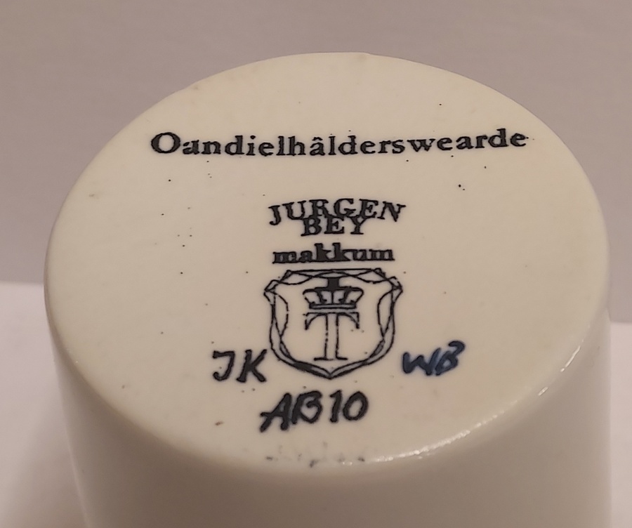 Bicchiere in terracotta colato realizzato per gli azionisti di Makkum "Oandielhalderwearde". Decorato con un braccialetto di mendicante dipinto in blu. Design di Jurgen Bey. Parte inferiore marcata.