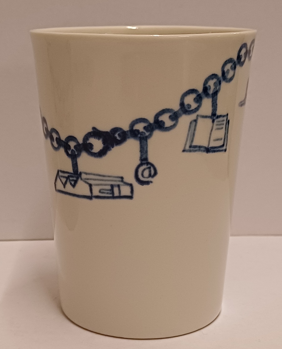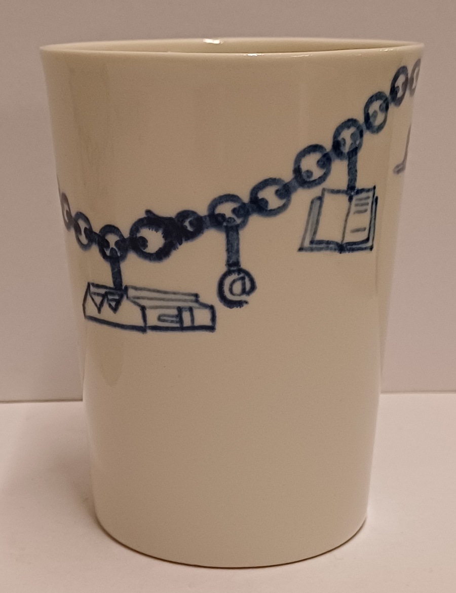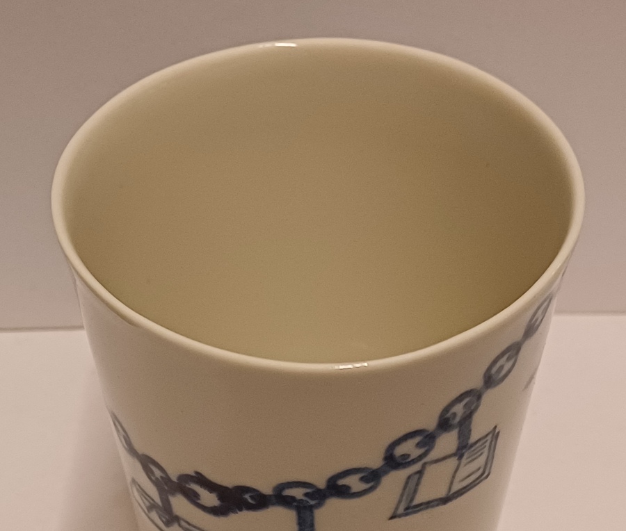 Gegoten aardewerken beker gemaakt voor de aandeelhouders van Makkum "Oandielhalderwearde". Met blauwe geschilderde decoratie van een bedelarmband. Ontwerp Jurgen Bey . Onderzijde gemerkt.
