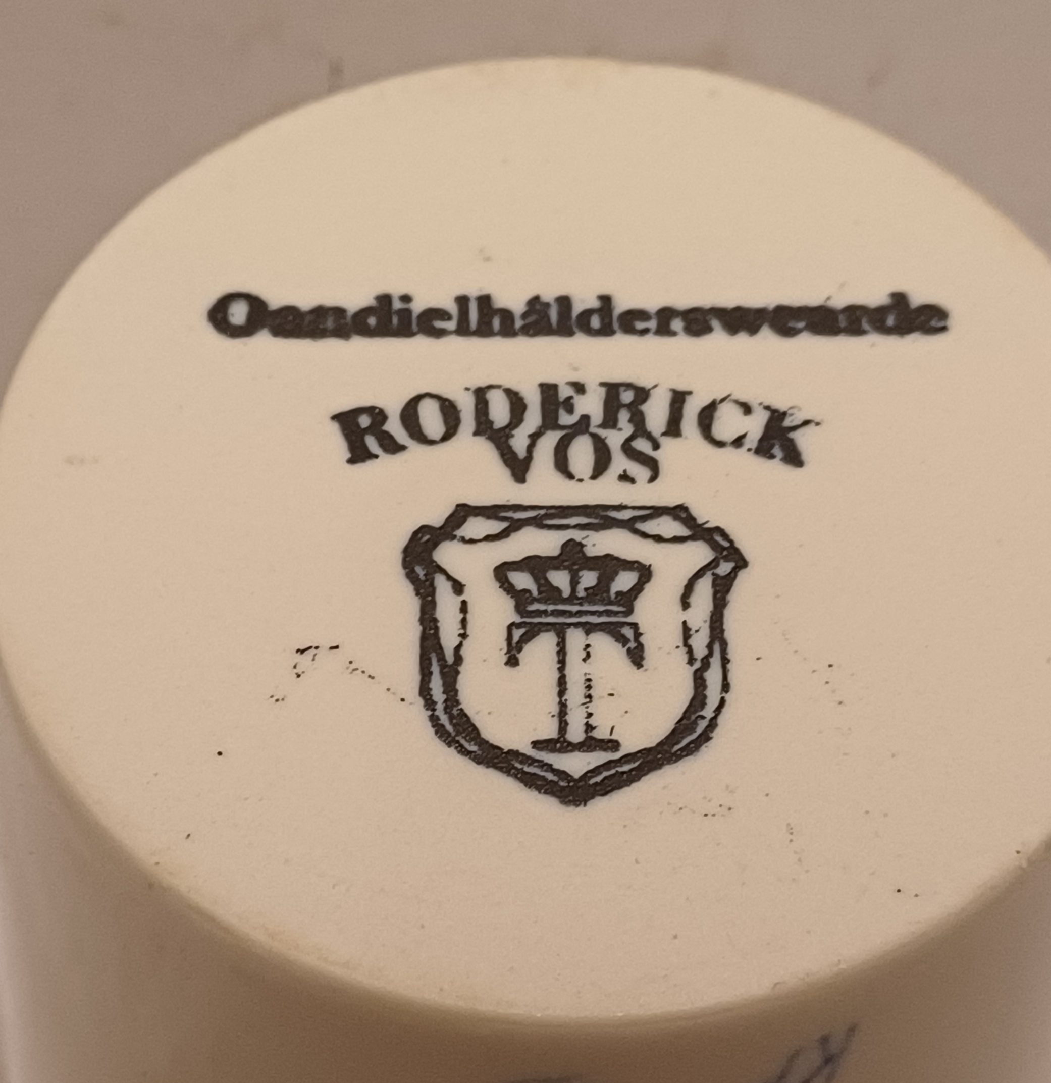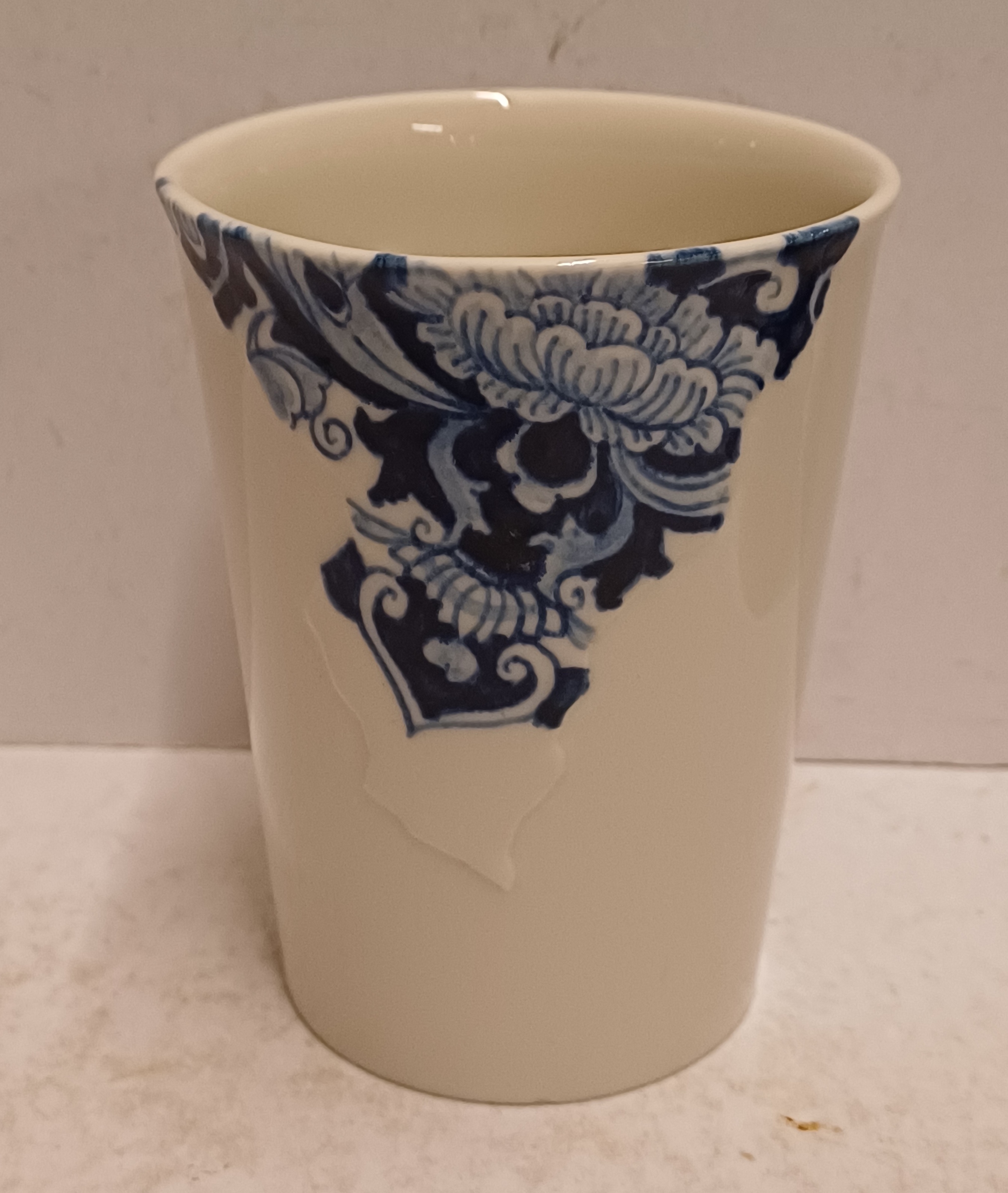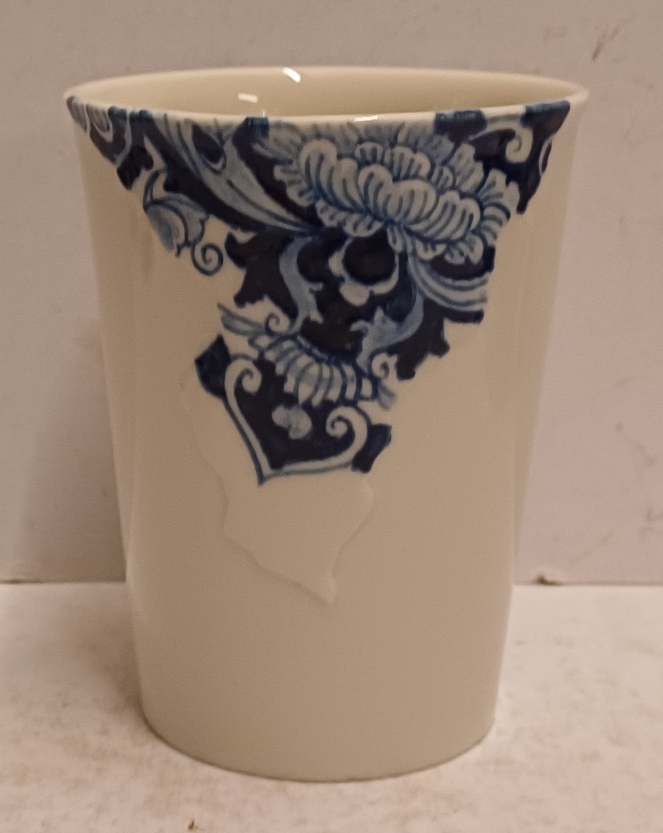 Gegoten aardewerken beker gemaakt voor de aandeelhouders van Makkum "Oandielhalderwearde". Met blauwe geschilderde decoratie in traditionele stijl. Ontwerp Roderick Vos . Onderzijde gemerkt.