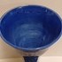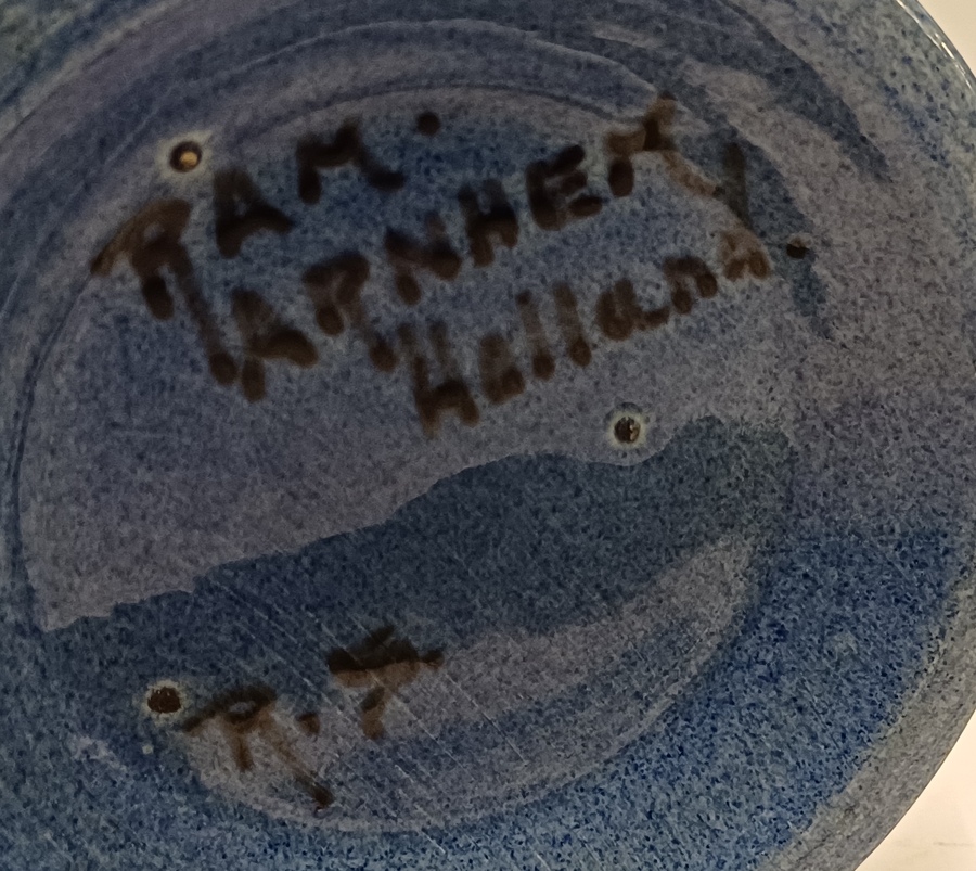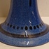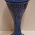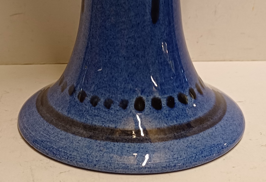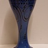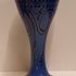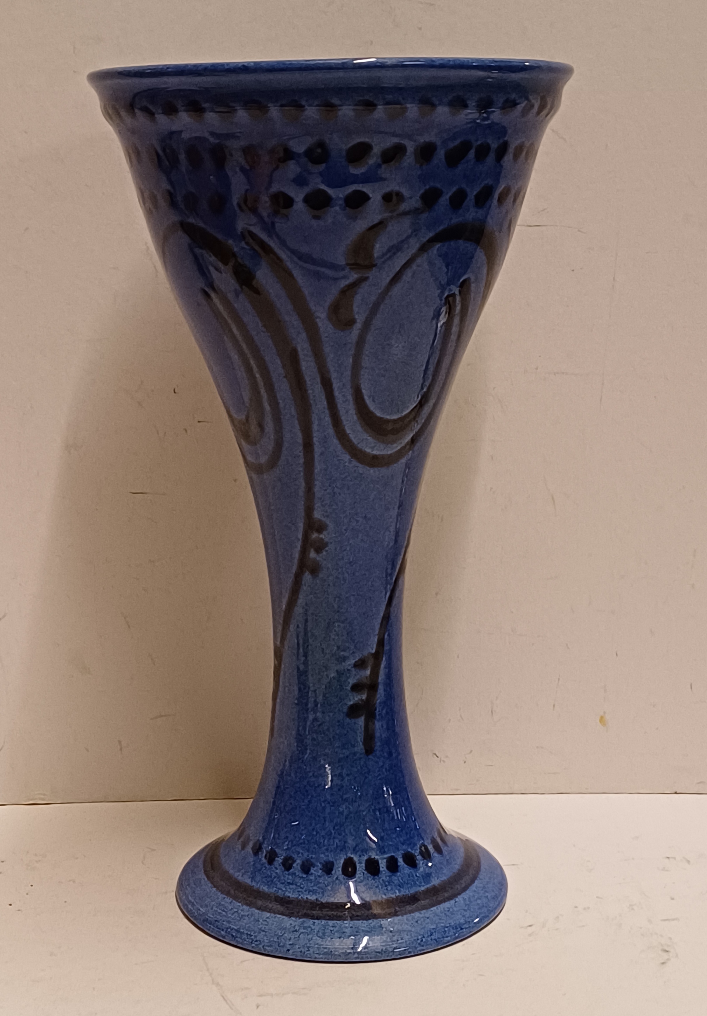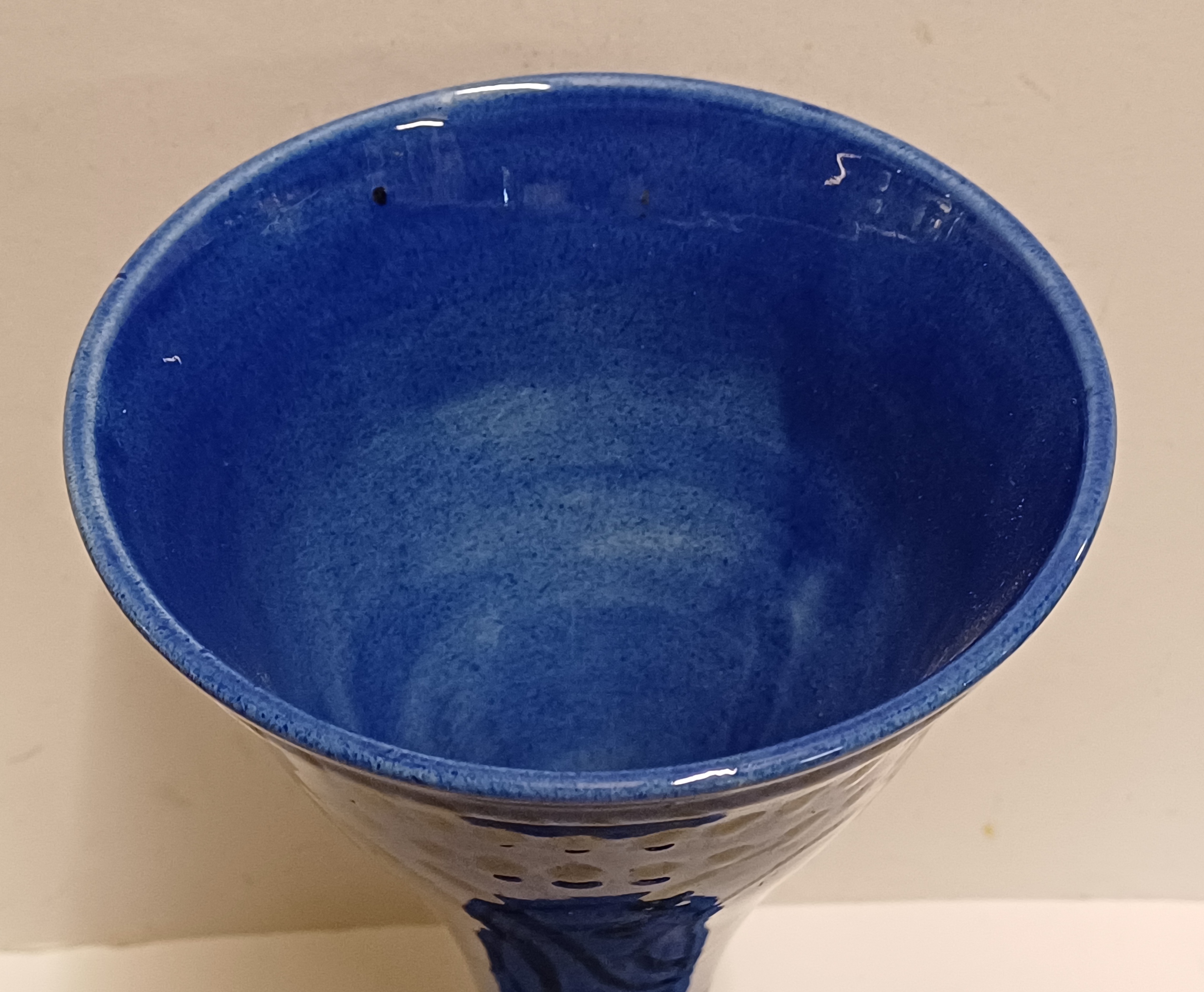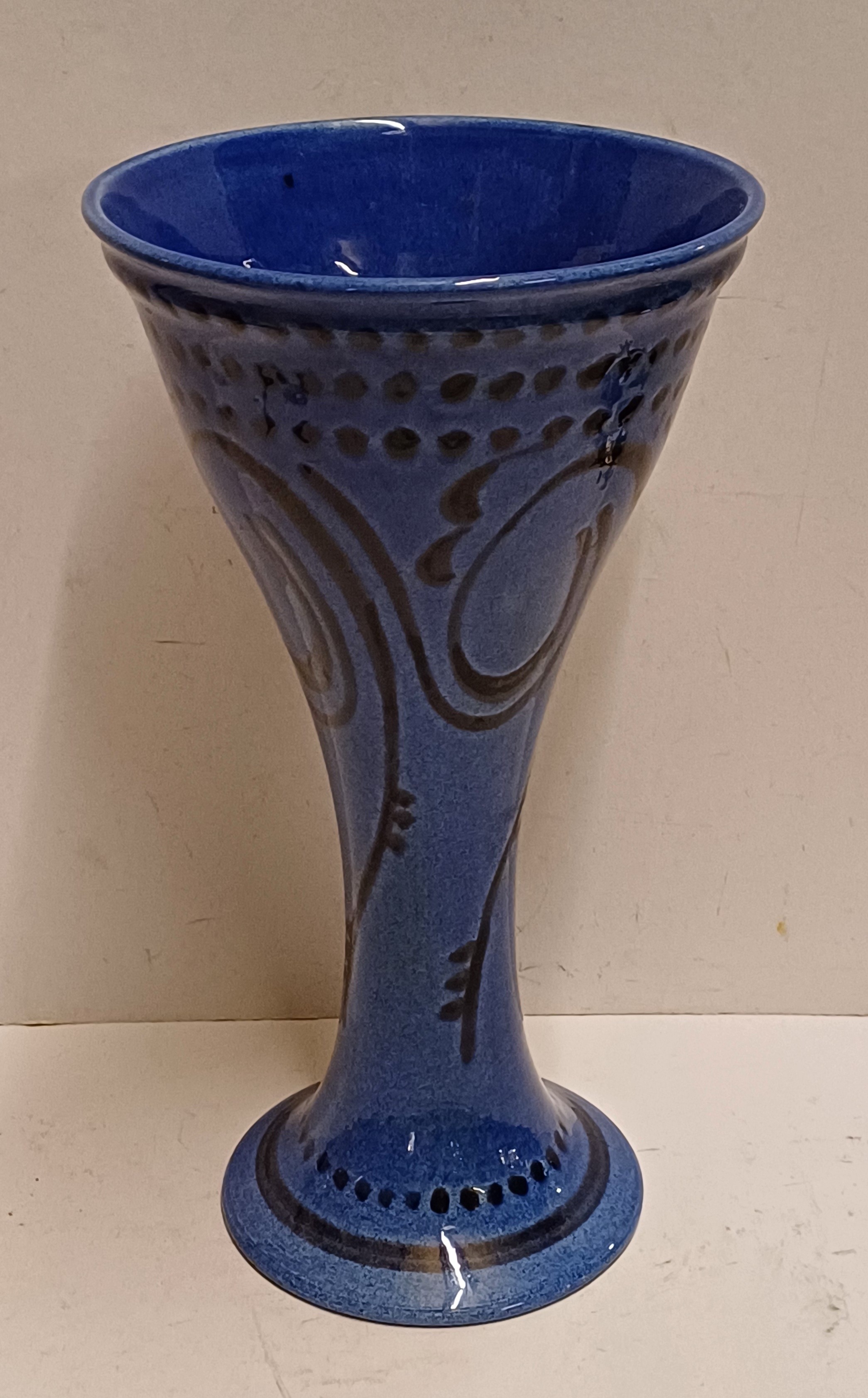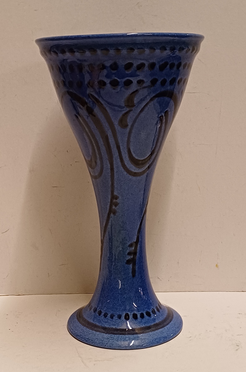 Hoge bekervaas met zwart decor op blauw fond. Onderzijde met fabrieksmerk en schilders initialen van Roelof sterken
