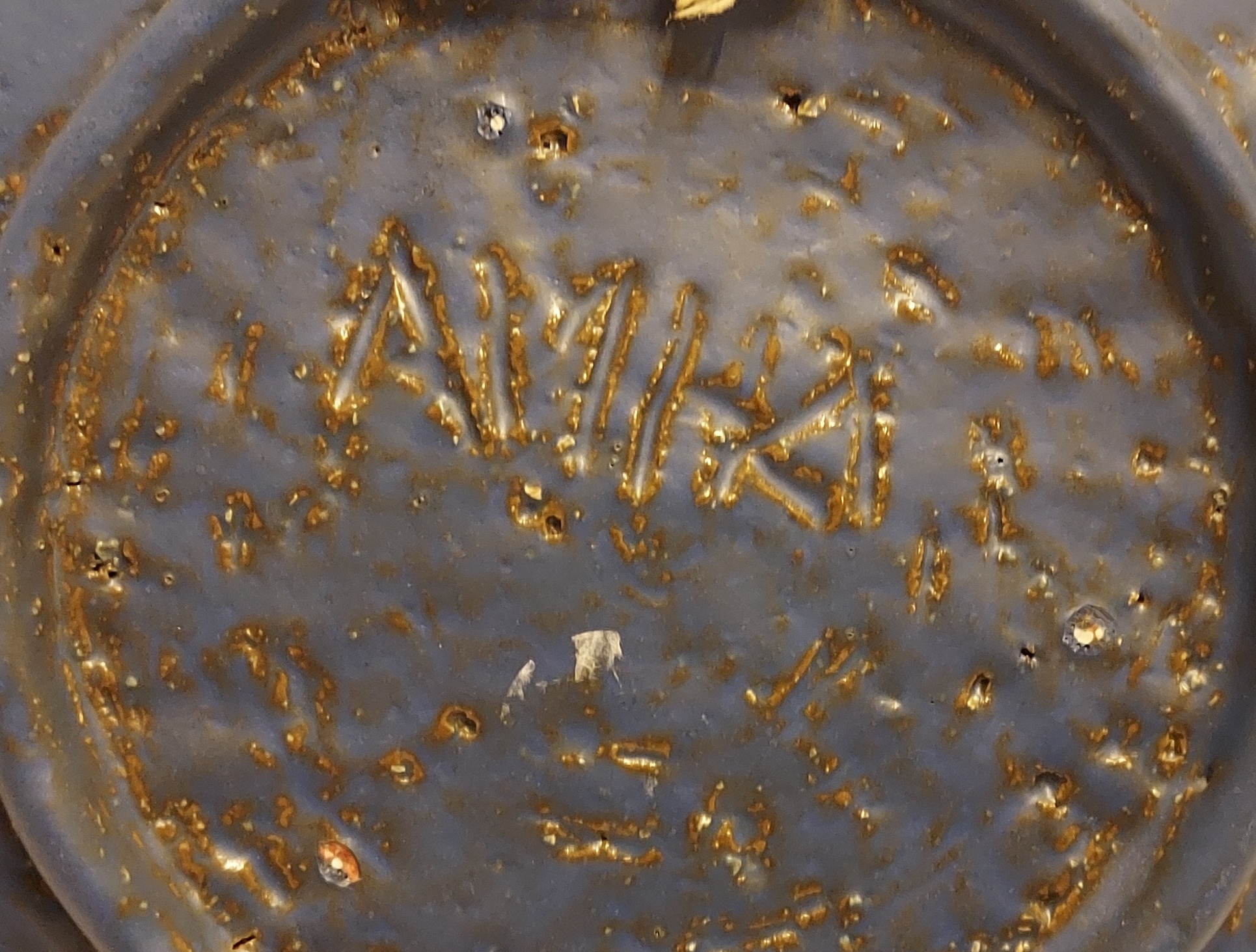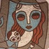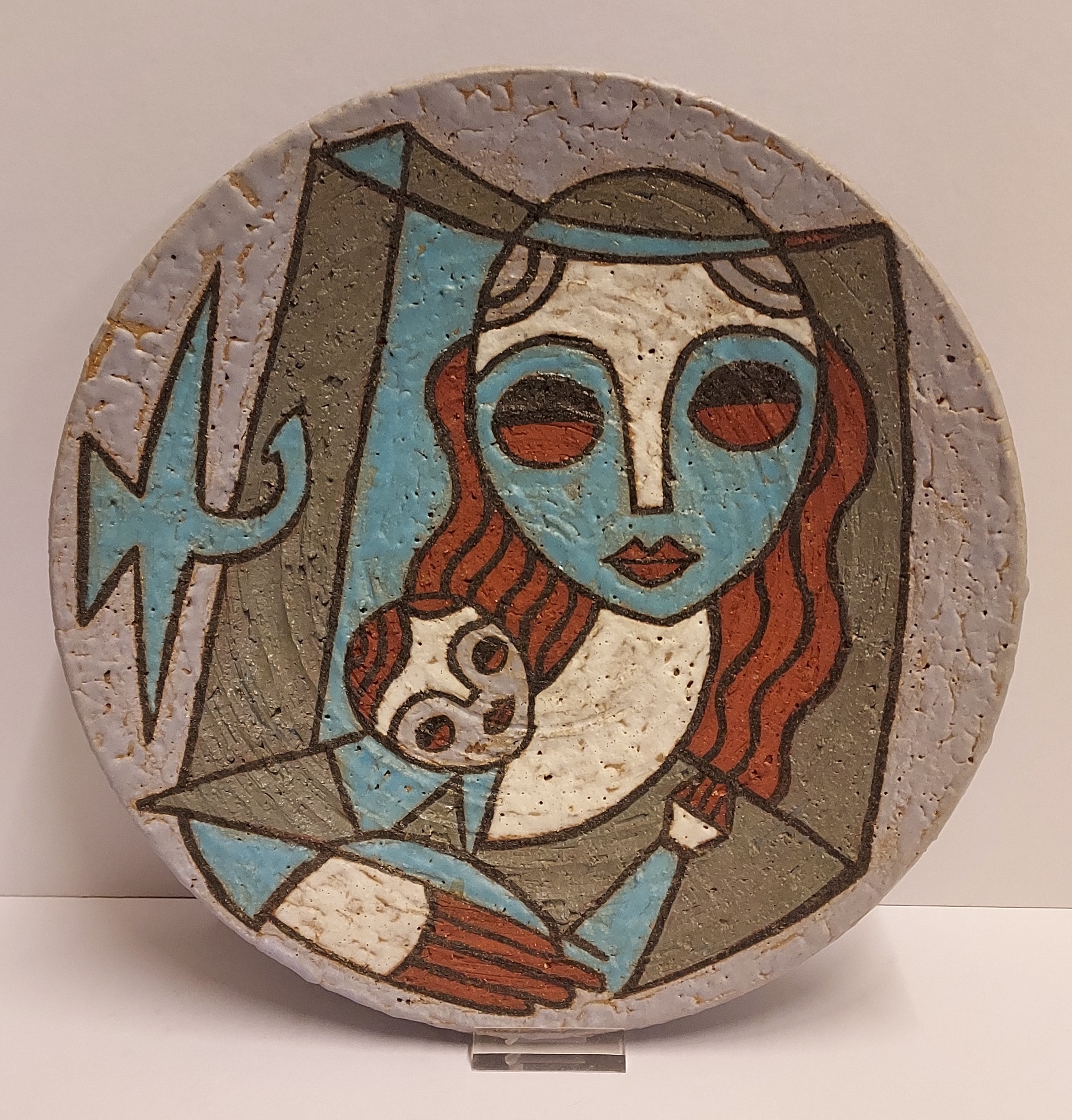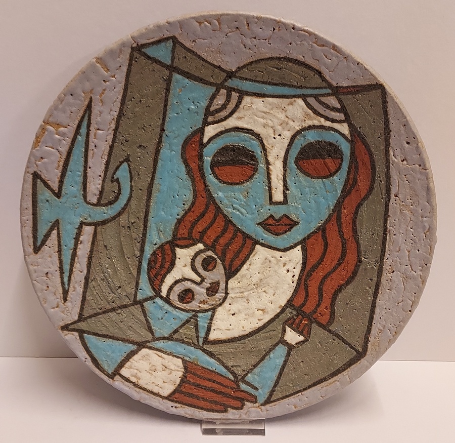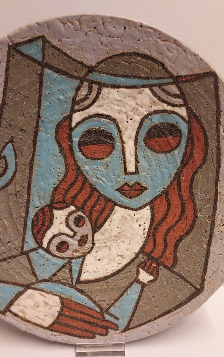 Piatto in terracotta con decorazione policroma raffigurante una madre con bambino. Retro con firma incisa.