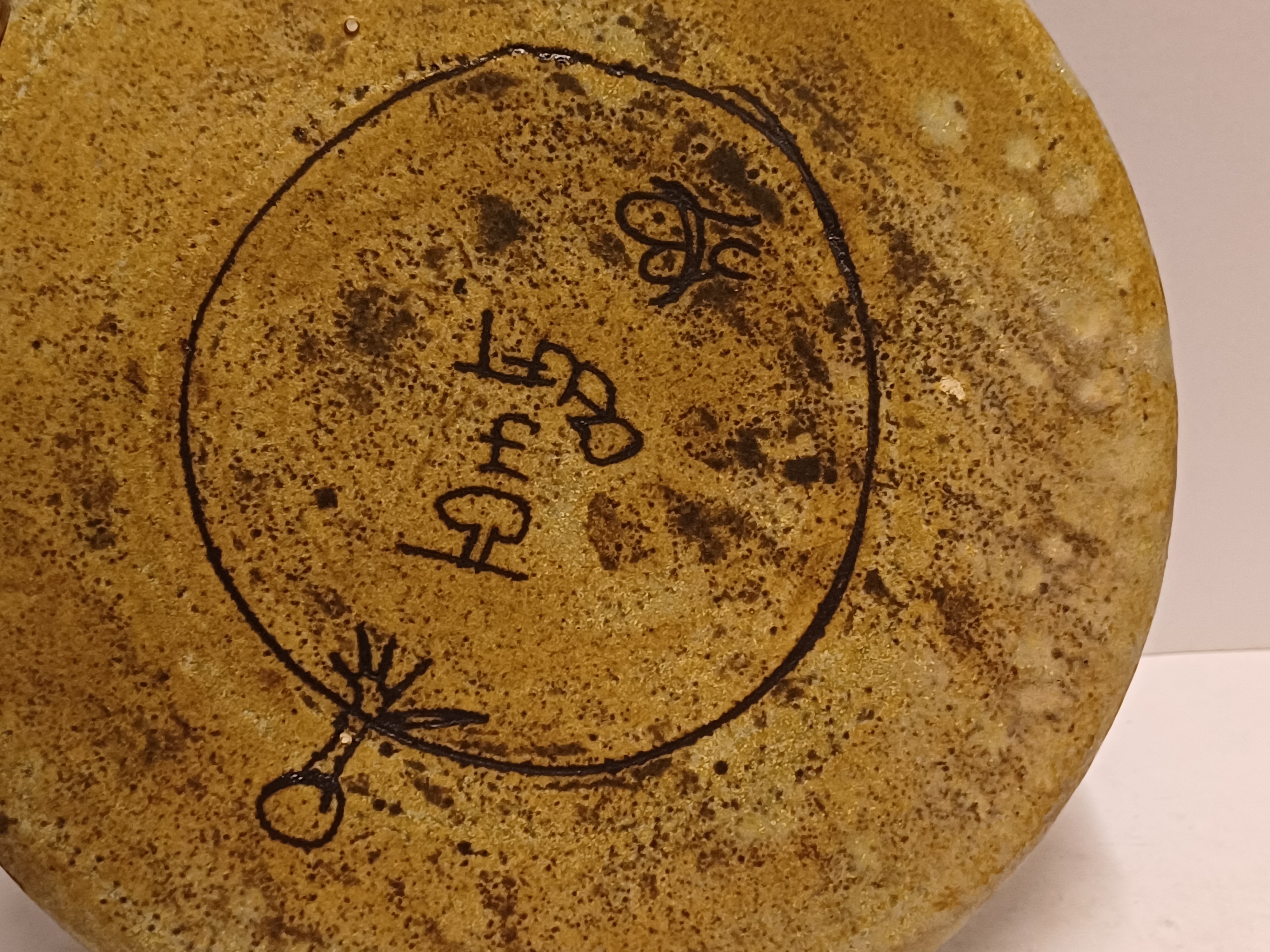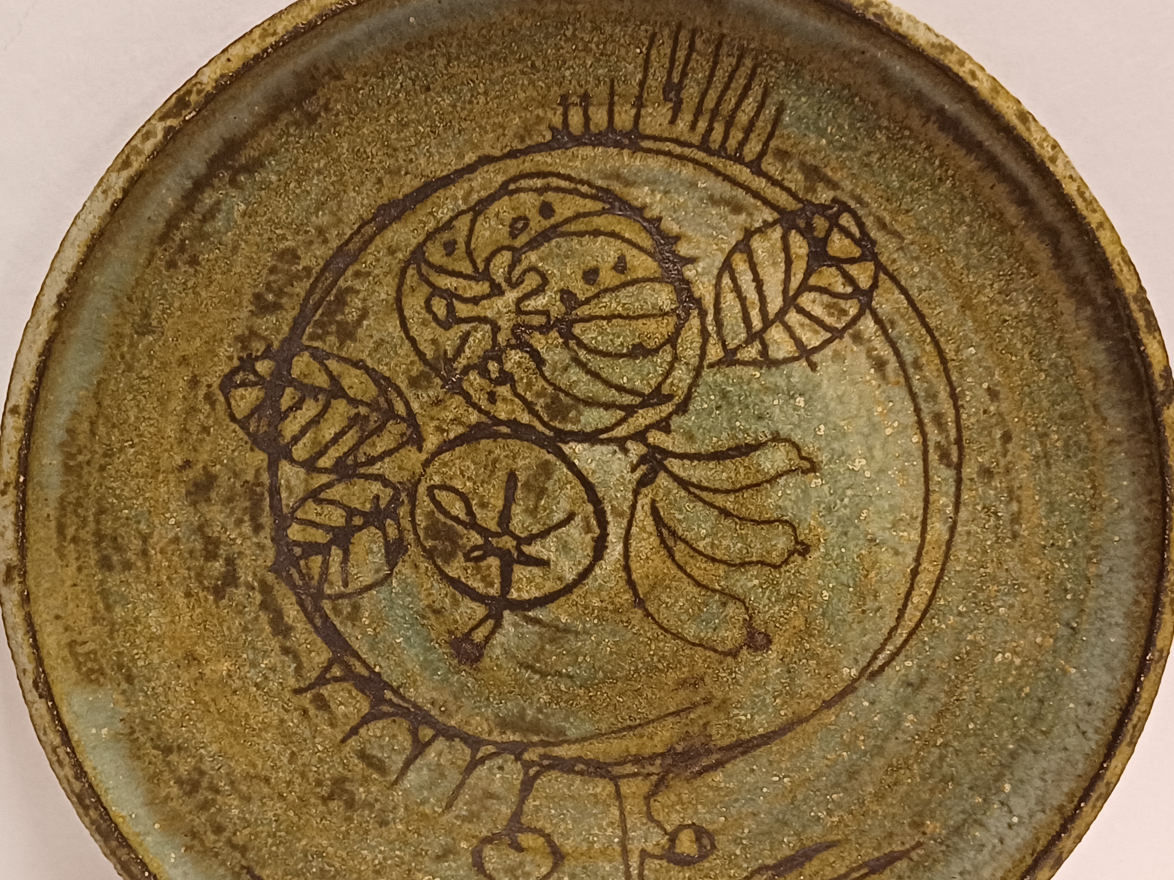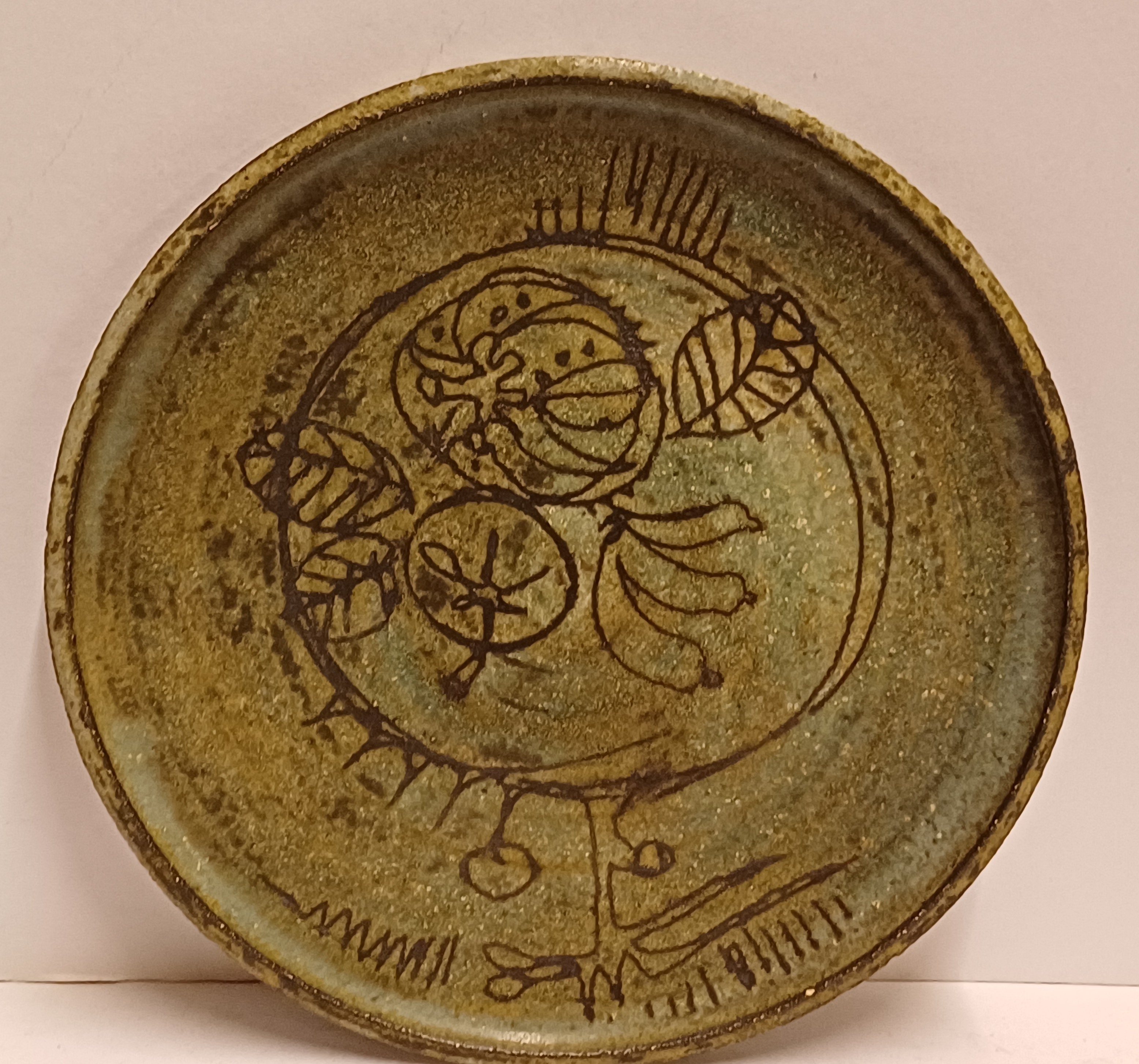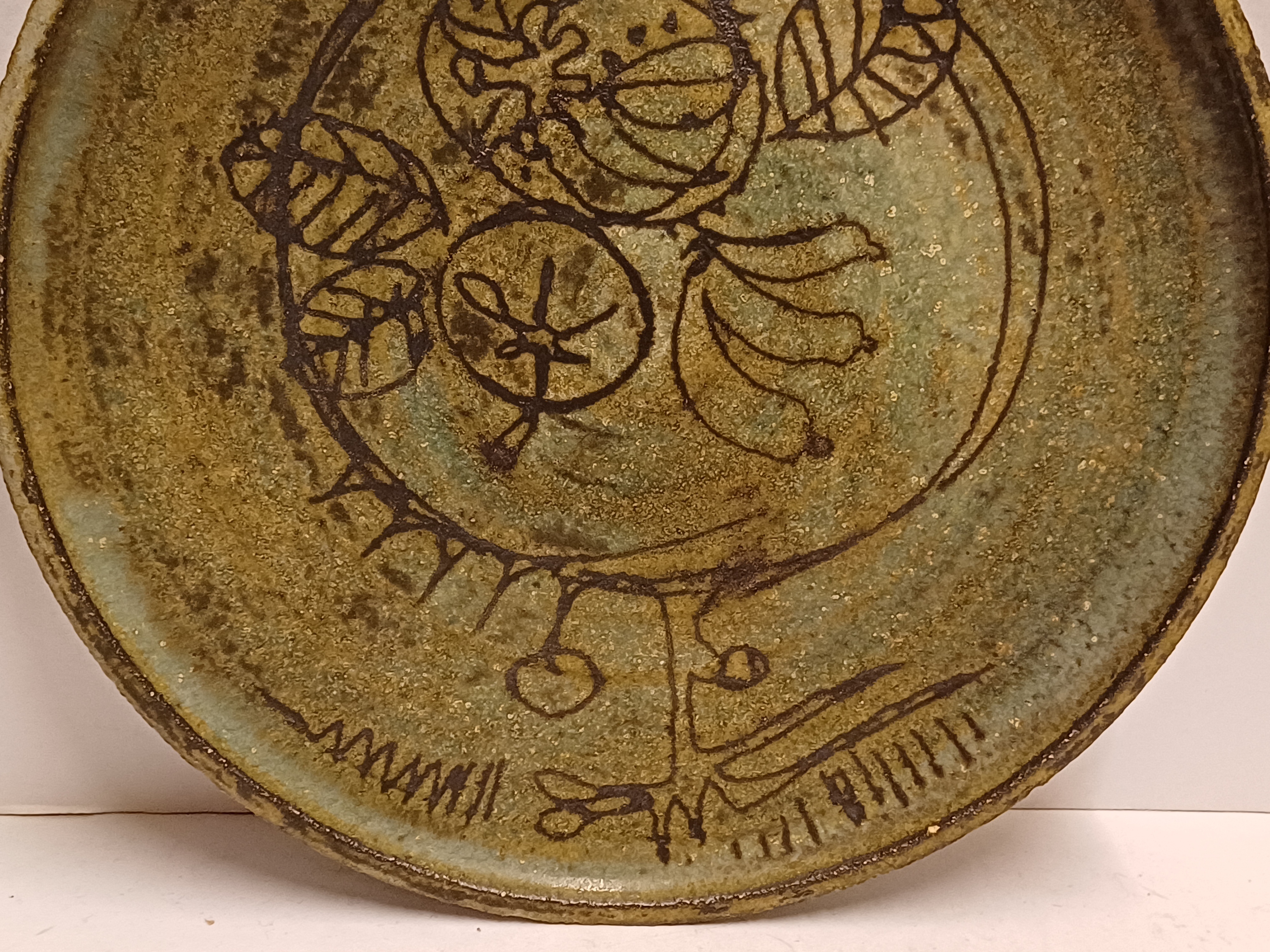 Aardewerken bord met groene glazuur en ingekraste decoratie van een boom met vruchten. Ontwerp Betty van Lange voor de experimentele afdeling van de Porceleyne fles Delft. Achterzijde met fabrieksmerk en kunstenaars signatuur.