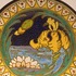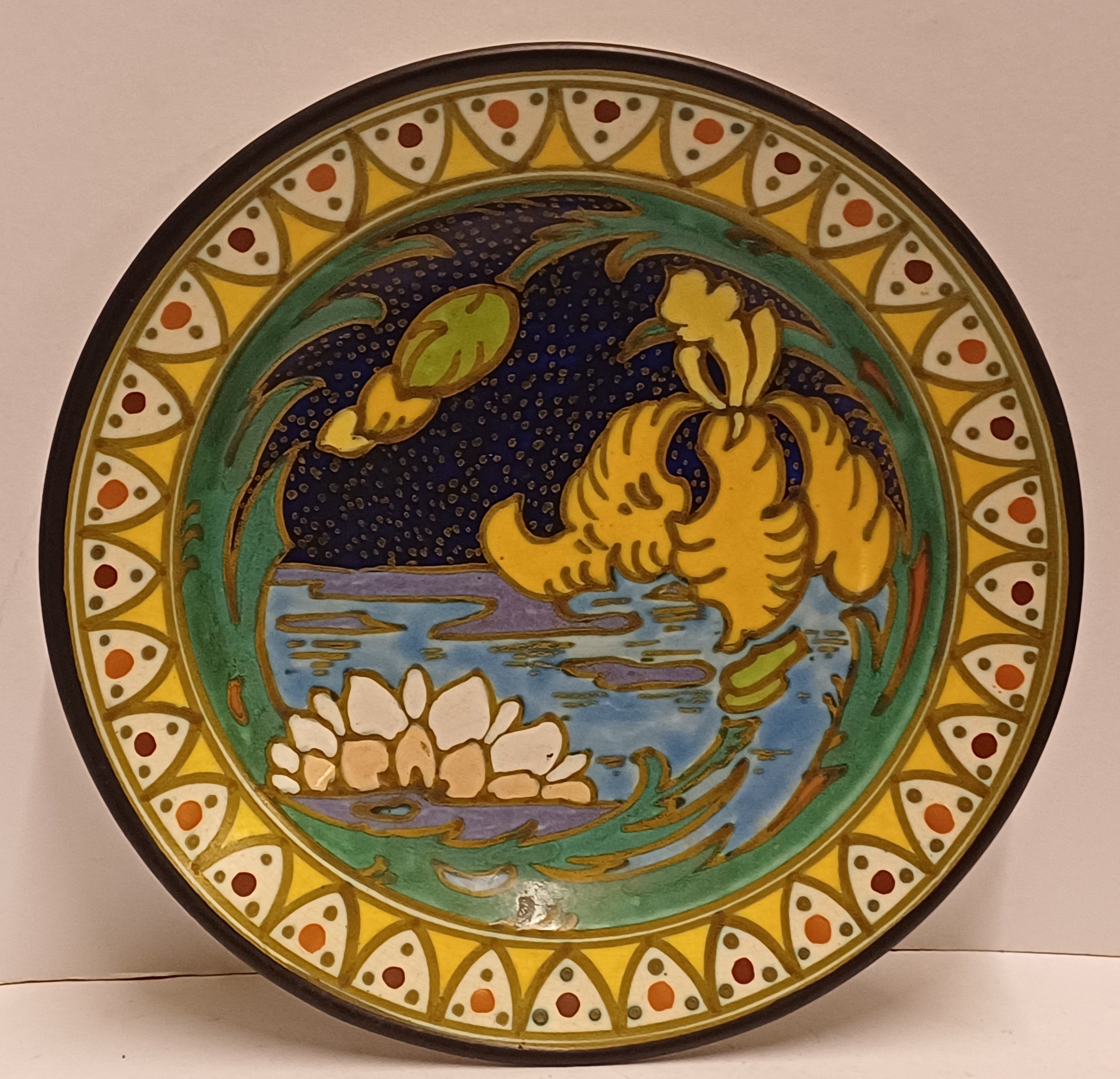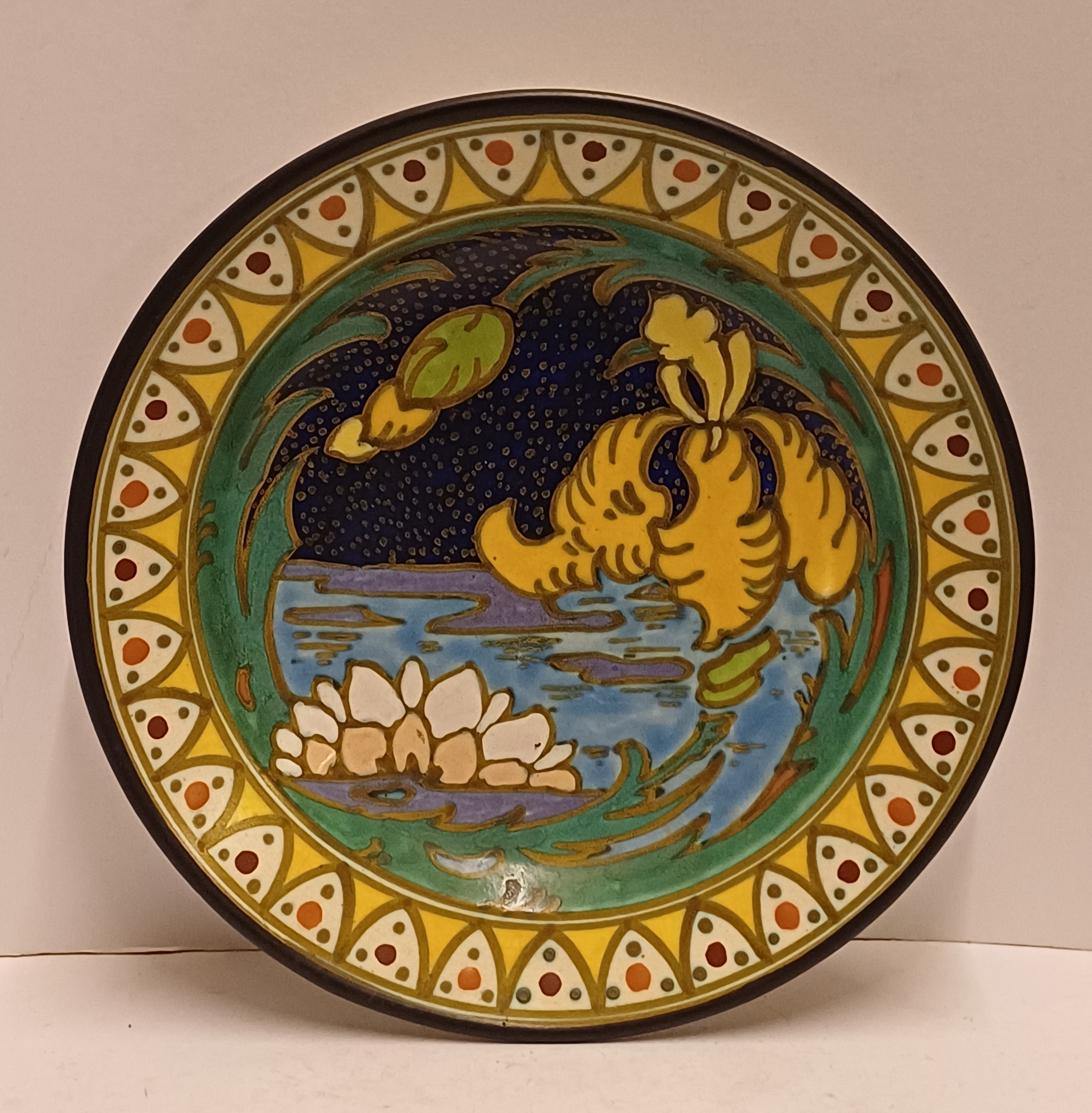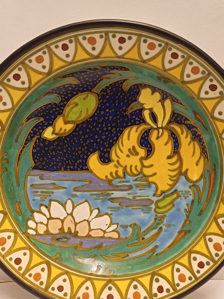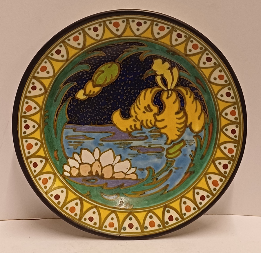 Wandbord met landschappelijk decor met waterlelie en flora. De lip met repeterend decor. Achterzijde met fabrieksmerk, decornaam en jaarletter 1925.