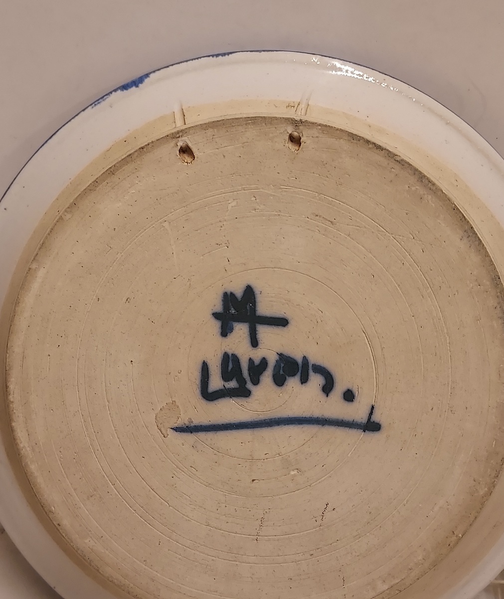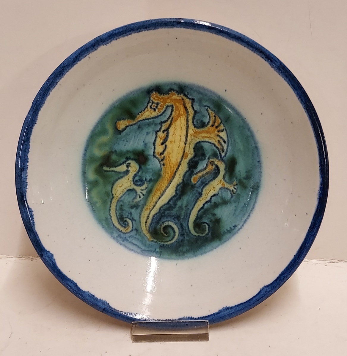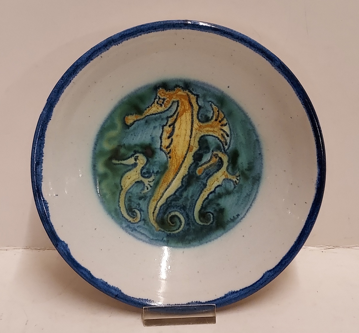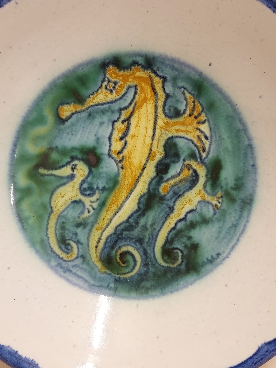 Piatto con decorazione di un cavalluccio marino. Retro con firma e Laren.