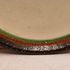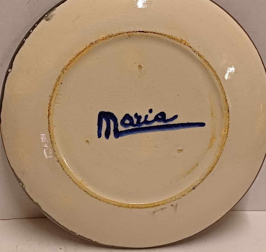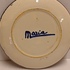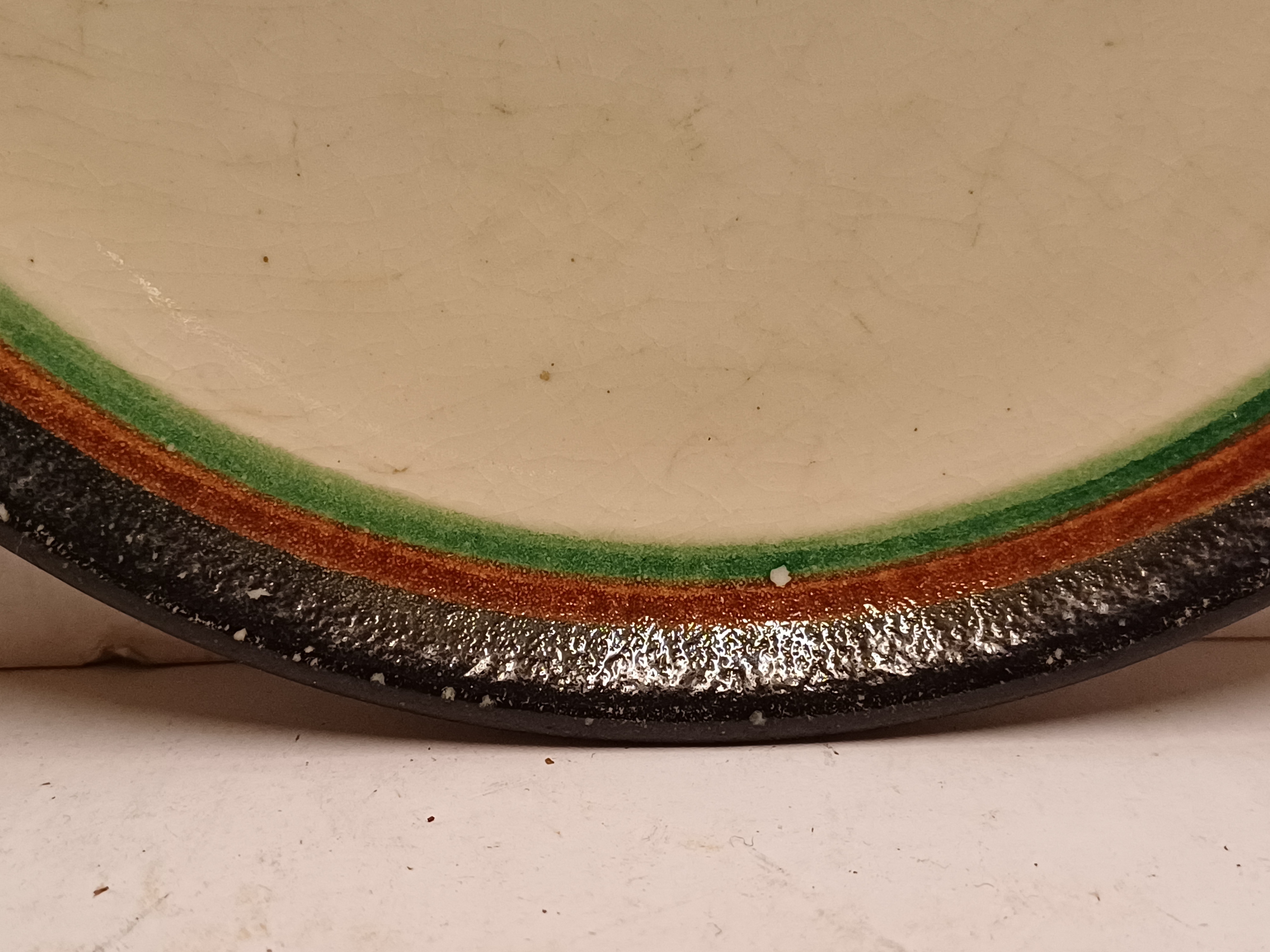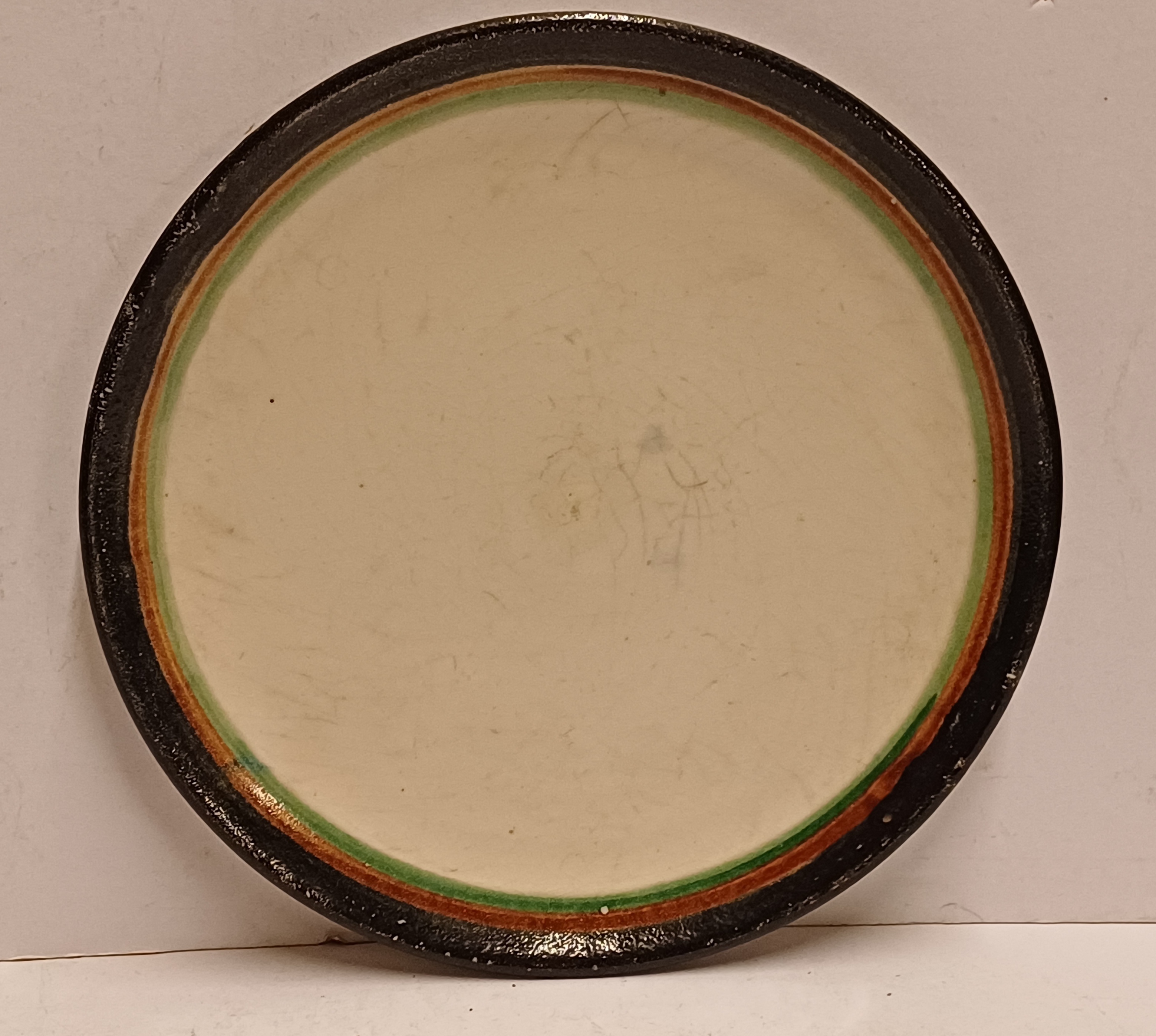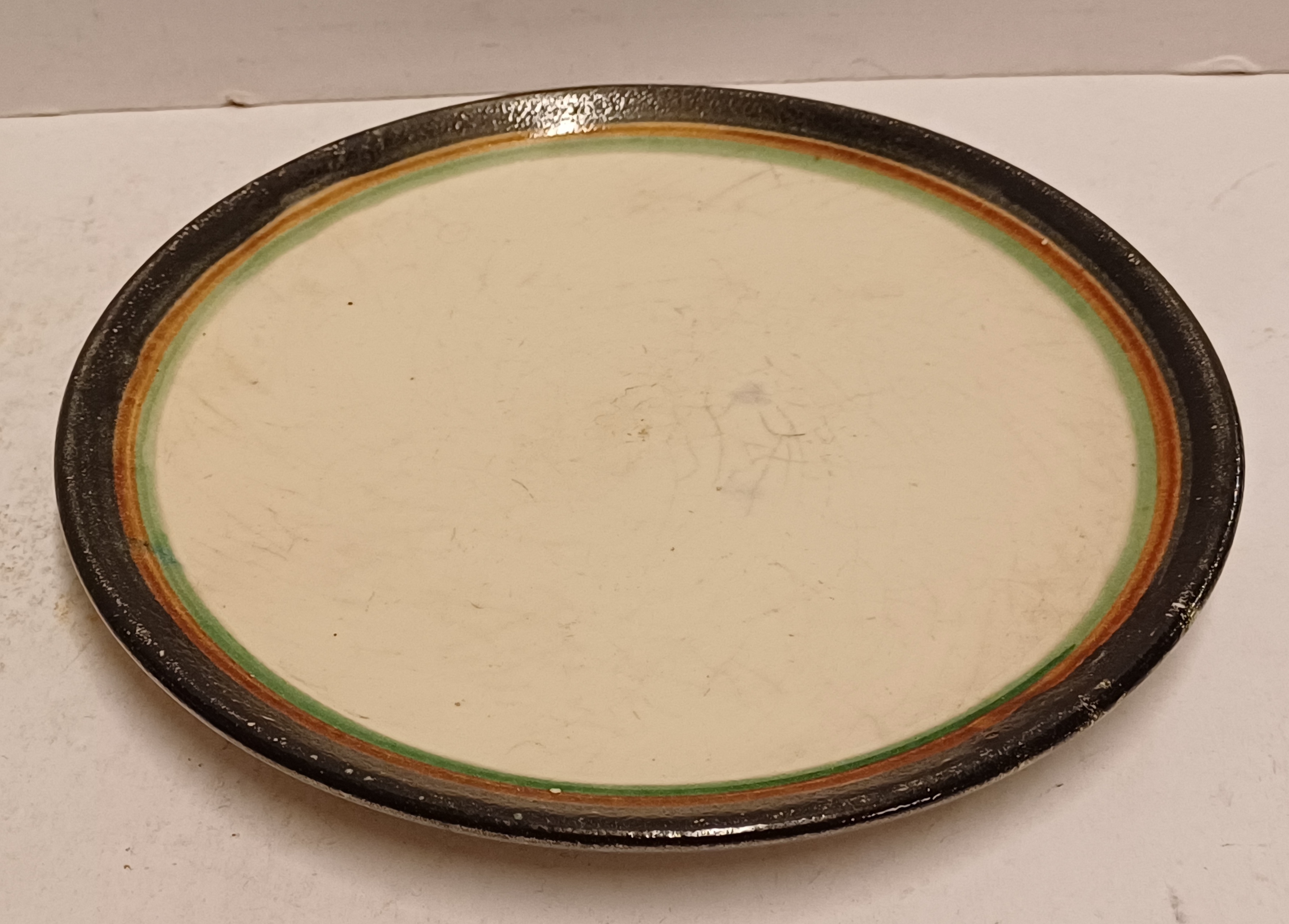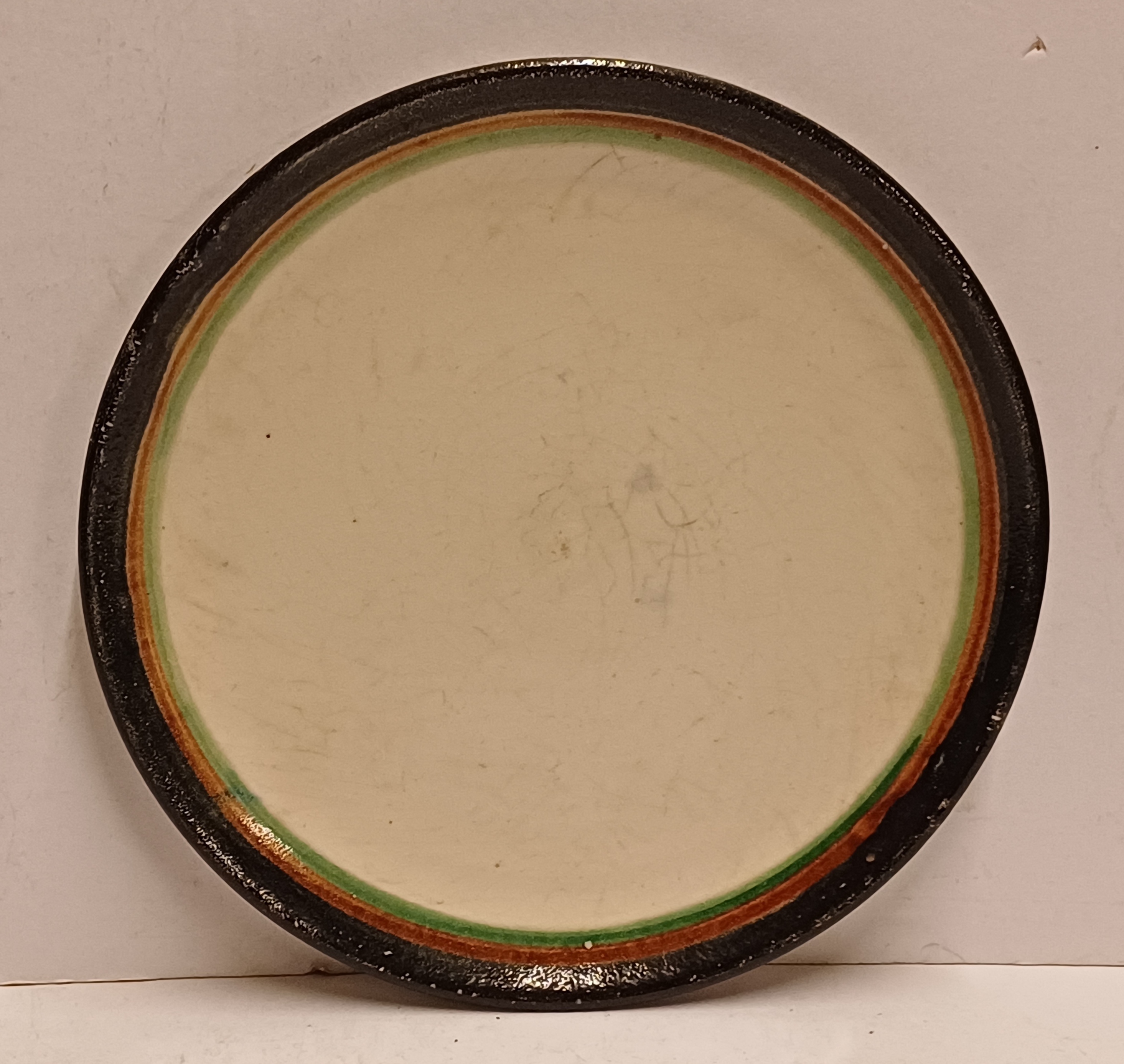 Aardewerken bordje met band decoratie in zwart en bruin. Onderzijde gesigneerd.