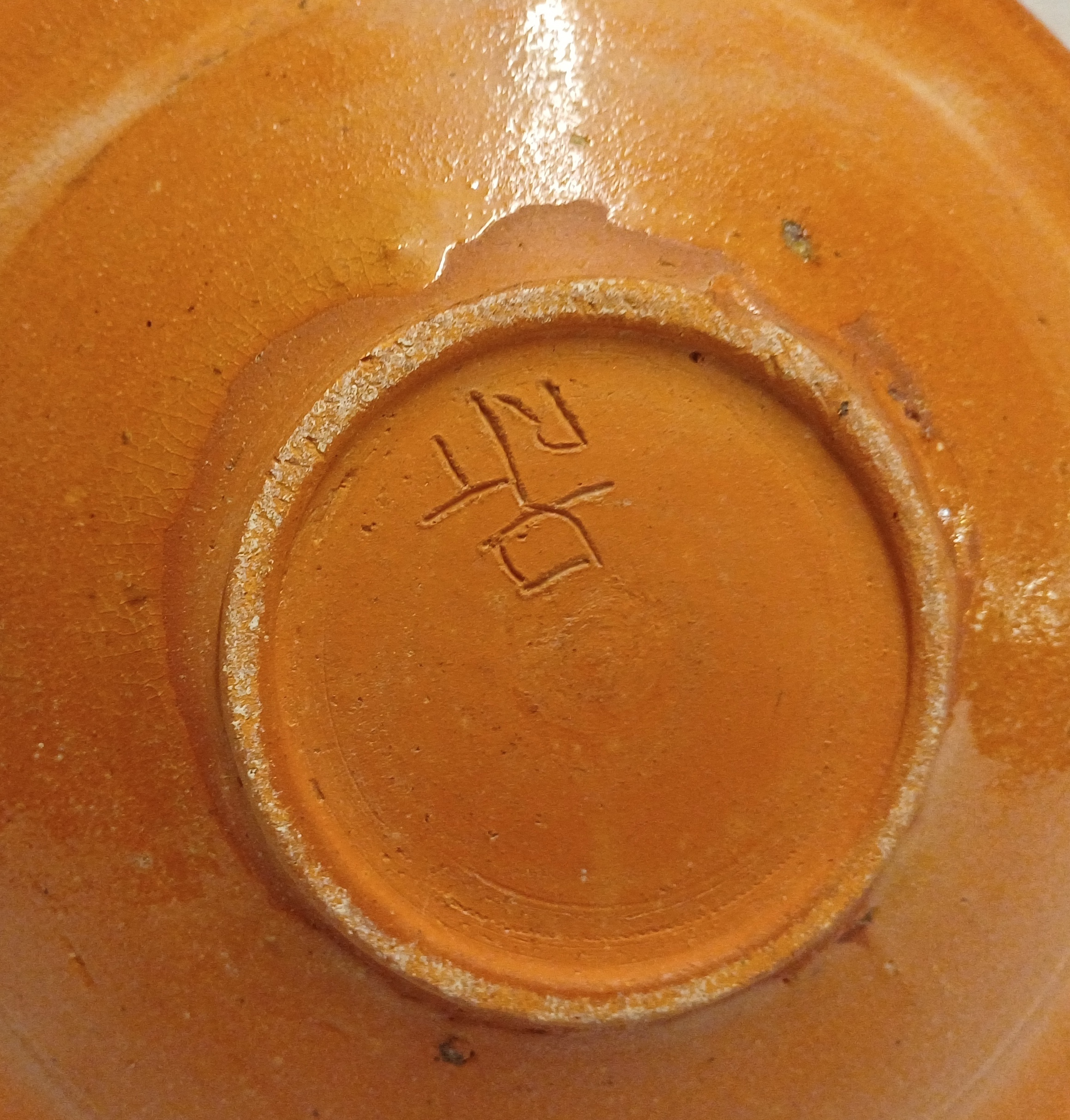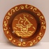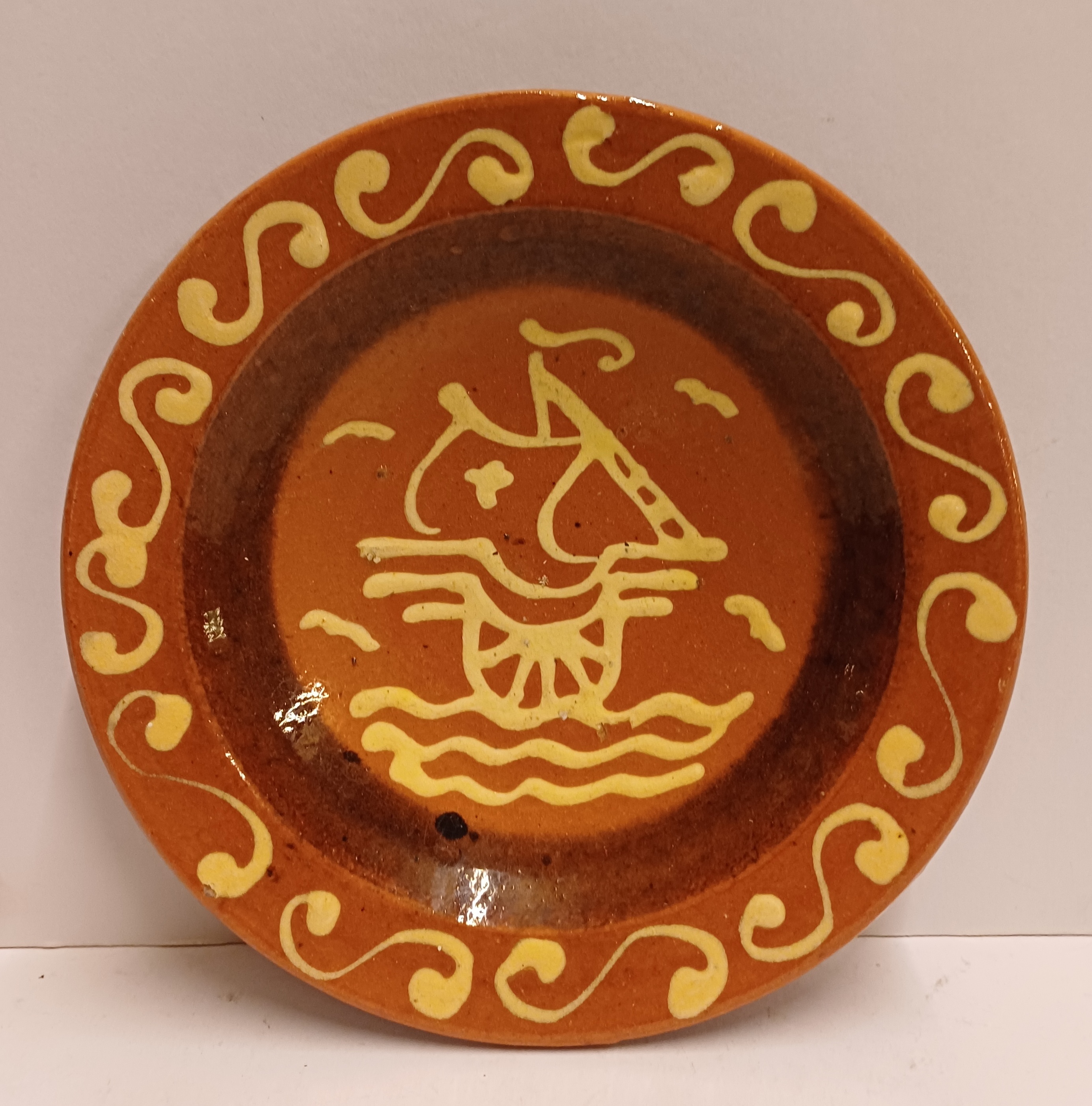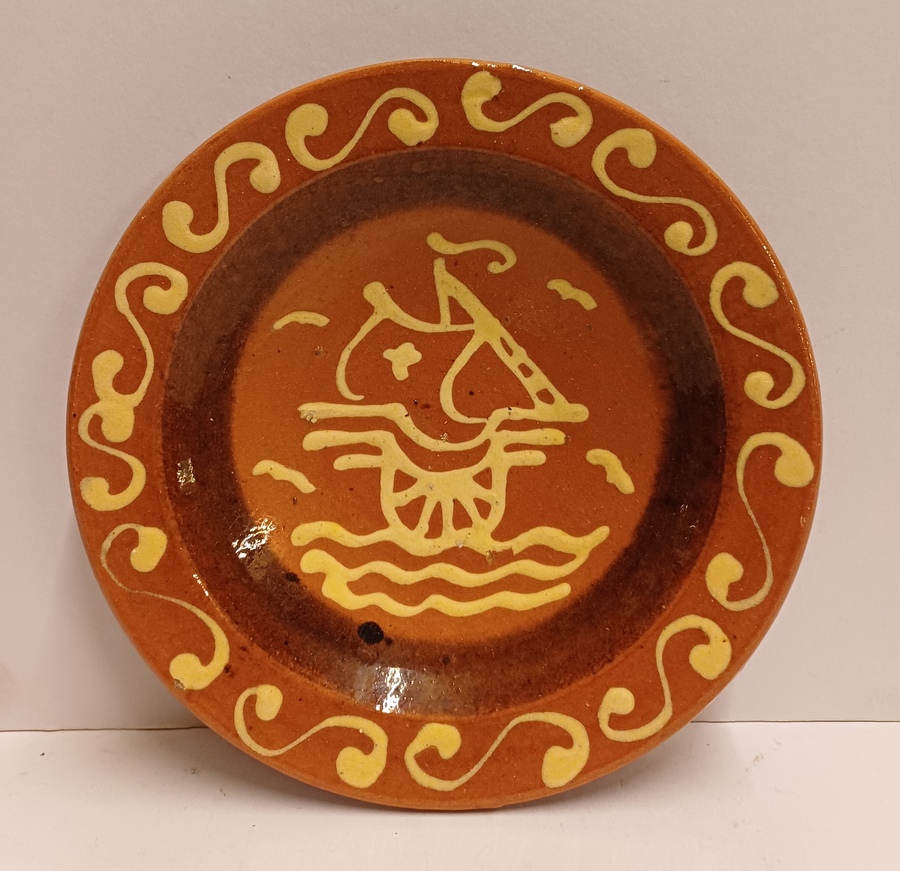 Piatto da parete con decorazione di una nave realizzata con la tecnica dello slipware. Retro con marchio di fabbrica.