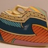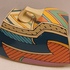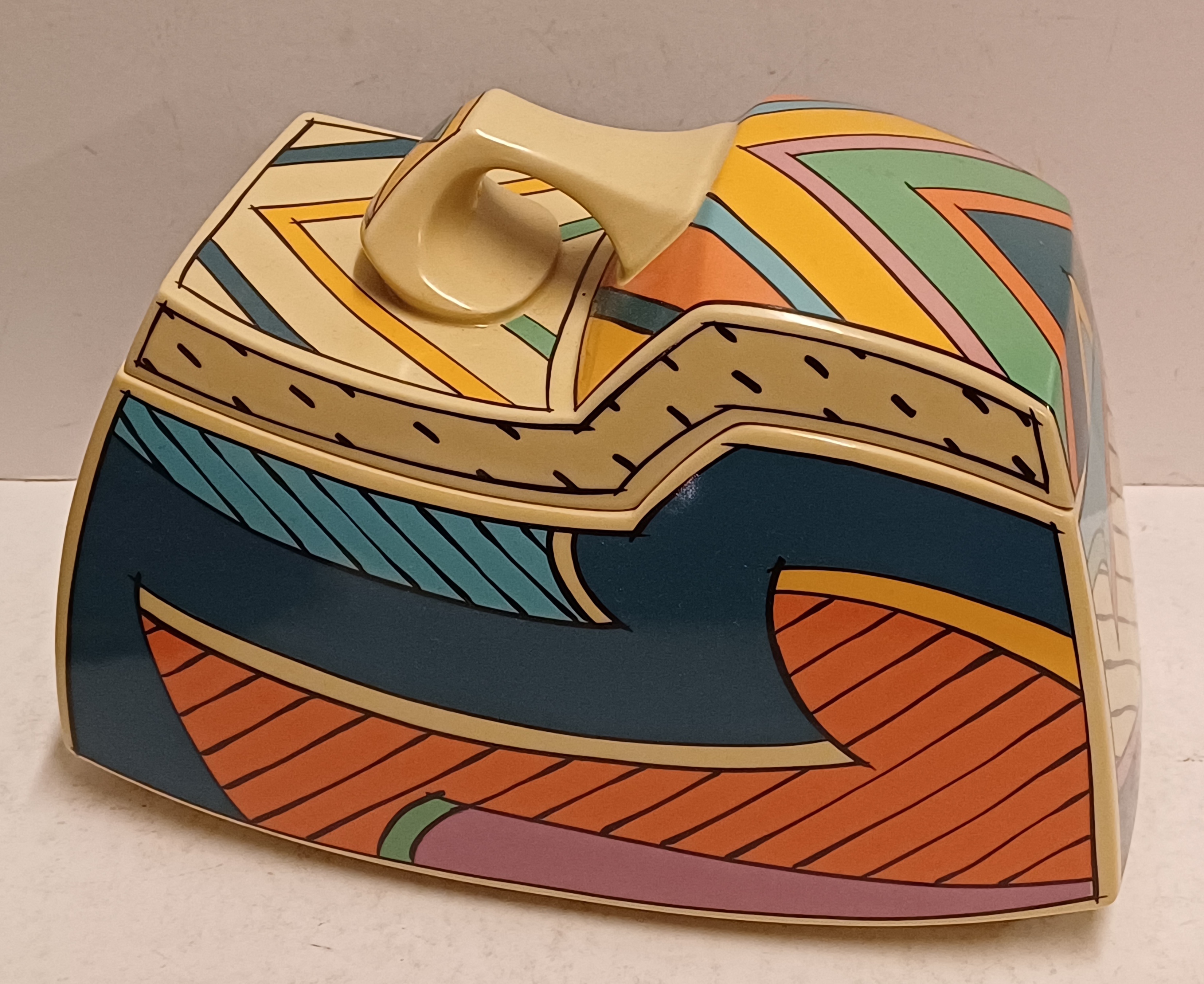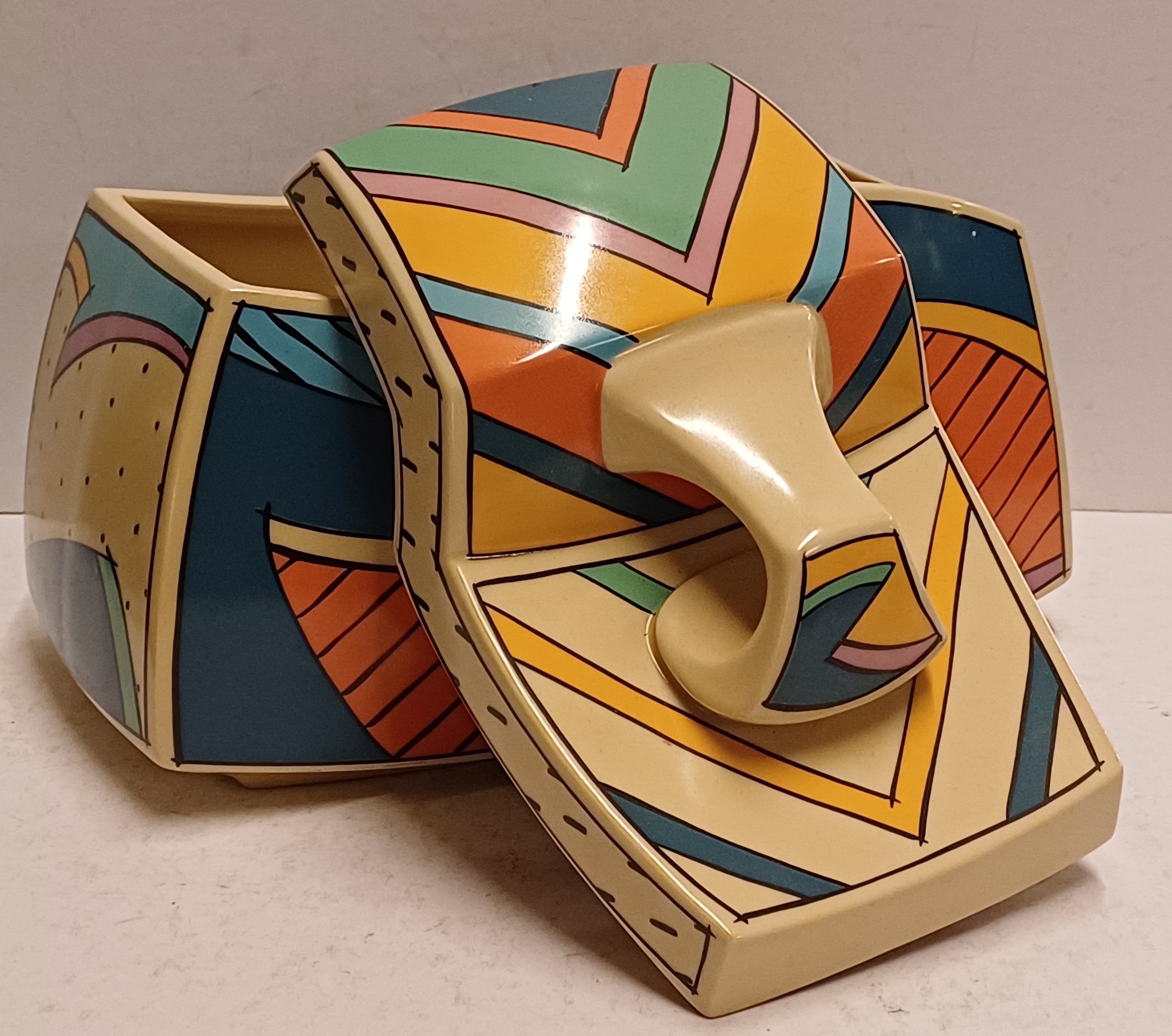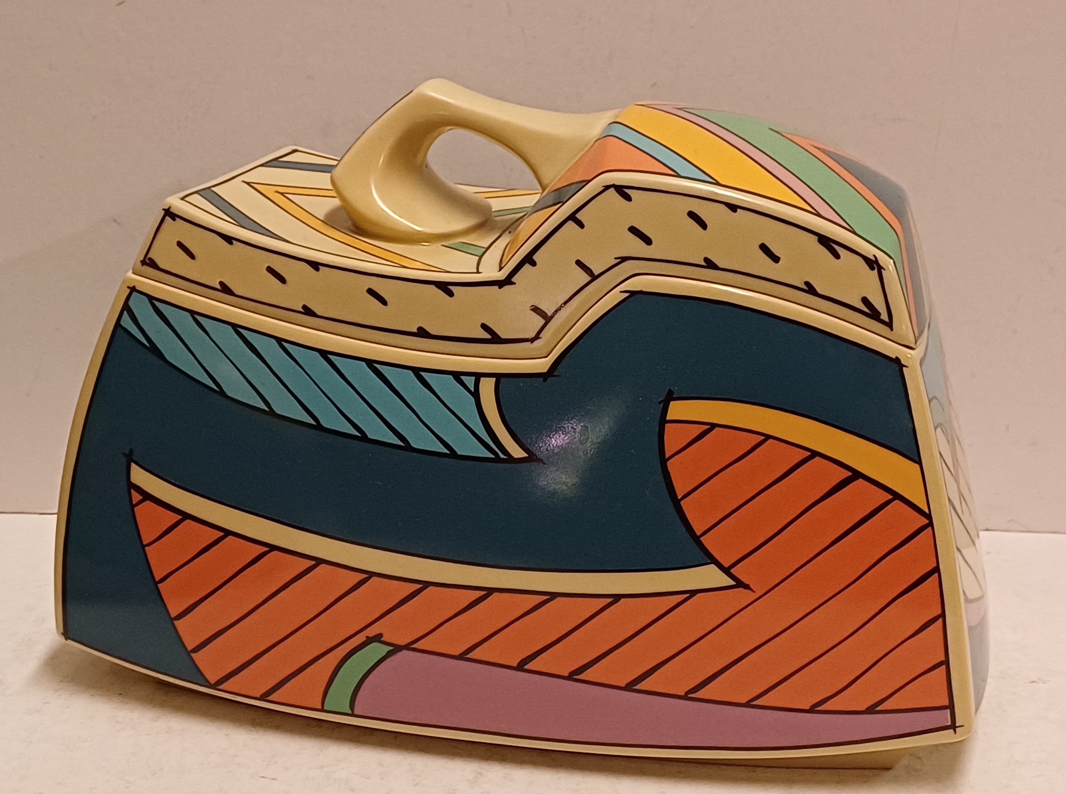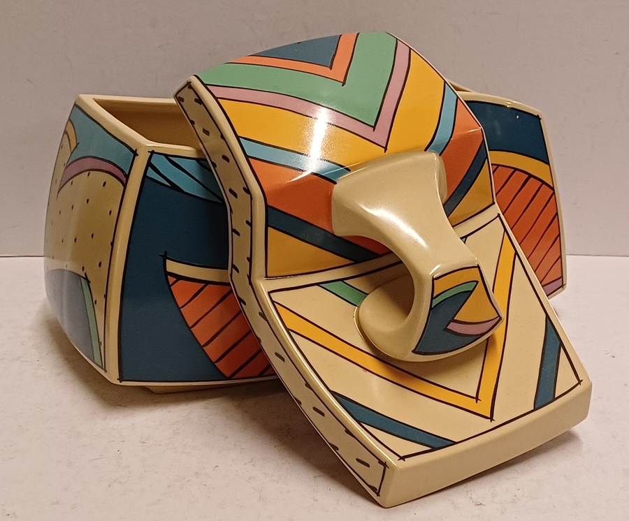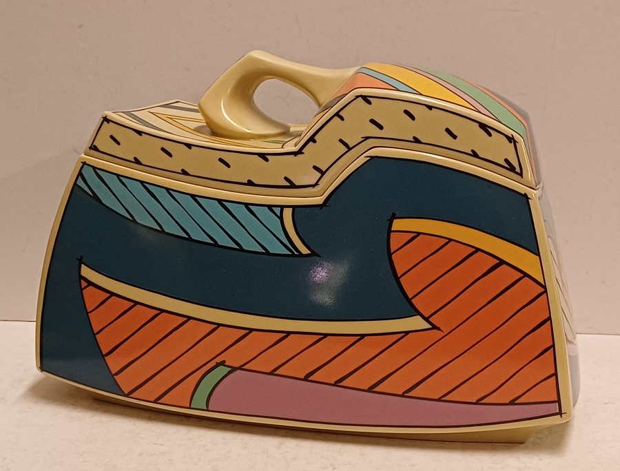 Aardewerken dekseldoos met polychroom Memphis decor Flash. Ontwerp Dorothy Hafner, uitvoering Rosenthal Studio Line.