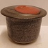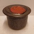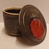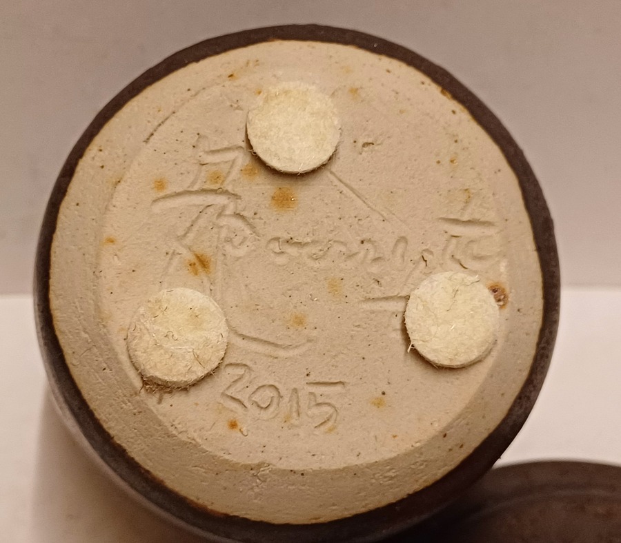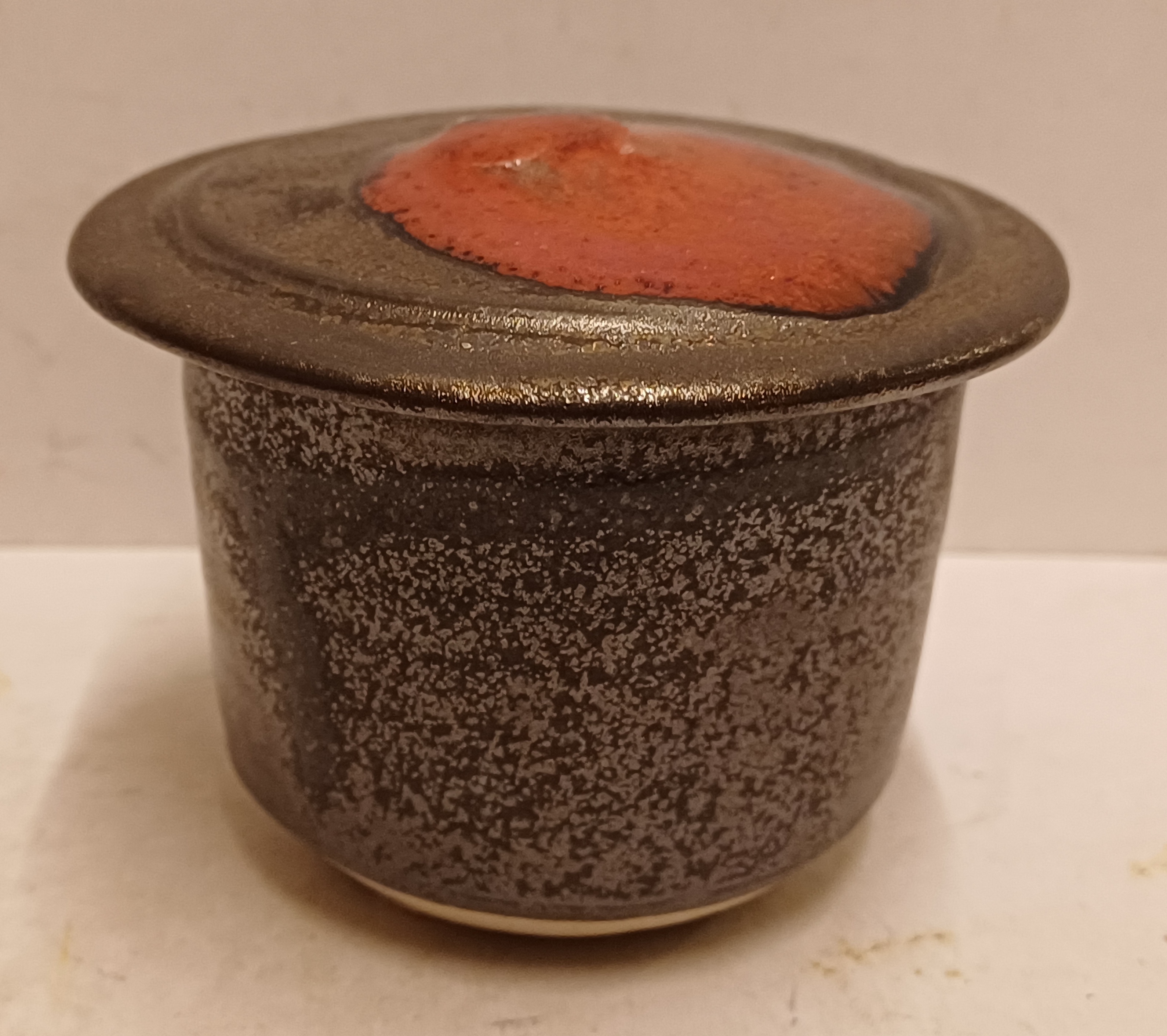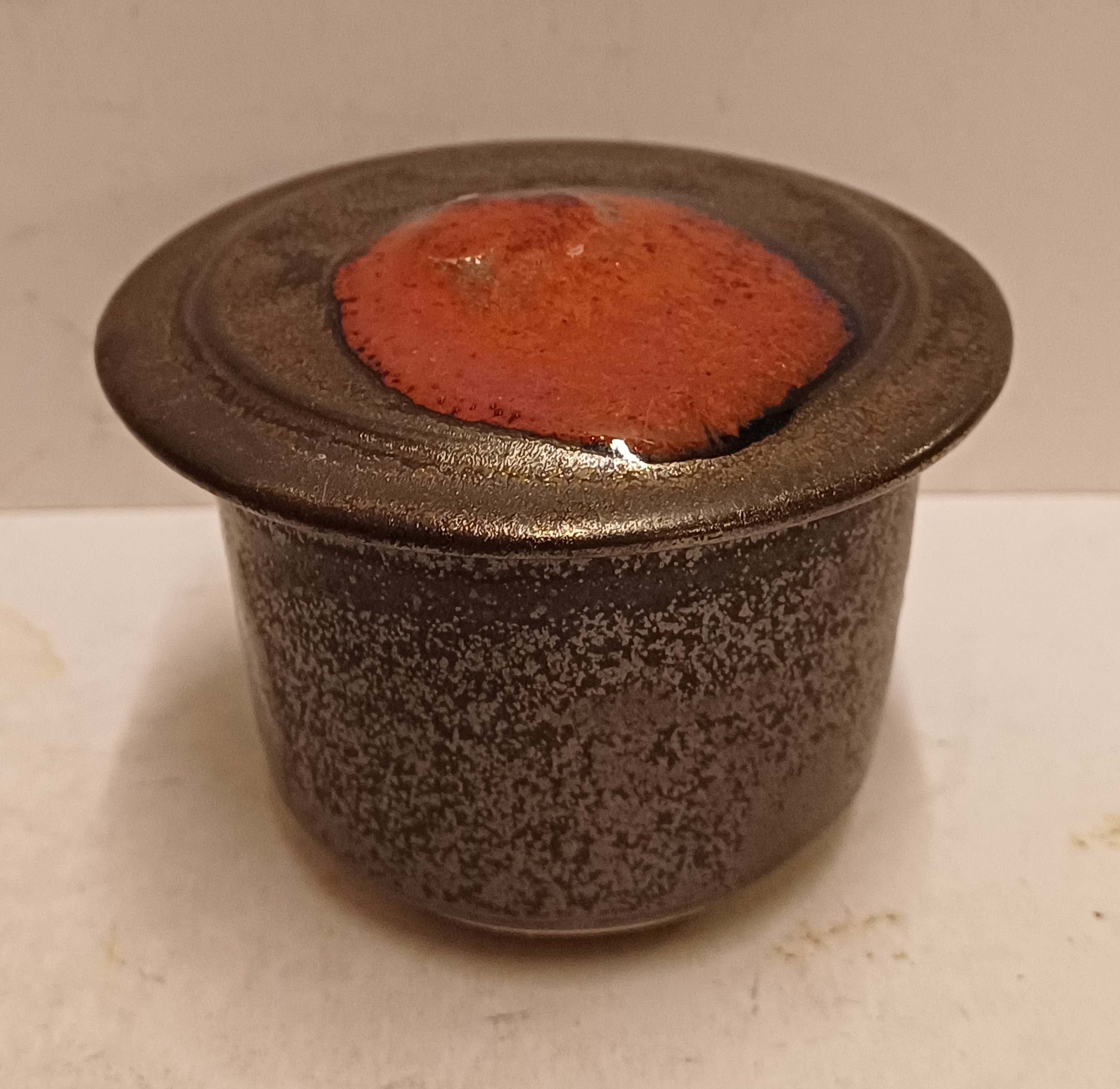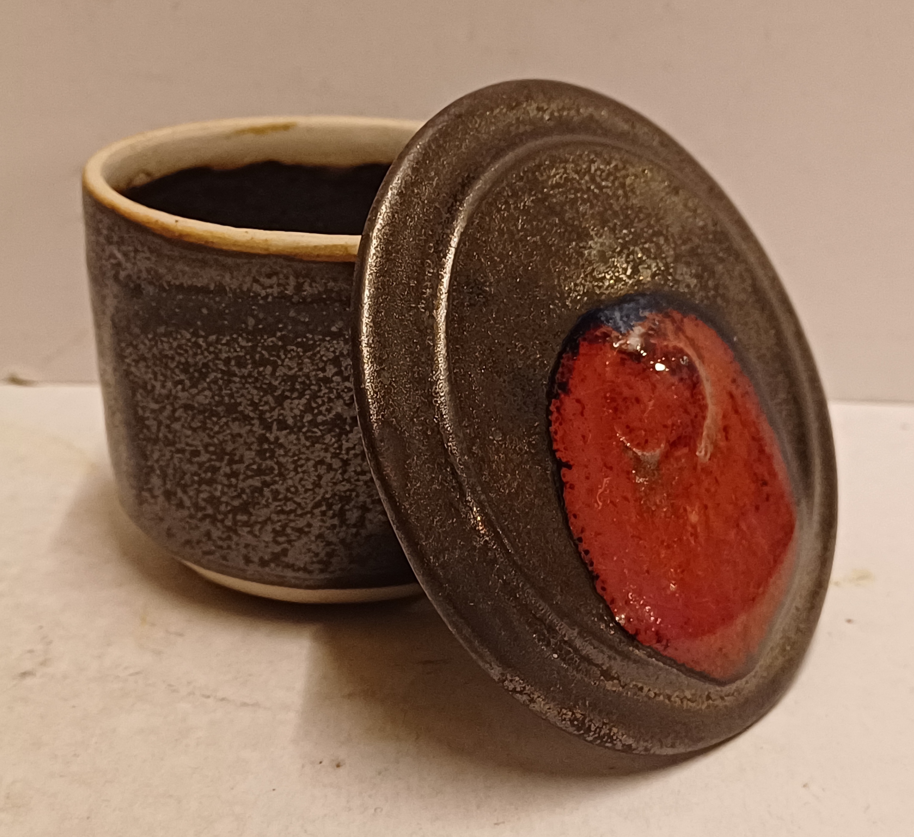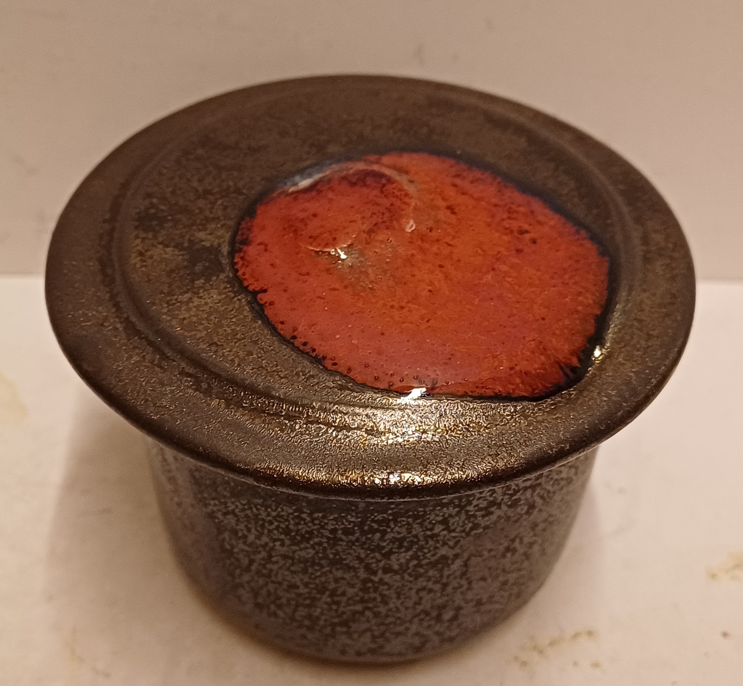Klein deksel doosje met mat zwarte glazuur met rode splash op de deksel. Onderzijde gemerkt en gedateerd 2015.