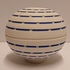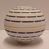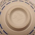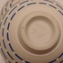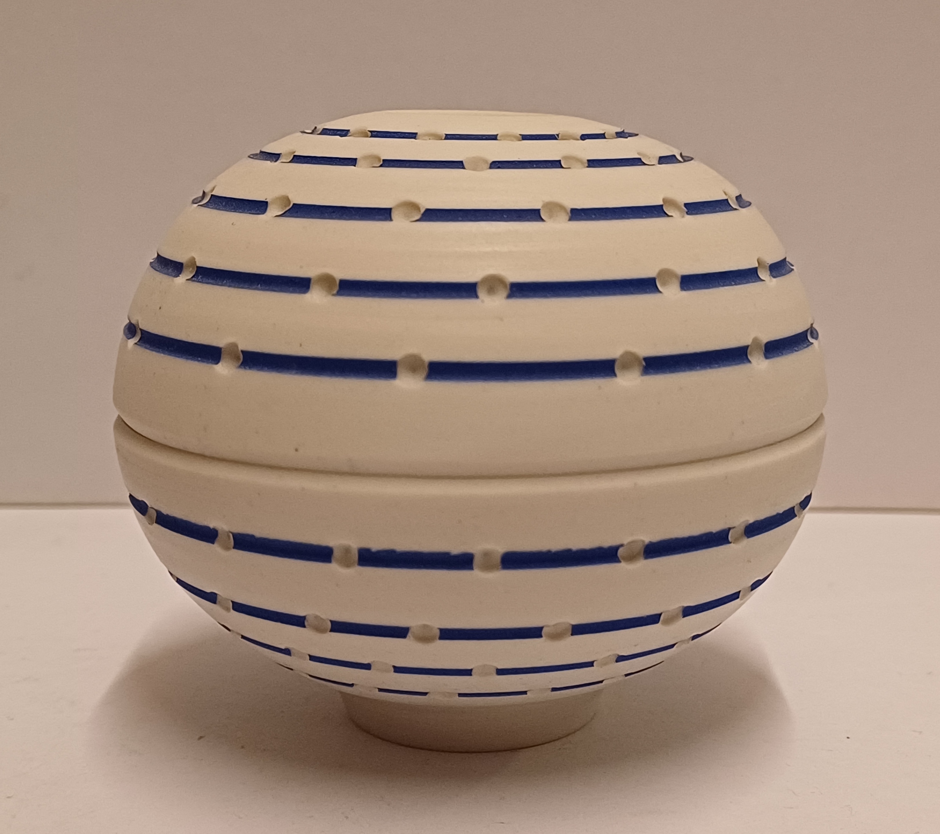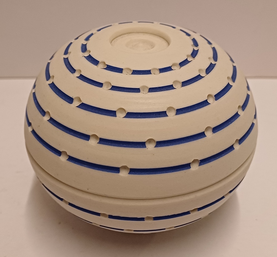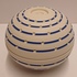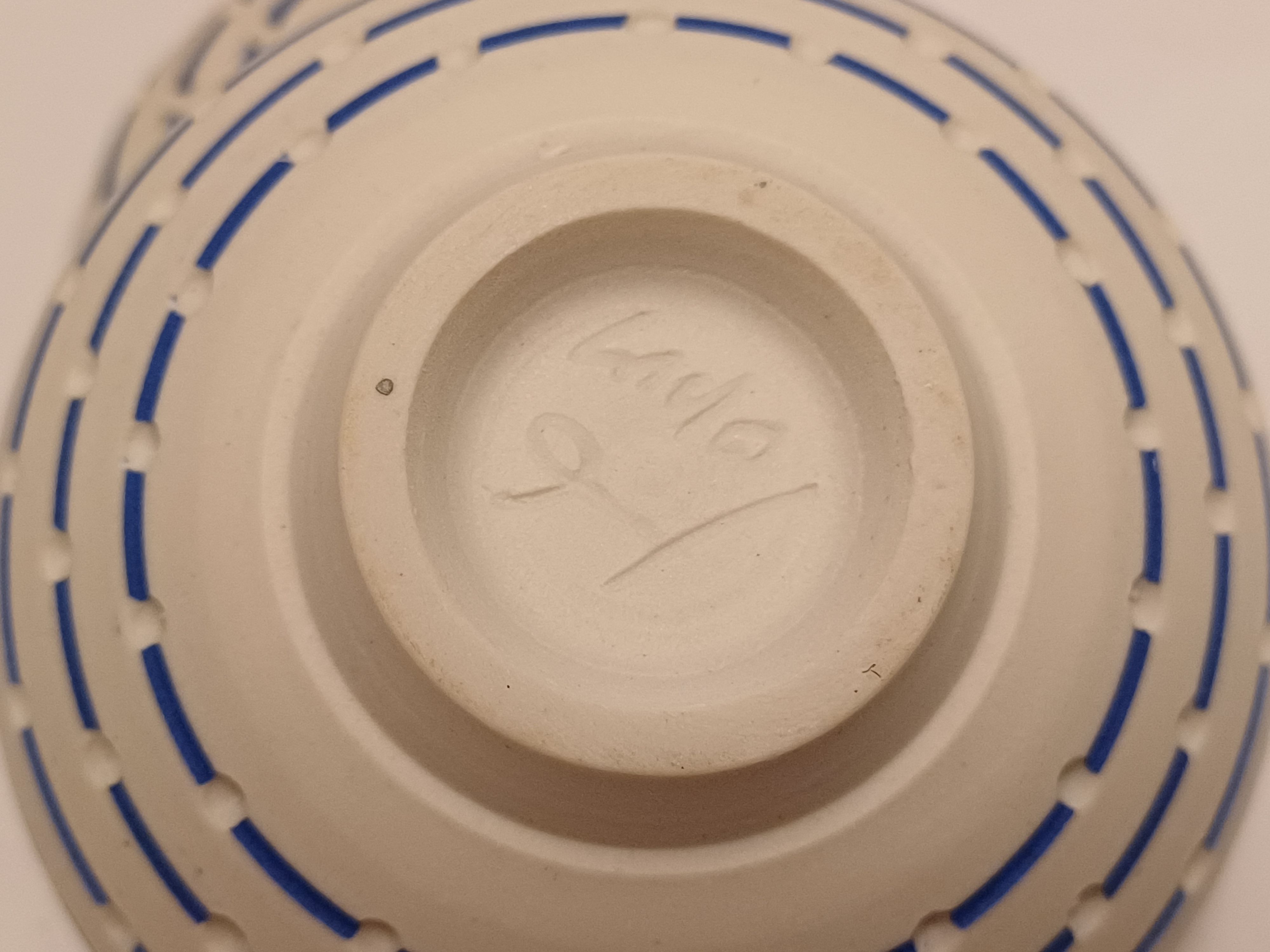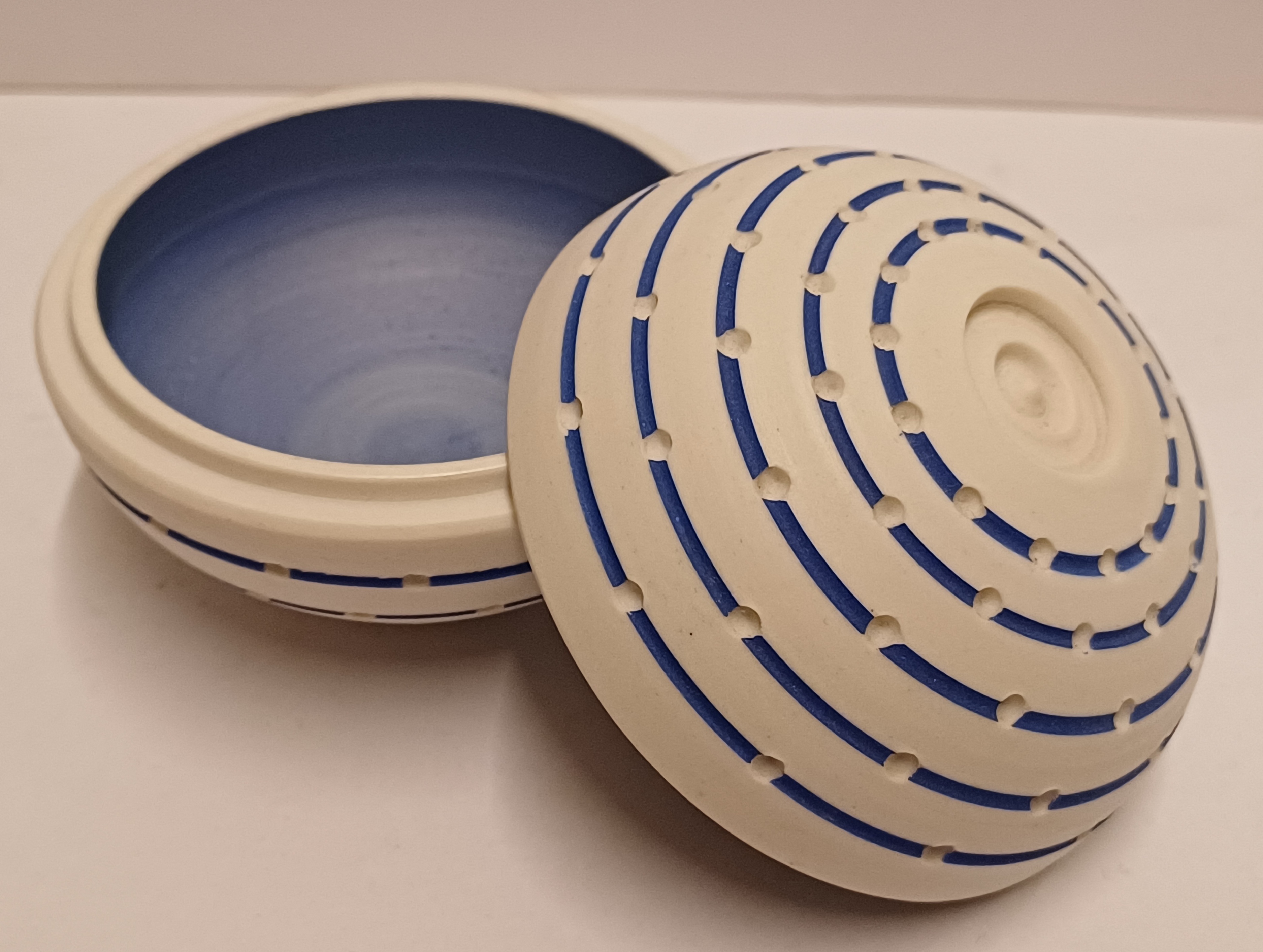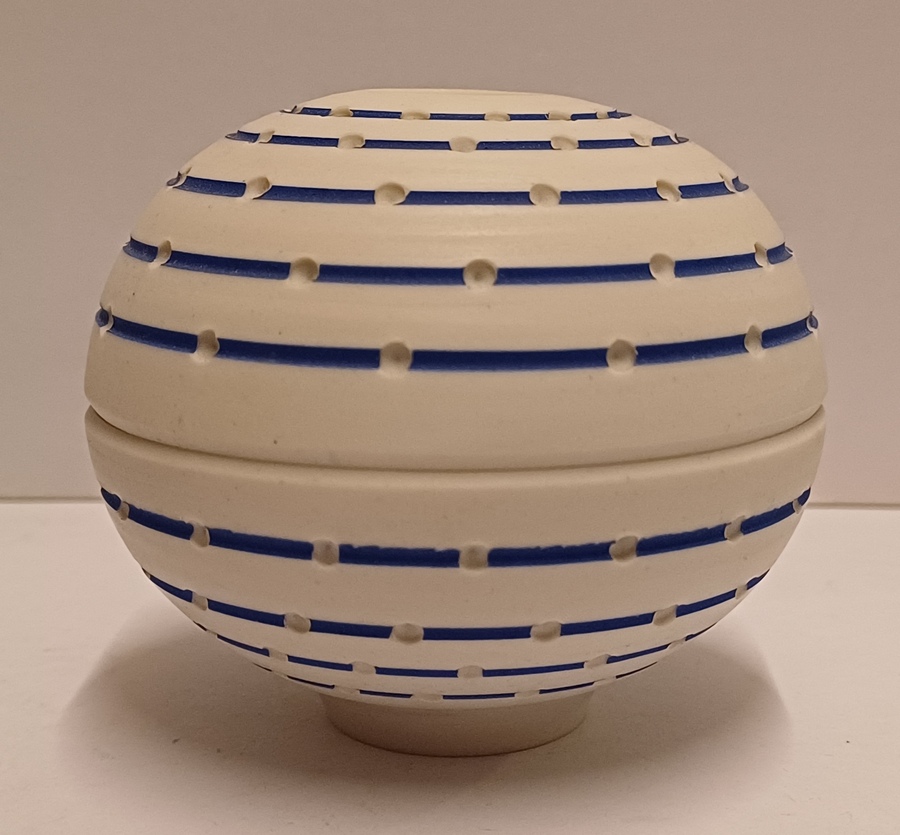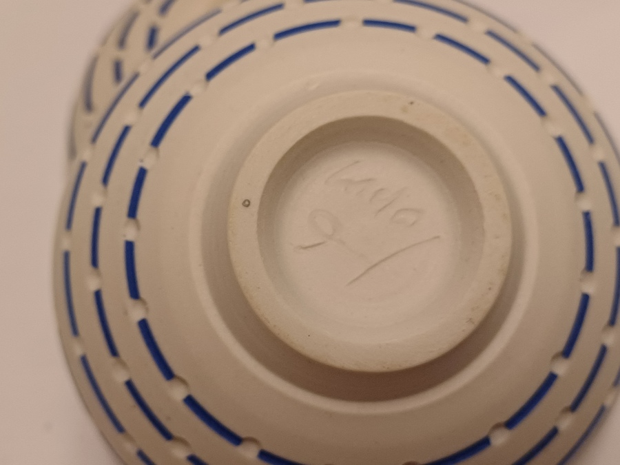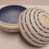 Bol aardewerken dekseldoosje met mat witte glazuur met blauwe horizontale lijnen en klein deukjes op de lijn. Onderzijde gesigneerd.