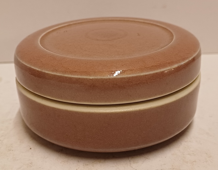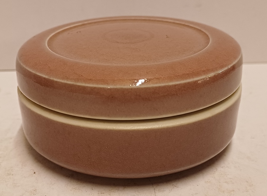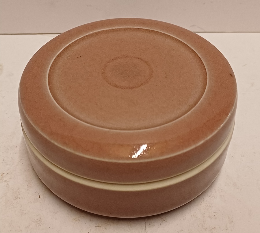 Scatola con coperchio in porcellana con smalto color salmone. Parte inferiore con firma ed etichetta.